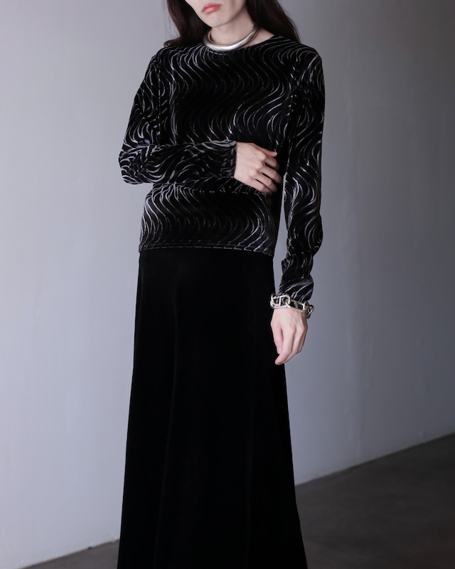 ベロアのうねうね柄トップス! 90年代頃のUSA製です。 これ凄くて 玉虫のようなブラックカラーで 光の反射によってグレーぽくみえる 雰囲気のあるカラーリング。 しかもこの柄 色でプリントされているとかではなく 凹凸によってうねうねは表現されており、 この凹凸によって奥行きのある柄感に仕上がっております。 大変クオリティが高く 服として凄く良いなあと思います。 シルエットも綺麗で 身幅広め、着丈短めの着やすい形。 首の開きも良く 一枚はもちろん、インナーとしても重宝するアイテムです。 ⚫︎color black ※お使いのモニター環境により、画像の色味が実物と異なって見える場合がございます。 ⚫︎fabric 90% polyester, 10% spandex ⚫︎size size : M 肩幅 45cm / 身幅 51cm / 袖丈 59cm / 着丈 53cm model : 165cm 46kg ※測定における若干の誤差はご了承下さいませ。 ⚫︎condition B S : deadstock (未使用品) A : good condition (使用感の少ない美品) B : usually condition (通常のusedアイテム) C : damage (ダメージあり) ※尚、実店舗でも販売しております為、掲載されていても時間差で在庫切れになる場合がございます。予めご了承下さい。 Instagram : @oo_koenji