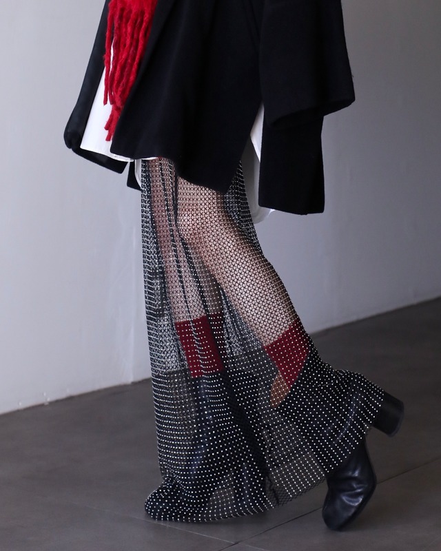 "suke suke kira kira" rhinestone design sheer maxi length skirt