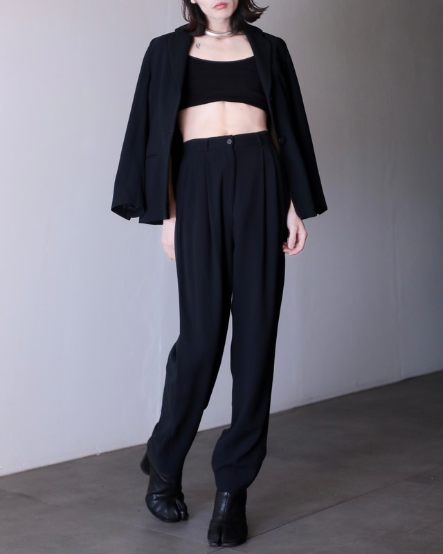 ハイウエストタックデザイン ワイドストレートスラックスになります! しかも形が綺麗で 裾までしっかりとボリュームのあるワイドストレート。 やーこのタックデザインと 裾幅29cmのボリューム感が両立するスラックスは珍しいですし、最高だよなあと思います。 ハイウエストというのもポイント高く 生地感も凄く良くて ドレープ感のあるとろみファブリック。 このワイドシルエットとも相性抜群ですし、 見るからに高級感のある佇まいに仕上がっております。 ウエスト背面はゴムになっており スラックスながら履き心地も◎ ベルトループもついているのでベルトでぎゅっと絞ることも可能です。 レングスは長かったとしても 裾の方は幅感変わらないので丈つめしても 綺麗なシルエットでお履きいただけます。 カラーリングもブラックで 使い勝手良く、シャツやニットなんかを合わせるだけでバッチリ決まるし、考えるだけでわくわくするパンツですー! ⚫︎color black ※お使いのモニター環境により、画像の色味が実物と異なって見える場合がございます。 ⚫︎fabric 95% polyester, 5% spandex ⚫︎size size : M ウエスト 70〜80cm / 股下 72cm / 総丈 102cm / 裾幅 29cm model : 165cm 46kg ※測定における若干の誤差はご了承下さいませ。 ⚫︎condition B S : deadstock (未使用品) A : good condition (使用感の少ない美品) B : usually condition (通常のusedアイテム) C : damage (ダメージあり) ※尚、実店舗でも販売しております為、掲載されていても時間差で在庫切れになる場合がございます。予めご了承下さい。 Instagram : @oo_koenji