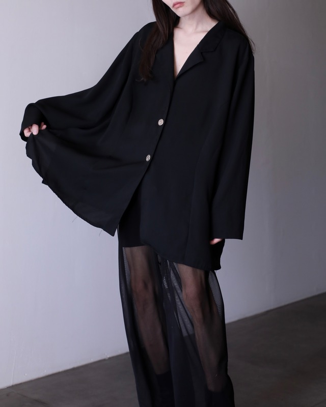 このジャケット最高なのです〜 80年代頃のカナダ製。 とろっとしたドレープファブリックに オーバーなシルエット。 テーラードジャケットとカバーオールの中間のような エフォートレスなデザインで 様々なスタイリングに絶妙にマッチします。 肩パッドレスで ご自身の肩に沿って滑らかに落ちる肩感や お尻が隠れてくれる着丈で ボディラインも拾わず体型カバーもバッチリ。 今年はなんだか これくらいの着丈の羽織が気分だなあと思っていて 写真のようにシアーパンツでスタイリング組んだり、 ロングブーツなんかで作るスタイリングも◎ プレーンにスラックスやデニムなんかも合いますね。 裏地レスのさらっとした着心地で 着ることの出来るシーズンが長いのも魅力的。 肩パッドレスなので コートなんかの中に仕込むのも可愛いと思います。 こういうの探すと中々ないよなあと思える逸品で 着た感じもかなり良かったので凄くおすすめです! ⚫︎color black ※お使いのモニター環境により、画像の色味が実物と異なって見える場合がございます。 ⚫︎fabric 100% polyester ⚫︎size size :24 肩幅 50cm / 身幅 71cm / 袖丈 59cm / 着丈 74cm model : 165cm 46kg ※測定における若干の誤差はご了承下さいませ。 ⚫︎condition B S : deadstock (未使用品) A : good condition (使用感の少ない美品) B : usually condition (通常のusedアイテム) C : damage (ダメージあり) ※尚、実店舗でも販売しております為、掲載されていても時間差で在庫切れになる場合がございます。予めご了承下さい。 Instagram : @oo_koenji