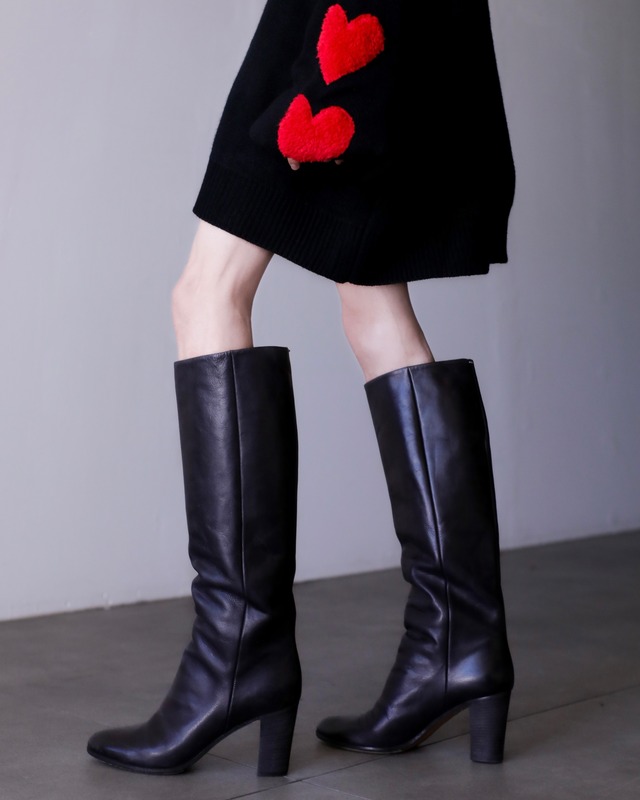 Maison Martin Margiela 希少な本人期のロングブーツ。 今秋のスタイリングは ロングブーツは外せないと思っていて (元々大好きなのですが) そんなふつふつと湧き上がる気持ちに すっと寄り添ってくれる個体です。 華奢なトゥに 歩きやすいチャンキーヒール。 そこにこの美しい筒のフォルムが最高に可愛くて 履いた感じが頗る良かったです。 扱いやすい膝下で 様々なスタイリングの邪魔にならず、 オーバーシルエットでまとめたり、 ブーツインもバッチリ。 足首周りが細すぎないので 履く時に足を入れやすいのもポイント◎ 柔らかさと肉厚感を併せ持つ カーフレザー。 履いた時に足首前が クシュっとシワになるのがただただかっこいいなあと思います。 ブラックカラーも魅力的で 様々なスタイリングにバチっとハマってくれます。 ちなみにこちらは マルジェラのREPLICAシリーズで 1980年代のフランス製ブーツを再構築したモデル。 REPLICAラインは、 1994年にスタートしたカプセルコレクション。 世界各地から集めたビンテージをもとに、 当時の素材や仕立てを研究しながら マルジェラらしい視点で再構築、再現したシリーズです。 今回のこちらは マルタン本人が在籍していた2000年代中期頃のプロダクト。 このレプリカのシリーズ個体によるところもかなり大きいのですが、こちらはすごく当たりだと思います。 とにかくとても良いロングブーツでした。 とてもおすすめです。 -REPLICA TAG- Stlye discription : Women boot Originally : Soft calfskin Provenance : France Perlod : 1980 ⚫︎brand MARTIN MARGIELA / マルタンマルジェラ ⚫︎color black ※お使いのモニター環境により、画像の色味が実物と異なって見える場合がございます。 ⚫︎fabric leather ⚫︎size size : 37 横幅 8cm / ヒール高さ 7cm /ブーツ高さ(ヒール含む) 47cm ※測定における若干の誤差はご了承下さいませ。 ⚫︎condition B usedレザー製品のため、細かなキズやスレがございます。 ヒール部分の多少のすり減りがございます。 S : deadstock (未使用品) A : good condition (使用感の少ない美品) B : usually condition (通常のusedアイテム) C : damage (ダメージあり) ※尚、実店舗でも販売しております為、掲載されていても時間差で在庫切れになる場合がございます。予めご了承下さい。 Instagram : @oo_koenji