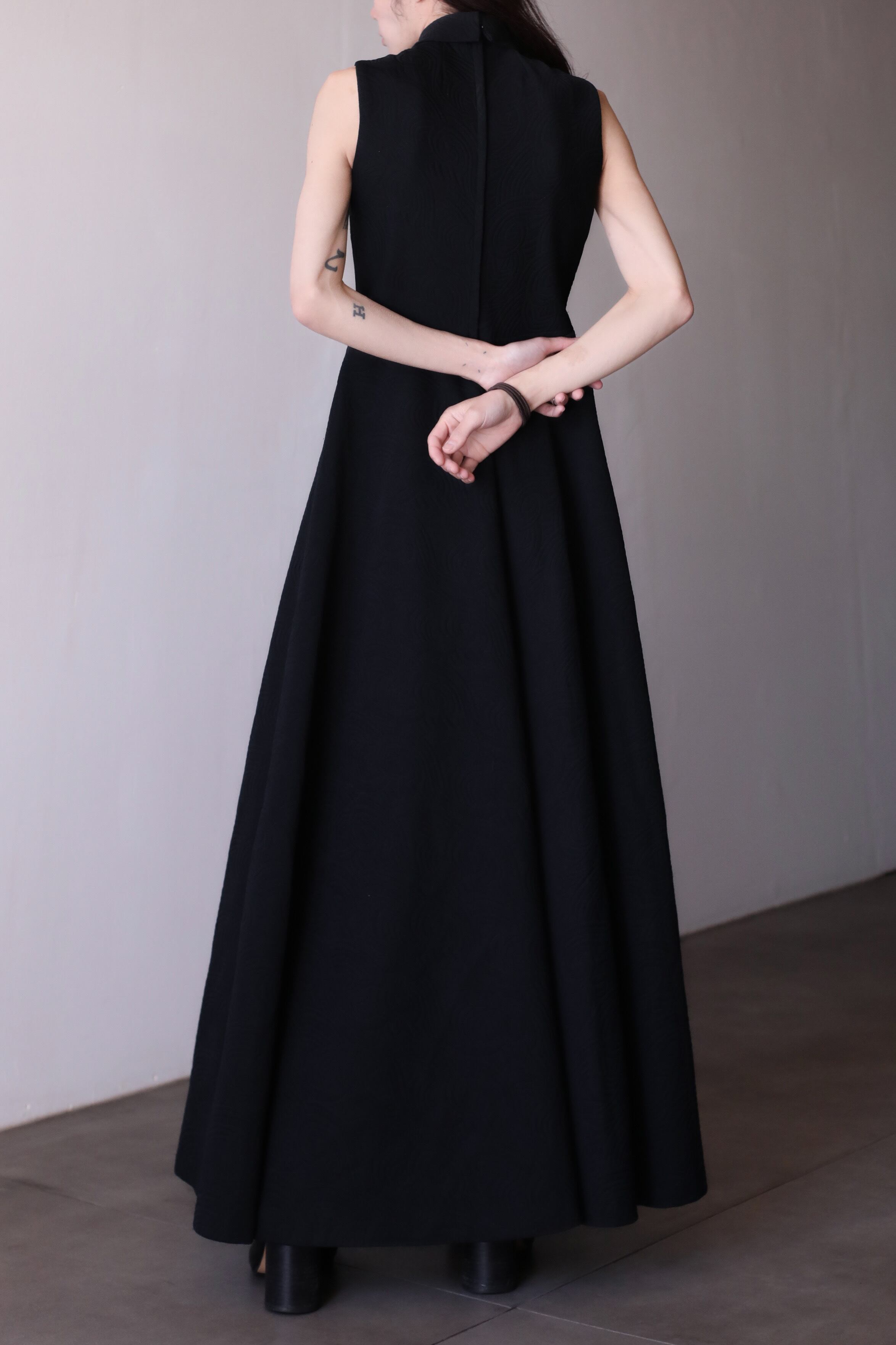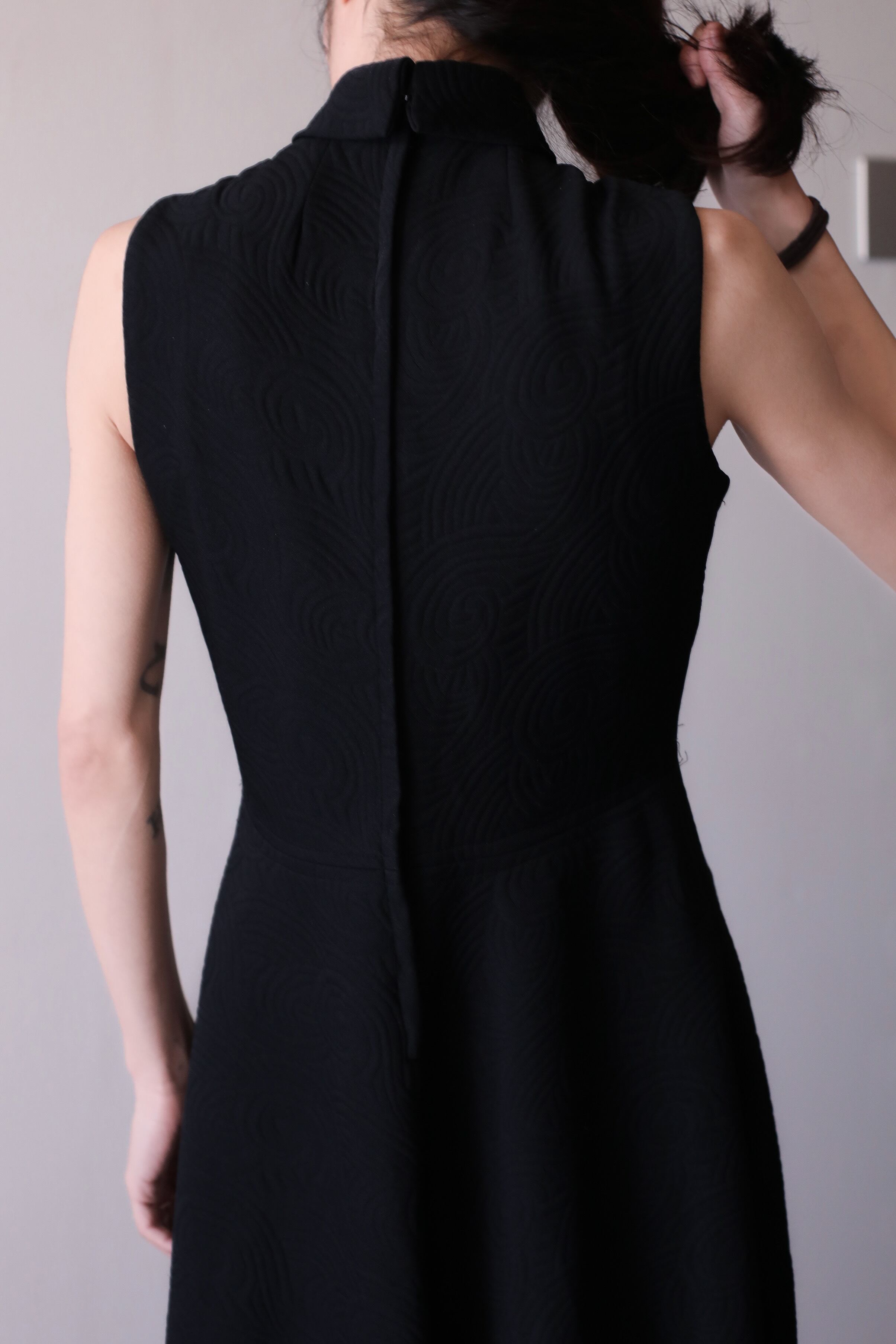 1980s super volume A-line 3D bonding fabric no sleeve hi-neck dress one piece dress