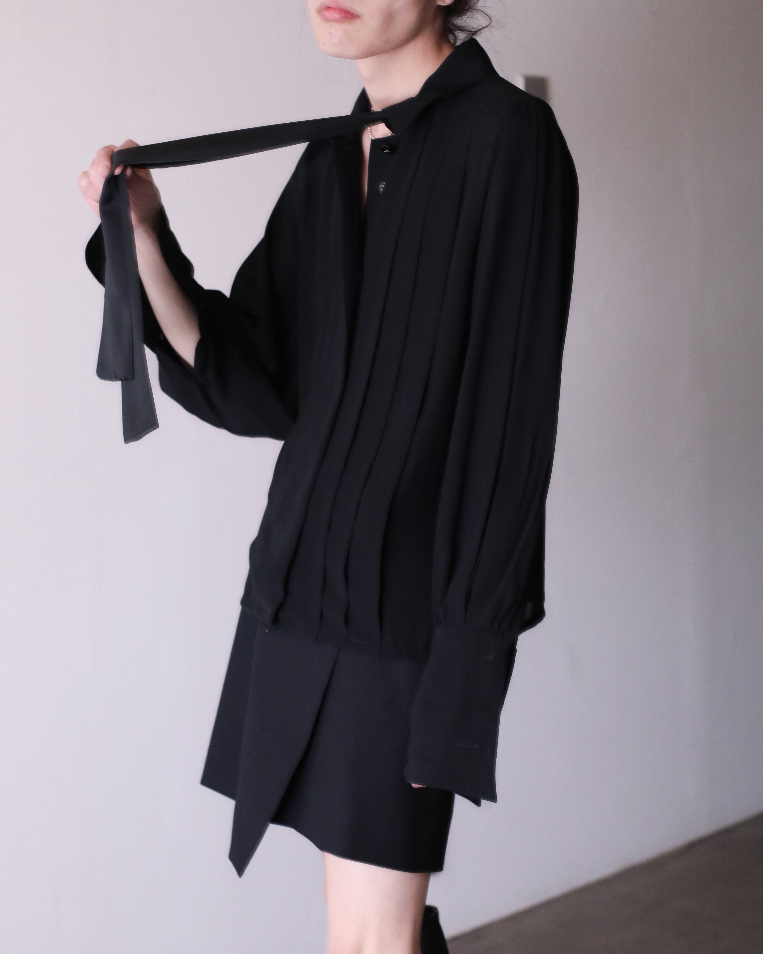 1990s accordion tuck pleats design "bowtie" blouse semi sheer fabric short length