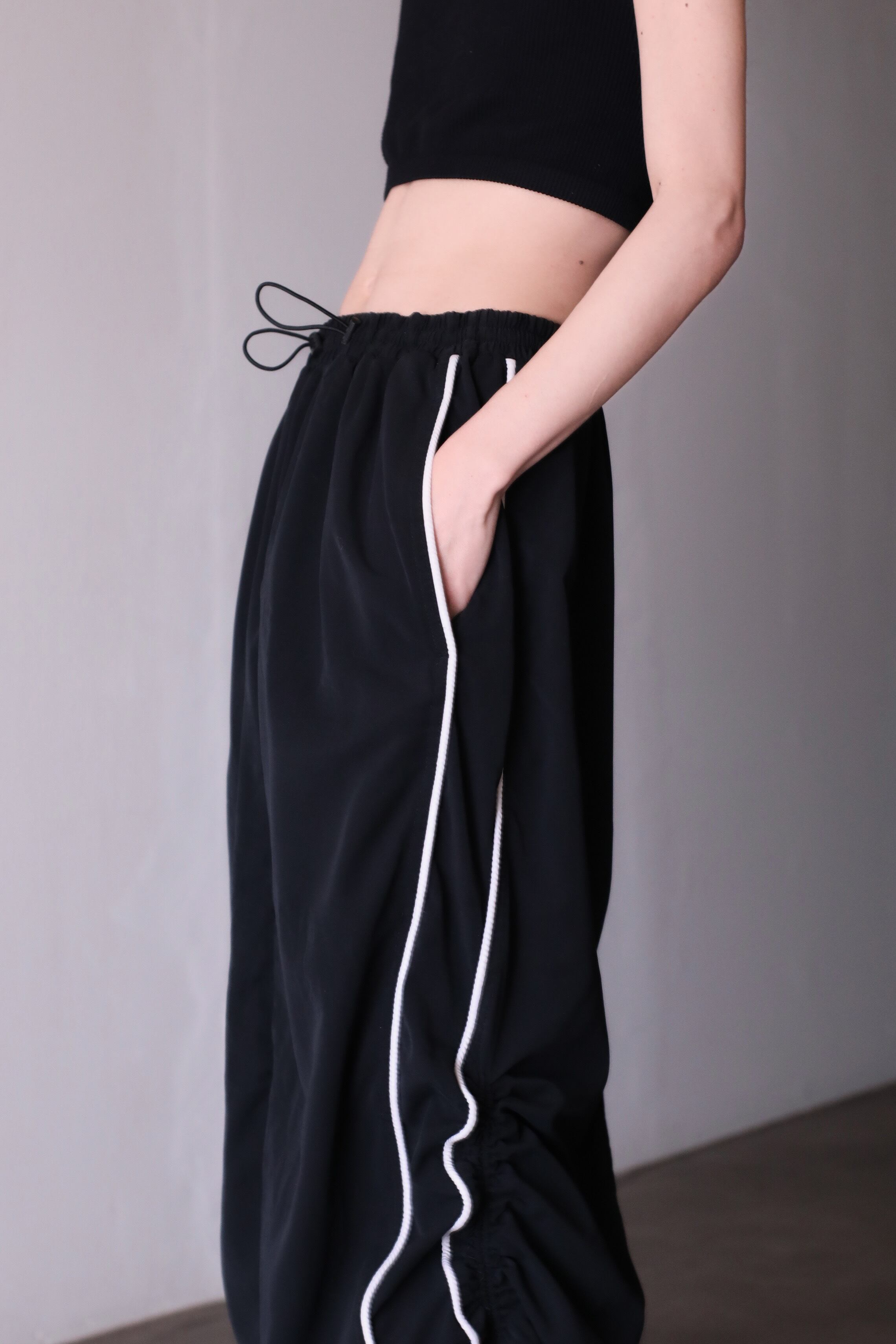ウエストと両サイド裾にドローコードが仕込まれているディテールで裾のドローはしぼると縦にクシュクシュとしてくれてデザイン性もバッチリです。