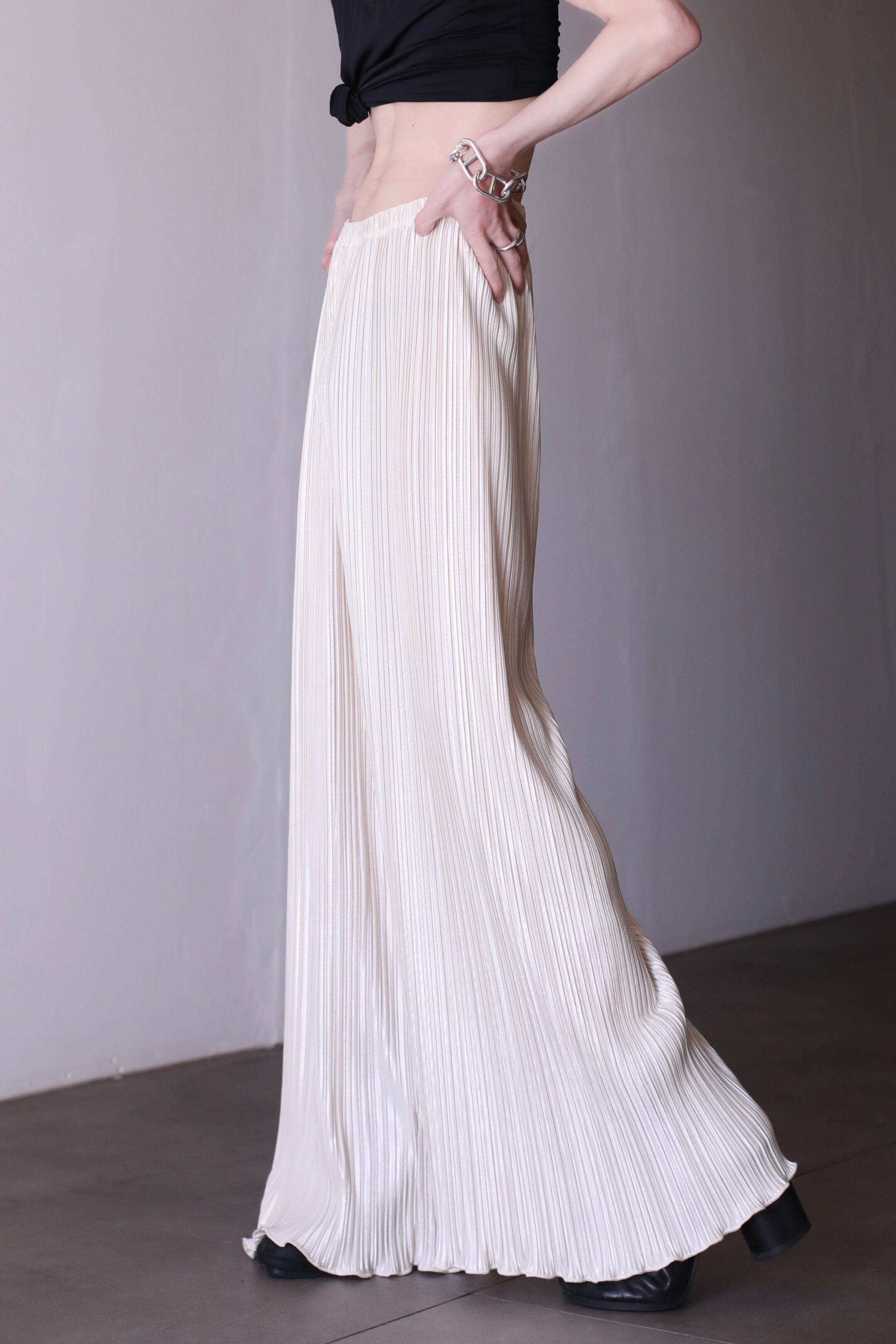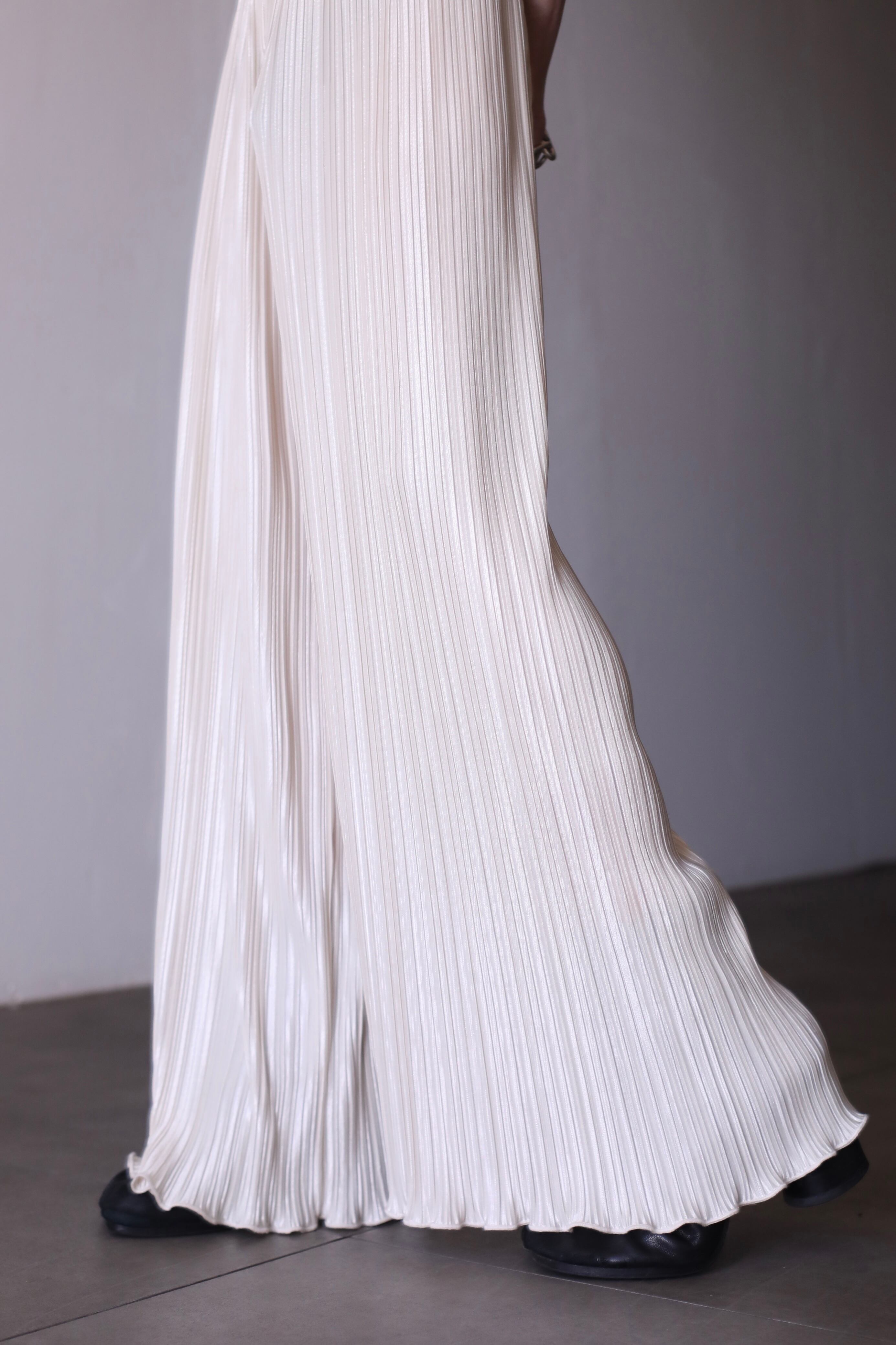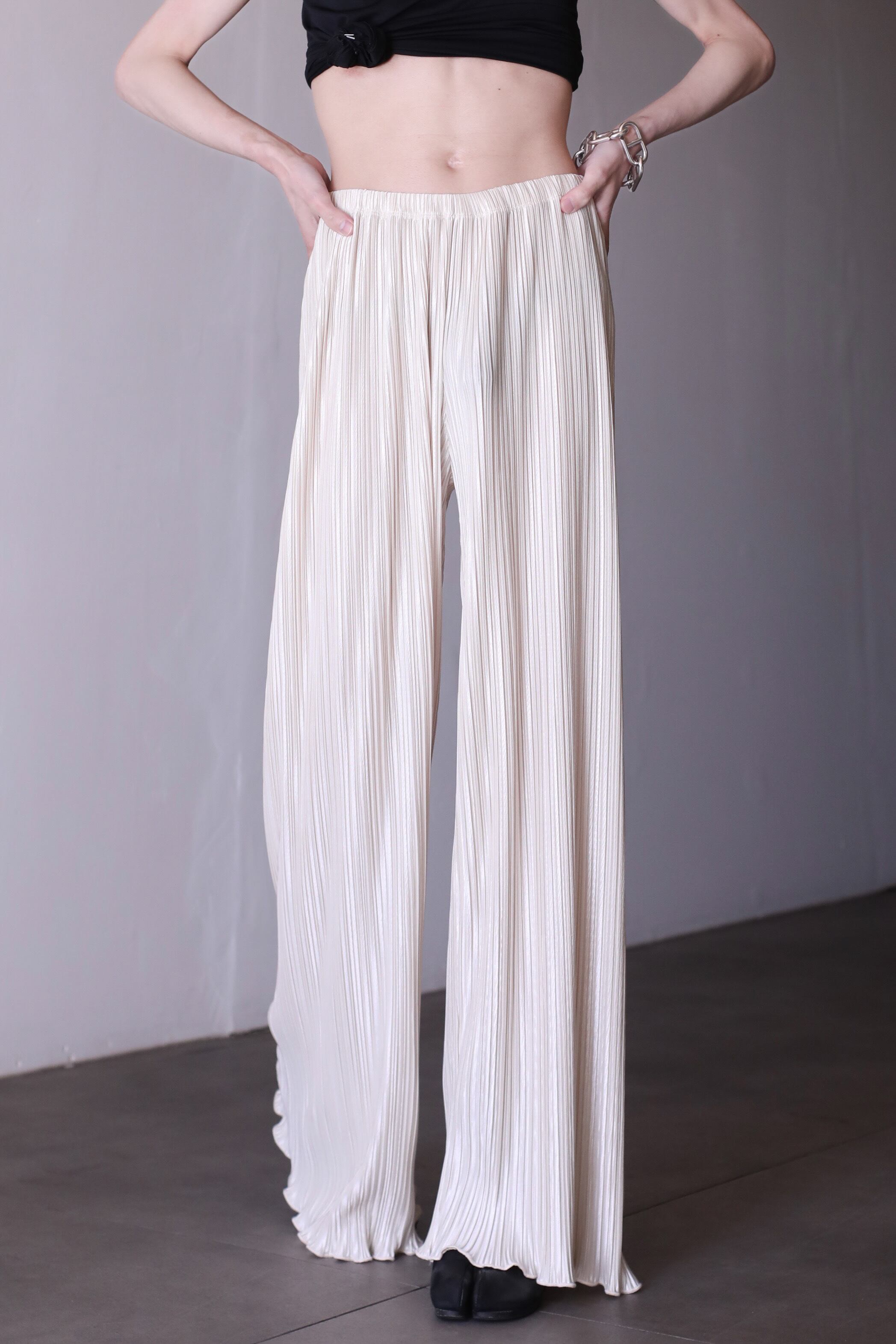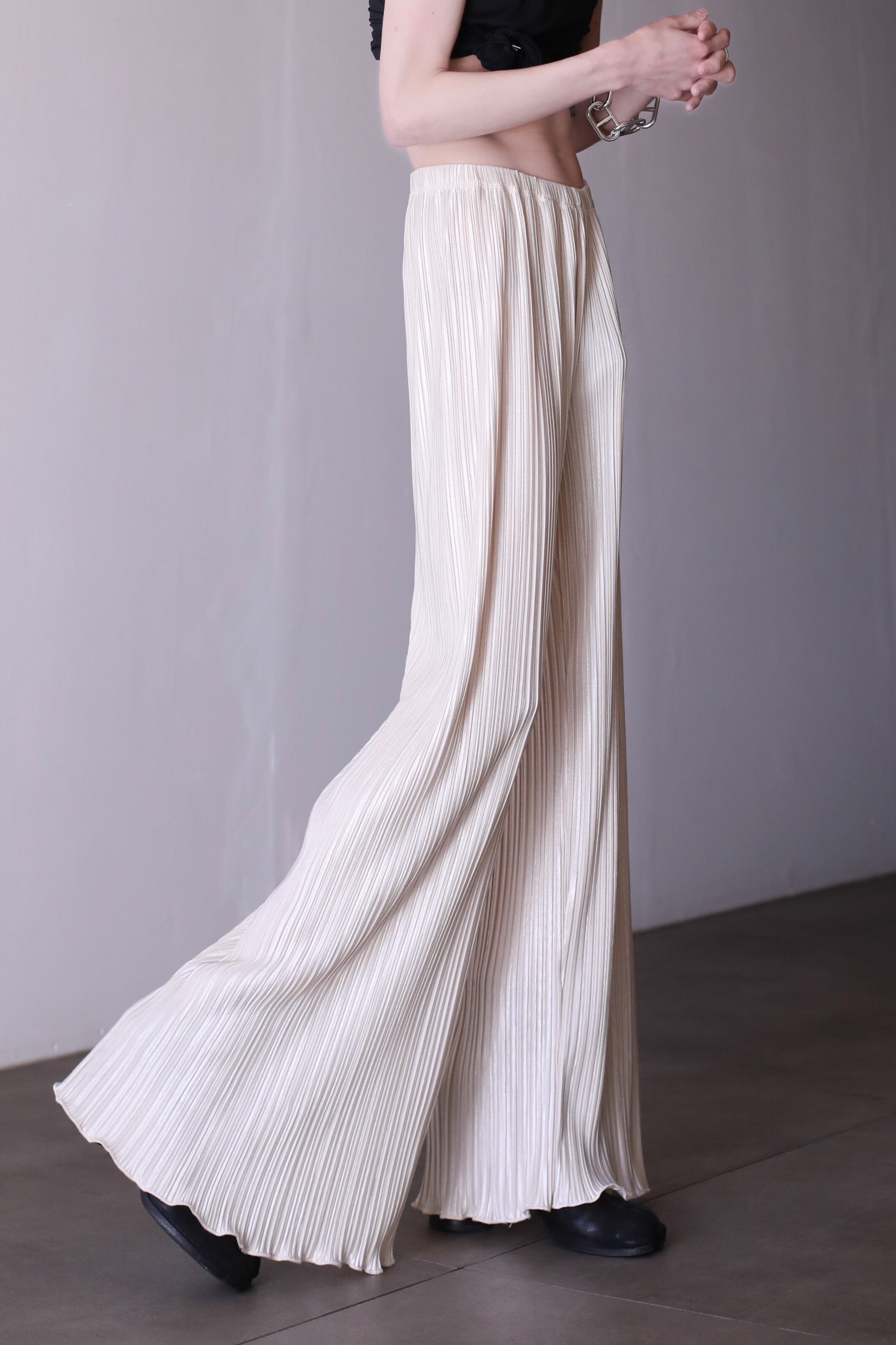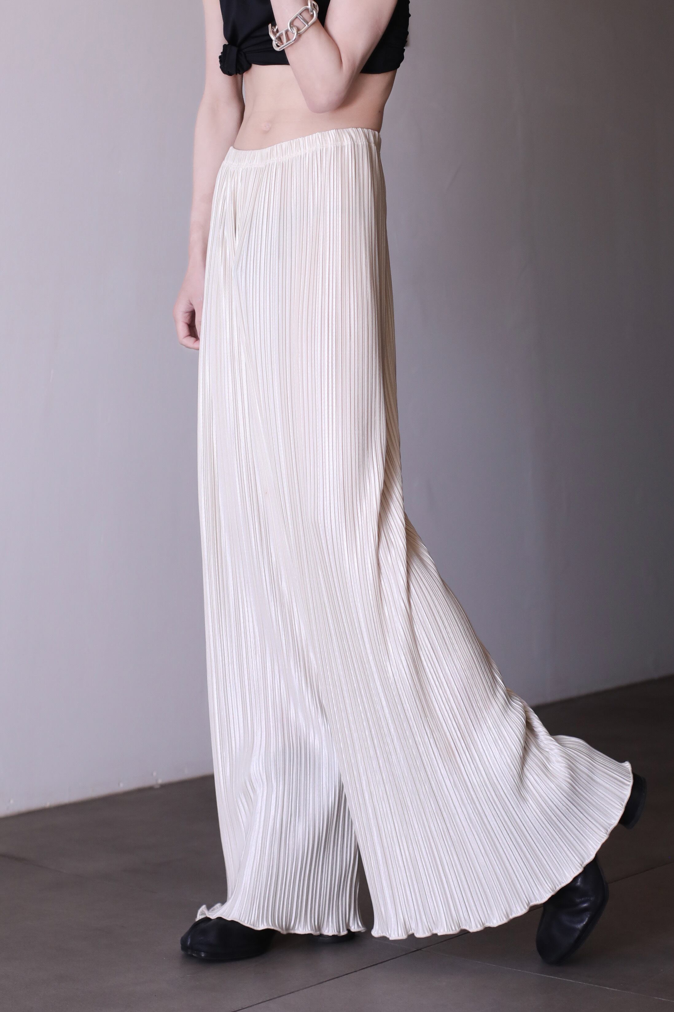 プリーツのワイドパンツ。