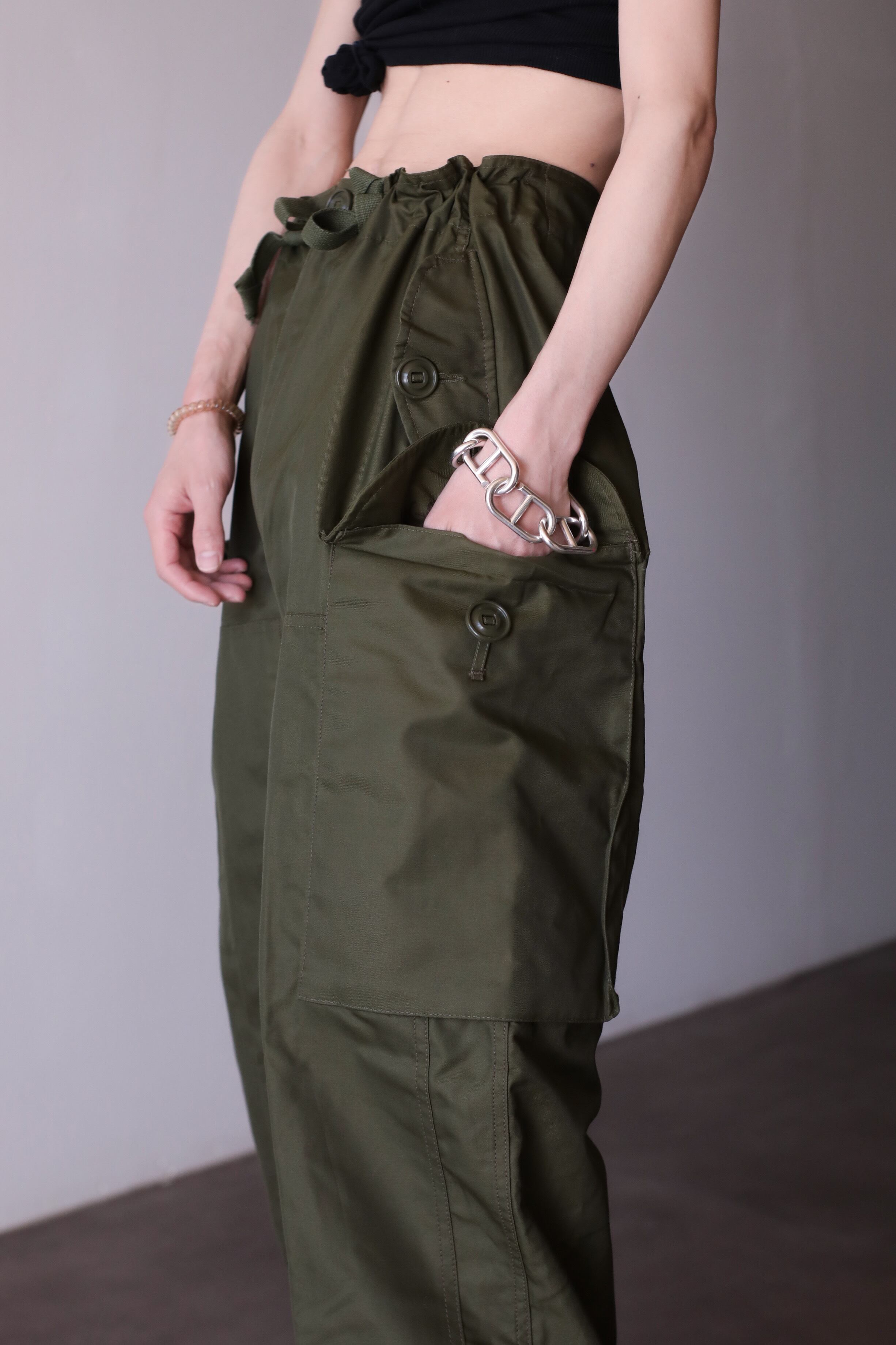 ウエスト 〜90cm (紐で最小まで絞れます) / 股下 80cm / 総丈 117cm / 裾幅 26cm (紐で絞れます)