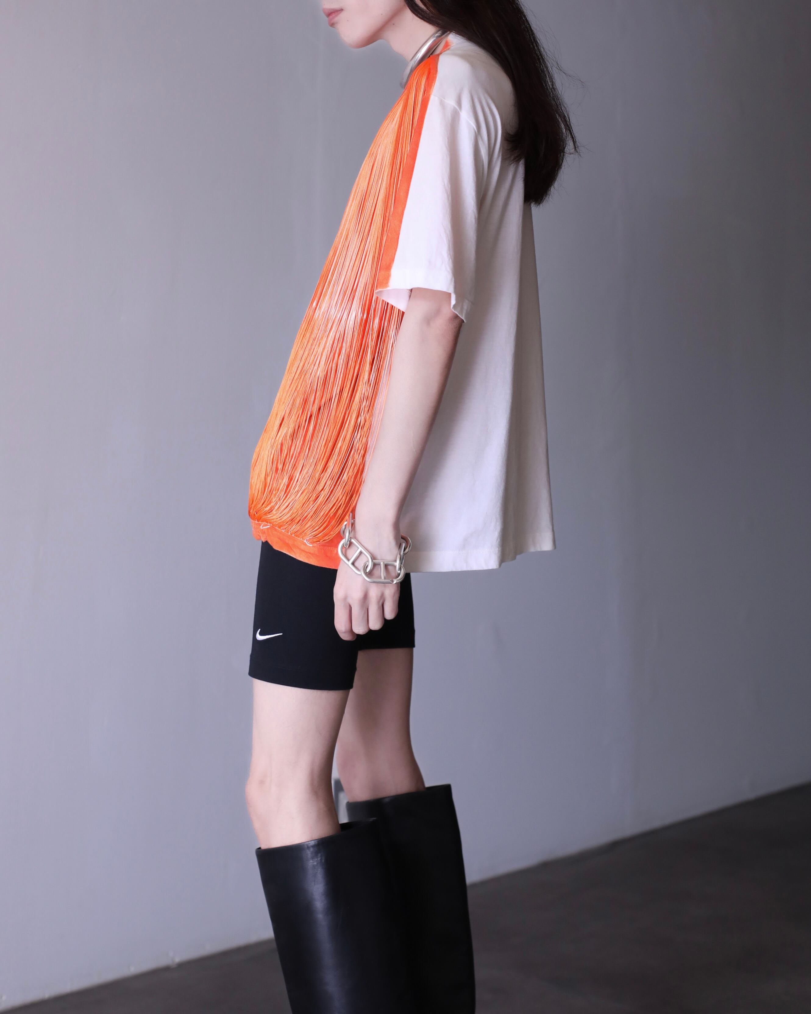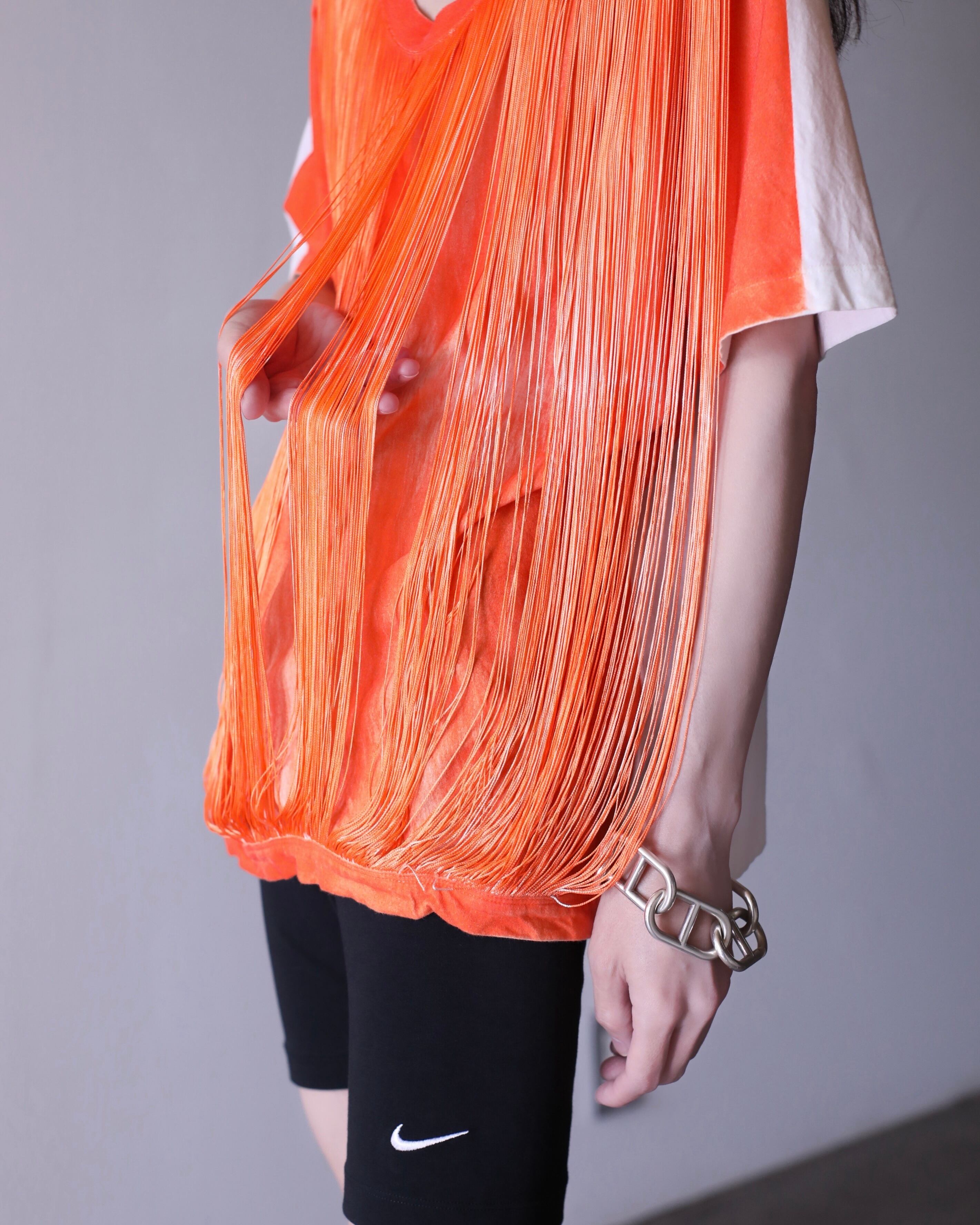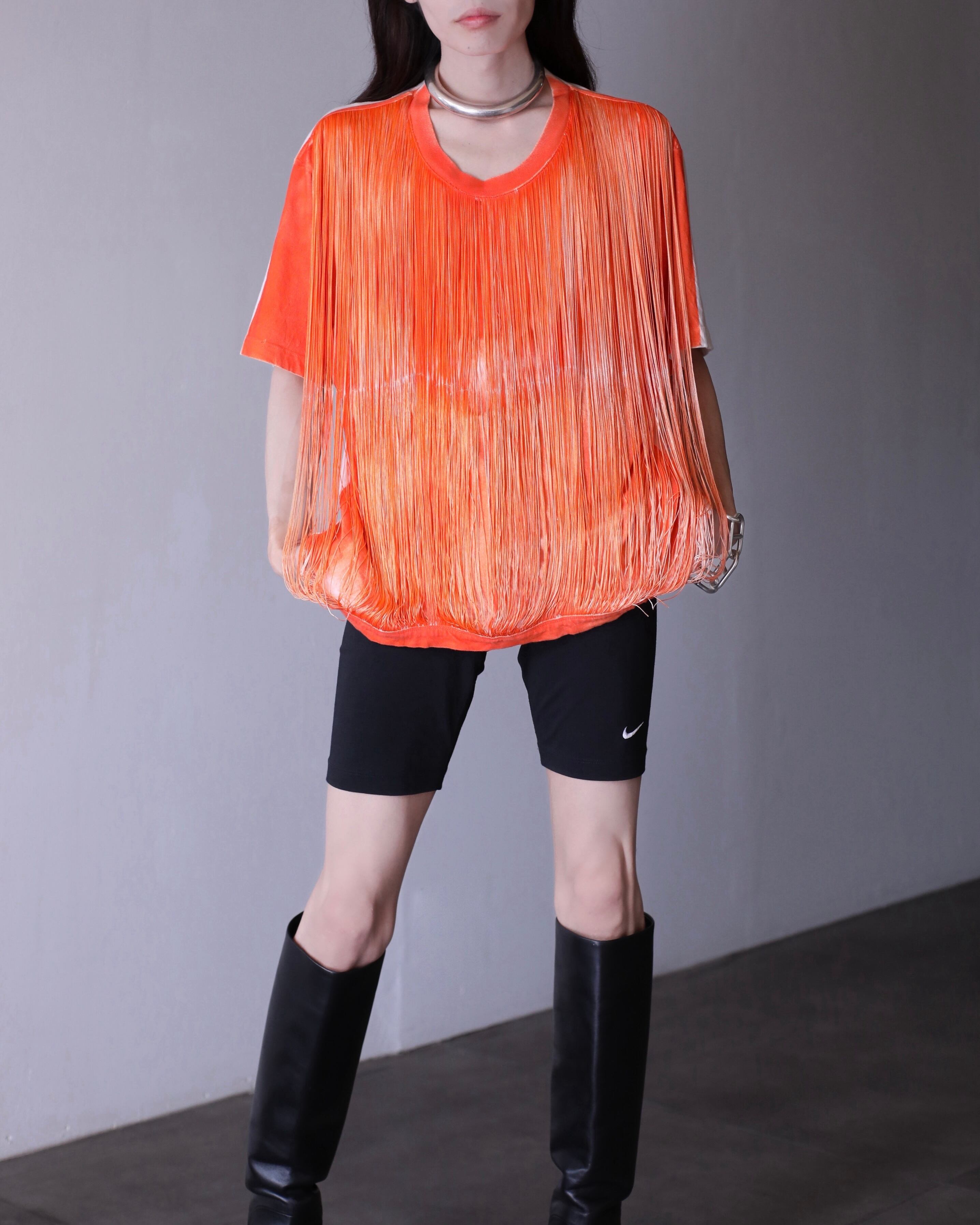 本体とフリンジを一体で染色することで、Tシャツ本体にも絶妙なフェードがかけられており、計算された退廃的なムードが漂います。