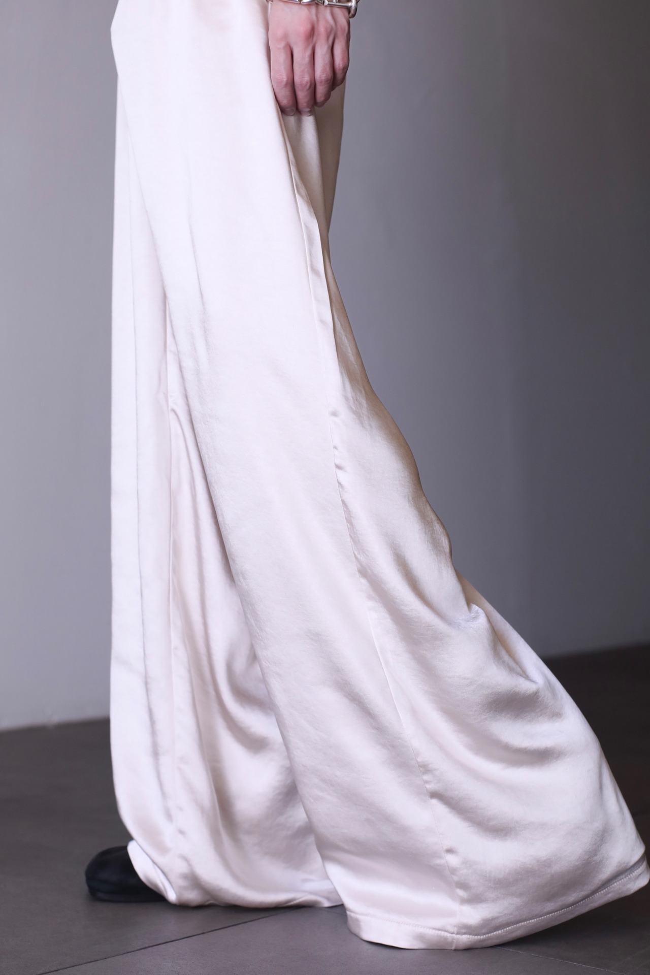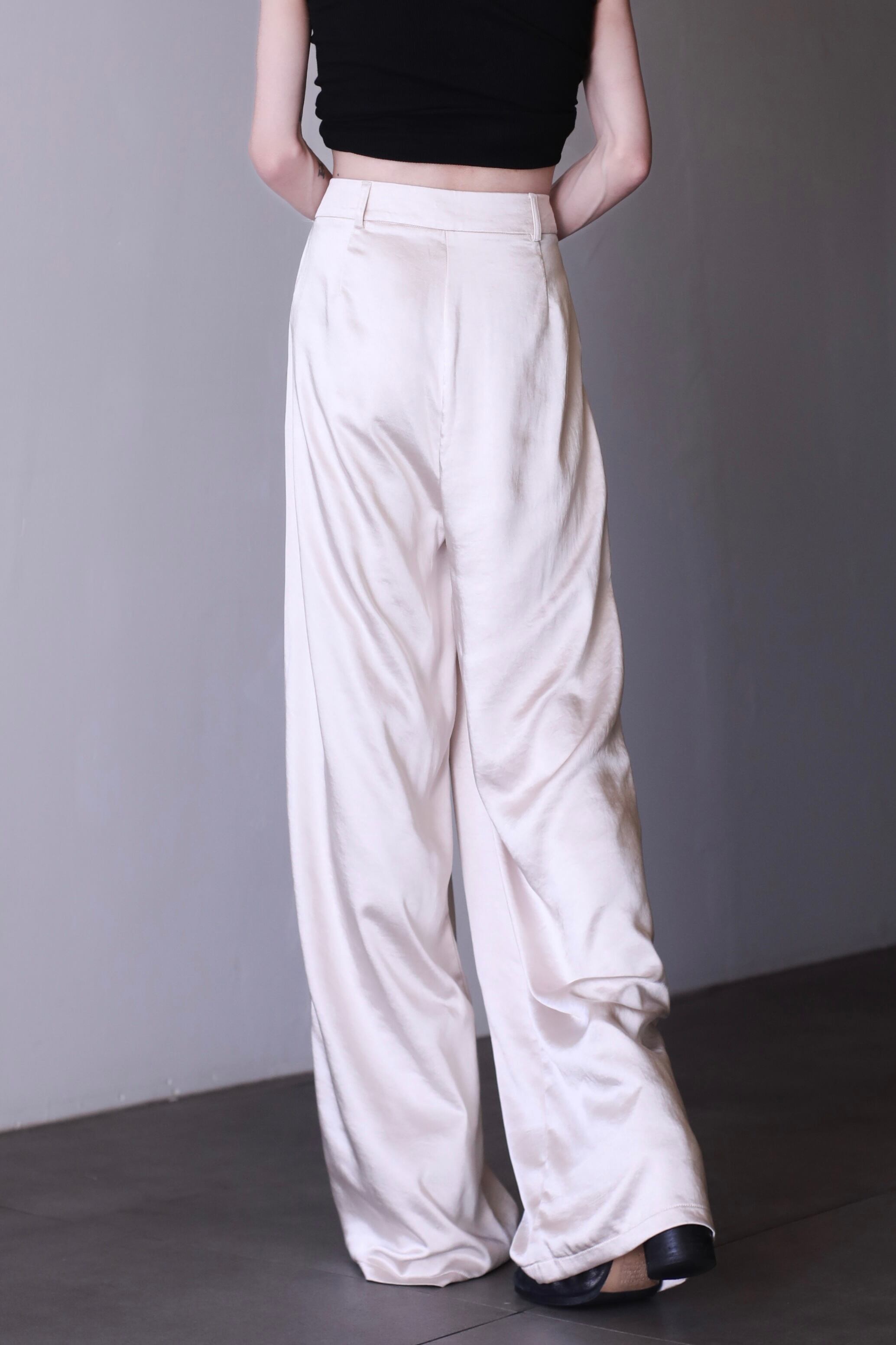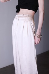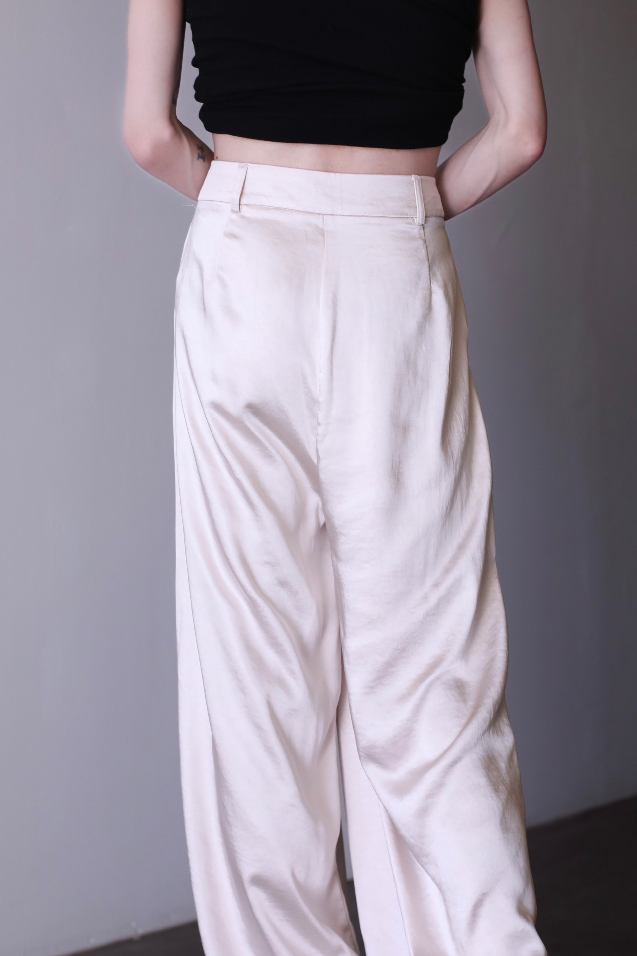 シャンパンゴールドカラーのサテンのタックワイドスラックス。