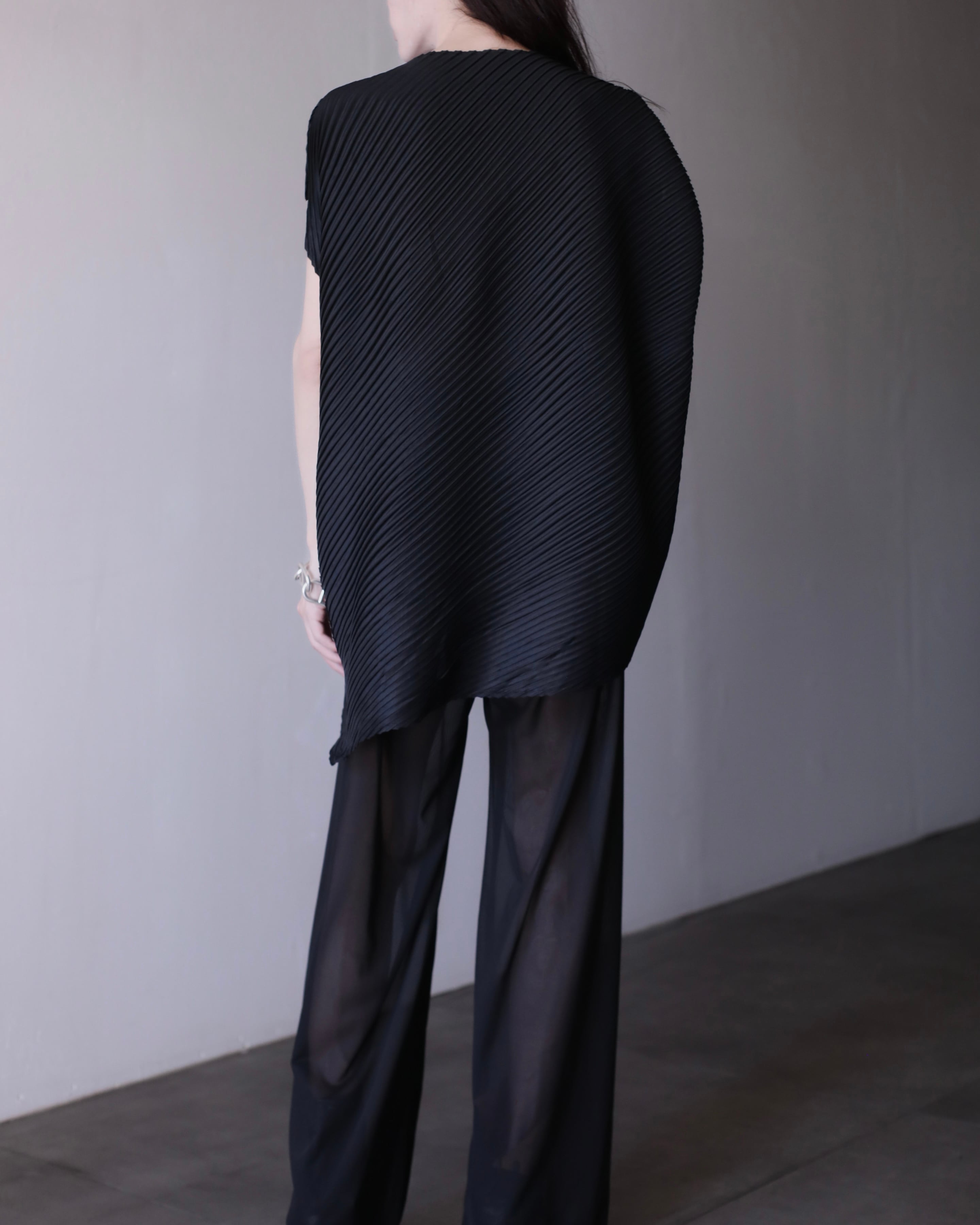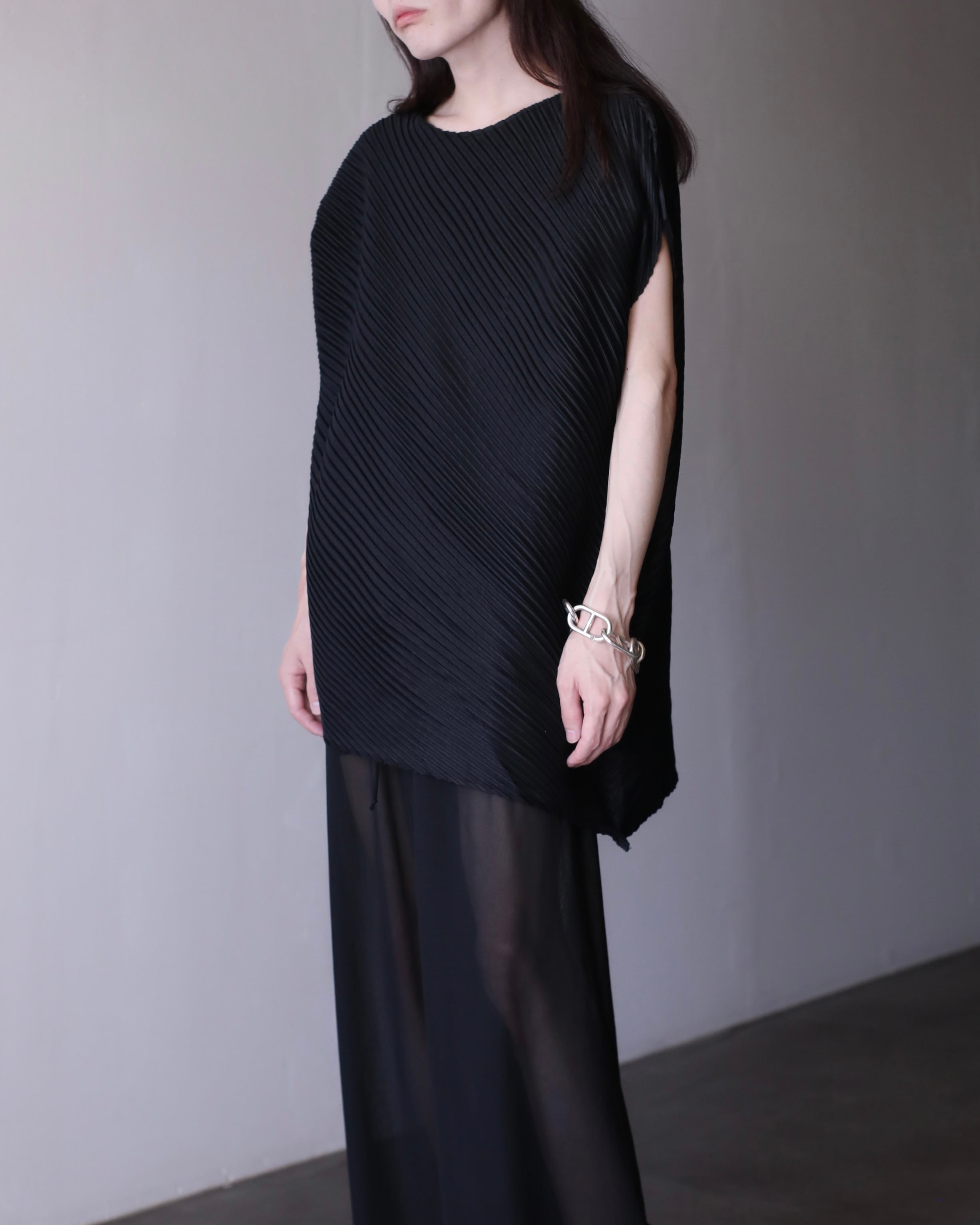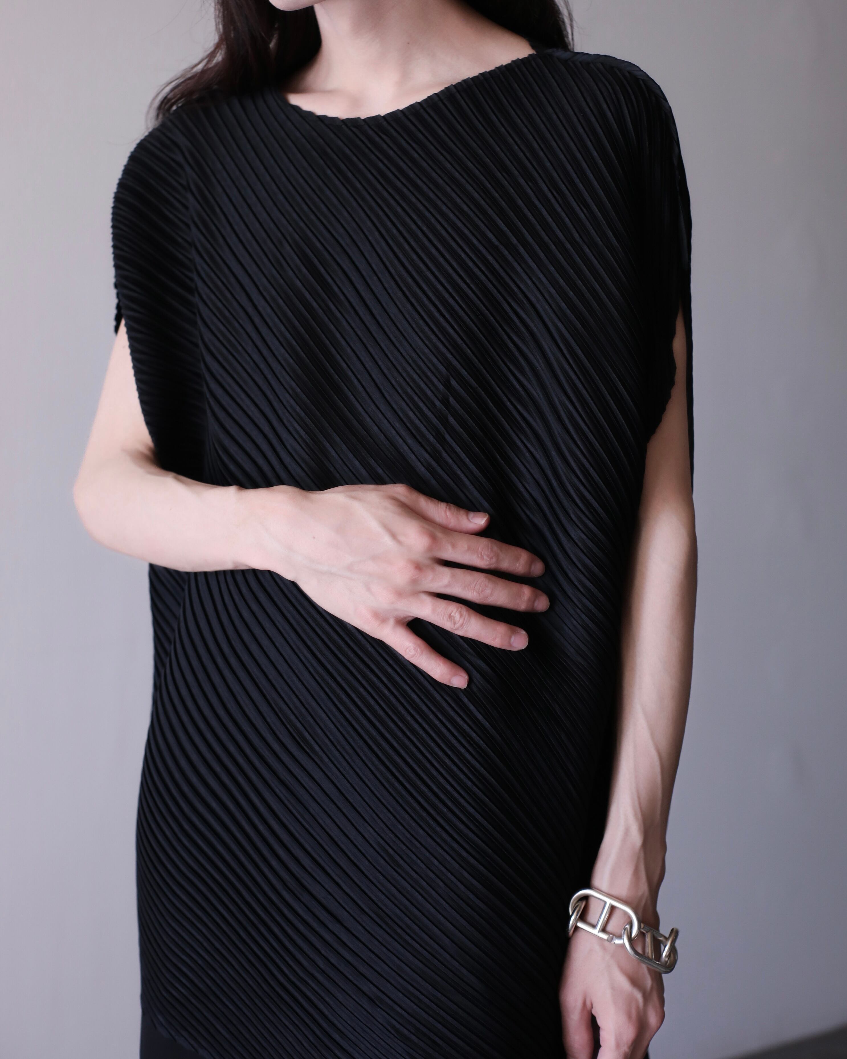 あえてプリーツをかけない部分を作って、服のフォルムを作りだす特殊な技術です。