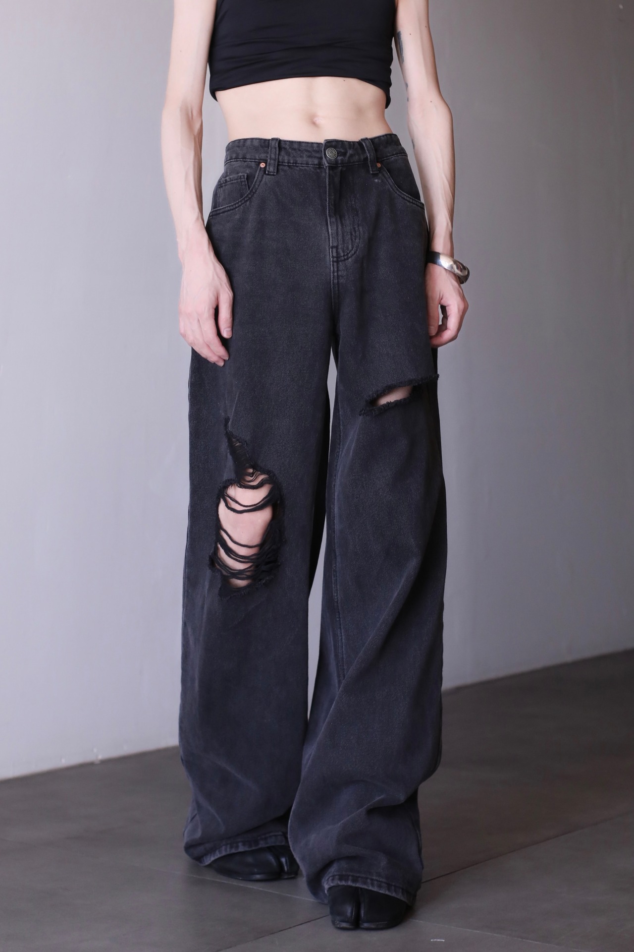 destroy design wide straight fade black denim pants