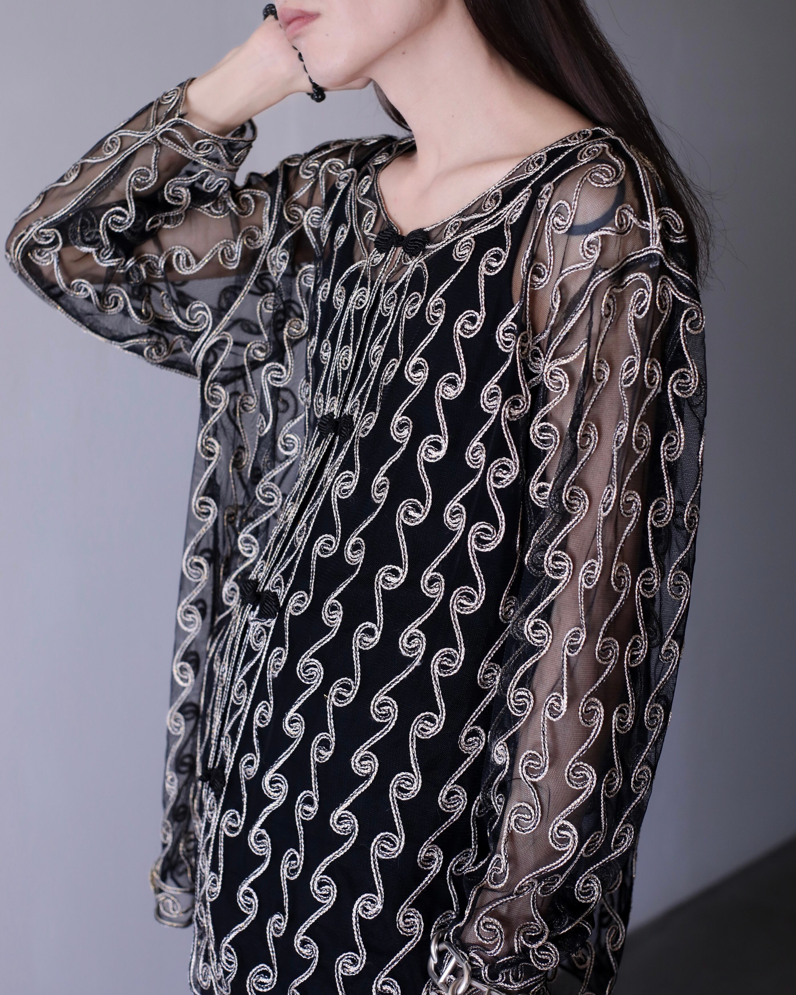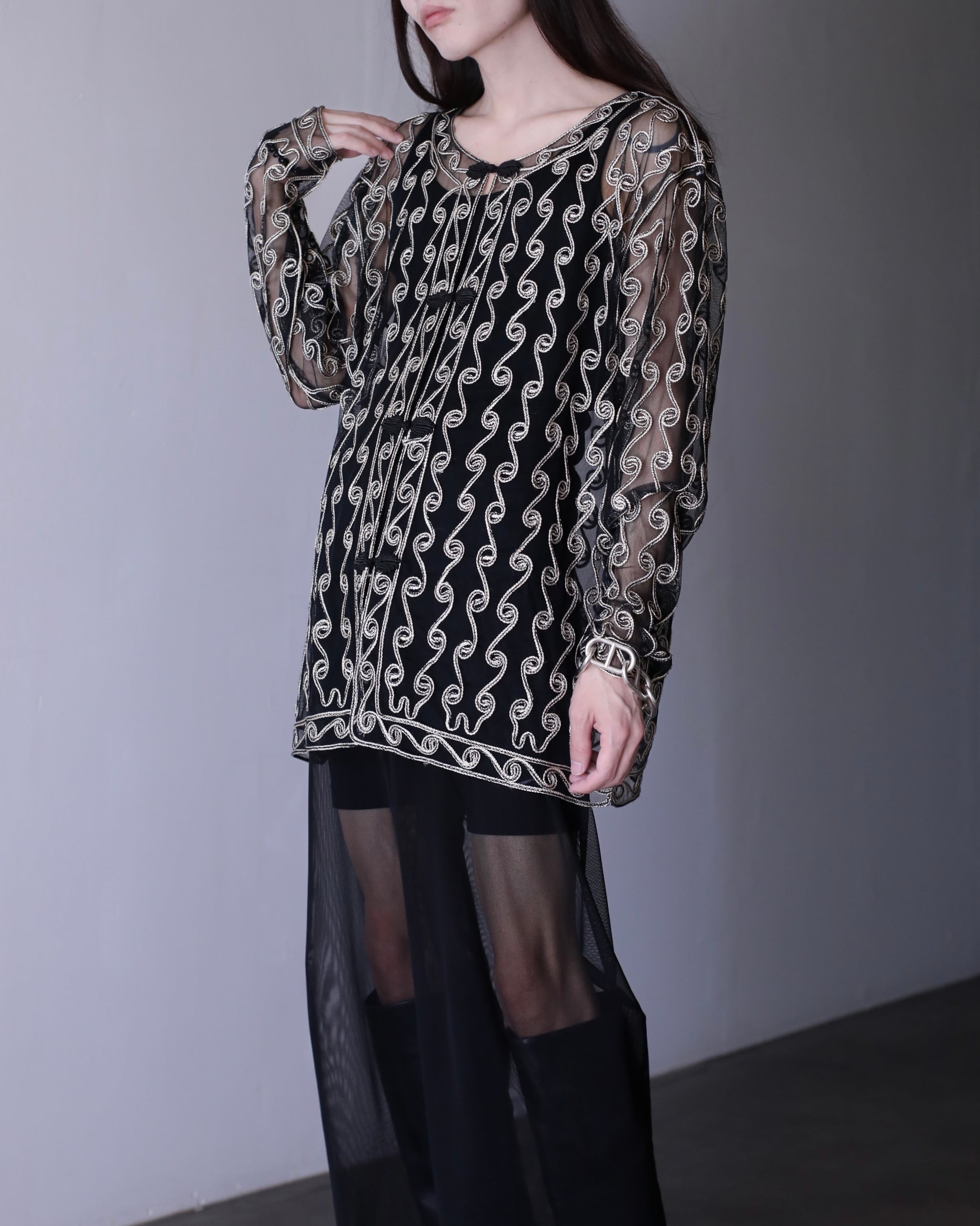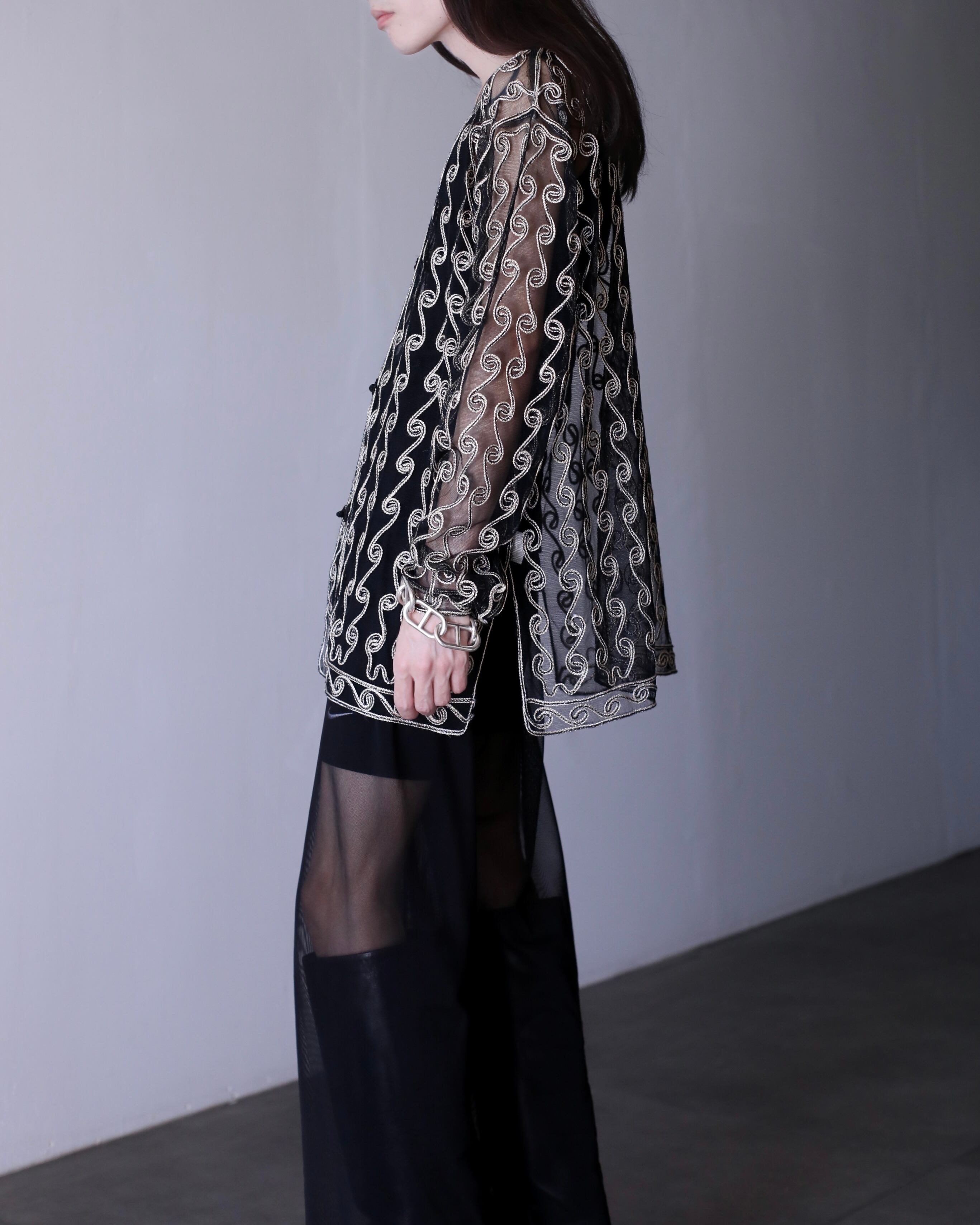 1990s sheer × embroidery kang-fu design no collar jacket