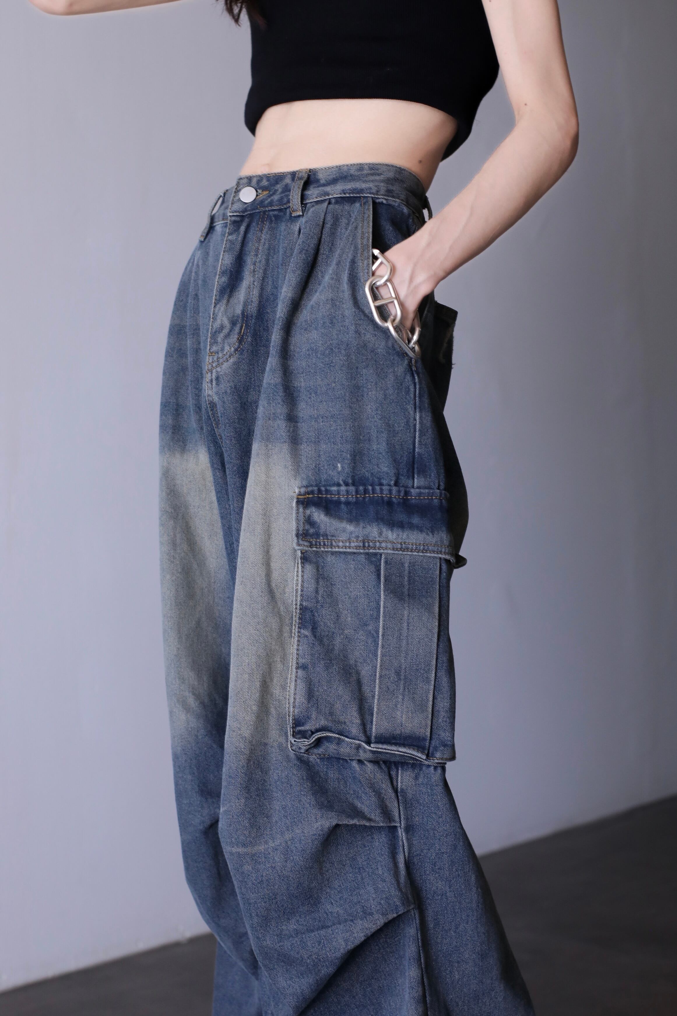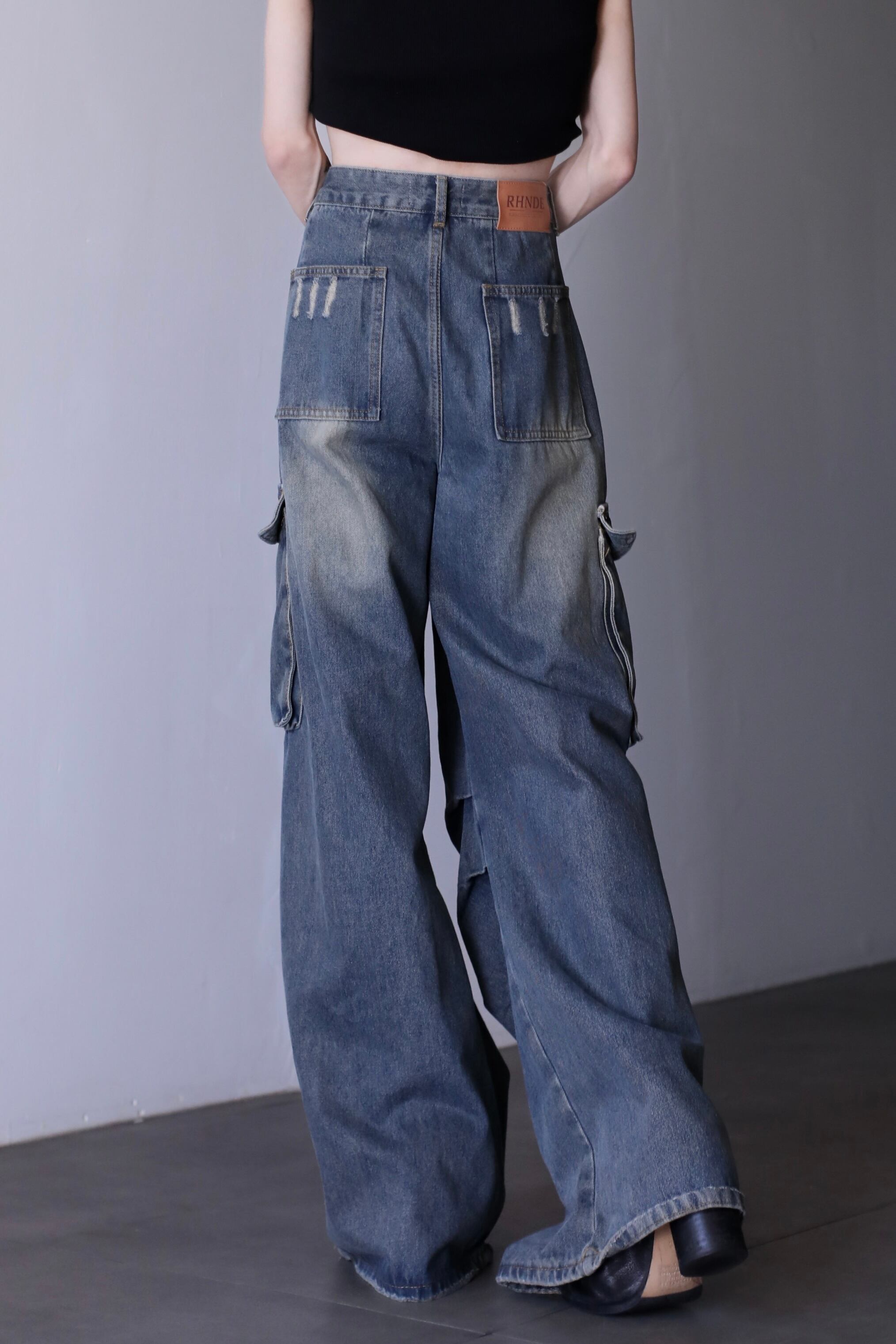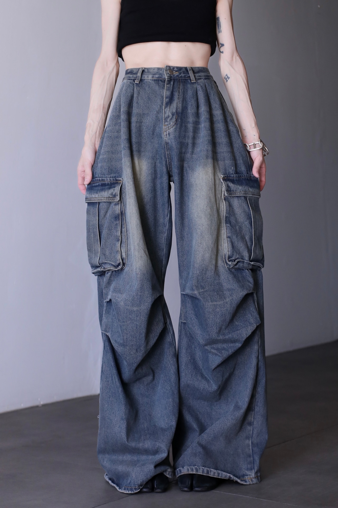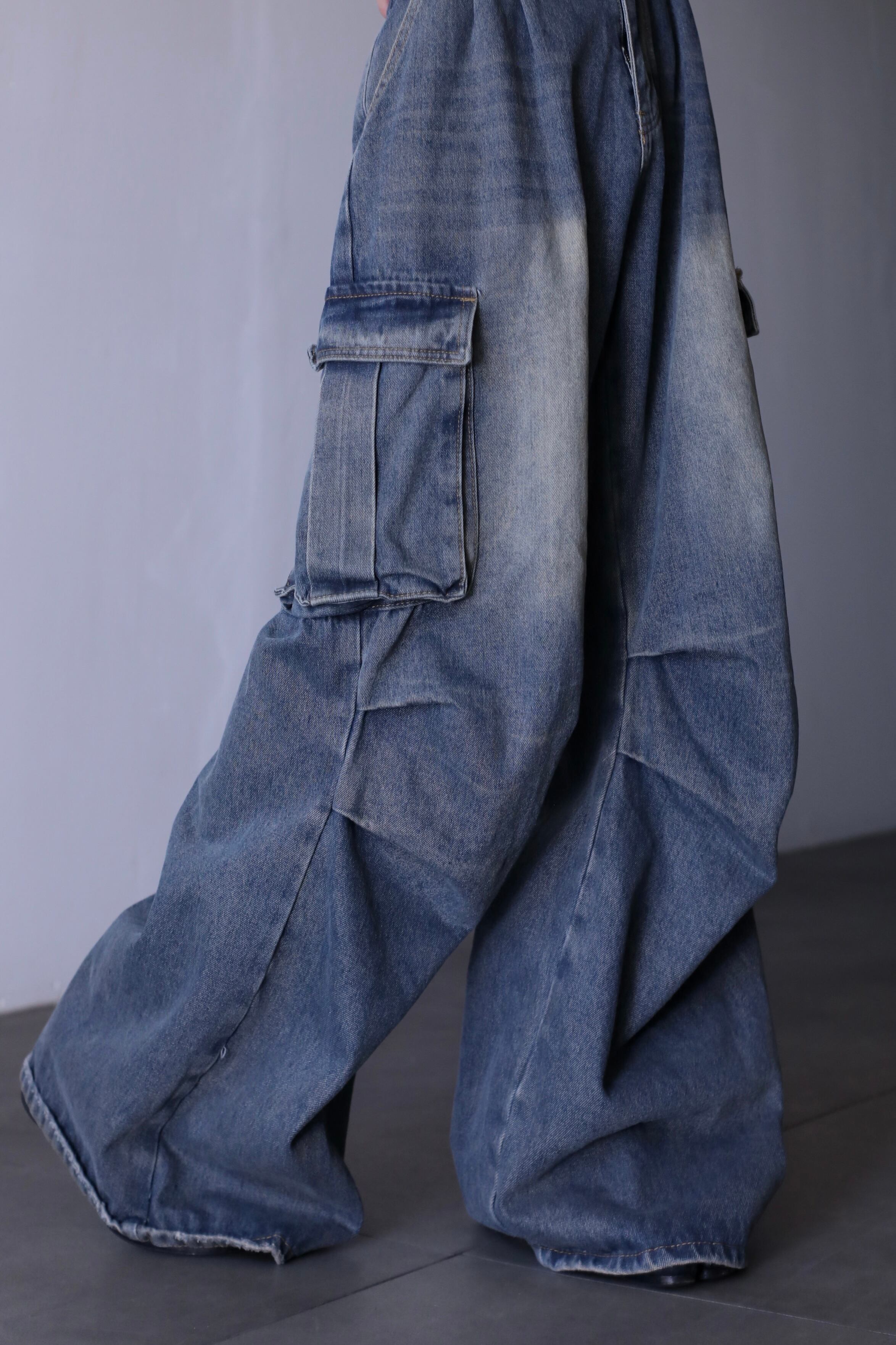 "gokubuto" hi-waist tuck design super wide denim parachute pants