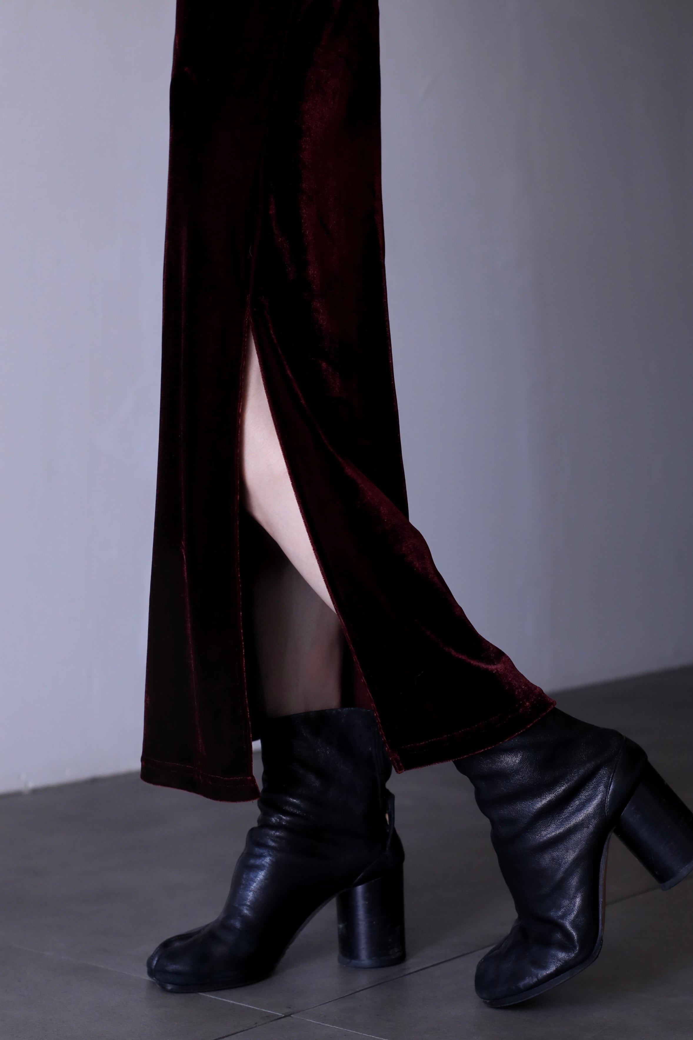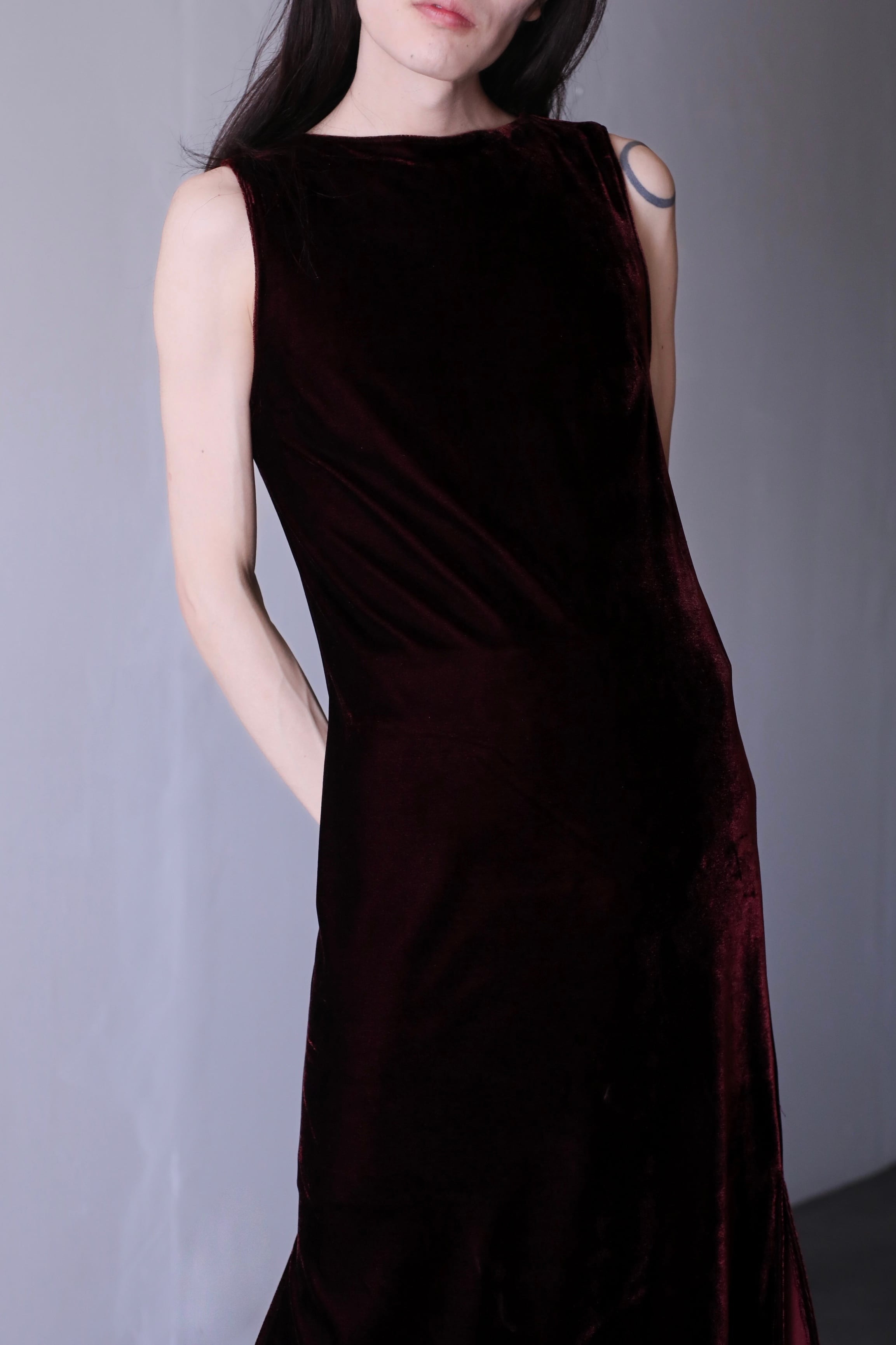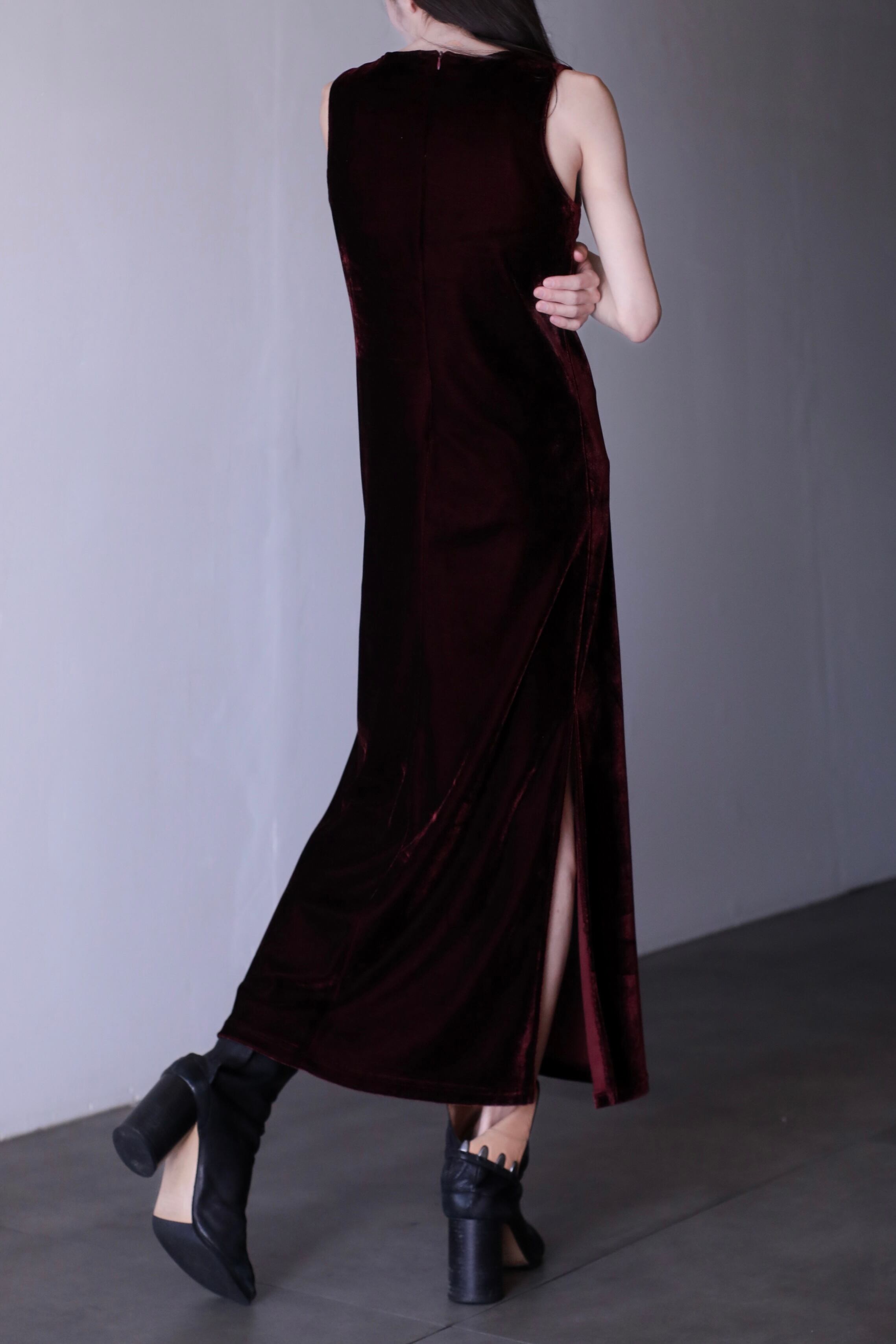 深みのあるワインレッドが印象的なベロアワンピース。