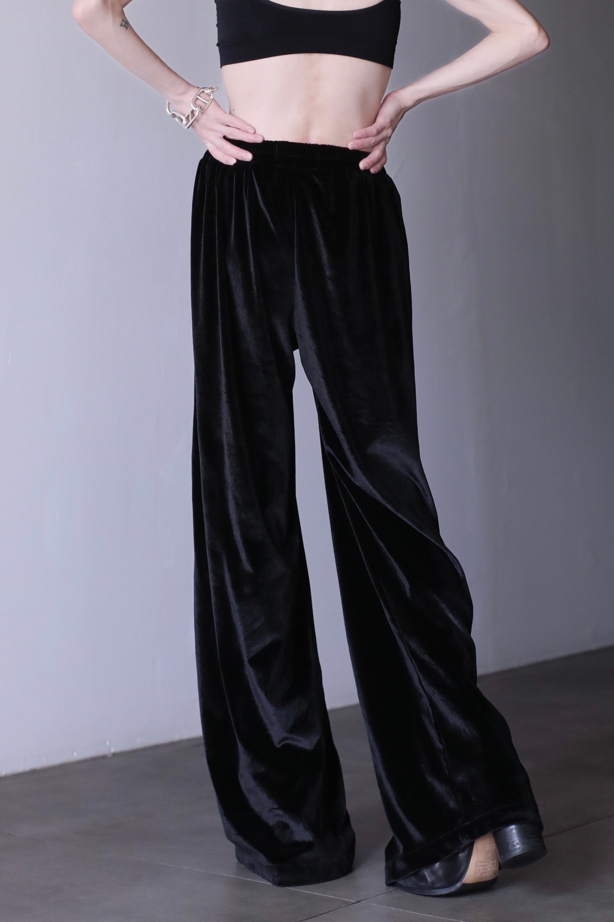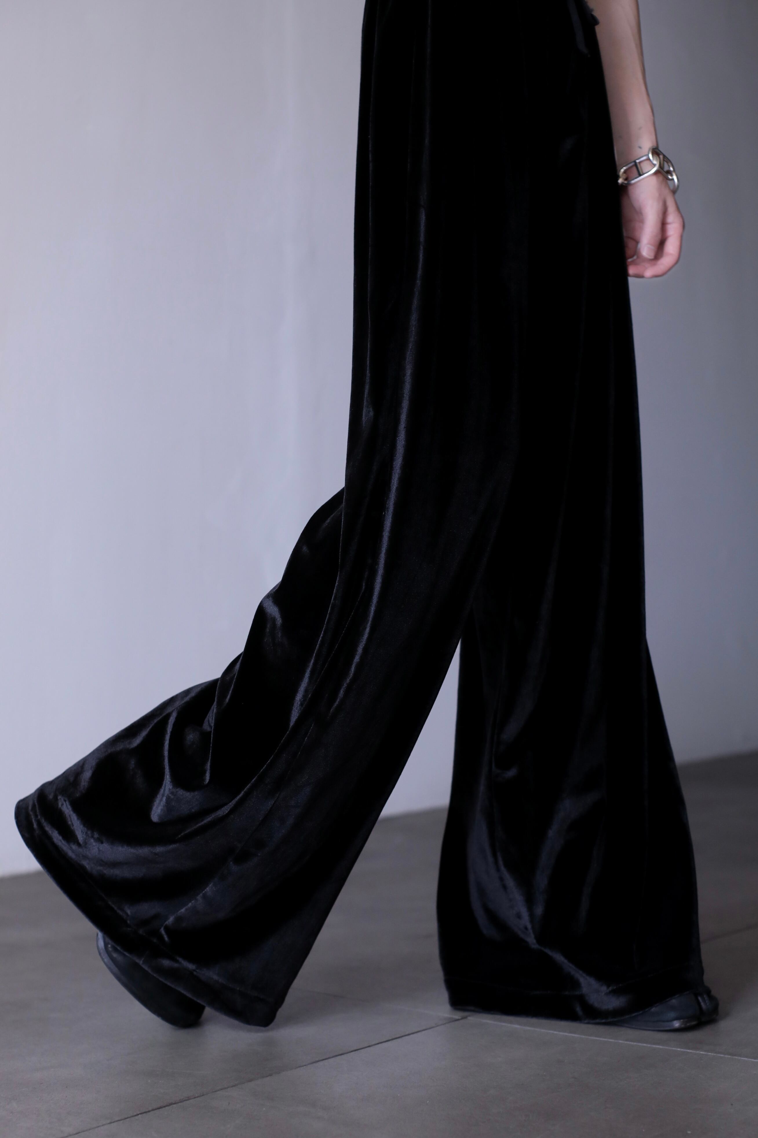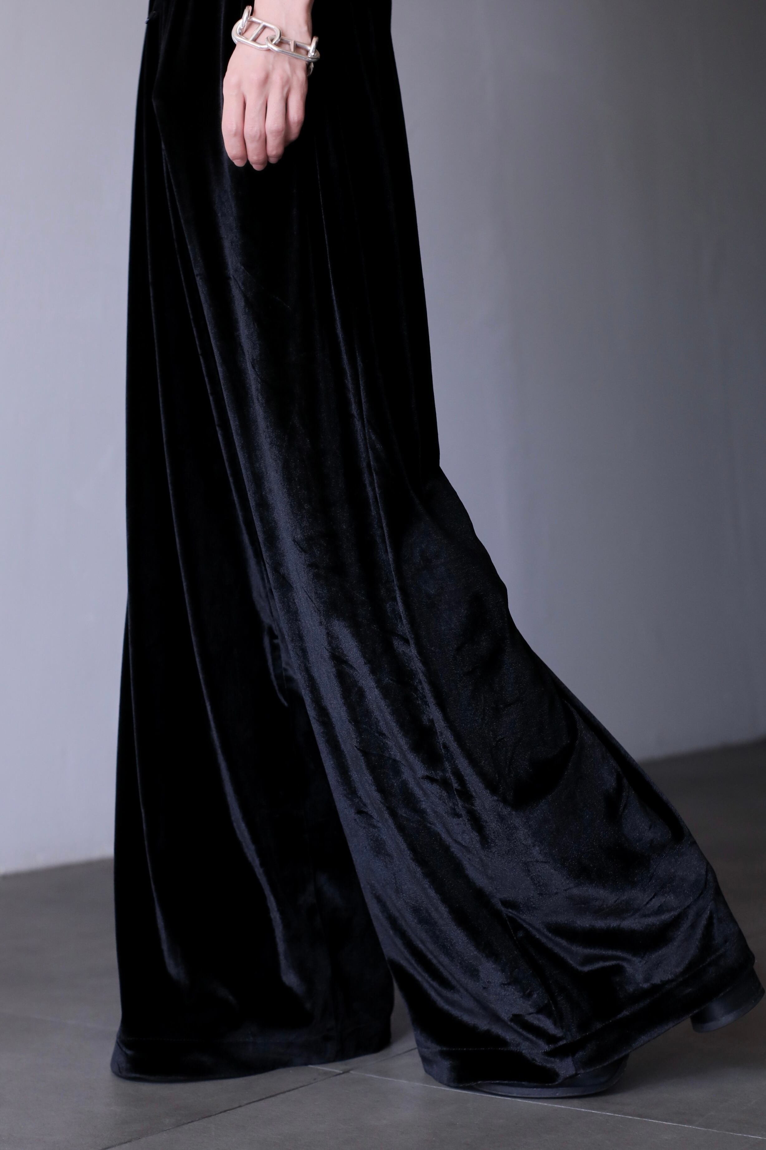 hi-waist black velours wide straight pants metal parts design
