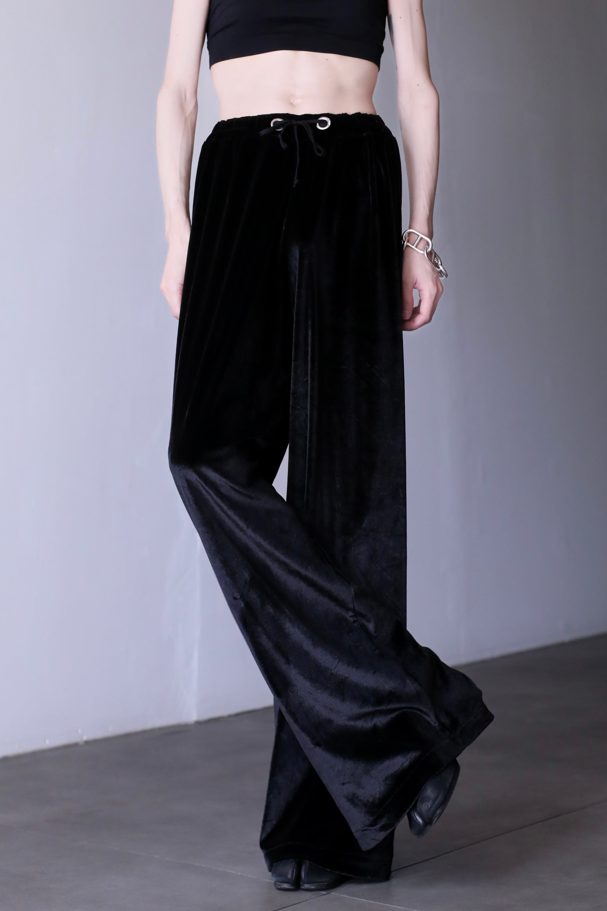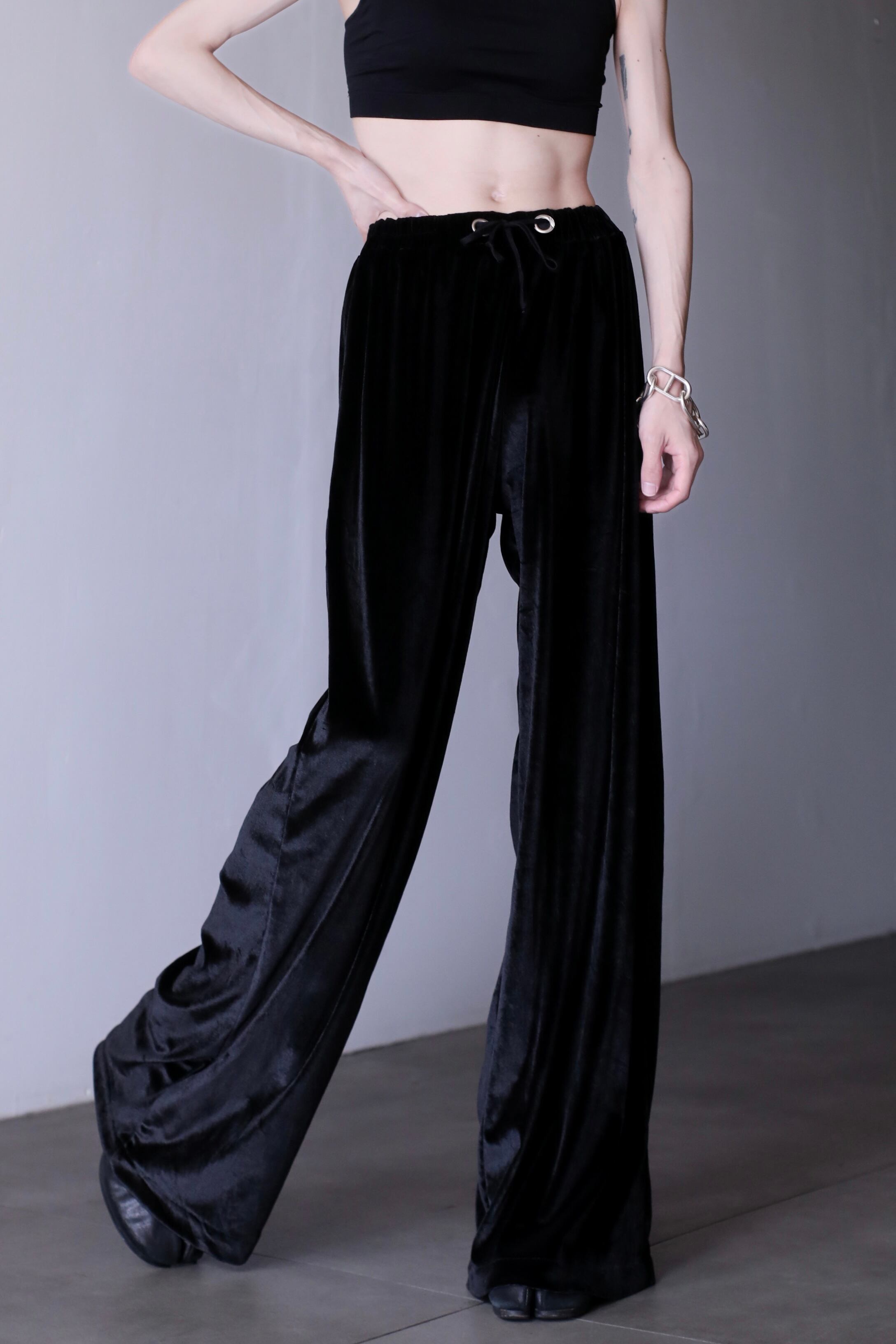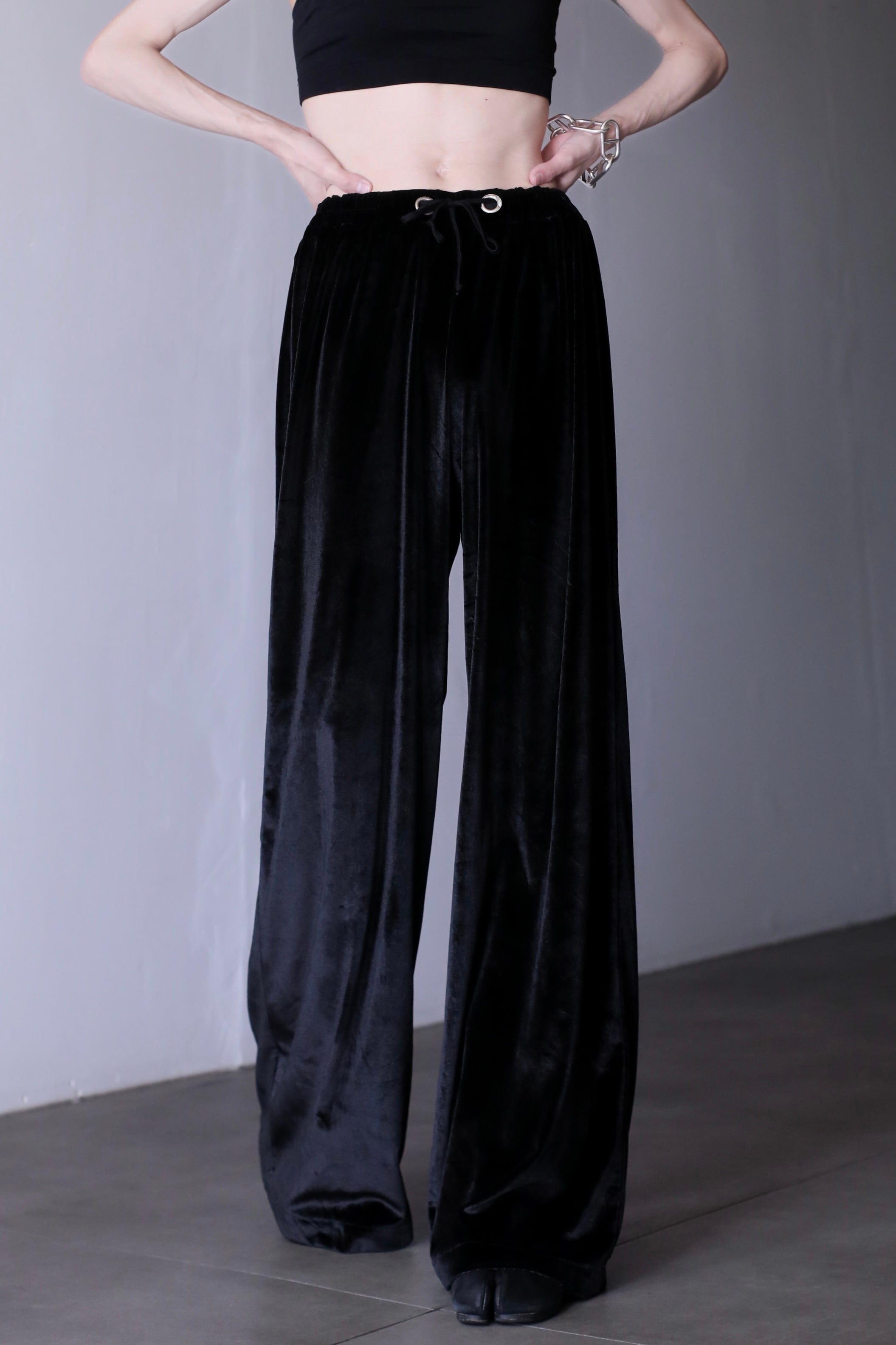 hi-waist black velours wide straight pants metal parts design