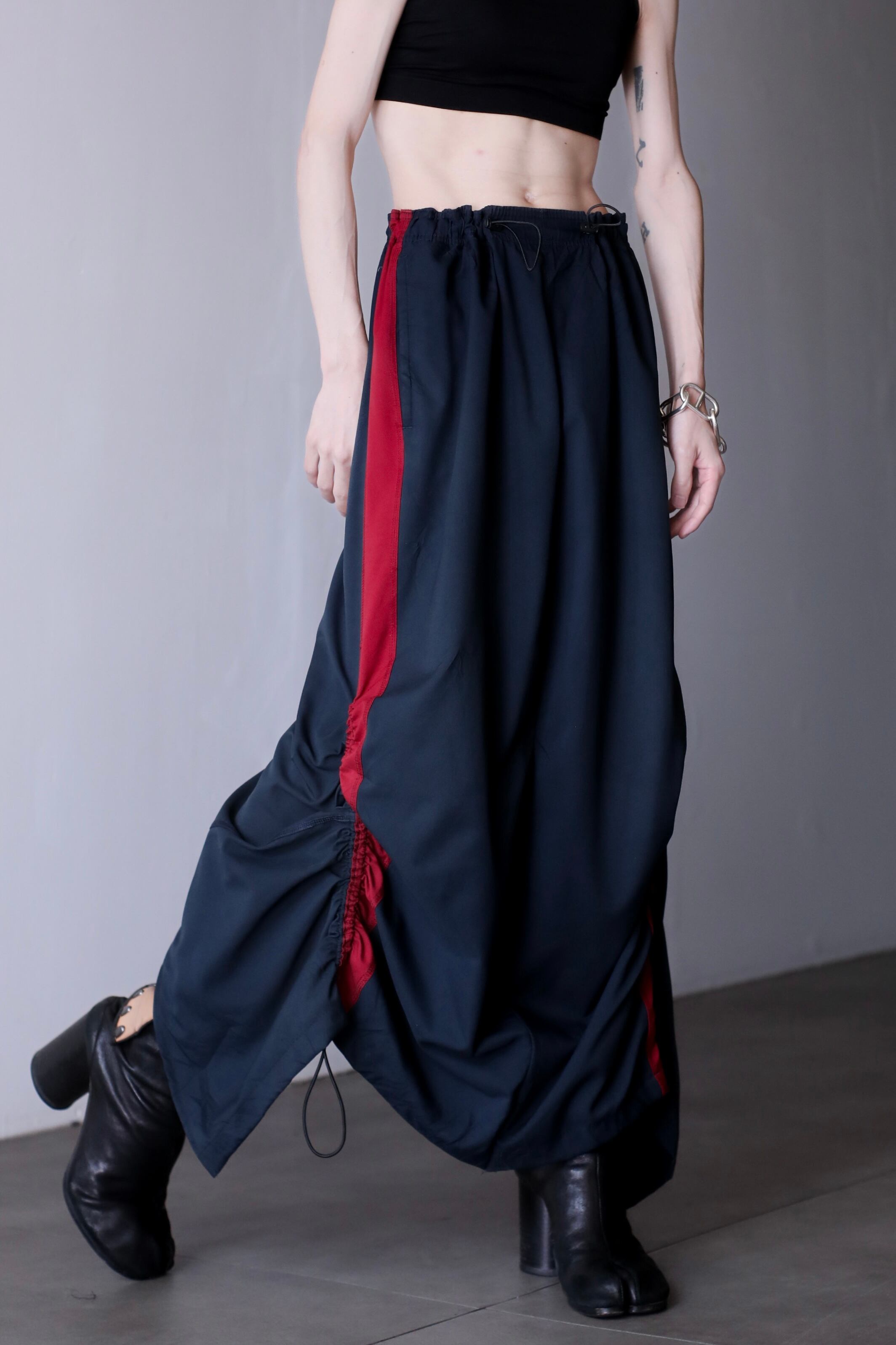ウエストと両サイド裾にドローコードが仕込まれているディテールで裾のドローはしぼると縦にクシュクシュとしてくれてデザイン性もバッチリです。
