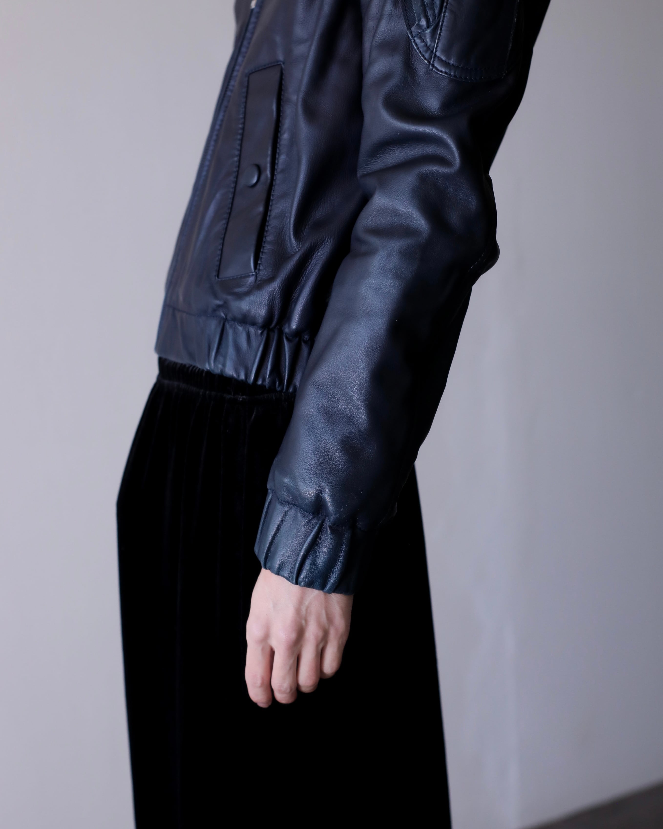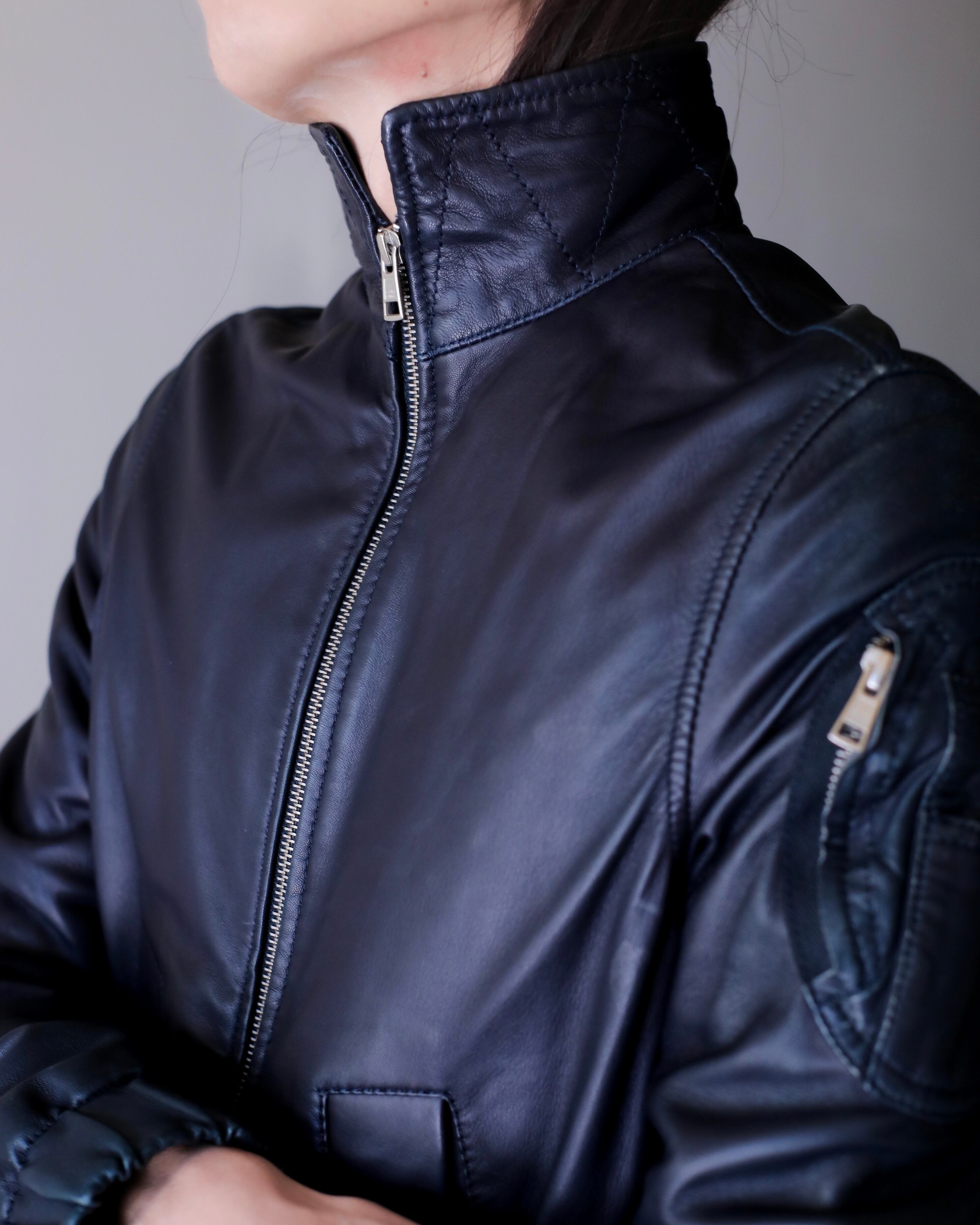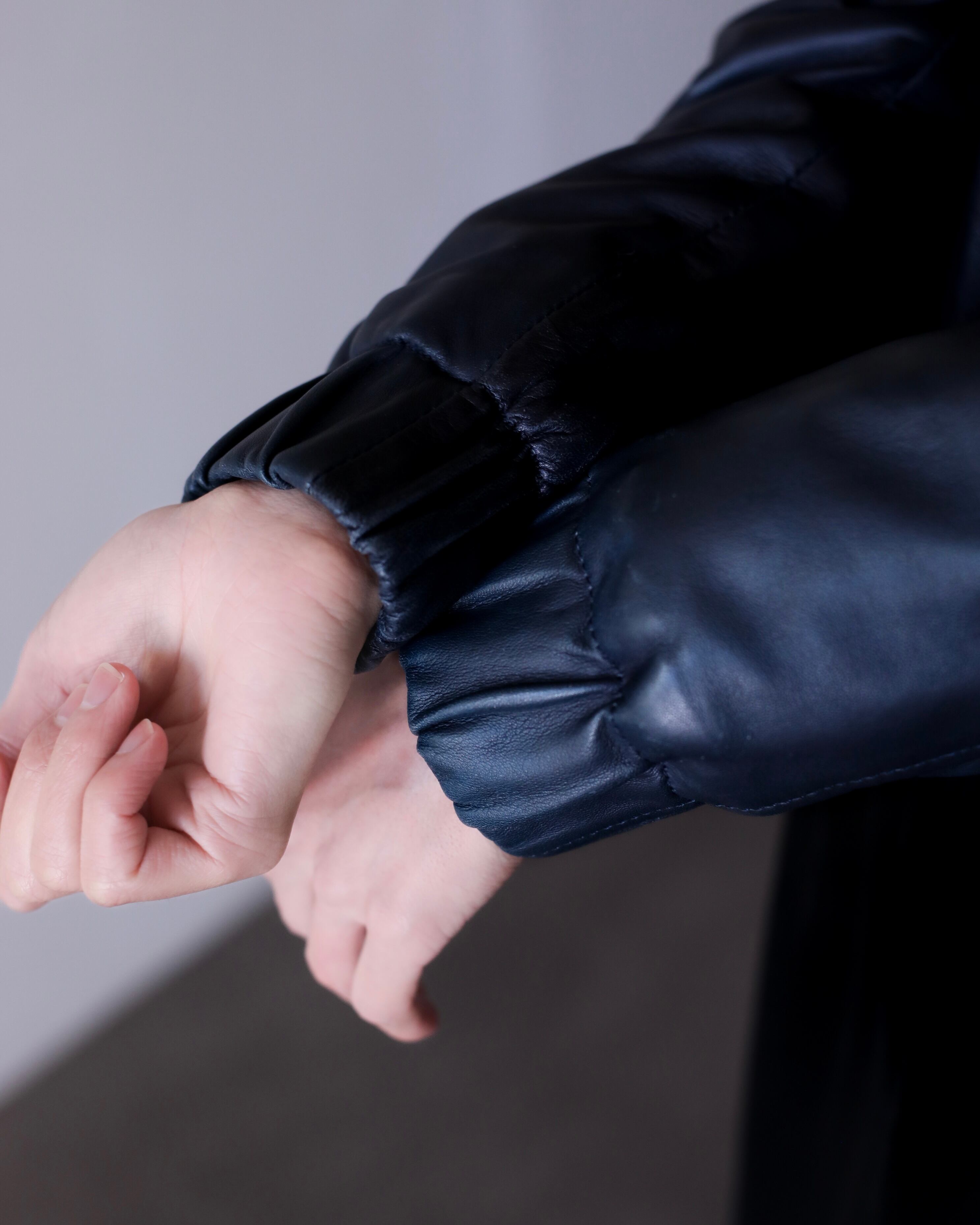 レザーのネイビーってブラックよりも寧ろ魅力的だと思っていて、独特の深みのあるモードな感じがすごく好きです。一般的なネイビーはカジュアルになりますが、レザーに限ってはモードだと思います。