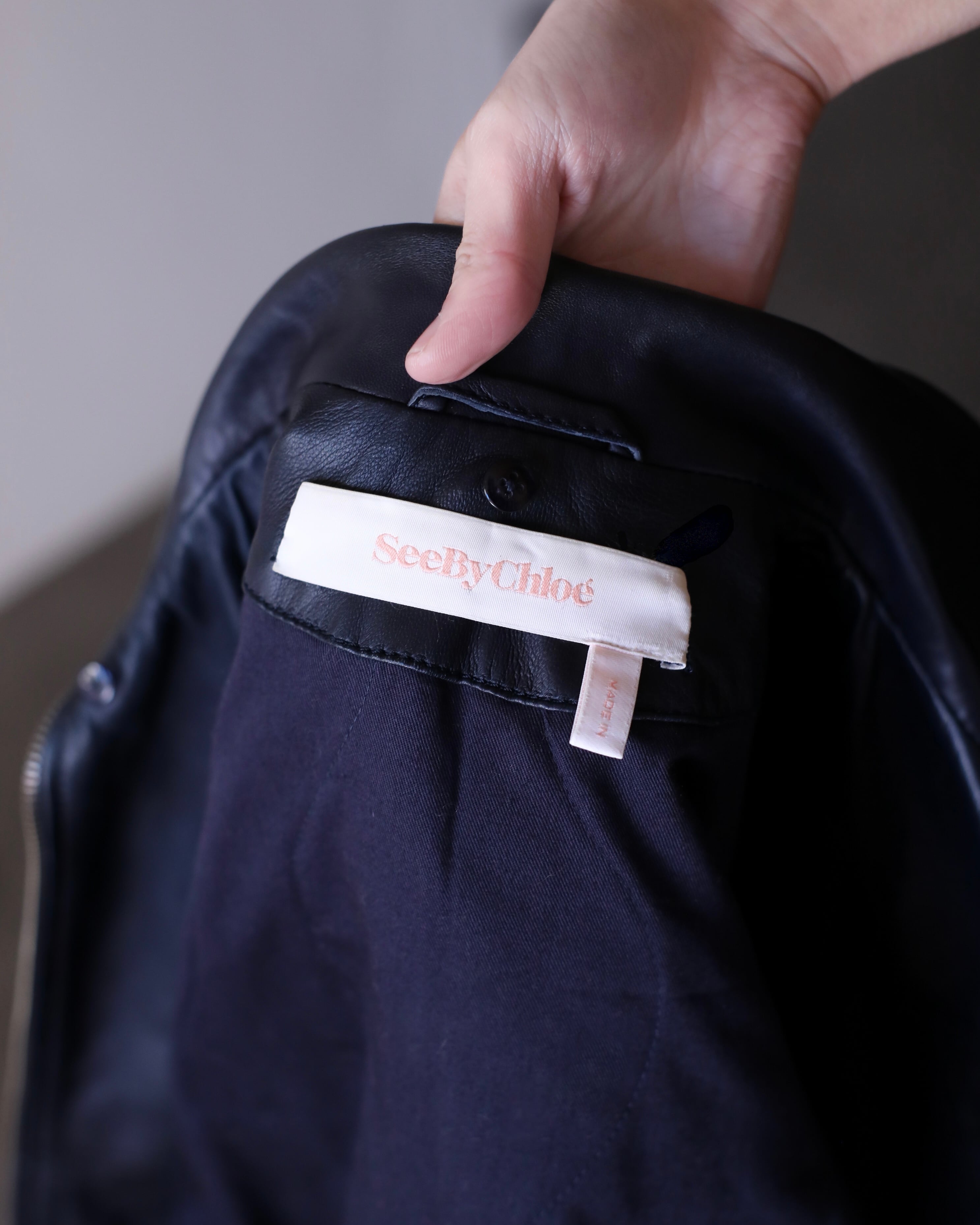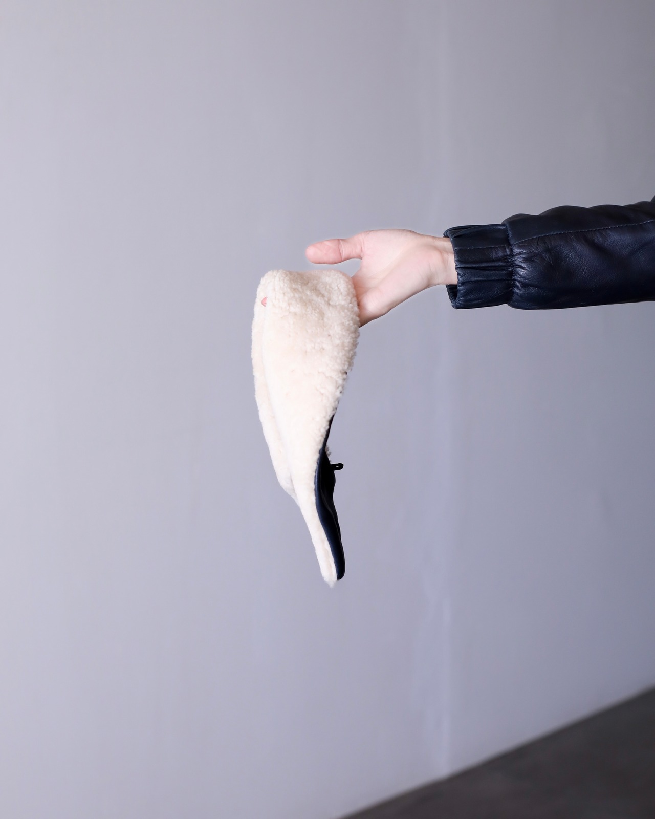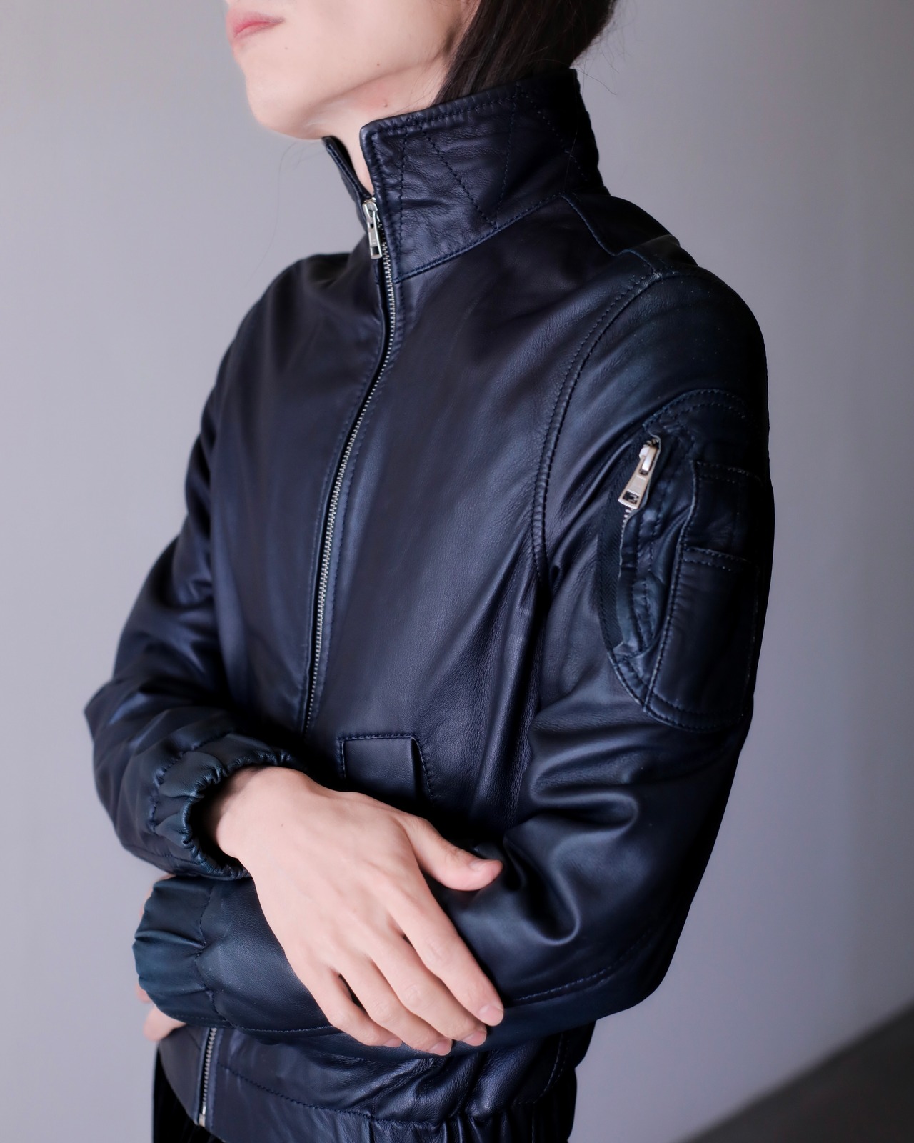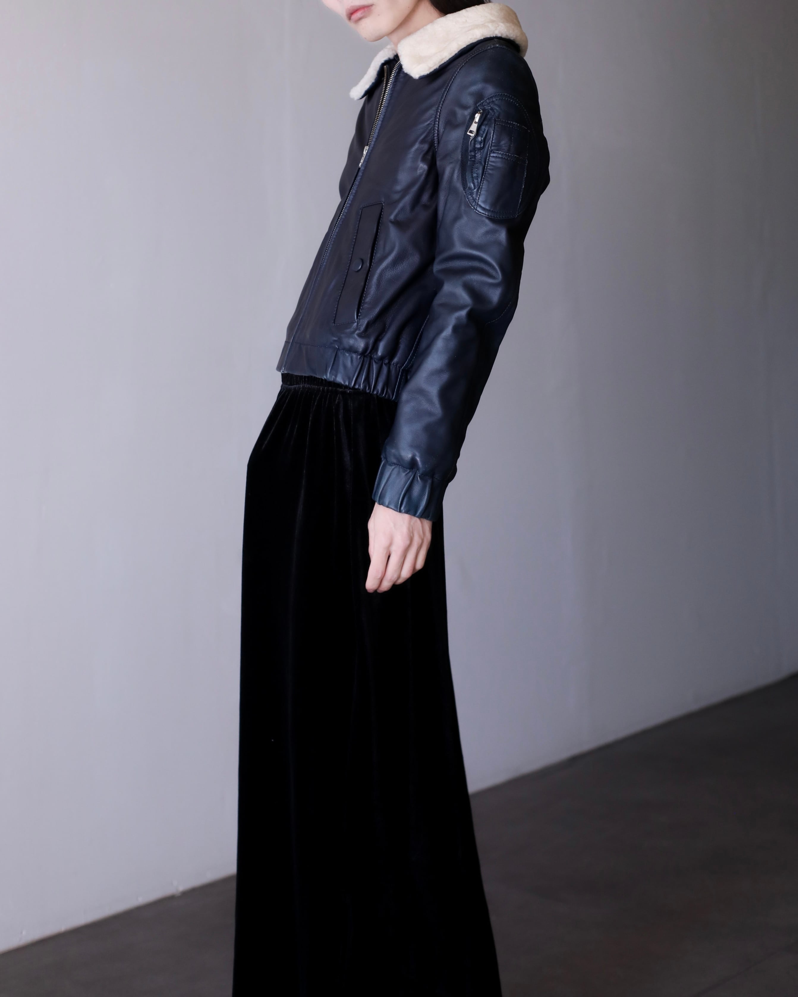 レザーのネイビーってブラックよりも寧ろ魅力的だと思っていて、独特の深みのあるモードな感じがすごく好きです。一般的なネイビーはカジュアルになりますが、レザーに限ってはモードだと思います。
