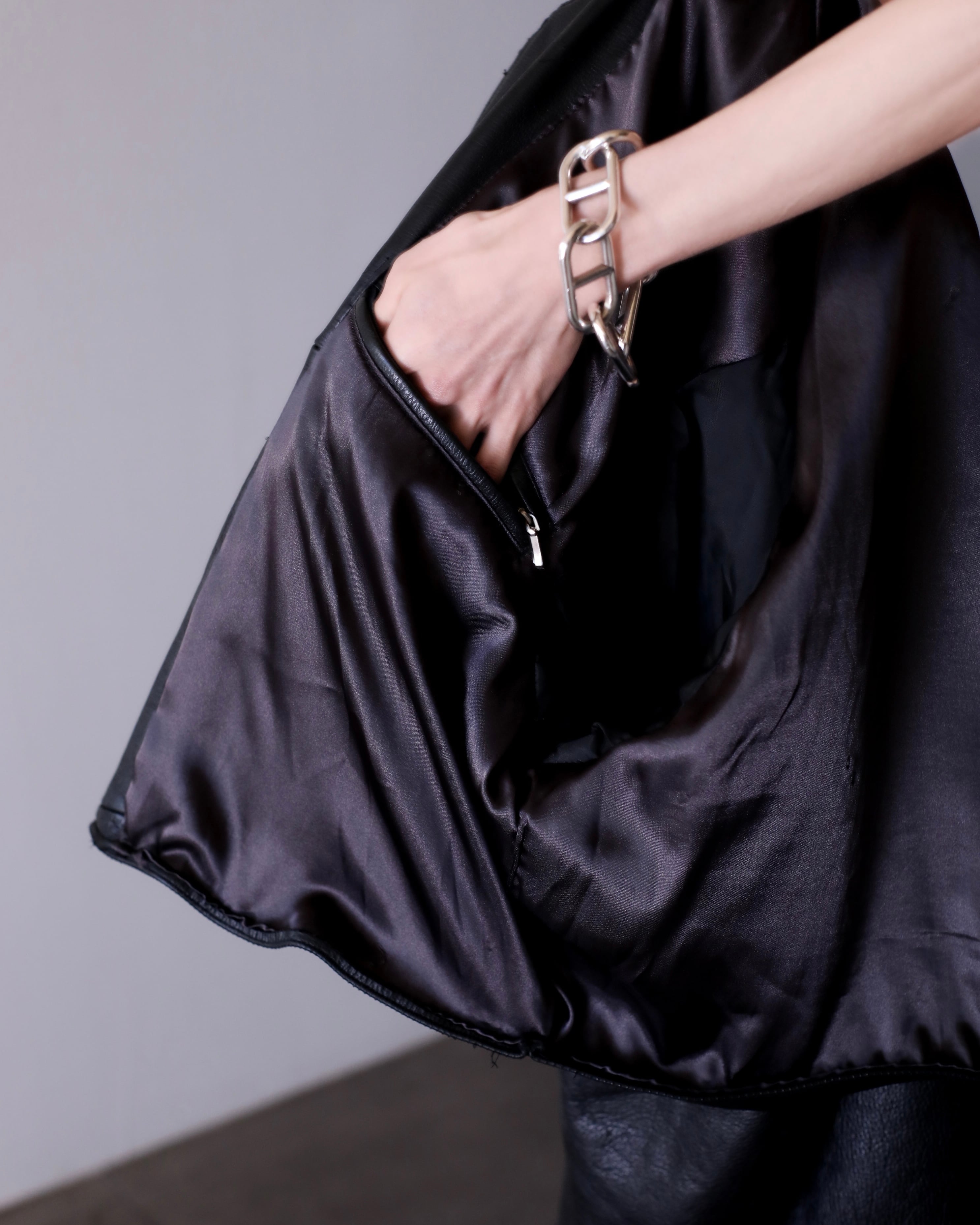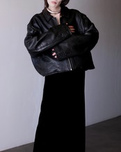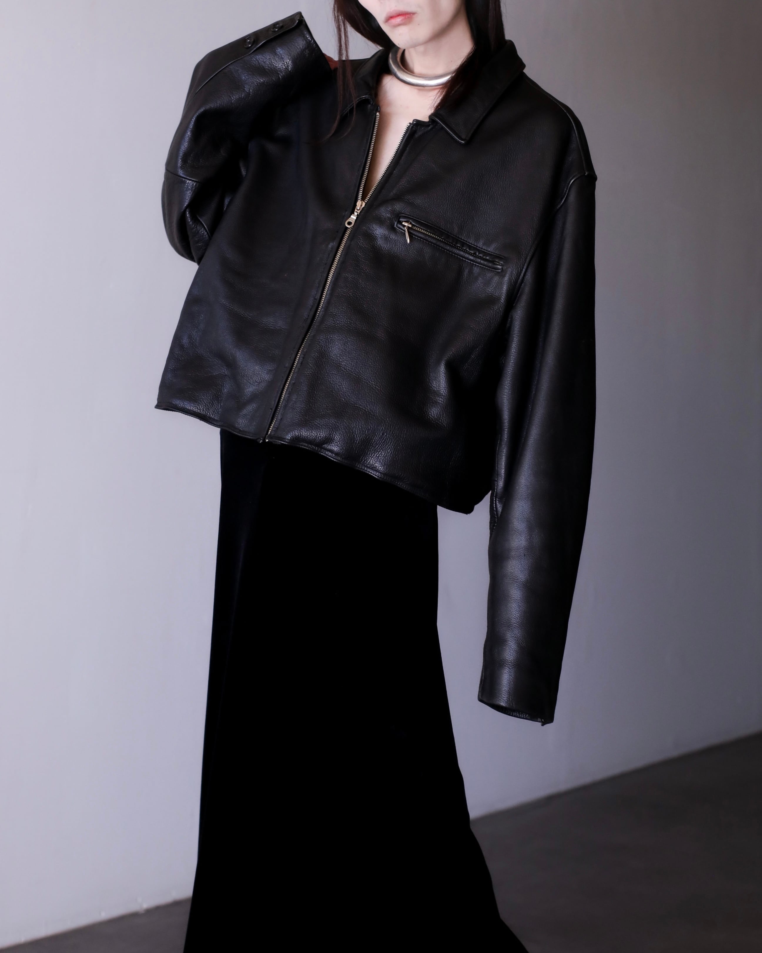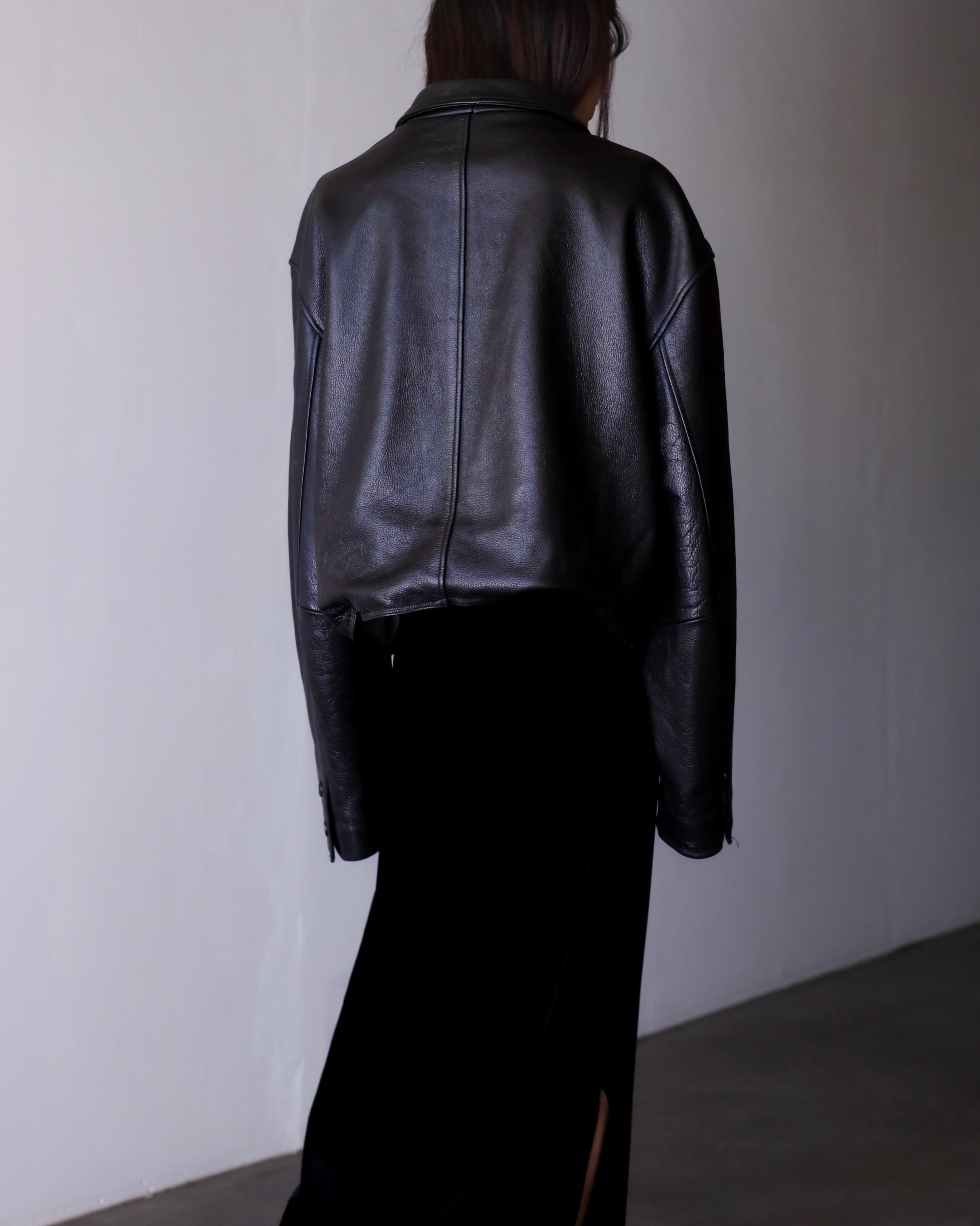 肩のしっかりと落ちる滑らかかつ柔らかな質感のレザーでオーバーシルエットの物。