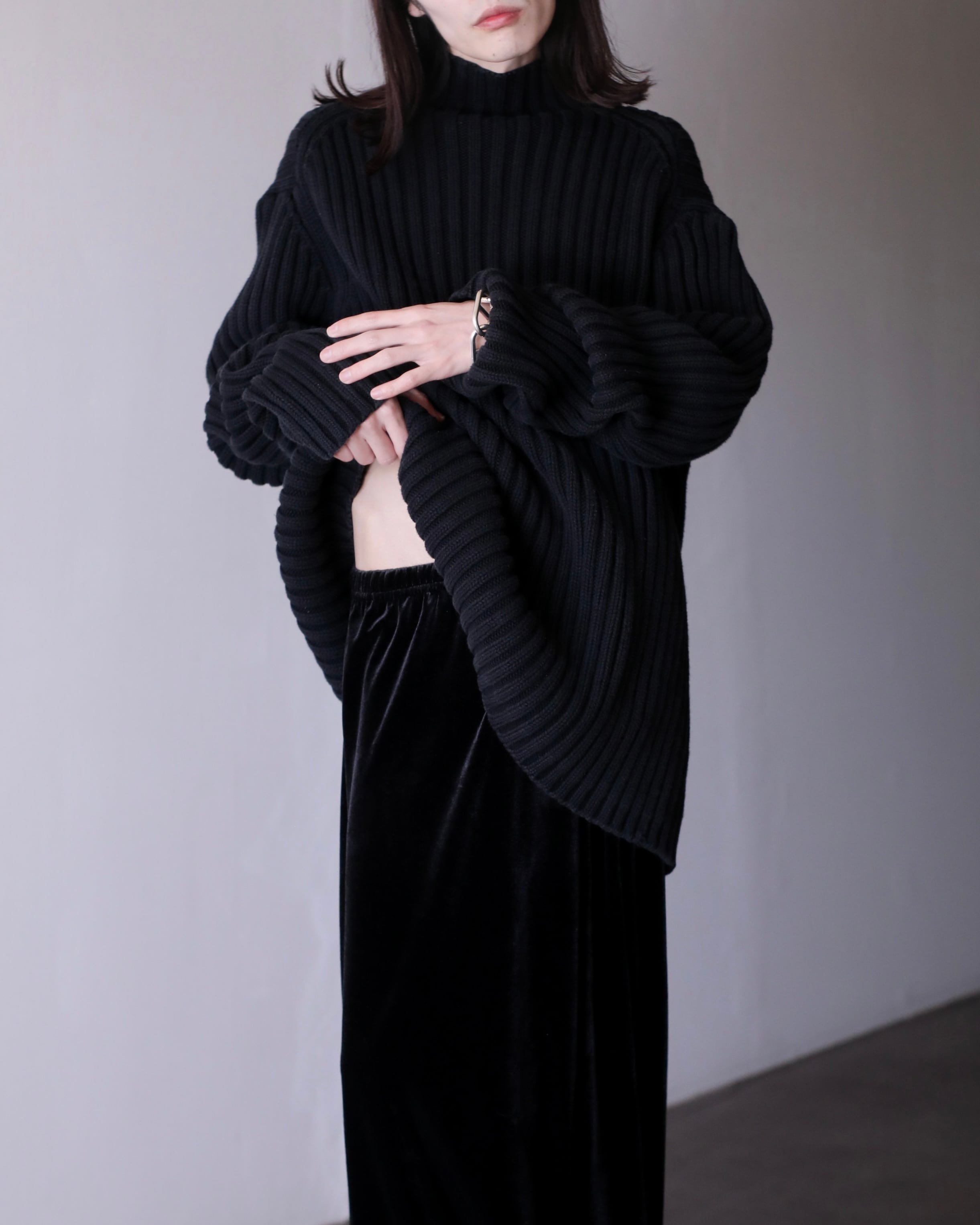 ハイネックにドロップショルダーの