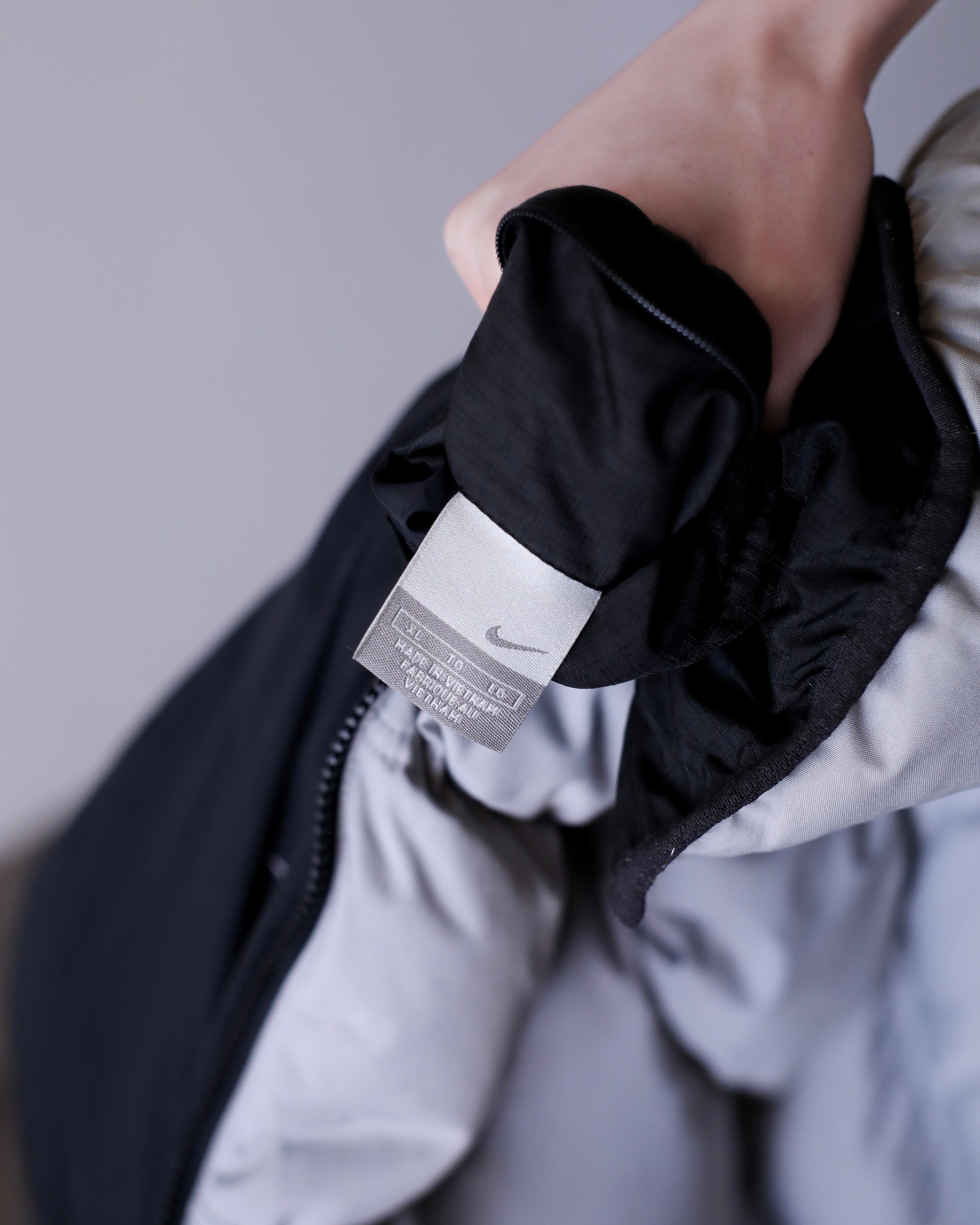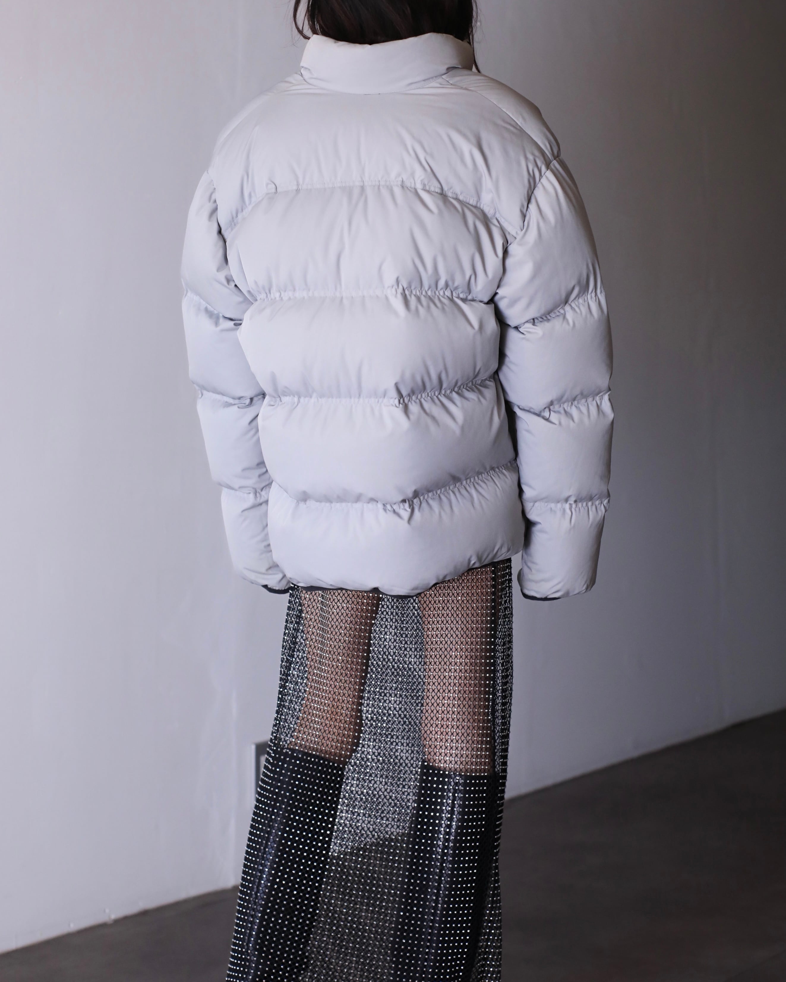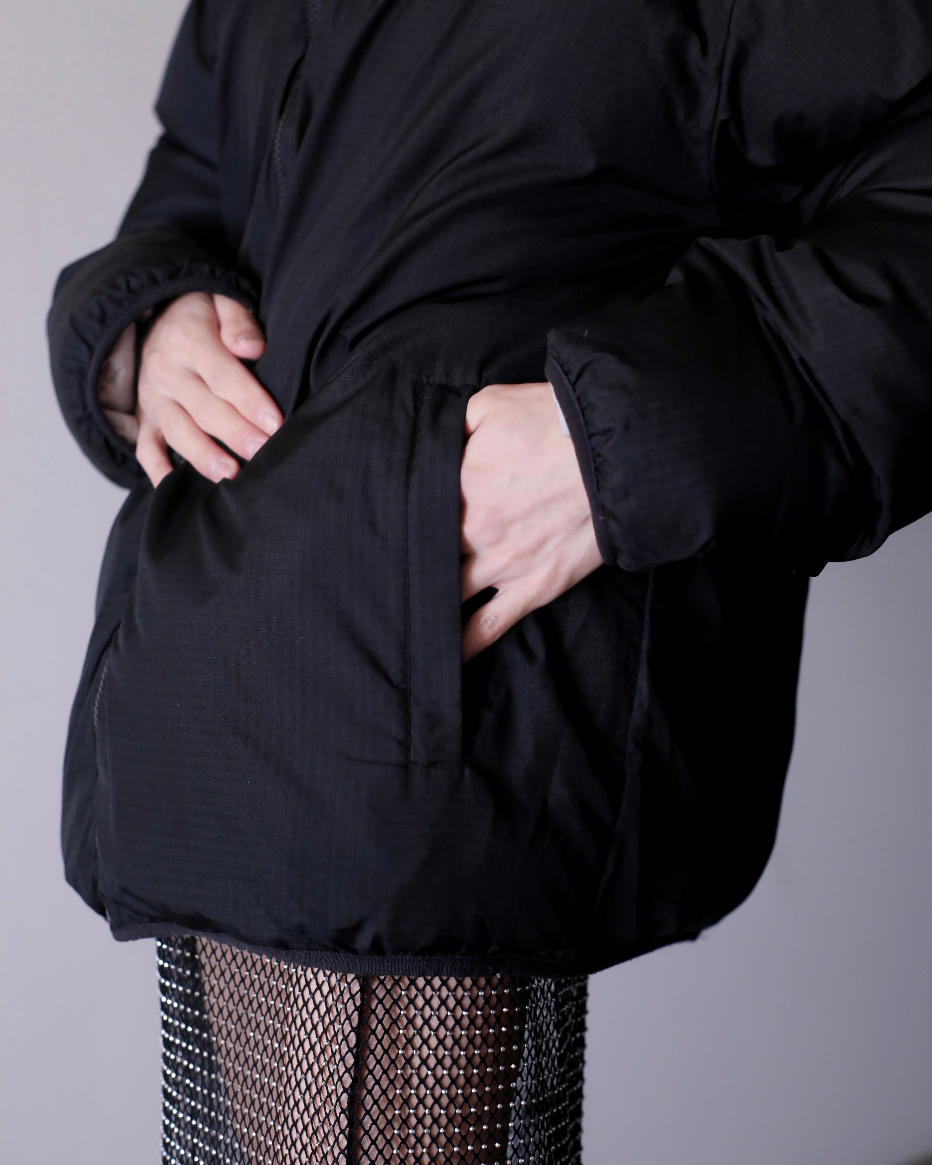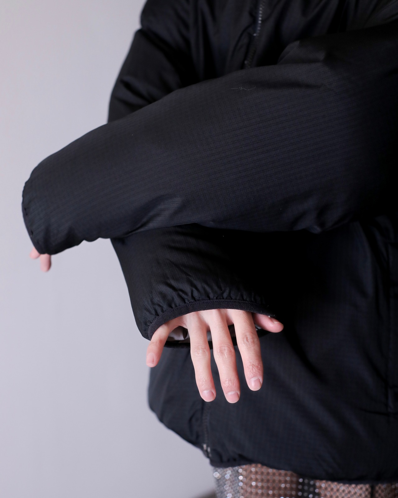 平面かつダウンのふっくら感を楽しむことができるテキスタイルでブラックの面の方がシャープな印象があるように