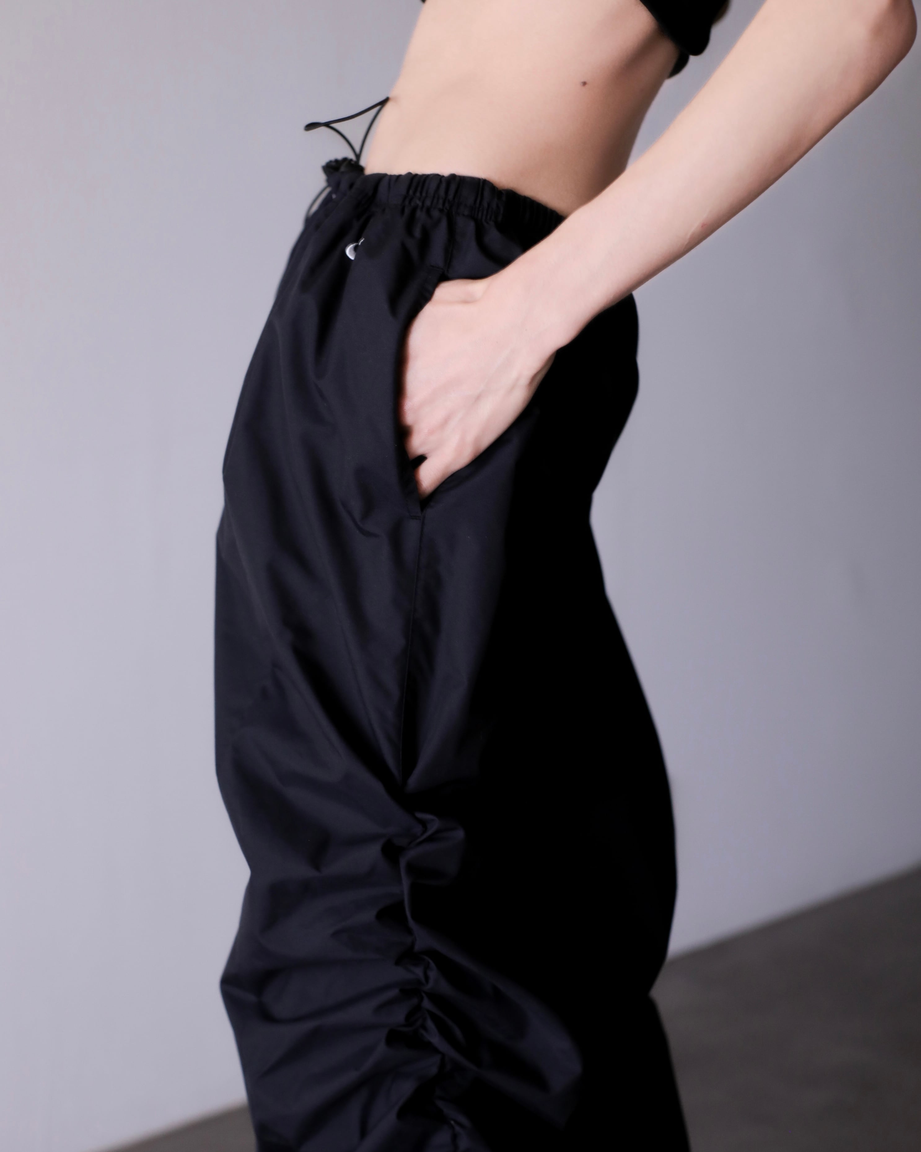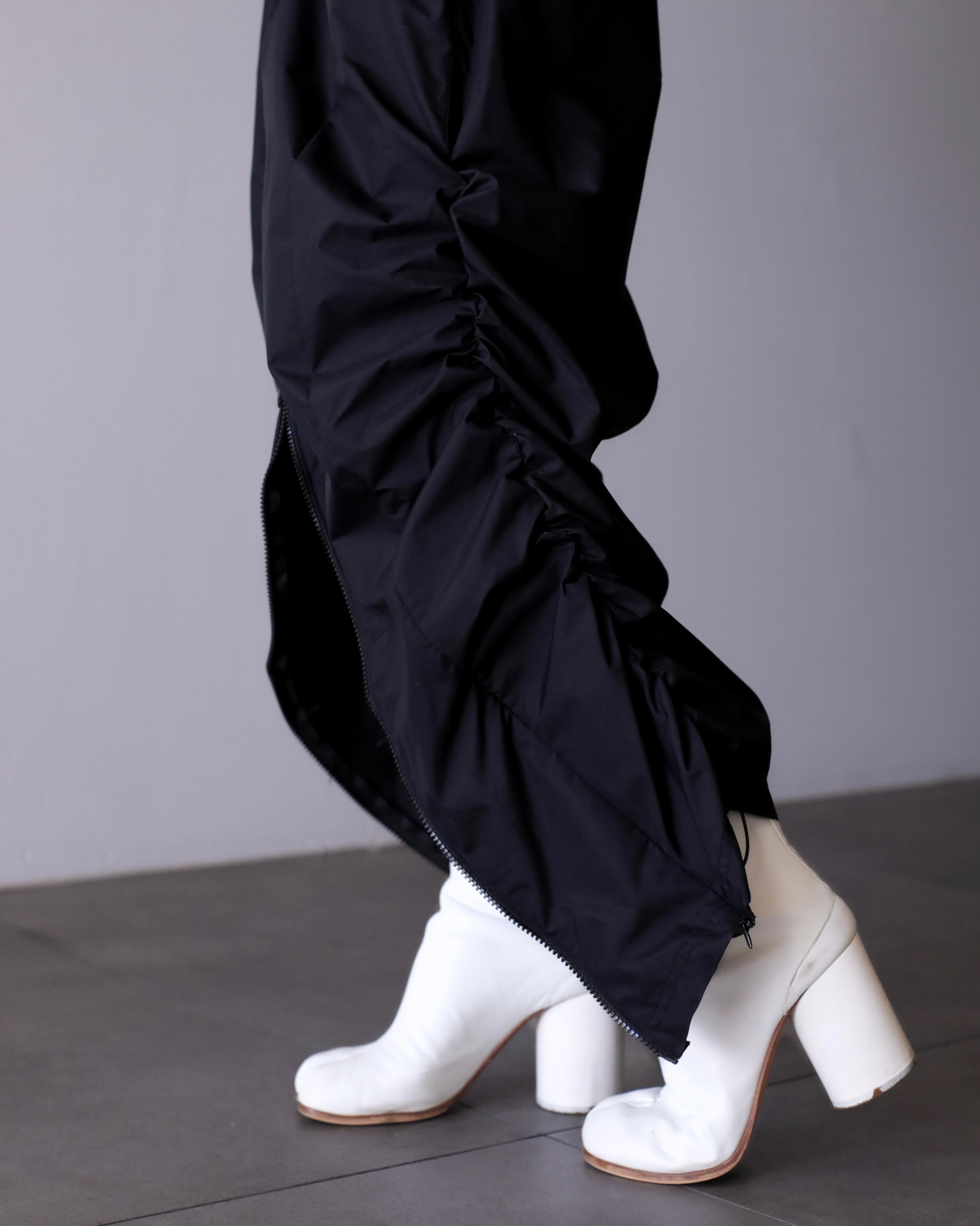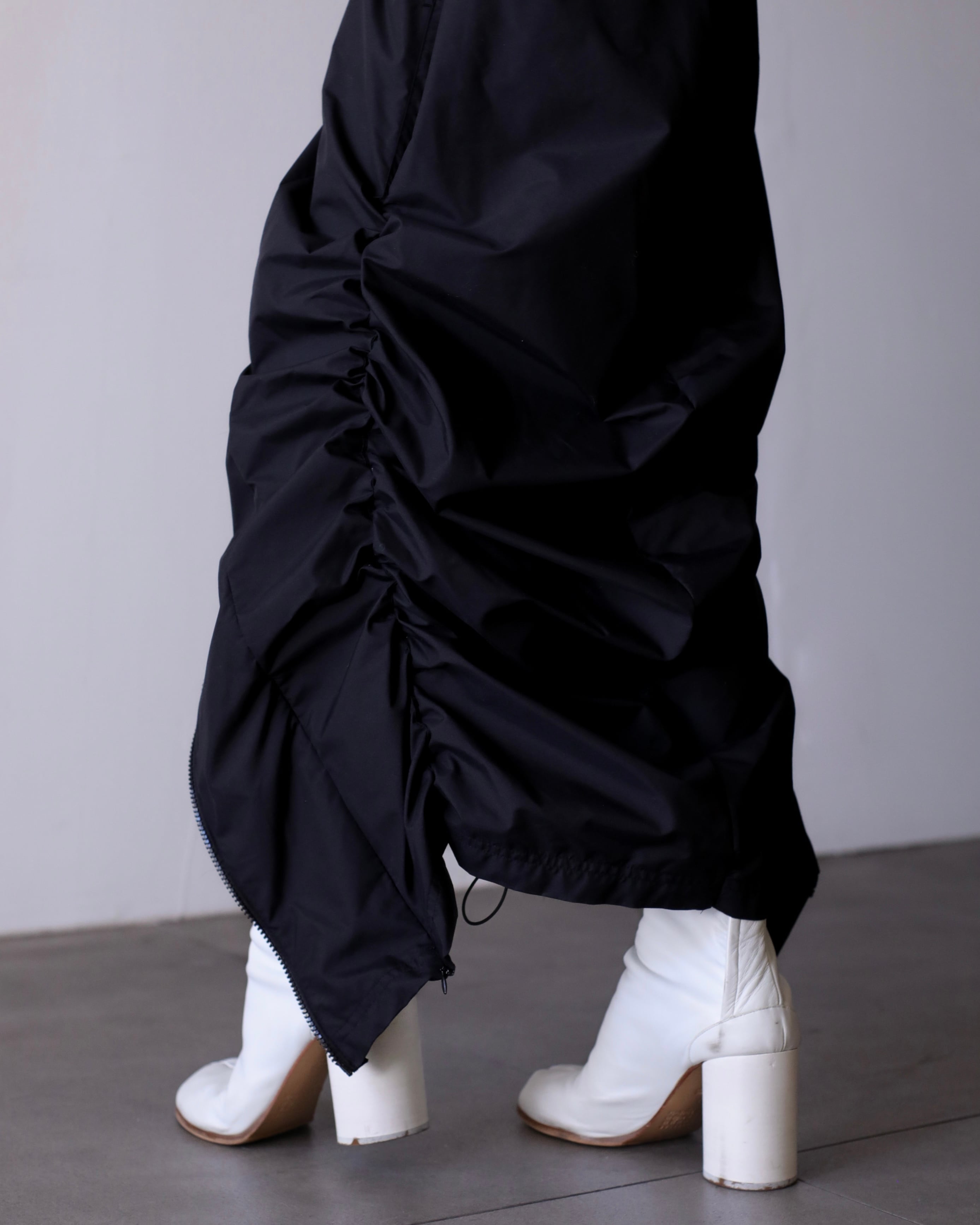 両サイドにフルでドローコードが仕込まれているディテールでしぼると縦にクシュクシュとしてくれてデザイン性も高く