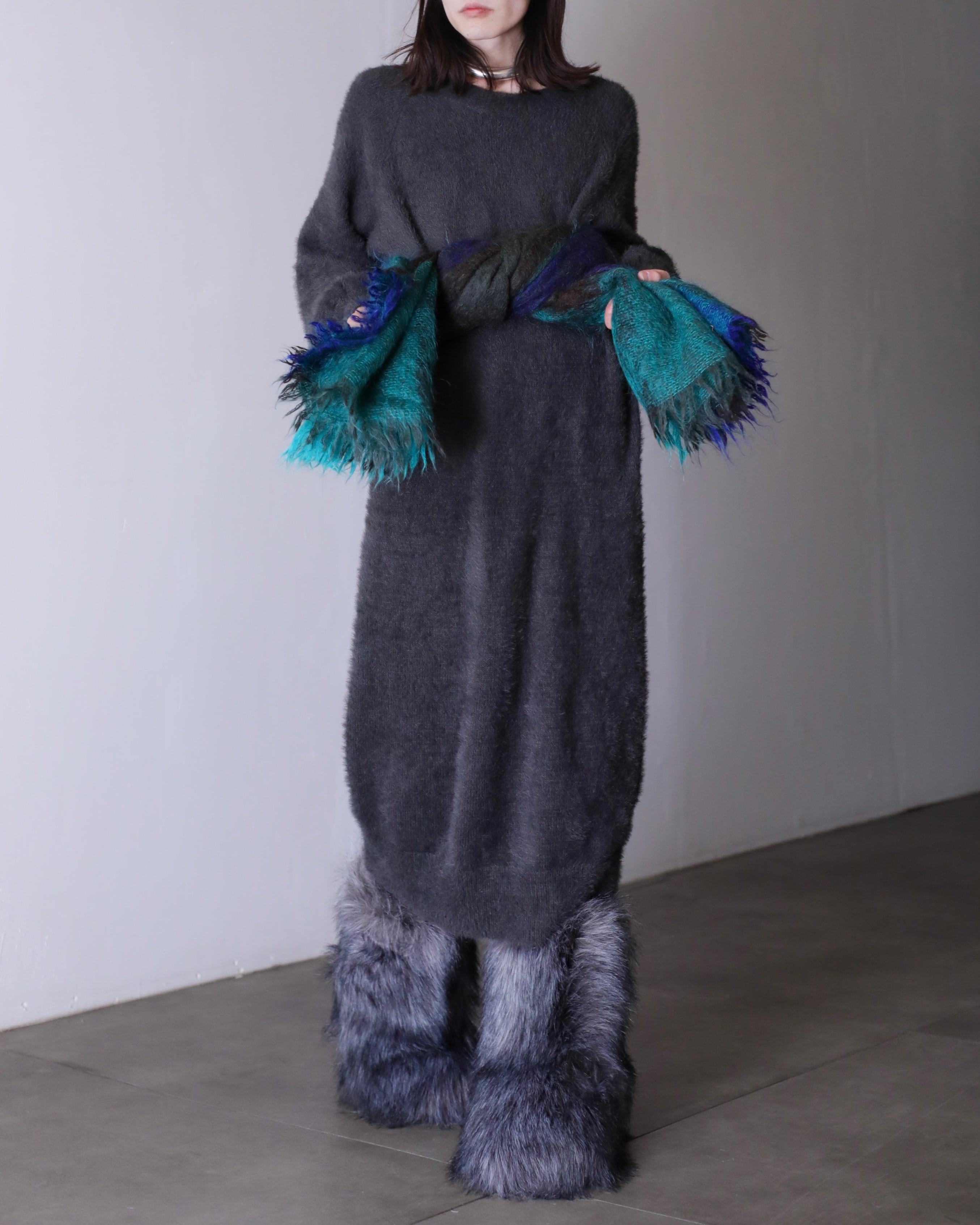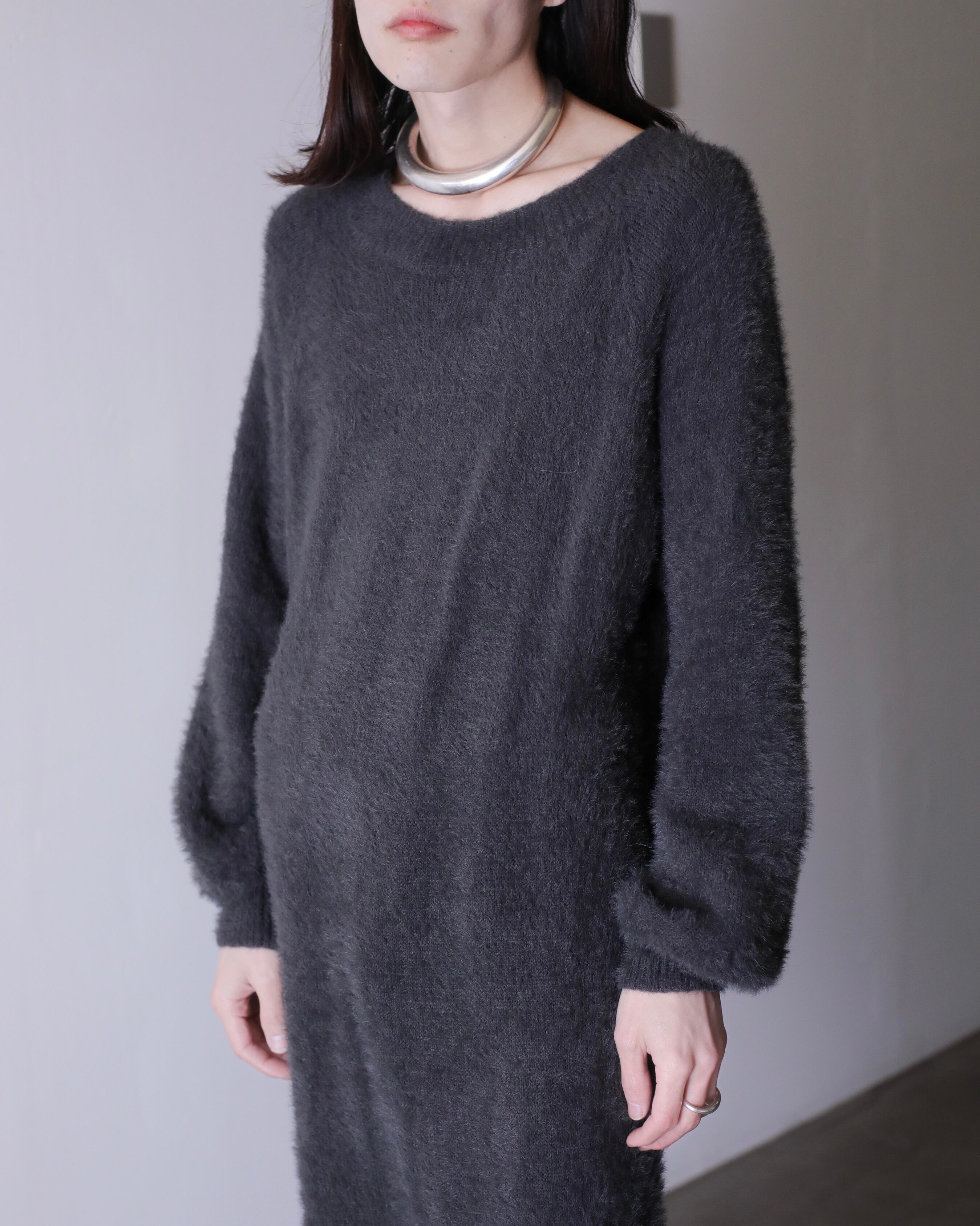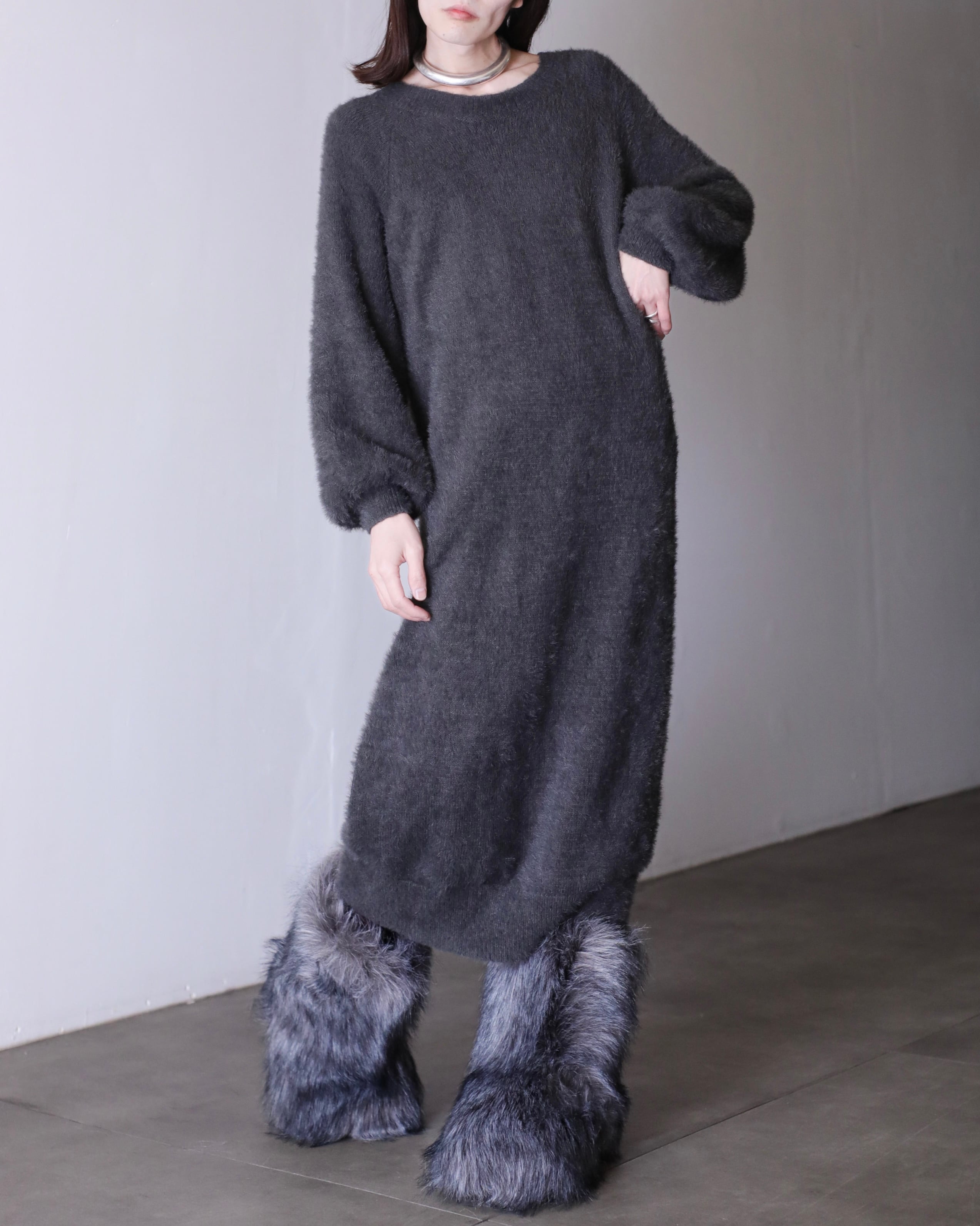 "fuwa fuwa" shaggy knit fabric balloon sleeve long dress one piece