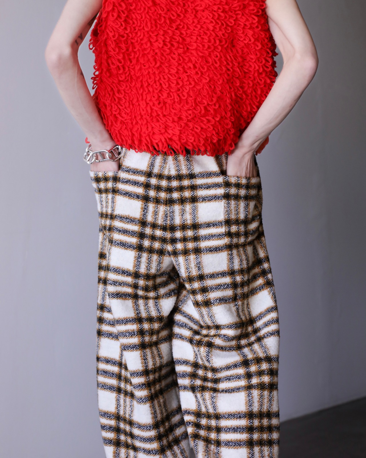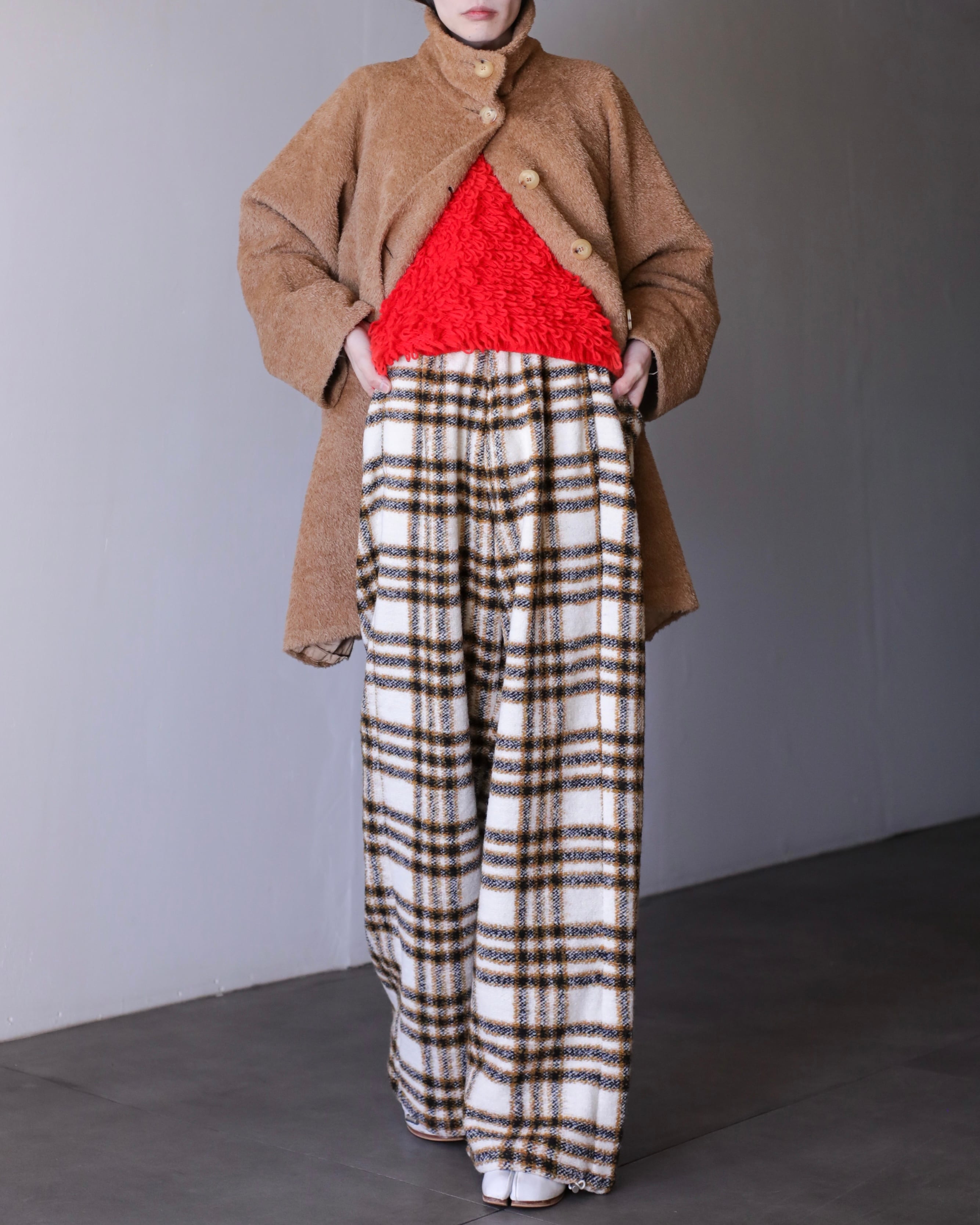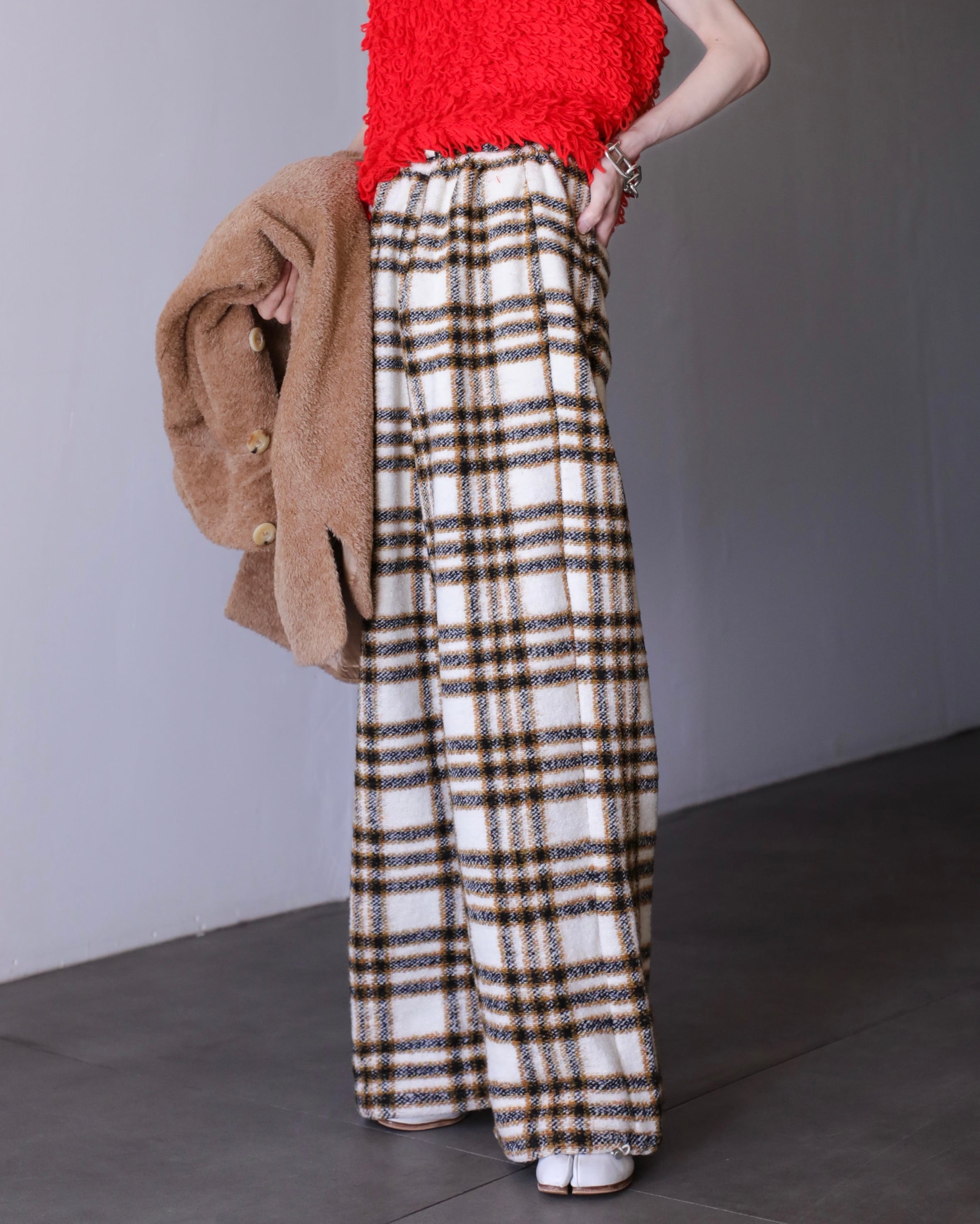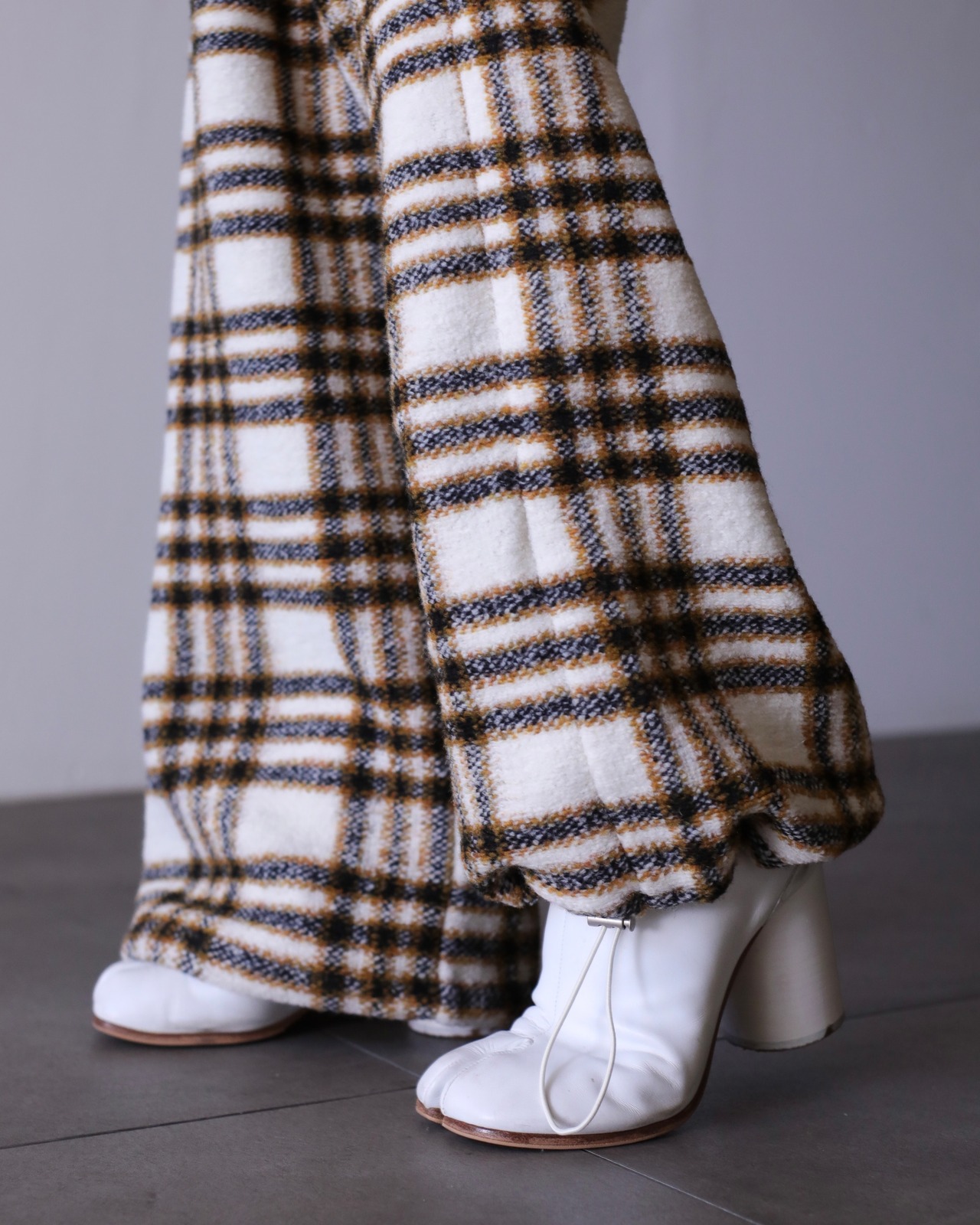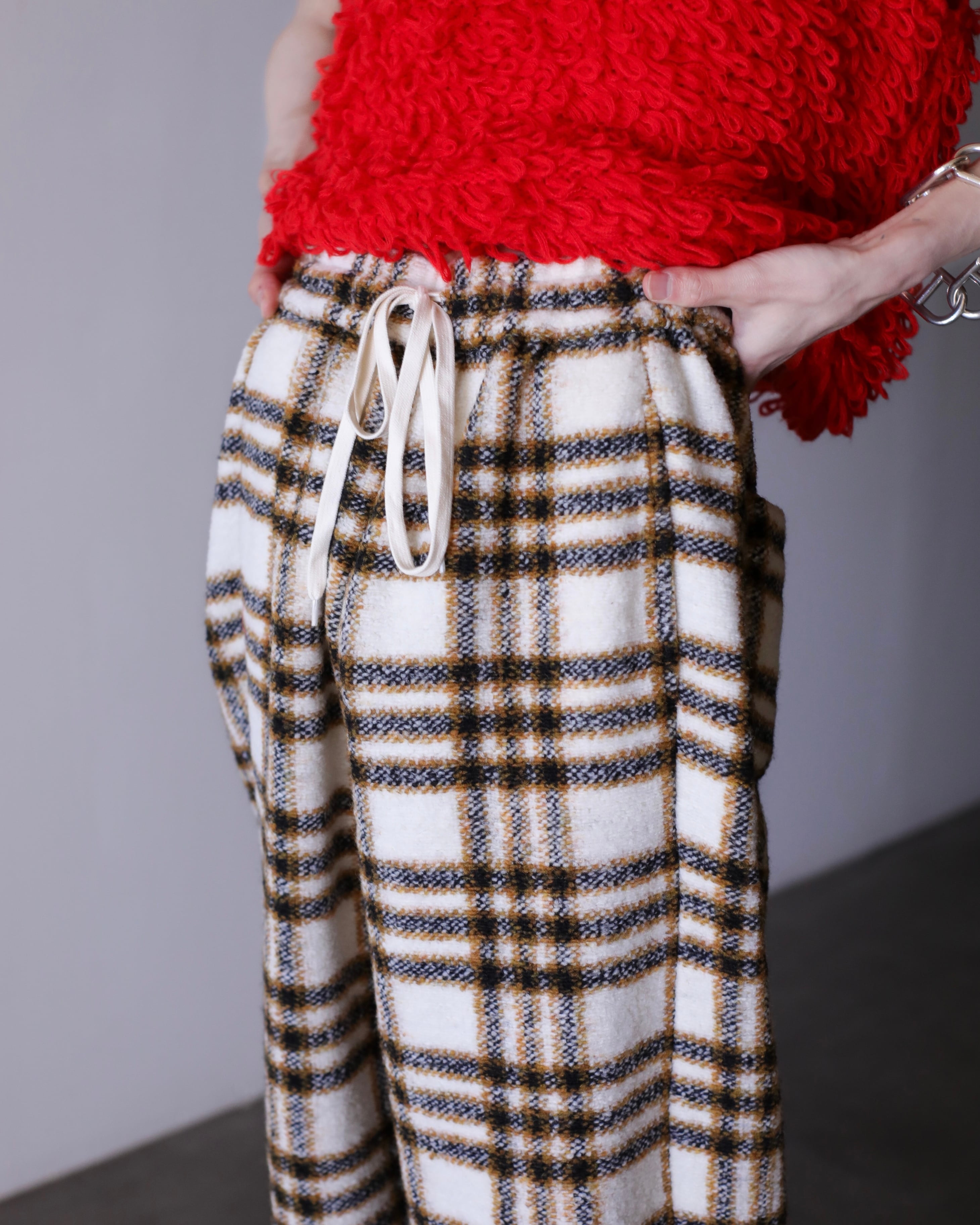 vintage handmade volume wide straight check pattern drawstrings design wool pants