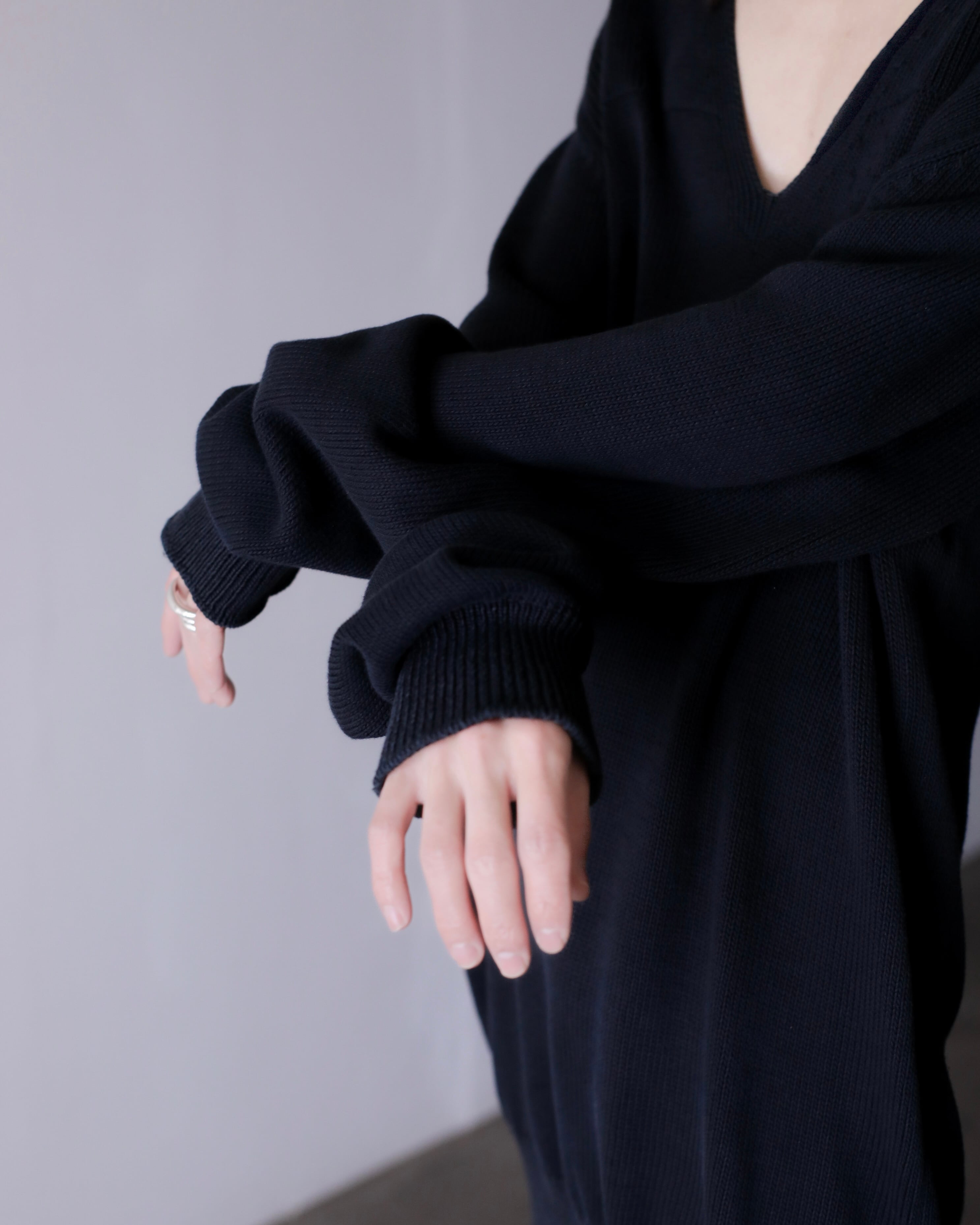 長めになった着丈に裾のキュポっとしたリブのデザインが刺さります。