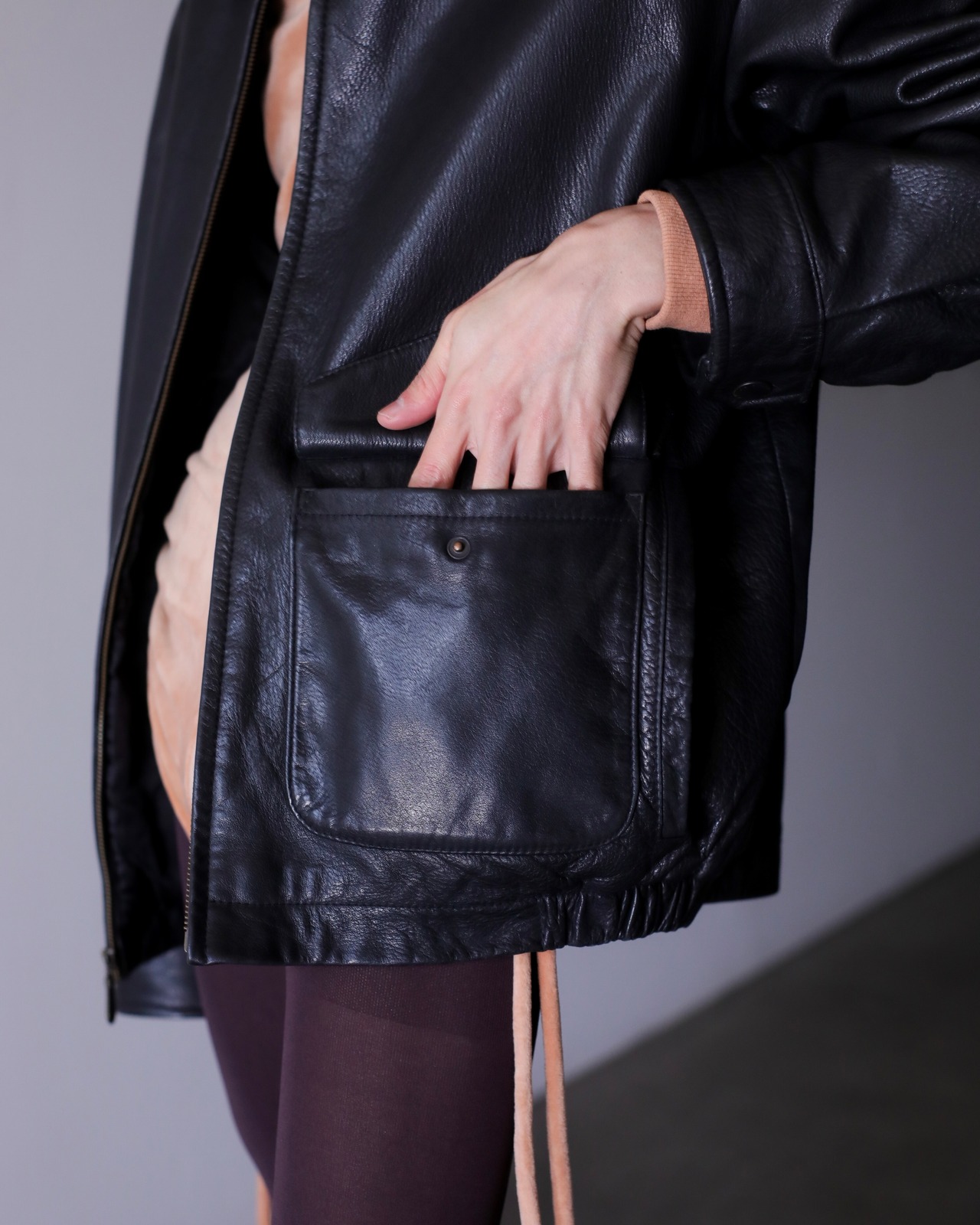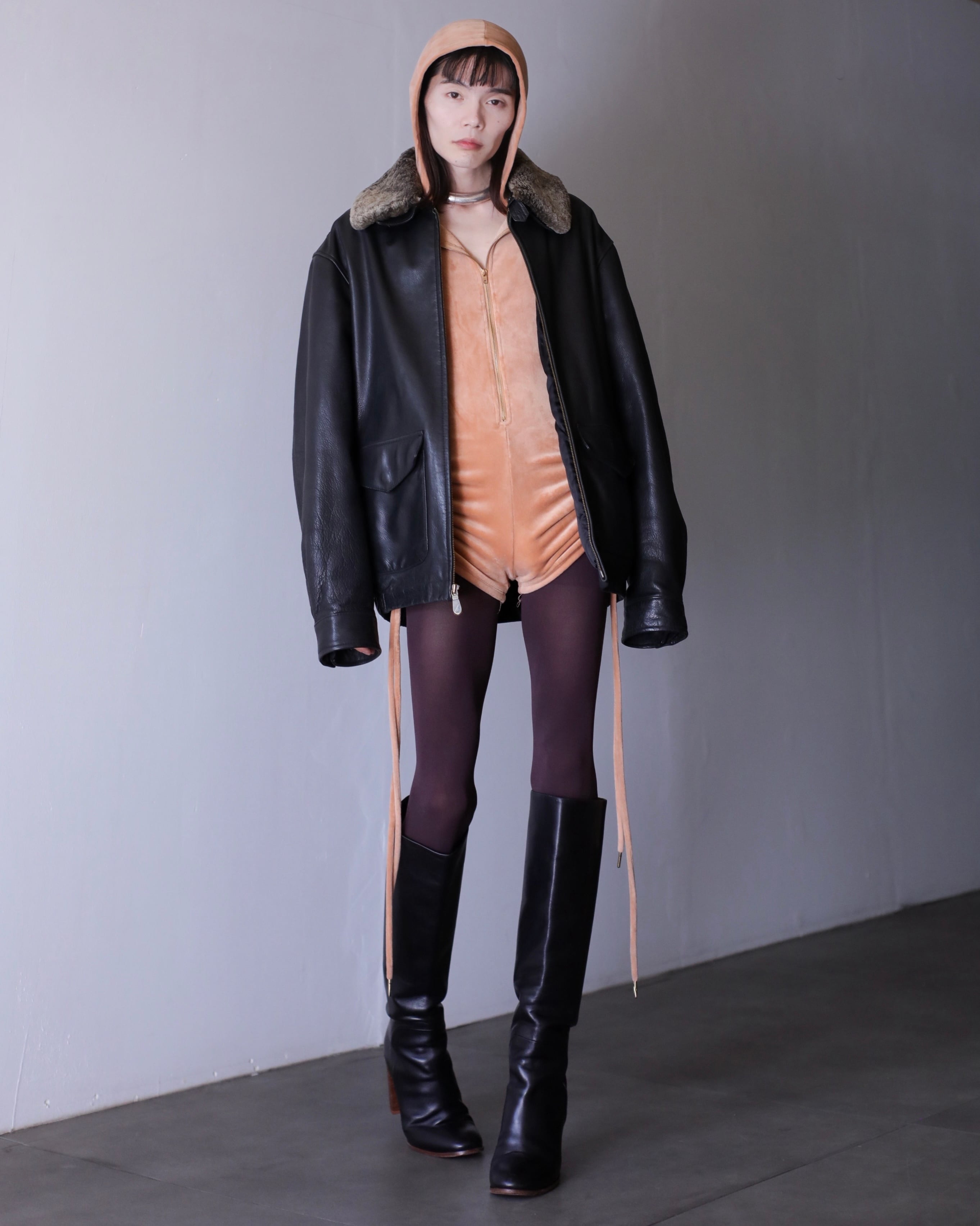 外すとすっきりとしたレザーブルゾンとして着ていただけます。