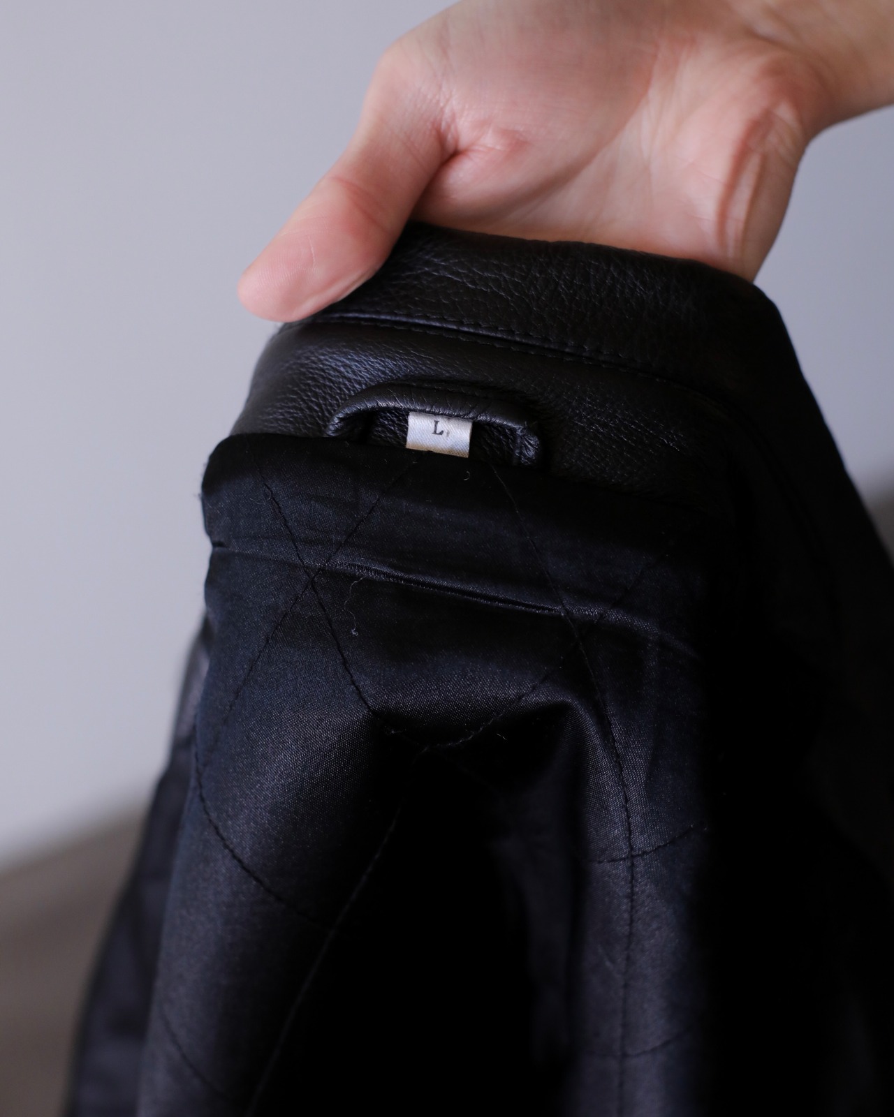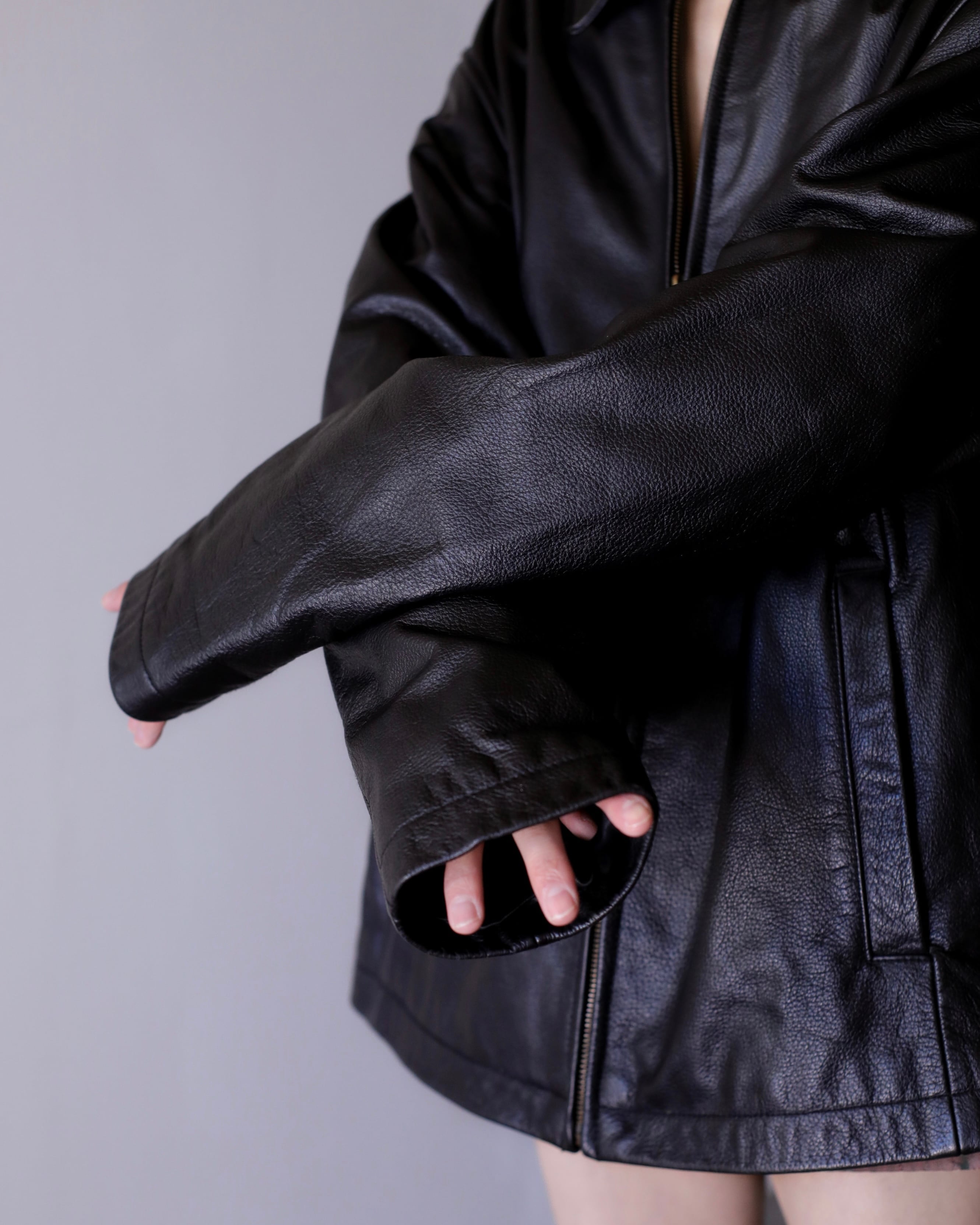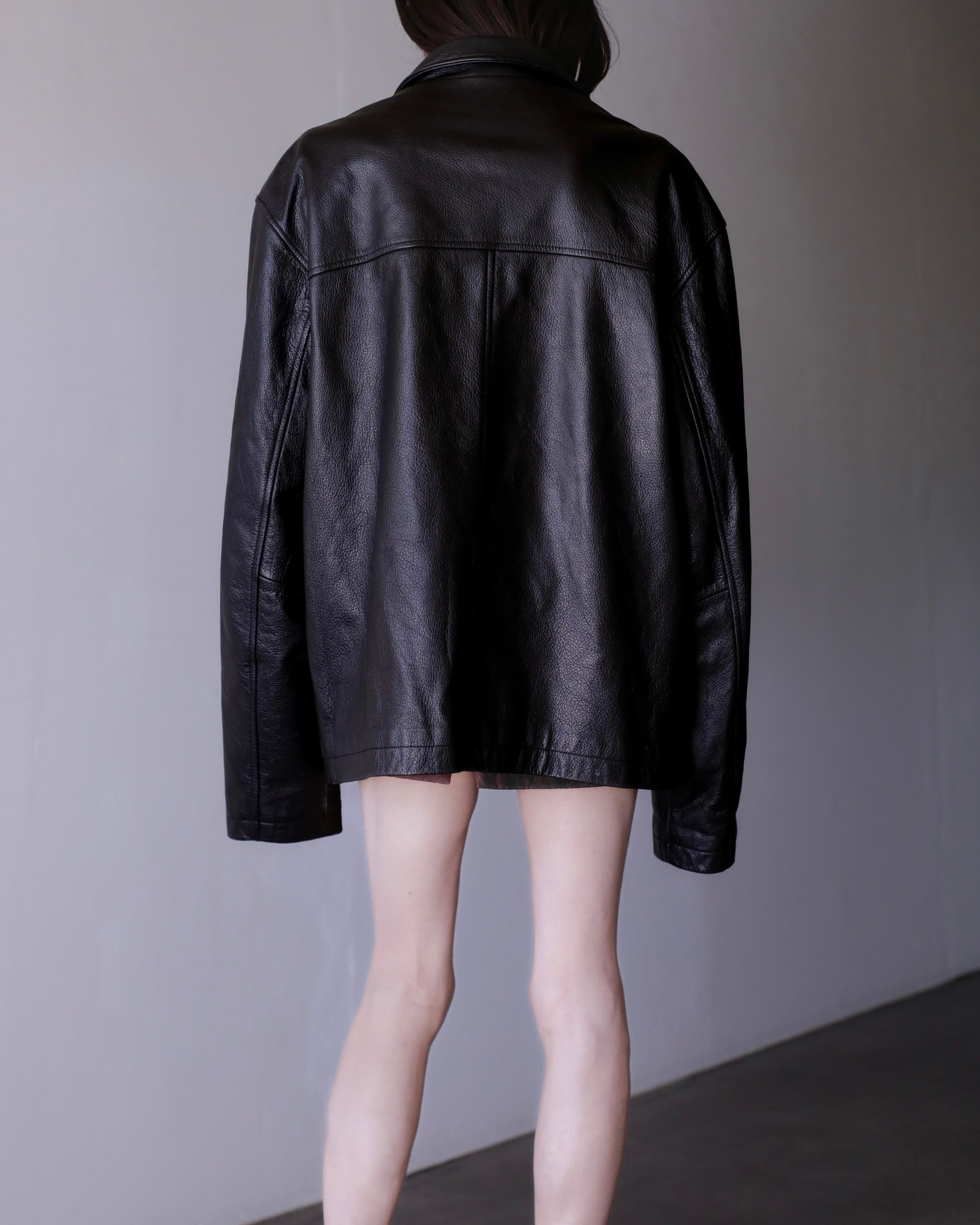 肩のしっかりと落ちる滑らかかつ柔らかな質感のレザーでオーバーシルエットの物。