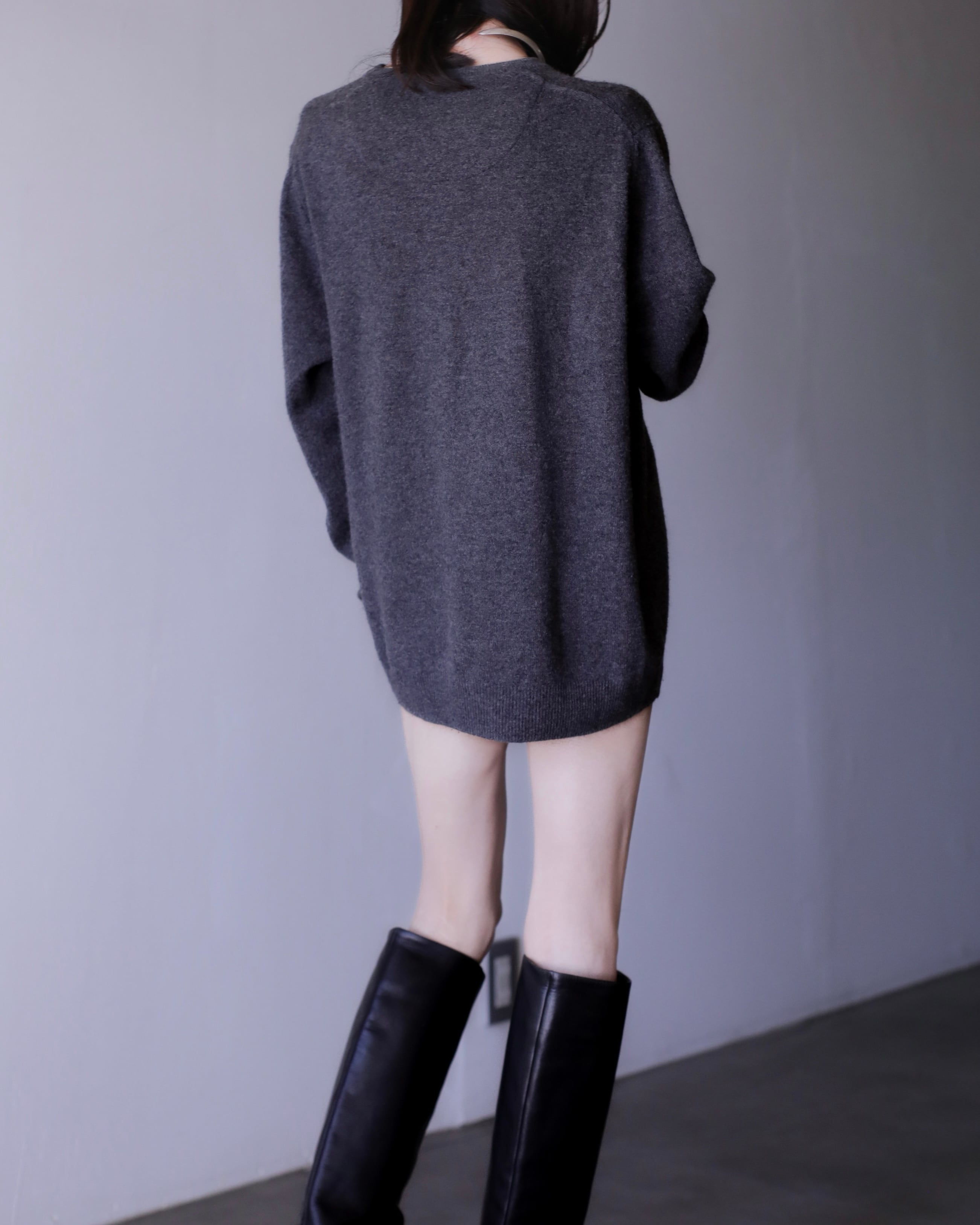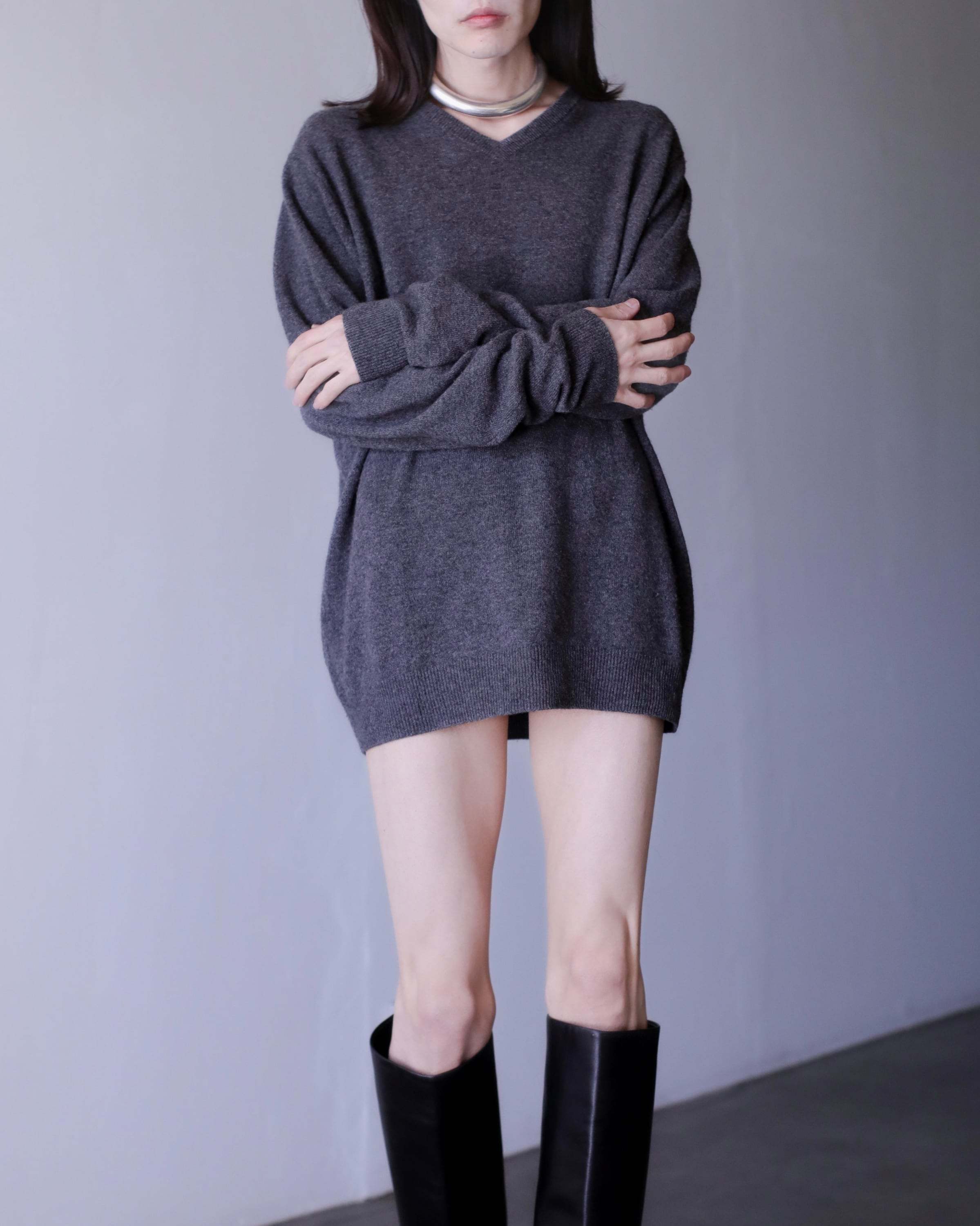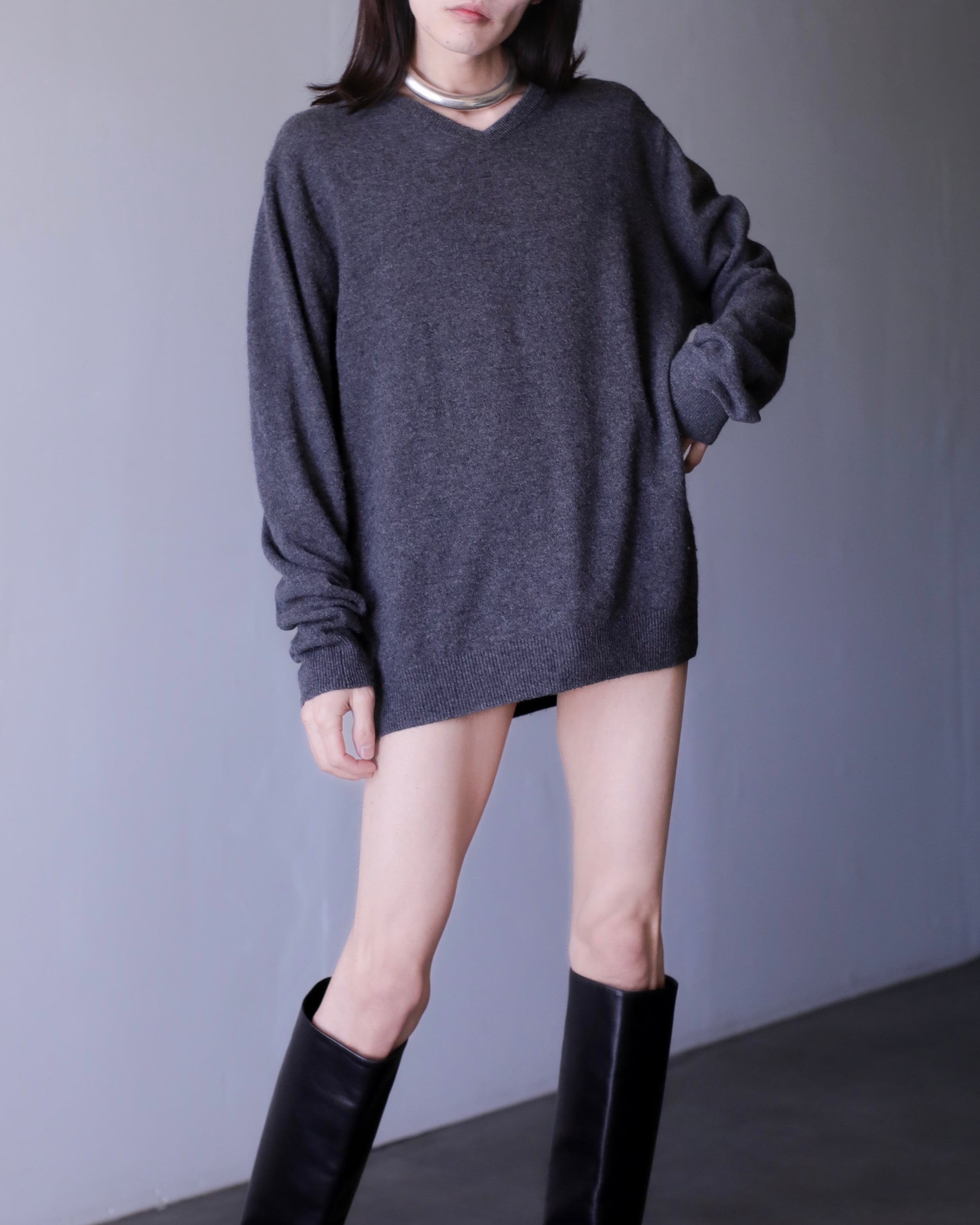 Vネックニットセーター。