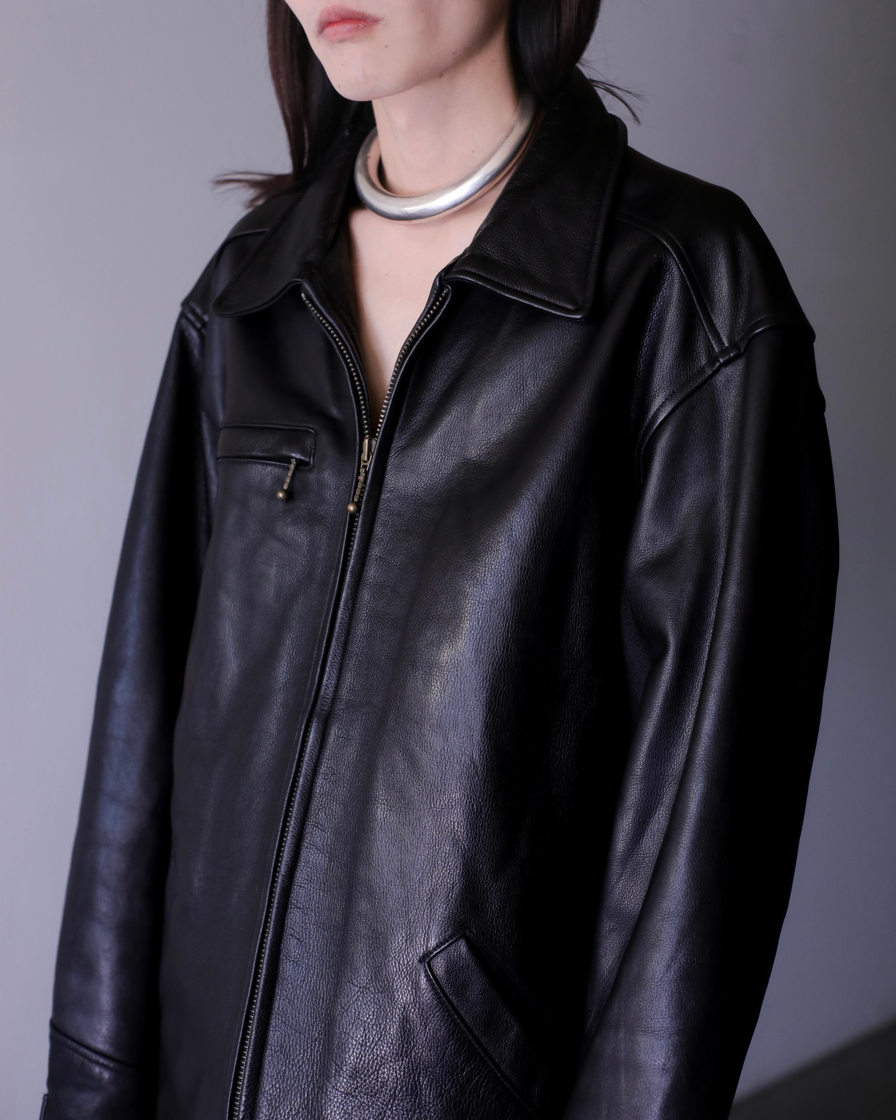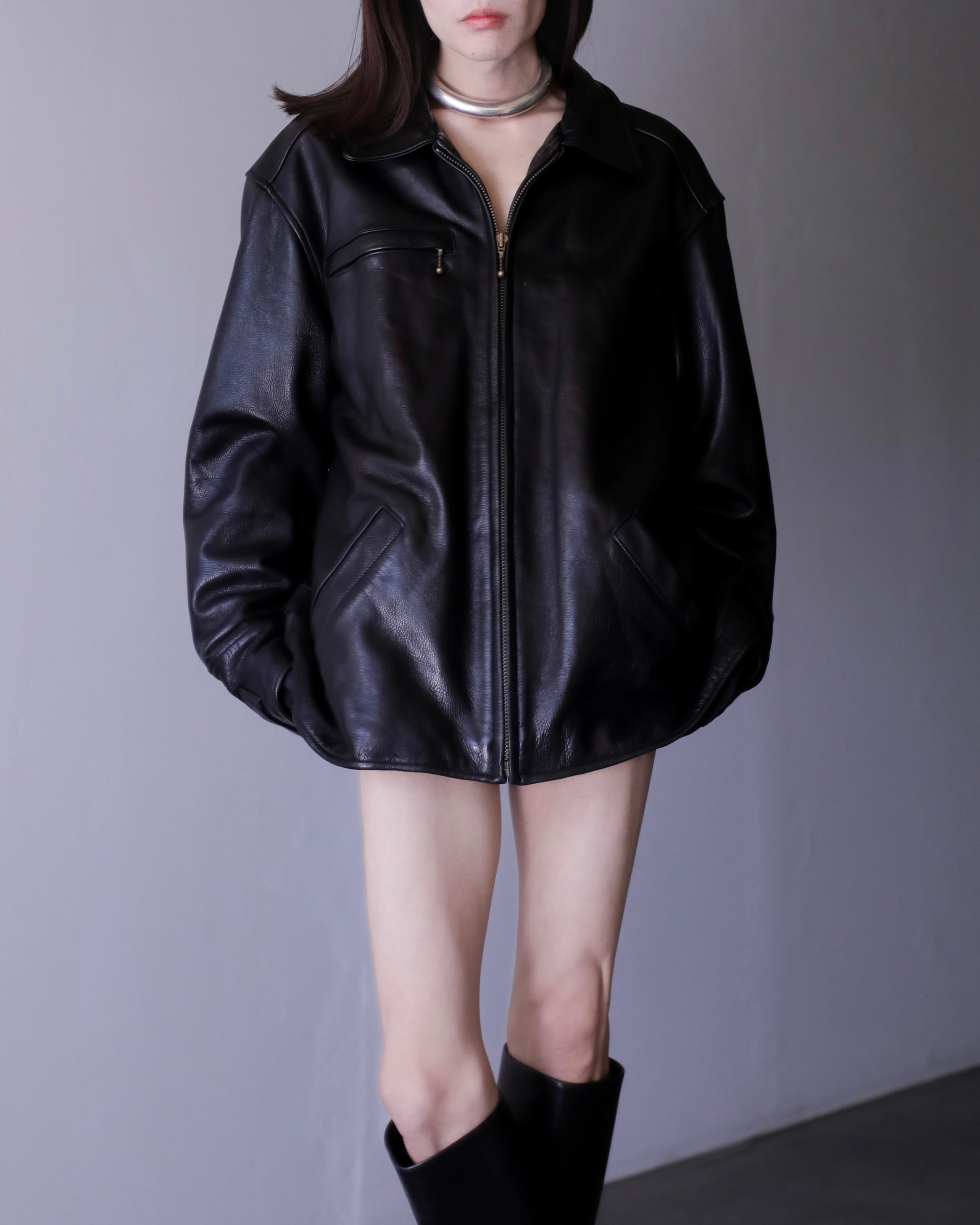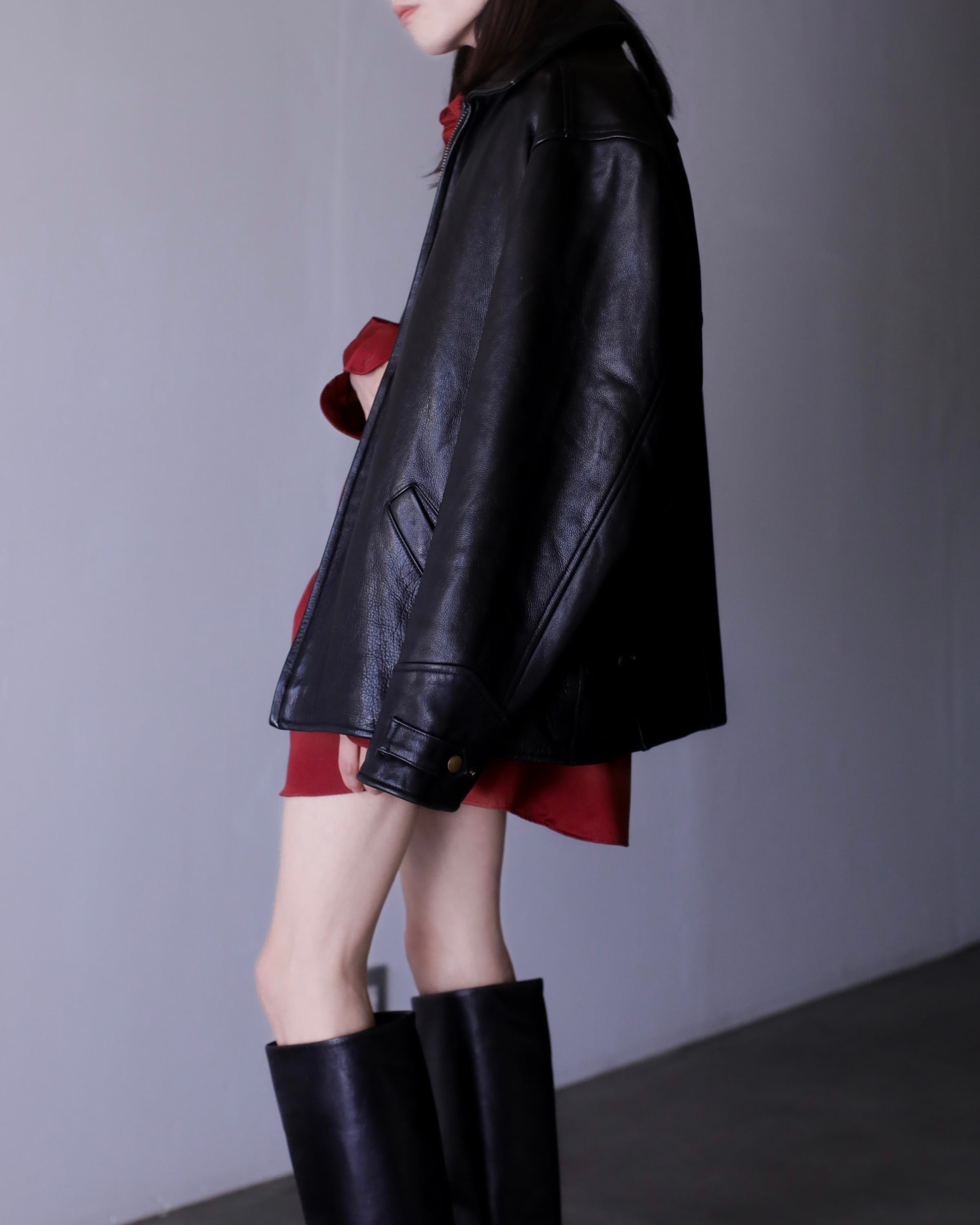 肩のしっかりと落ちる滑らかかつ柔らかな質感のレザーでオーバーシルエットの物。