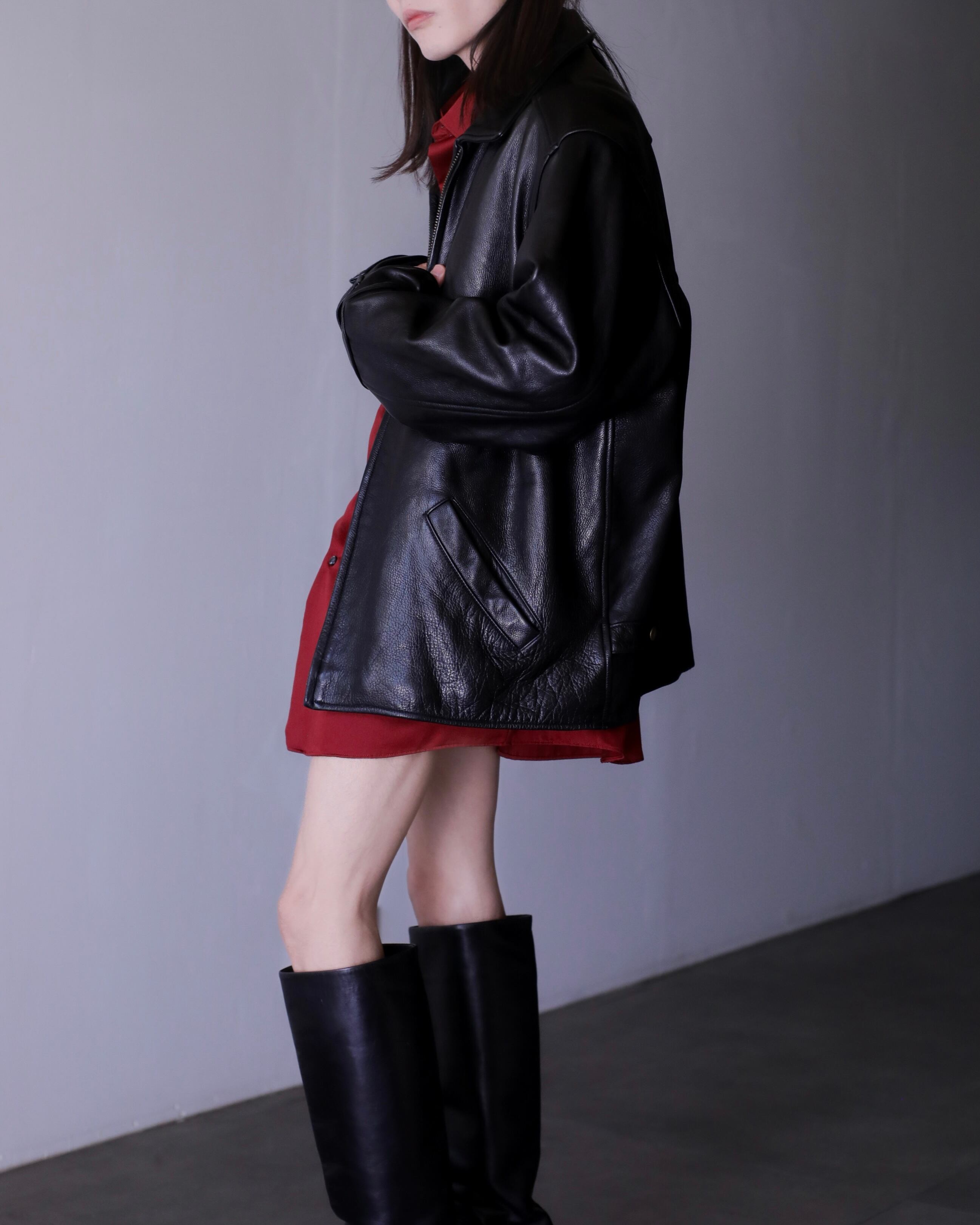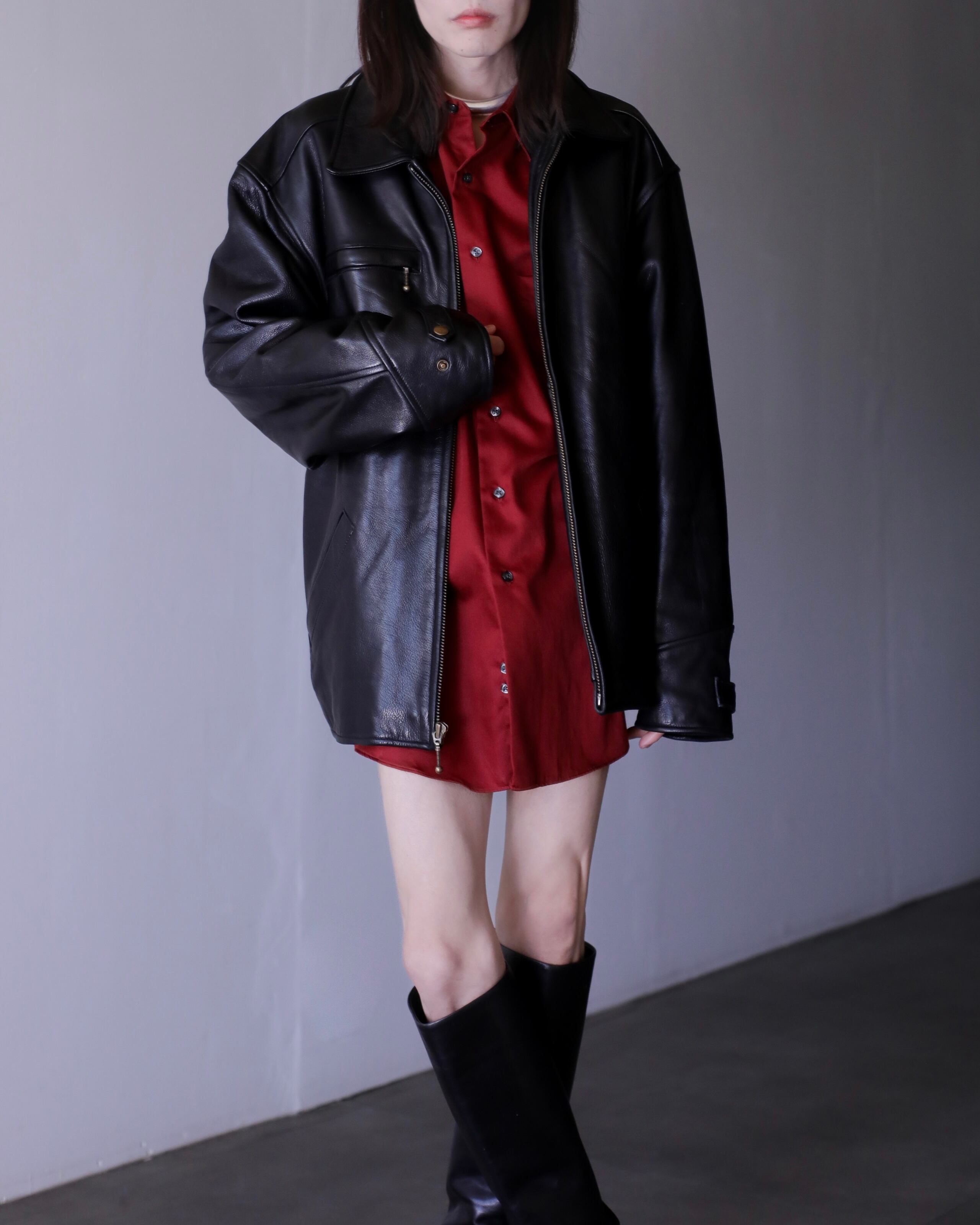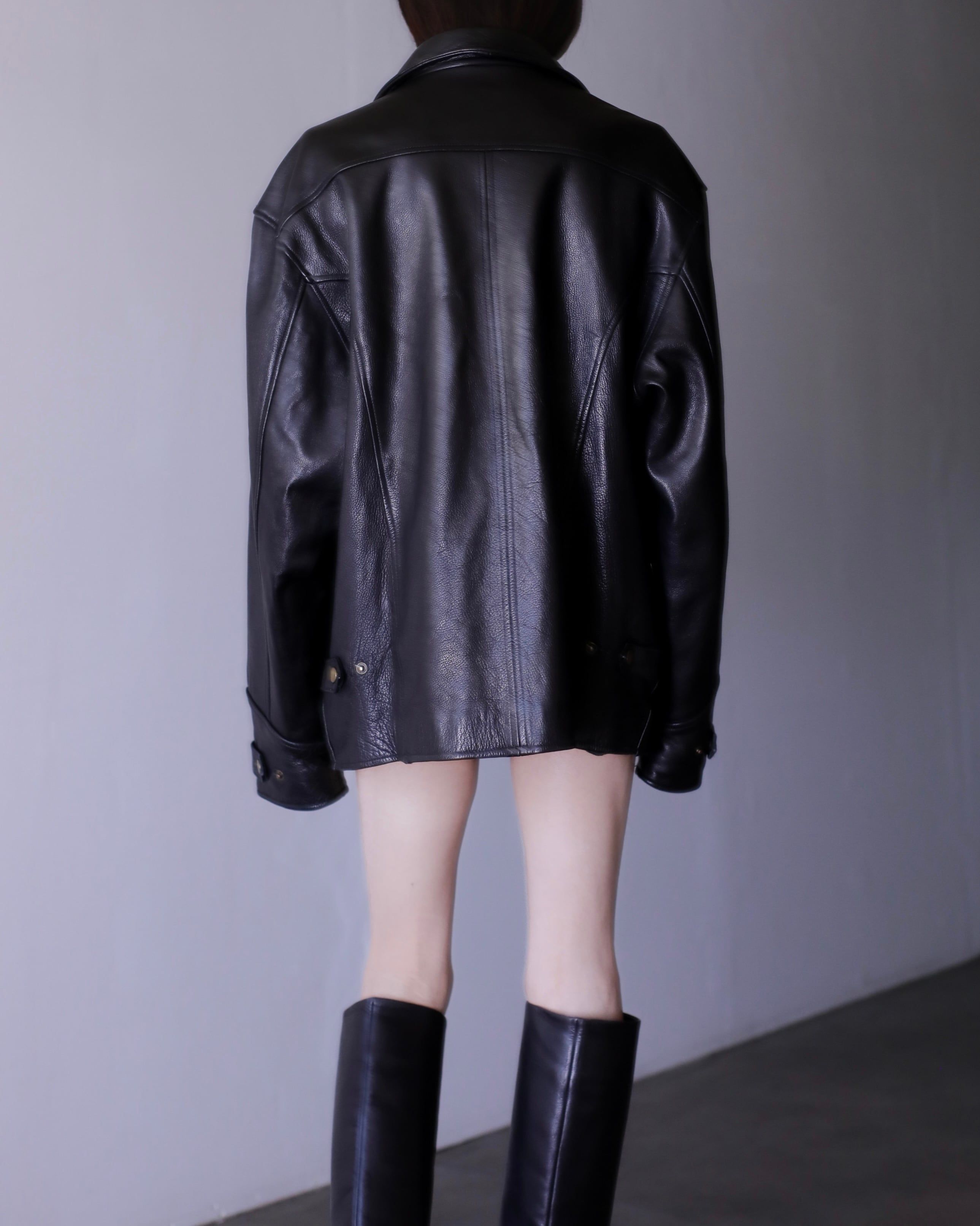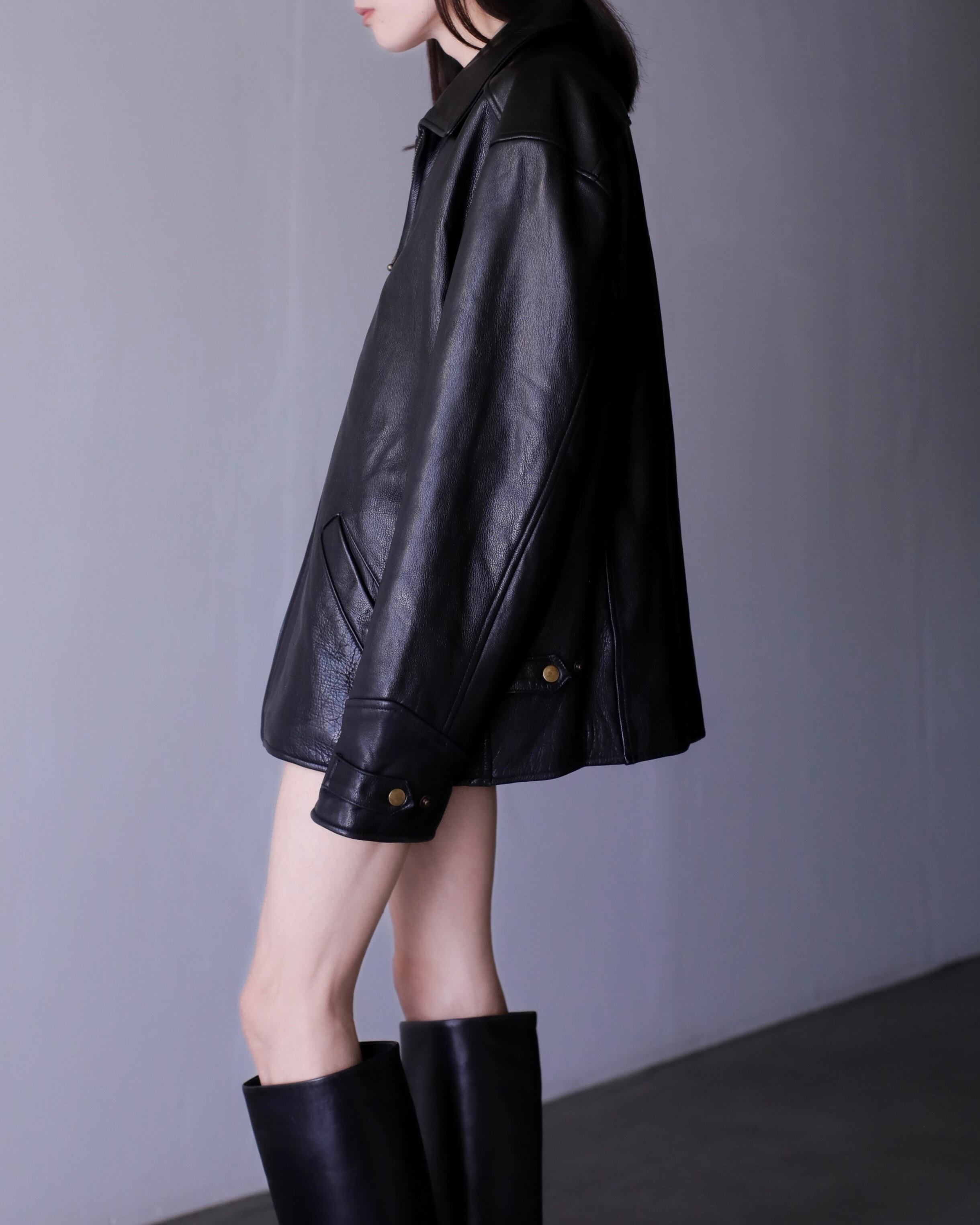 肩のしっかりと落ちる滑らかかつ柔らかな質感のレザーでオーバーシルエットの物。
