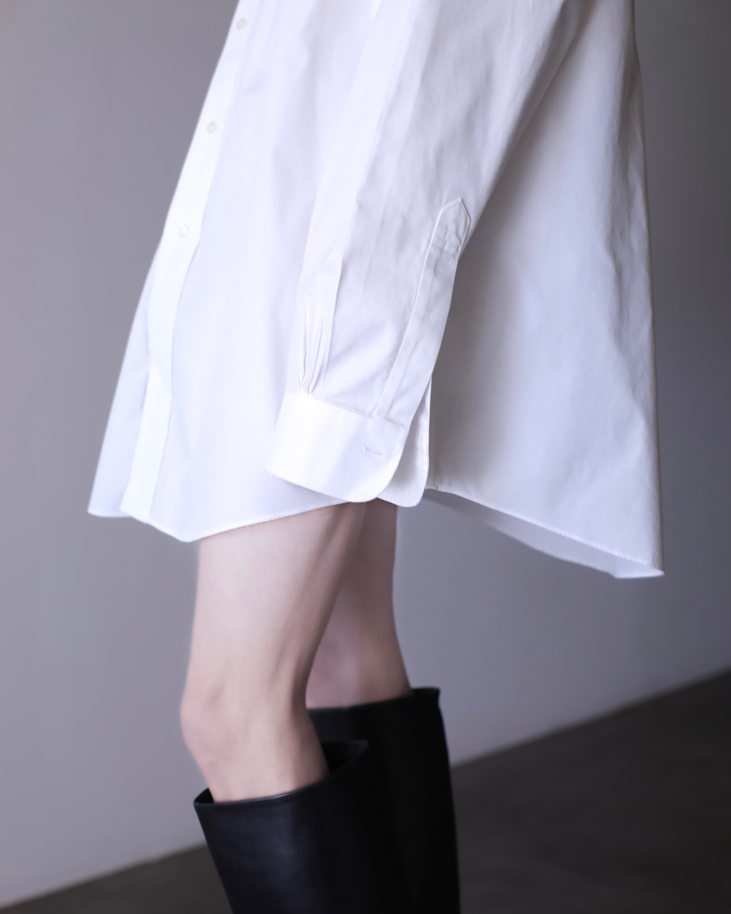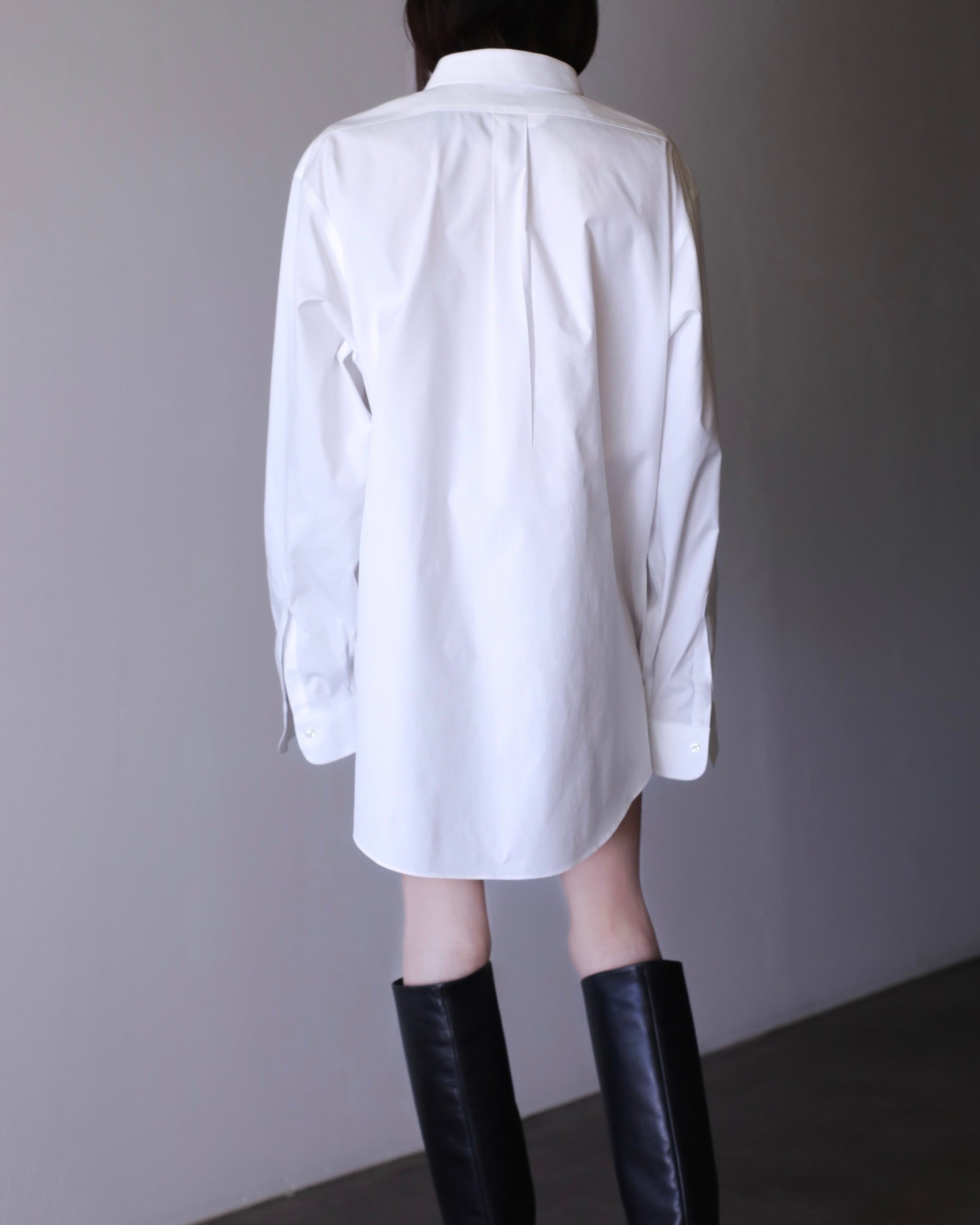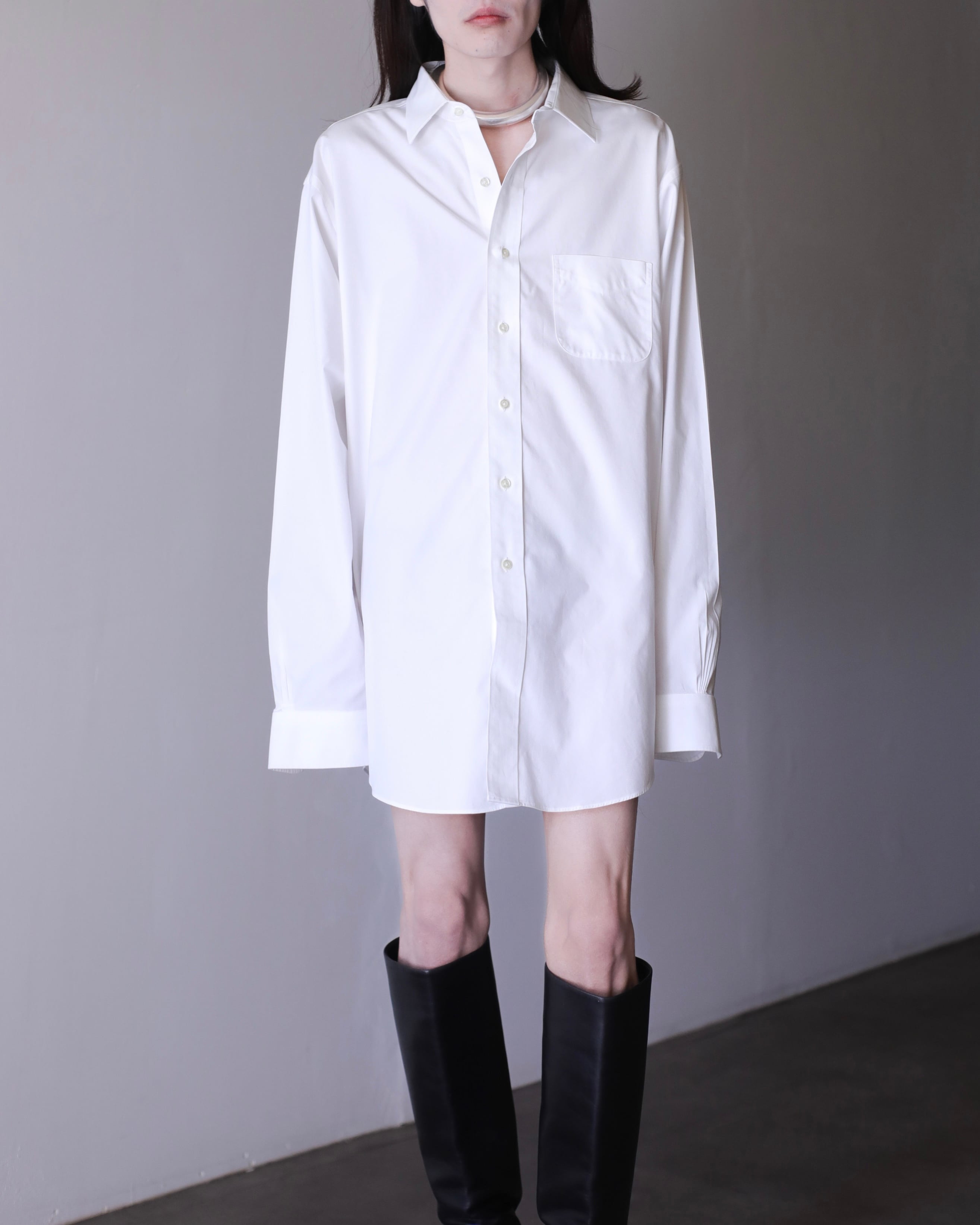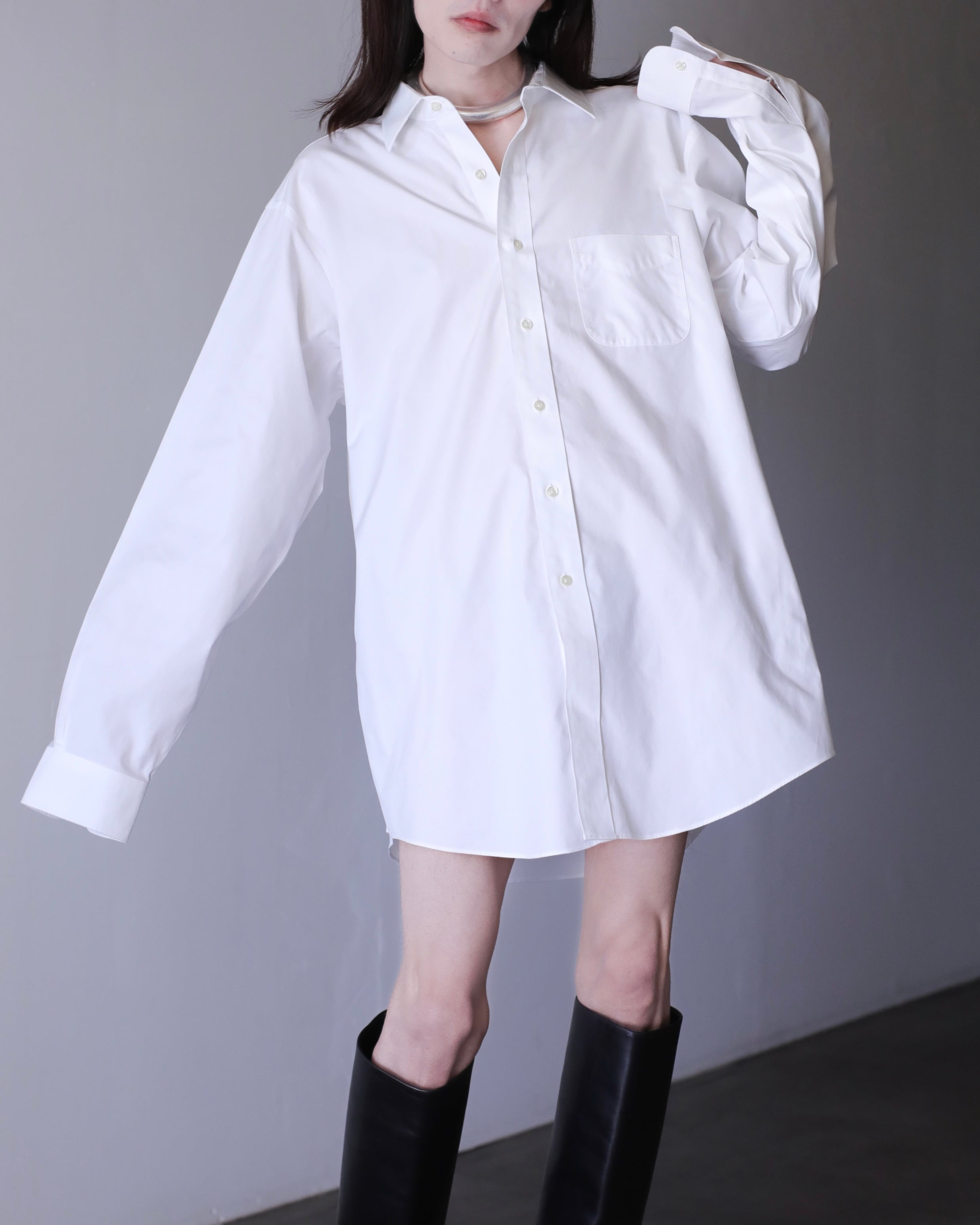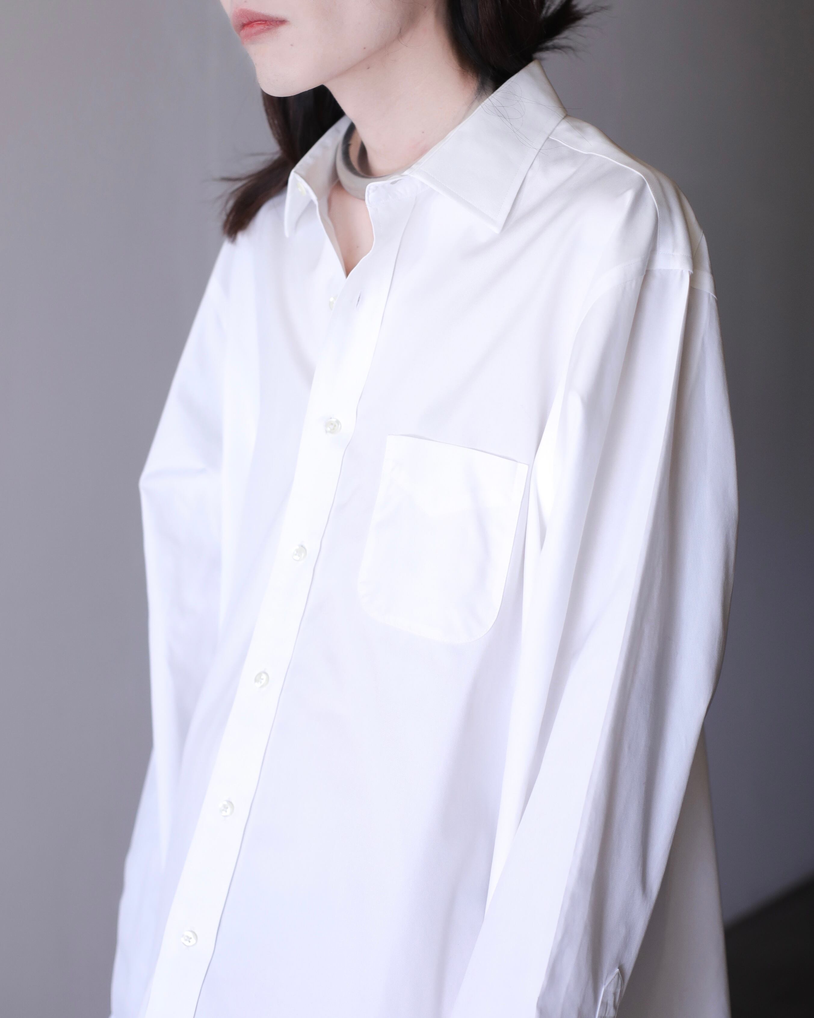なぜかというと、色々アレンジが効いたり、プレーンな白シャツなのでこのサイジングだからこそファッションとして成立したり、何より普通のサイズの白シャツに魅力を感じないから当店ではこのオーバーな物をあえてセレクトしております。