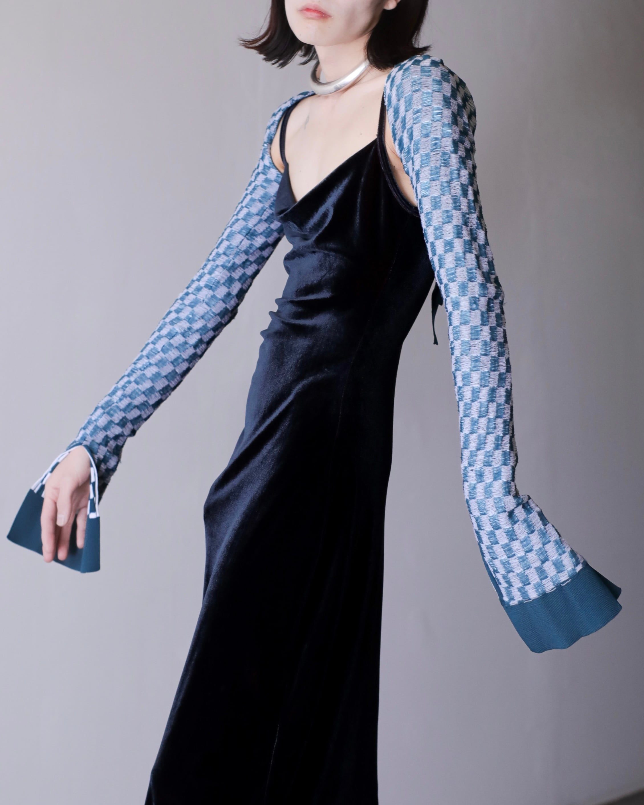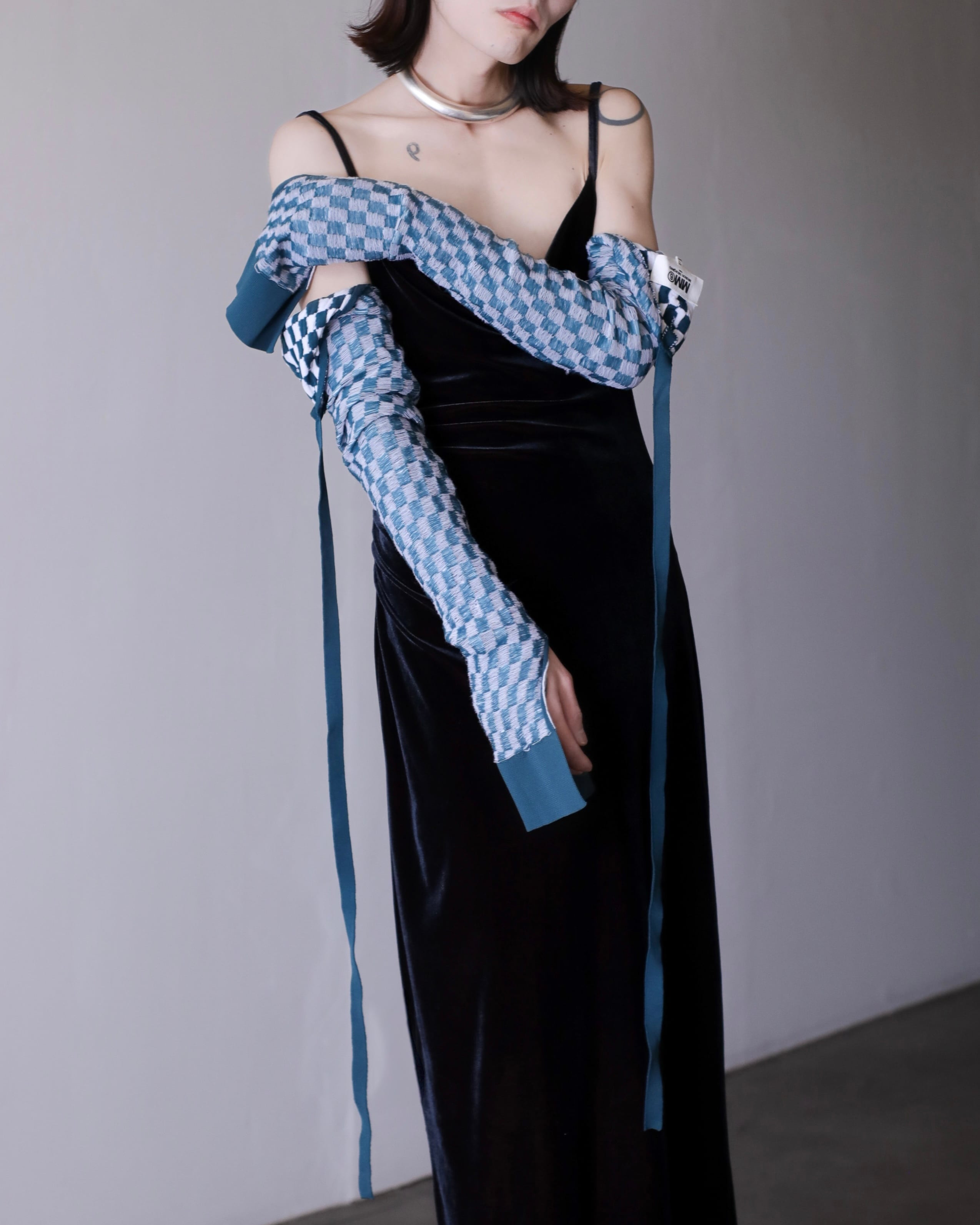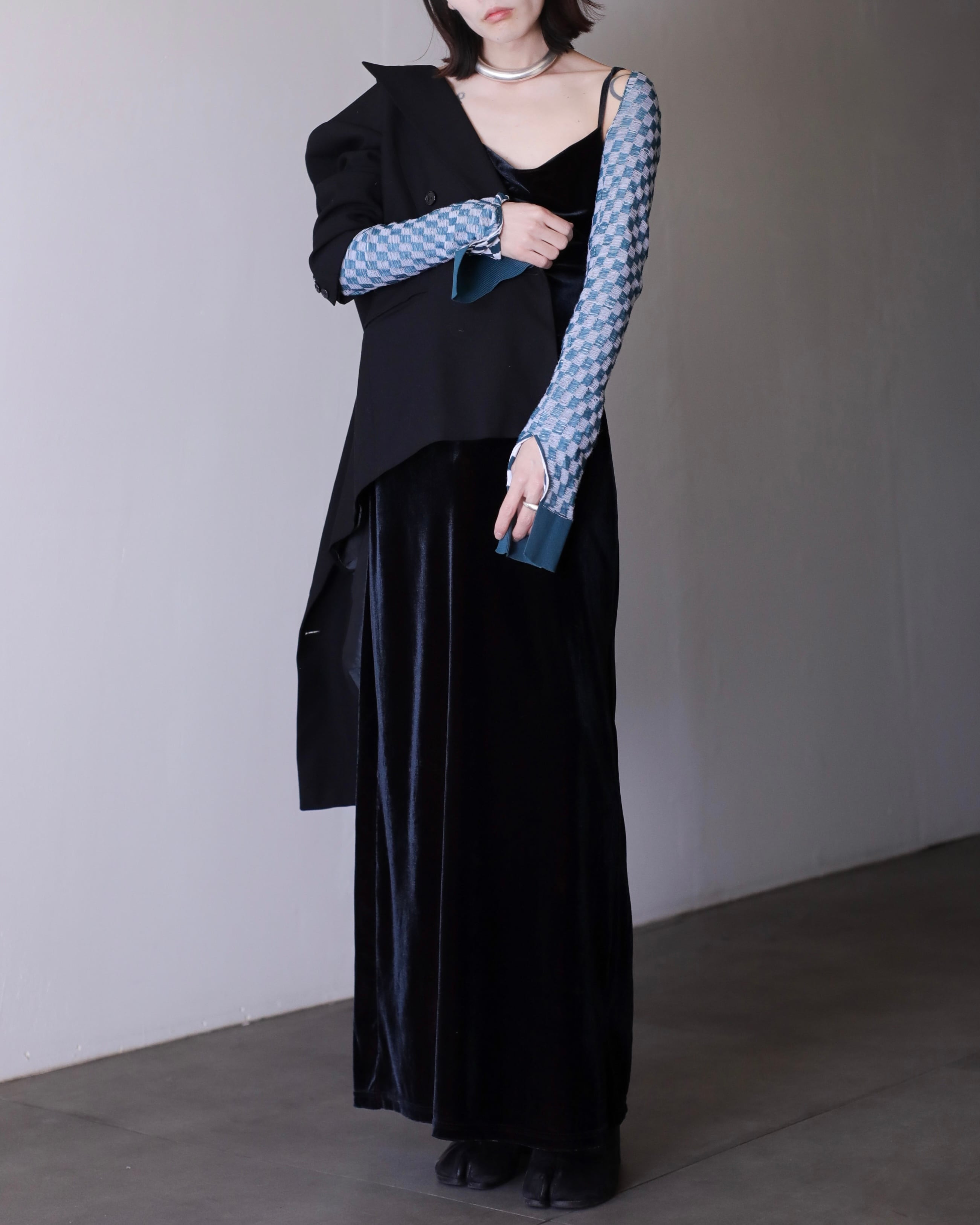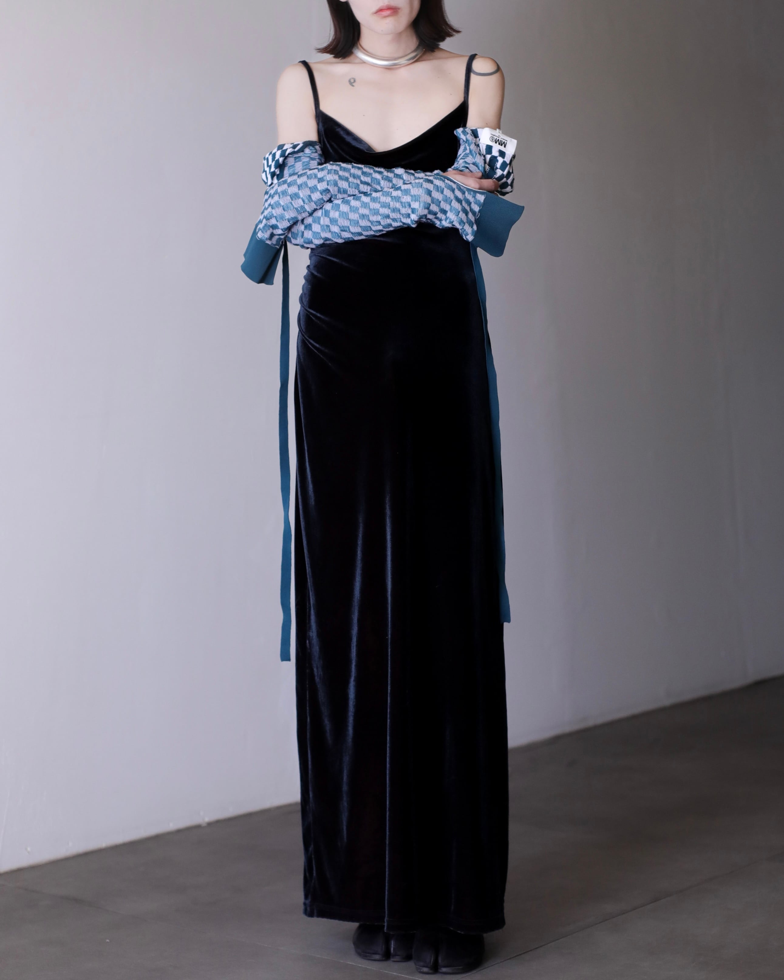 ベロアファブリックが印象的なドレス。