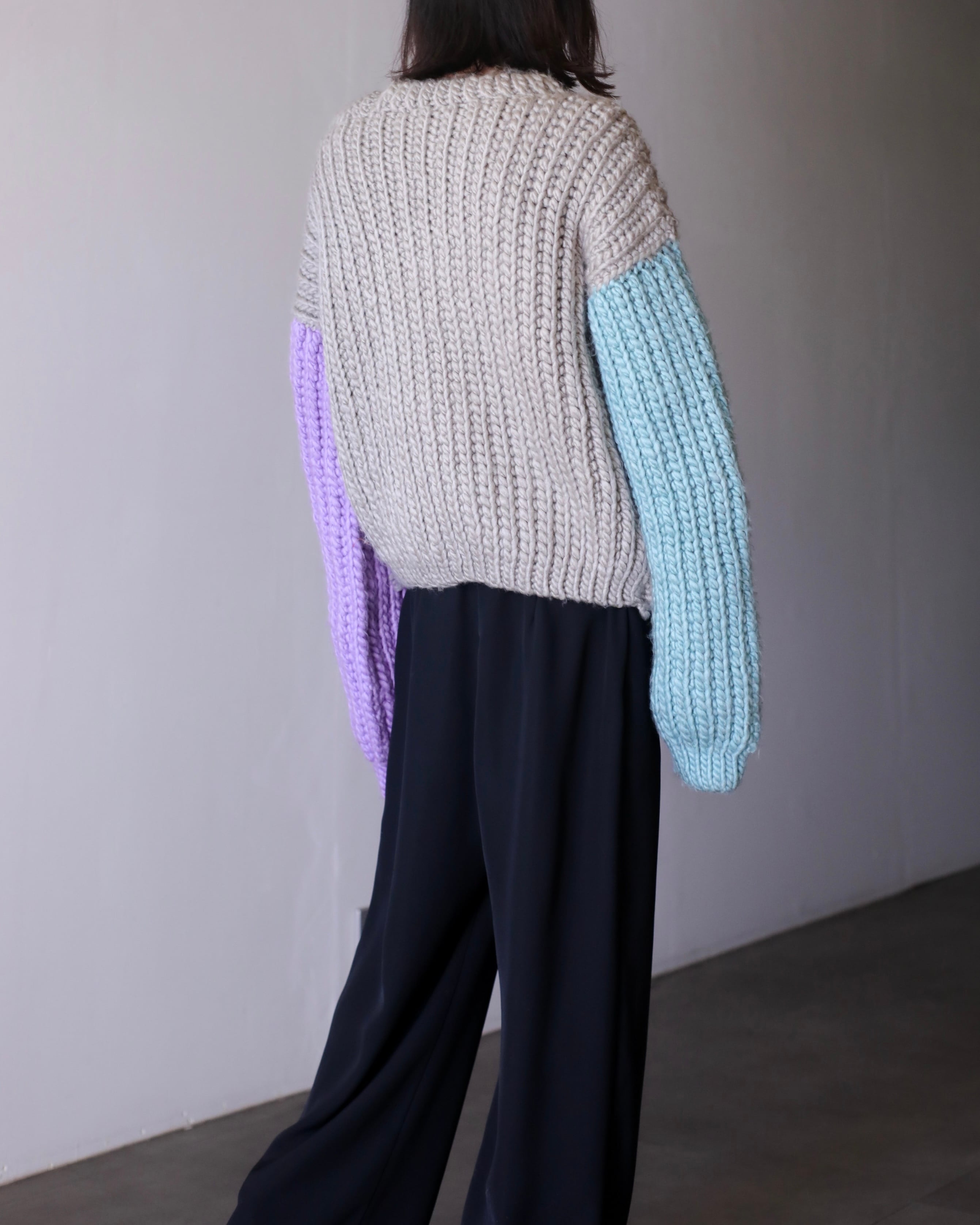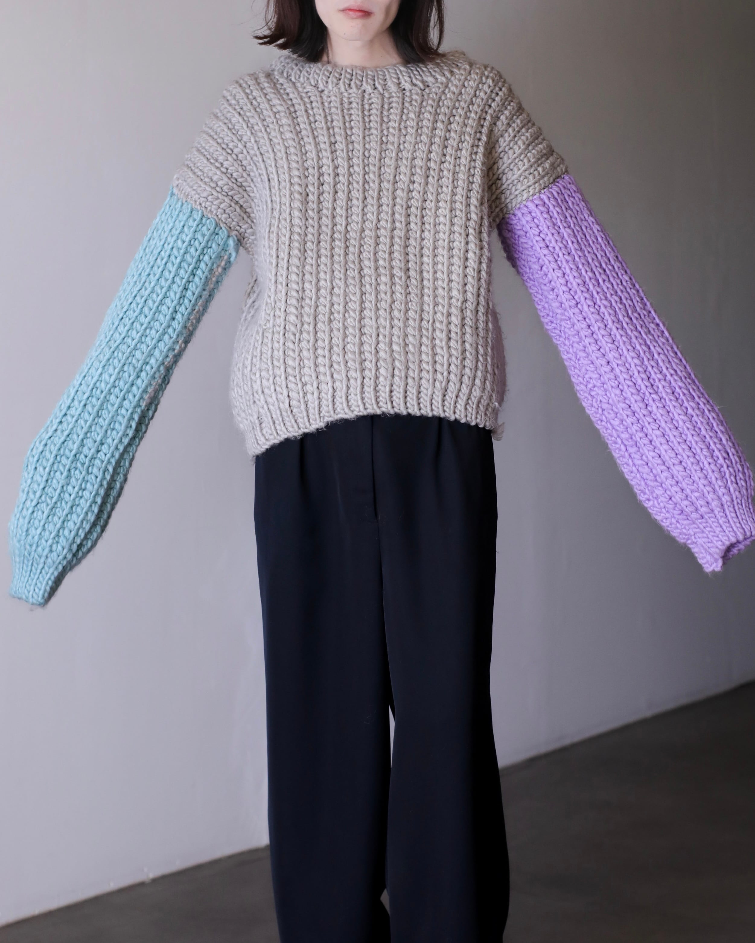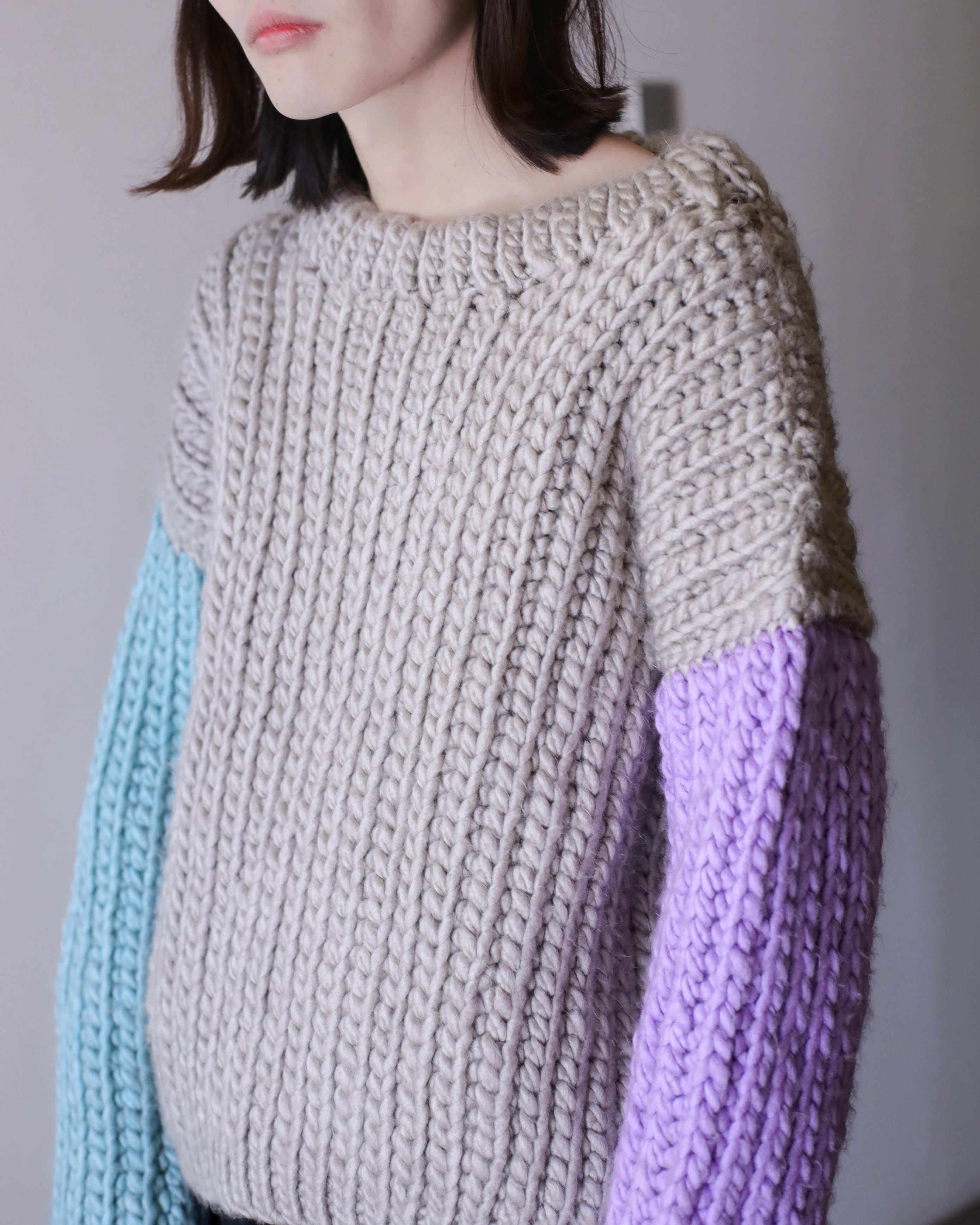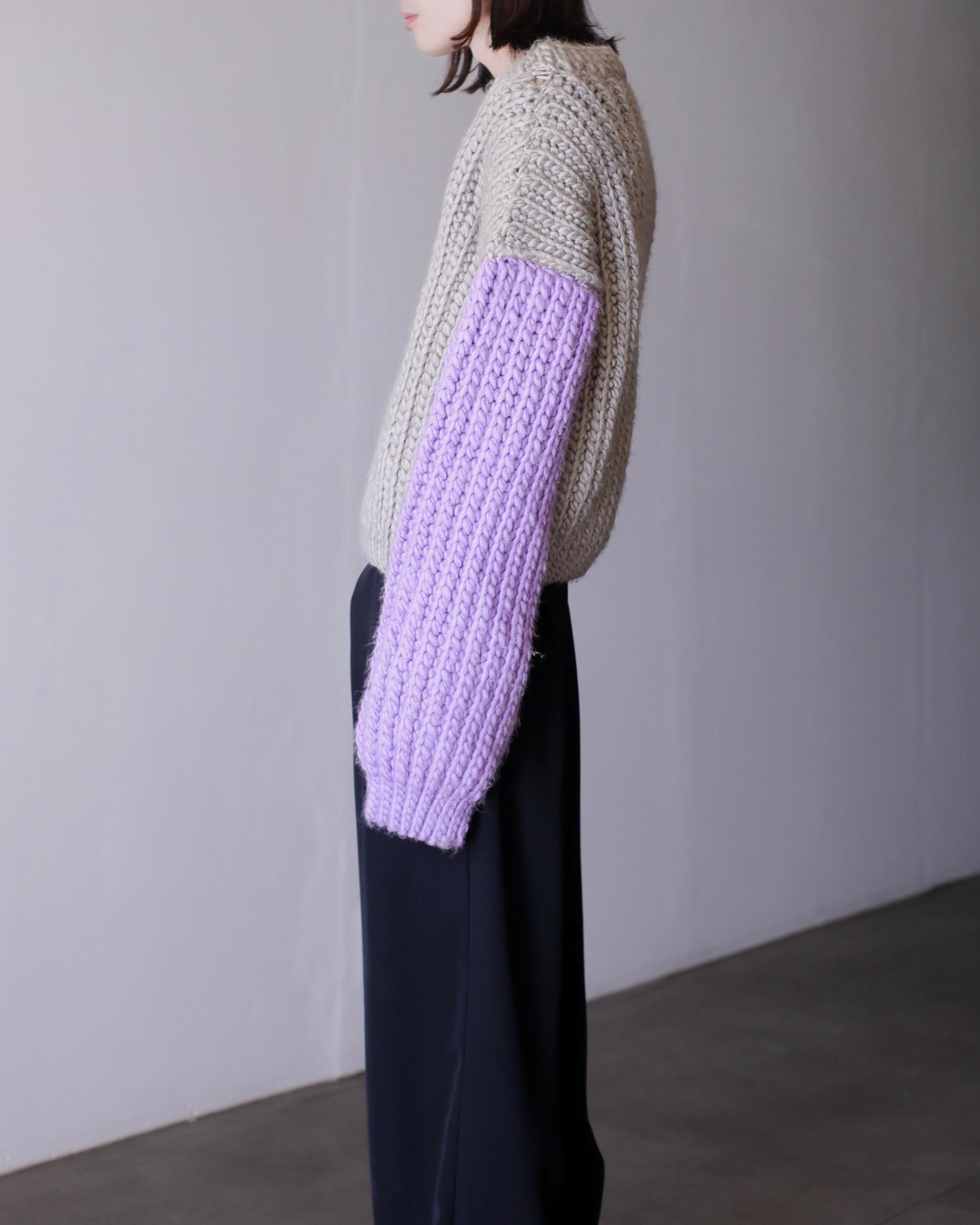 淡いパープルとペールブルーの切り替えスリーブ。