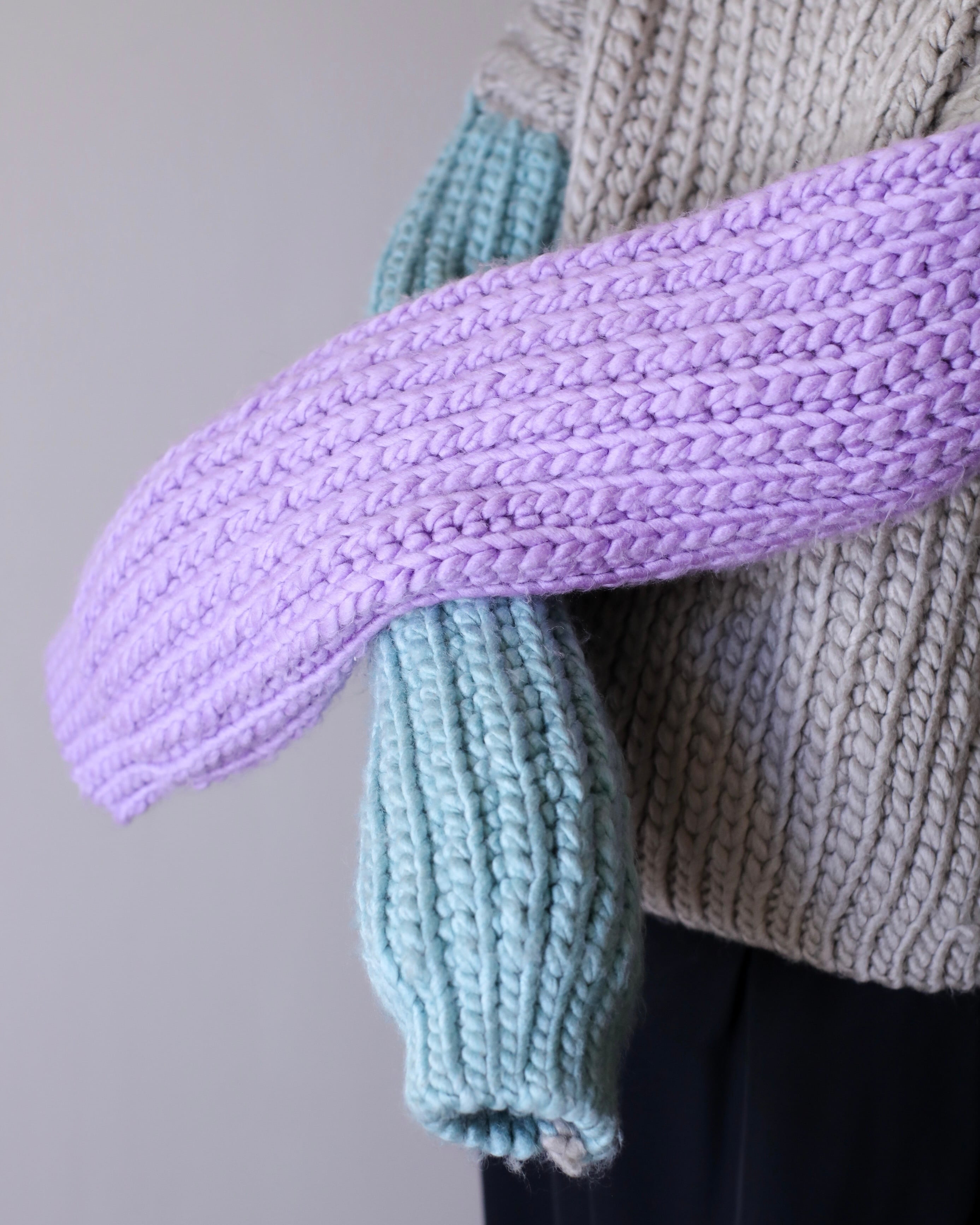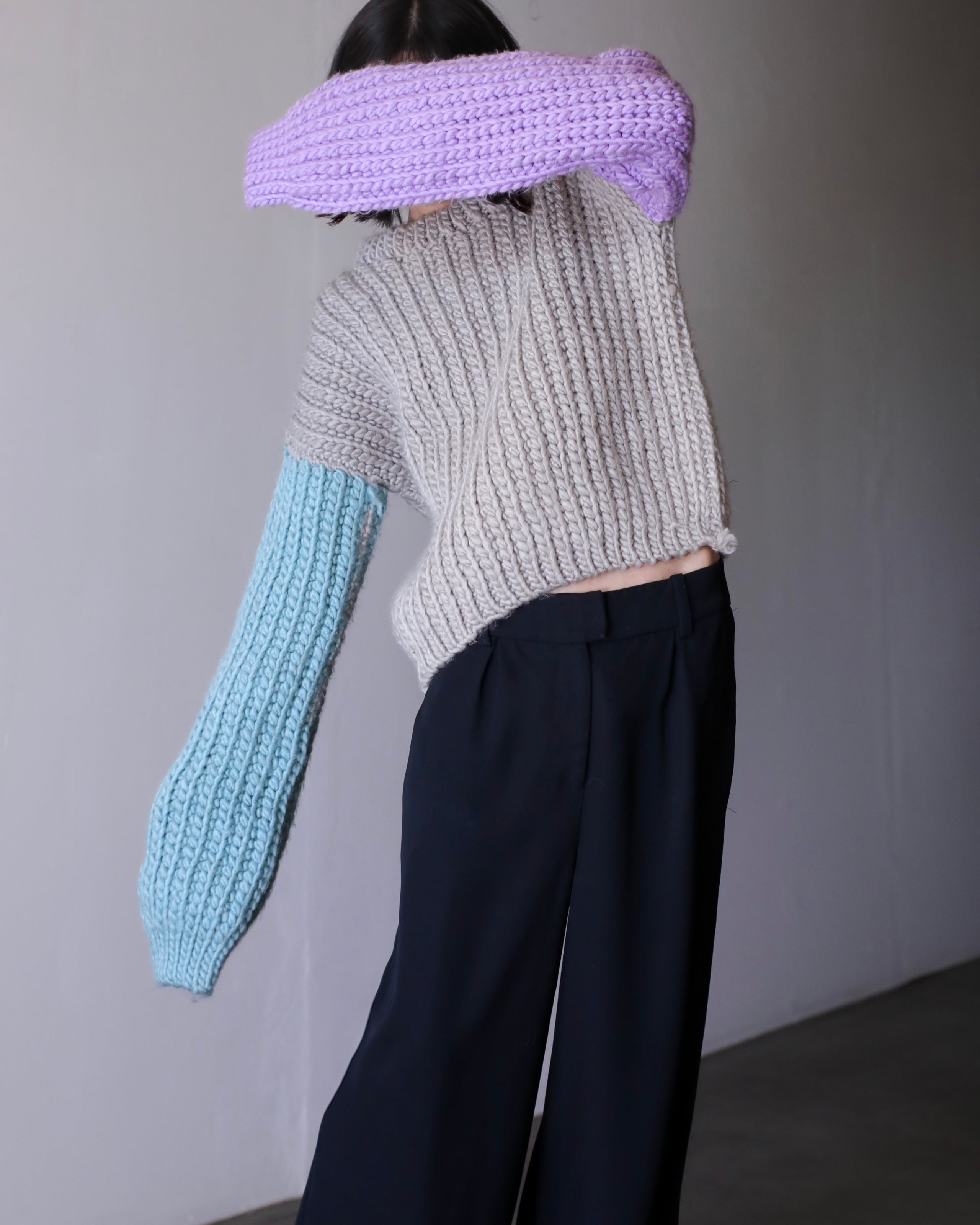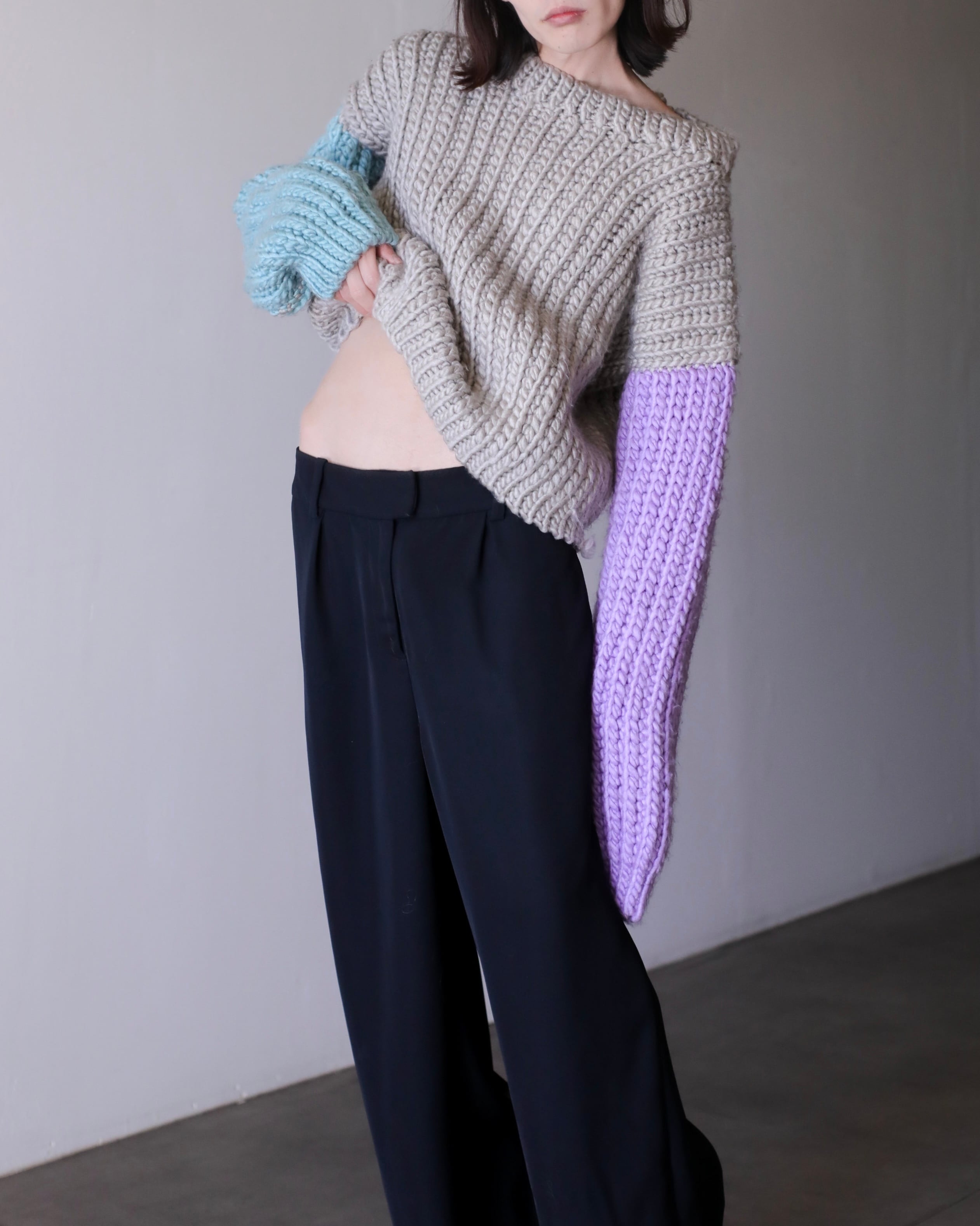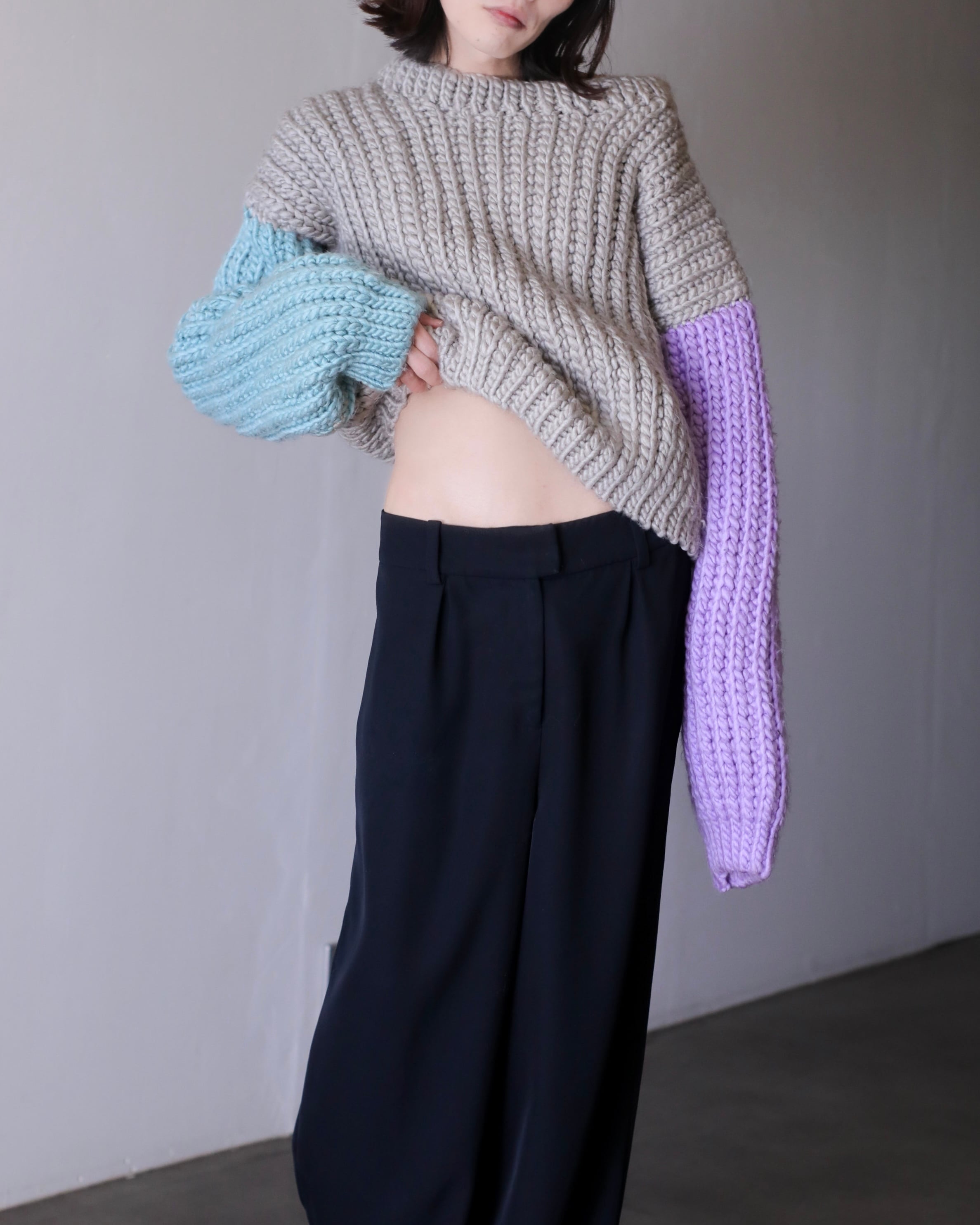 淡いパープルとペールブルーの切り替えスリーブ。