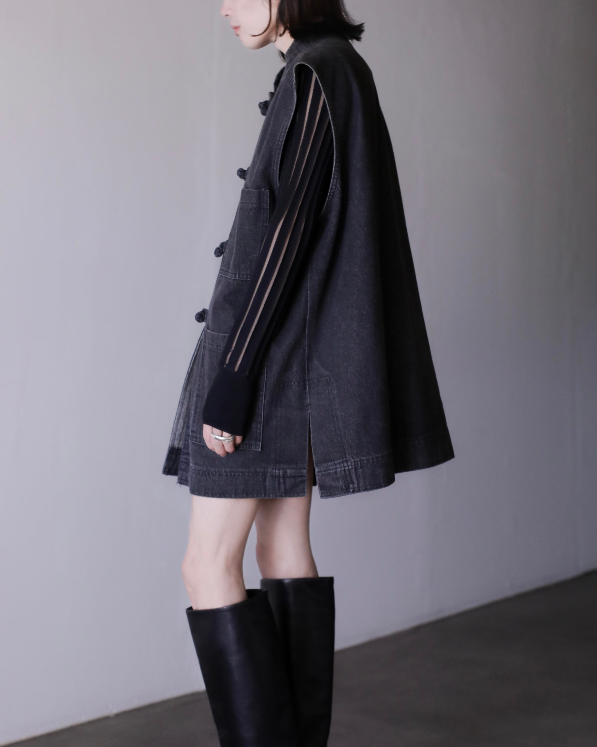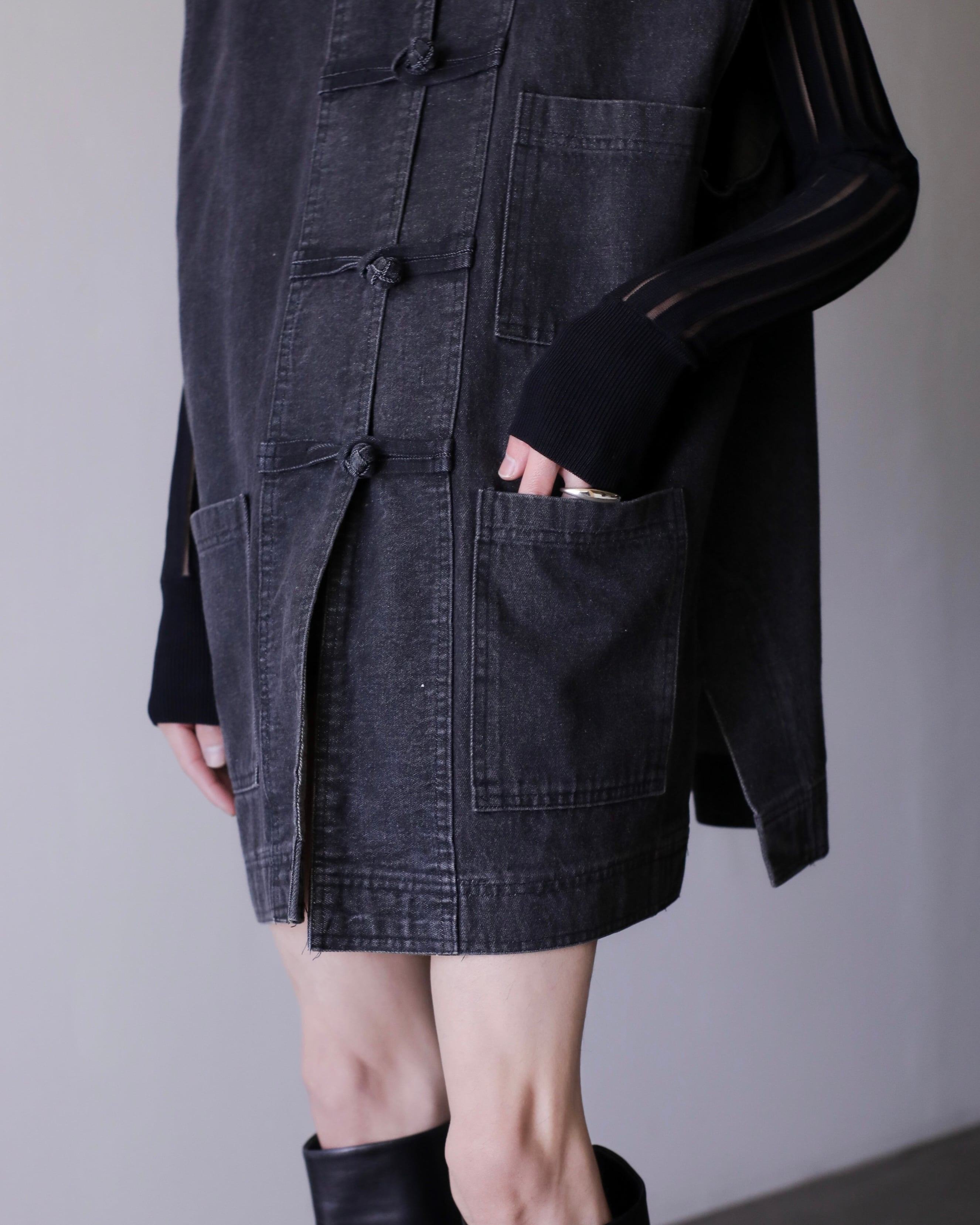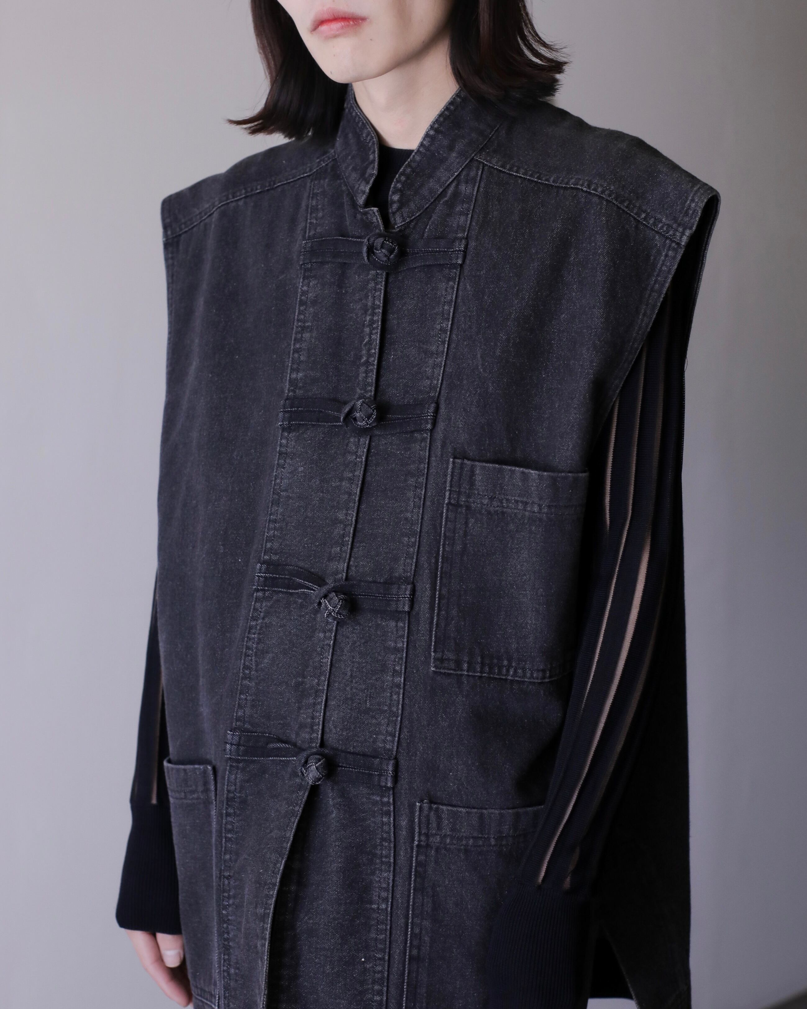 1990s kang-fu design black denim sleeve less jacket Made In USA