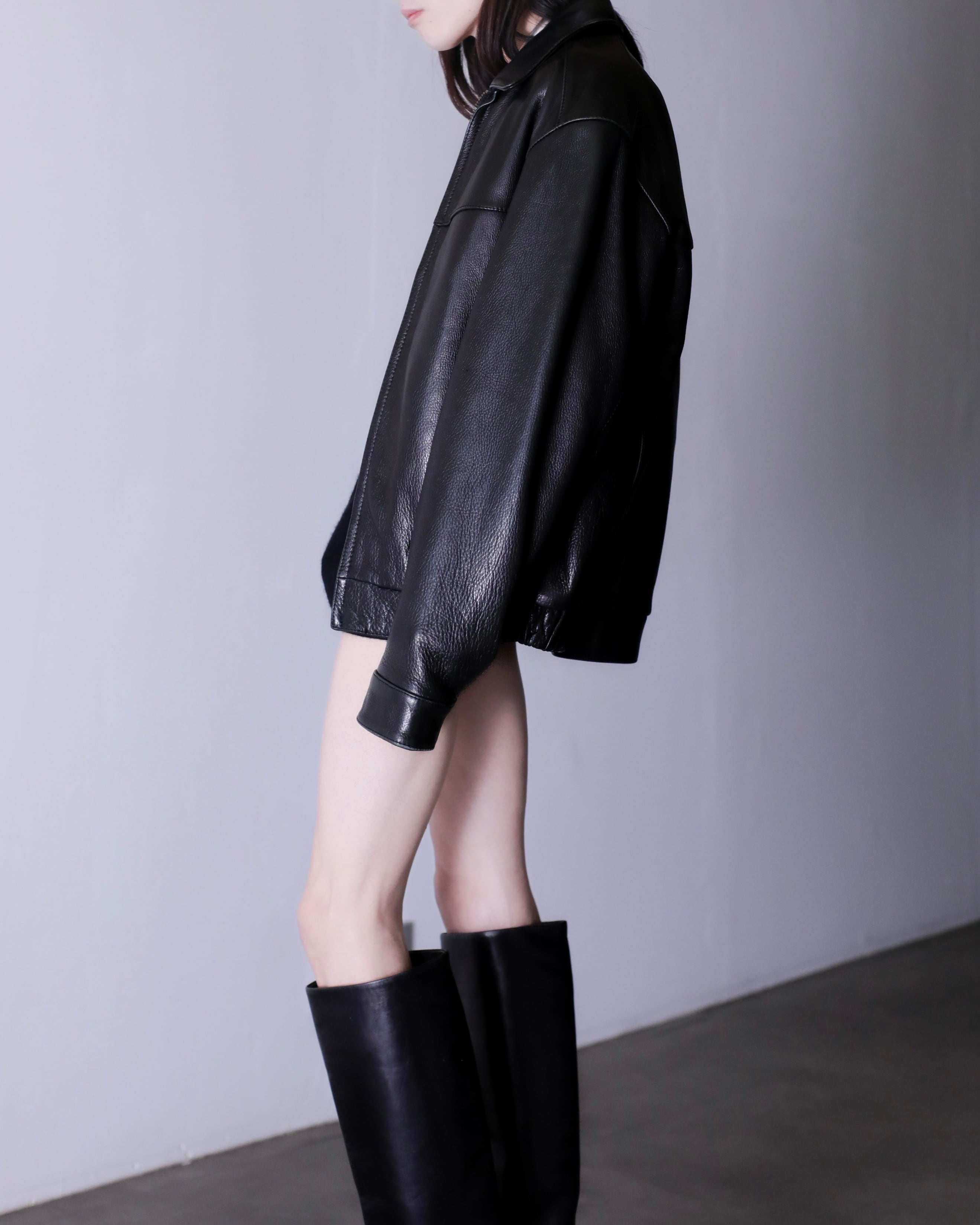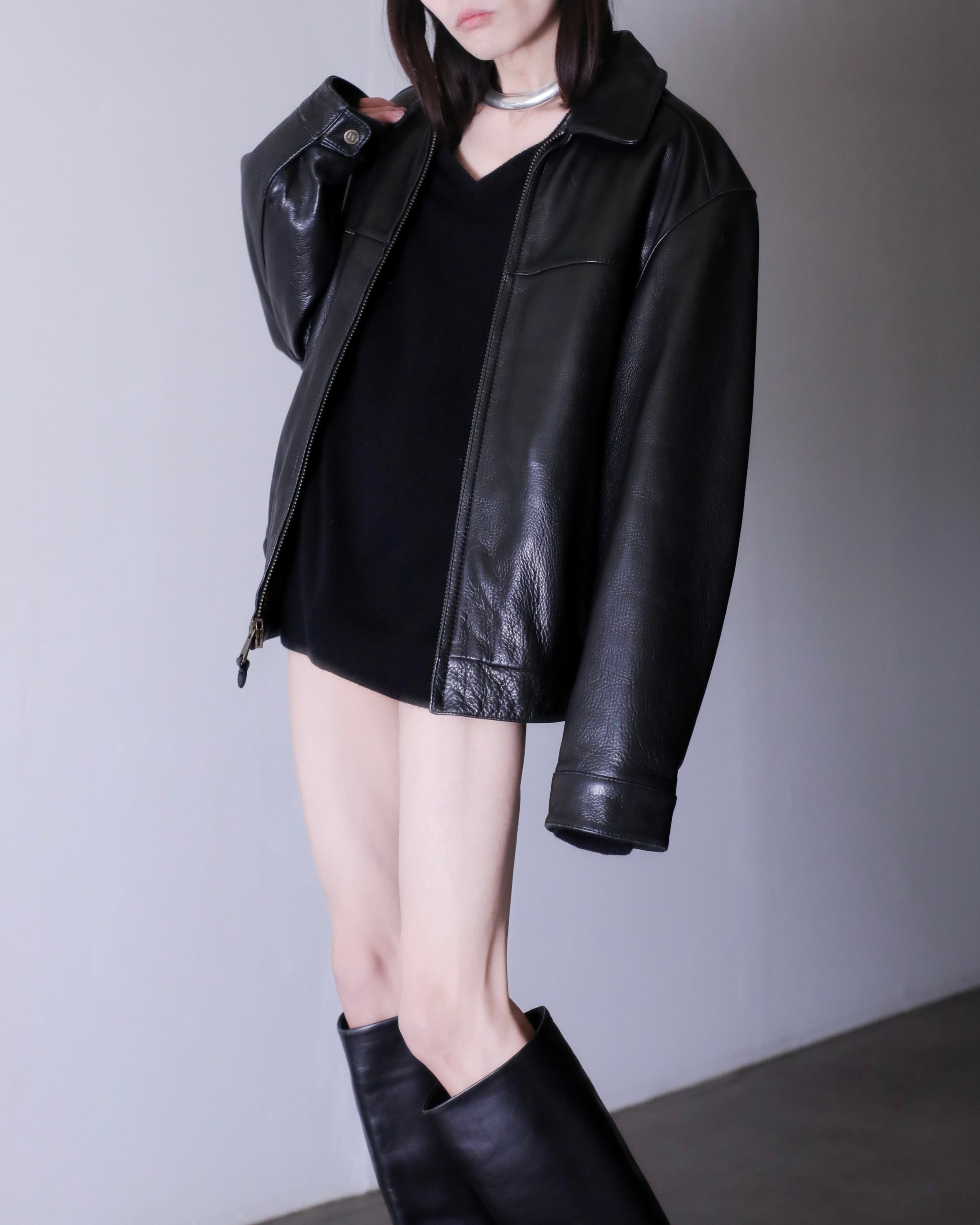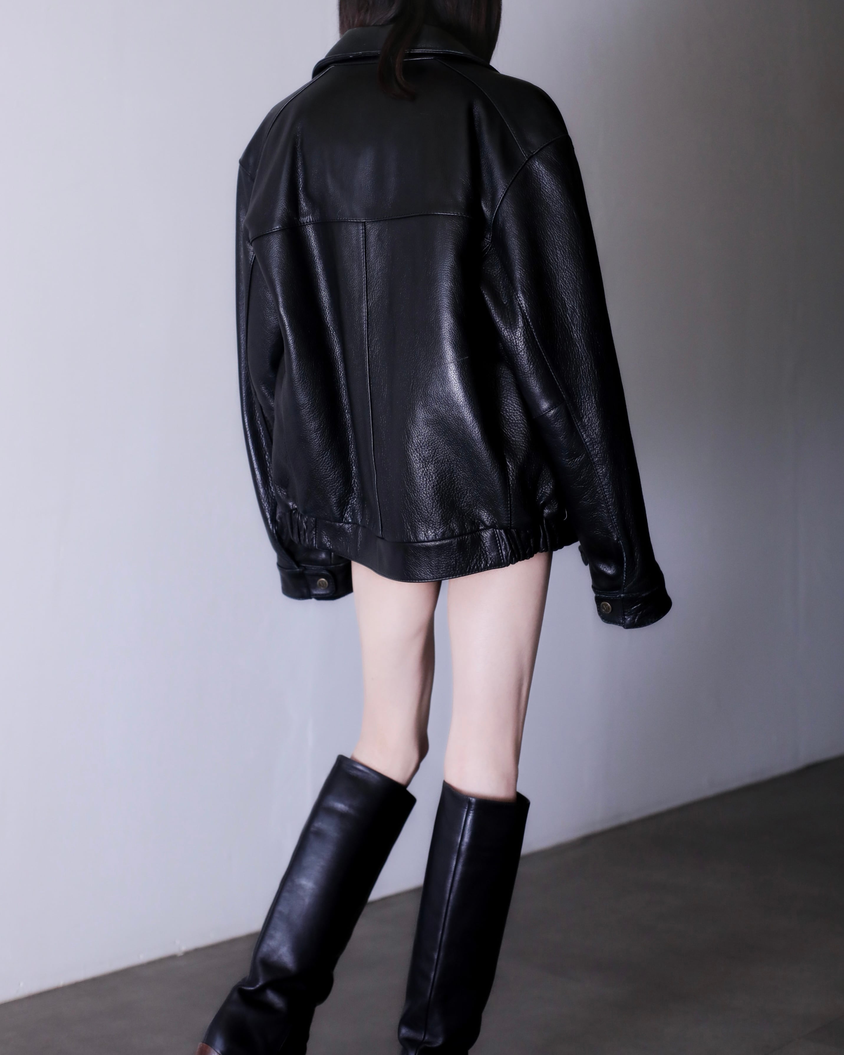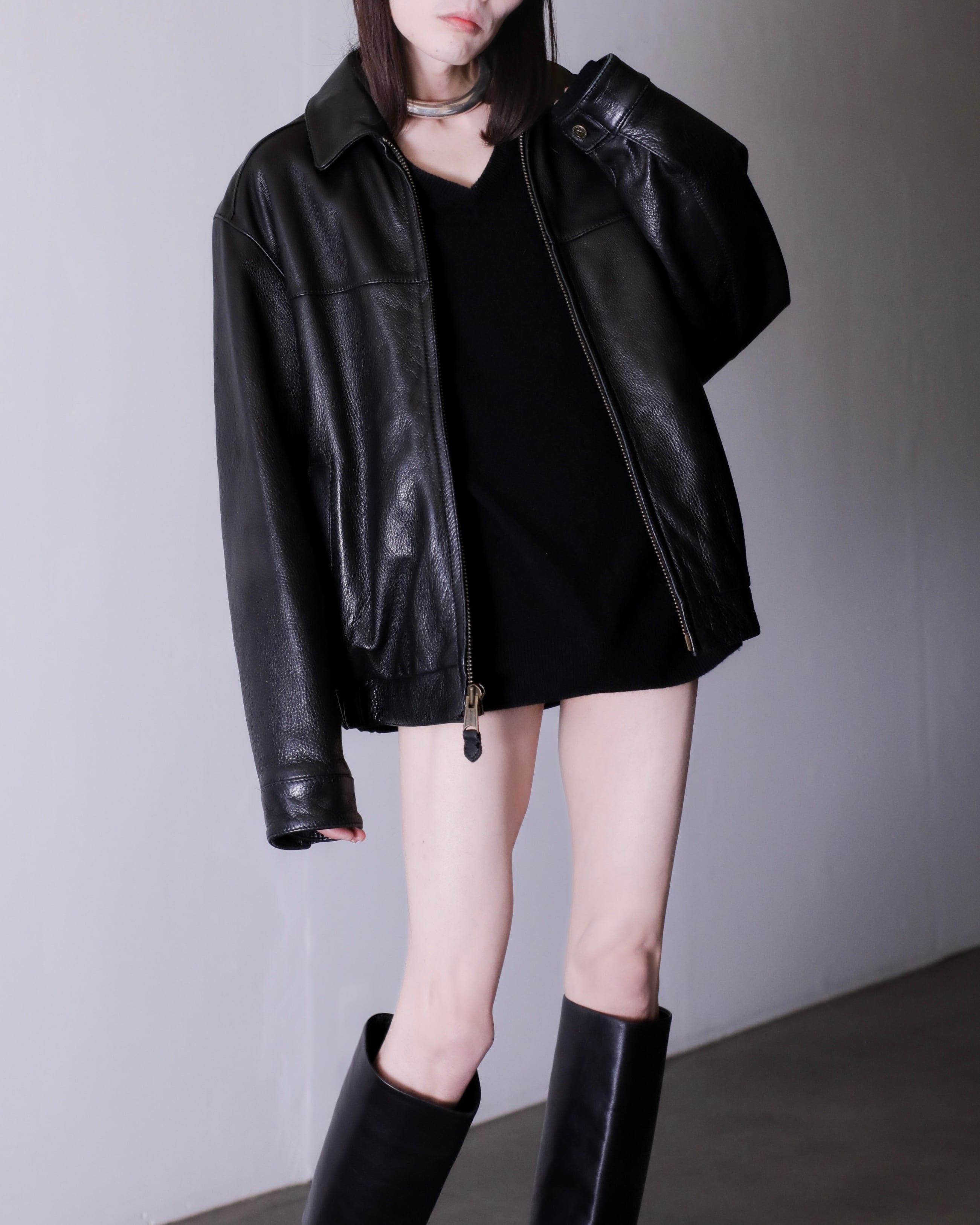 肩のしっかりと落ちる滑らかかつ柔らかな質感のレザーでオーバーシルエットの物。