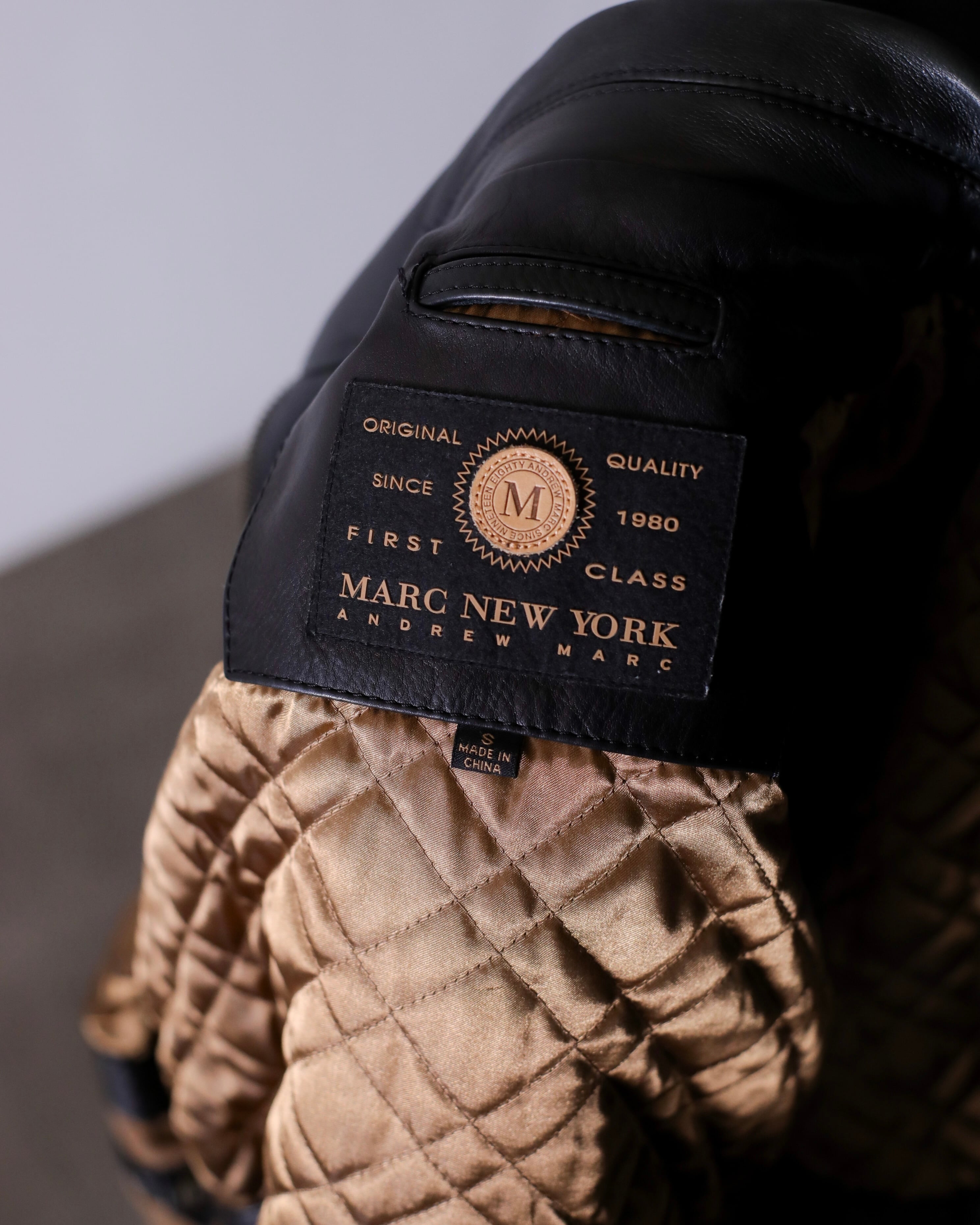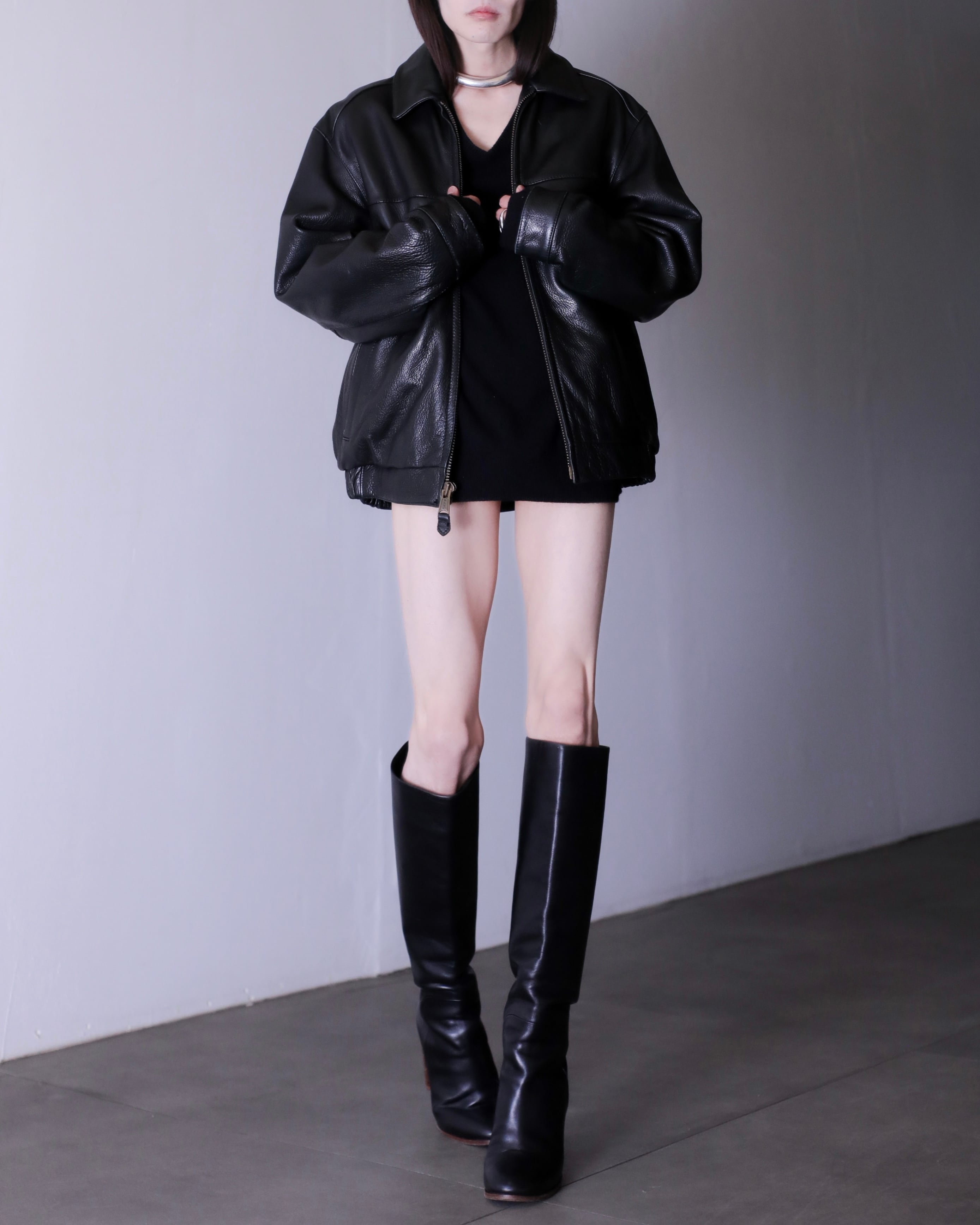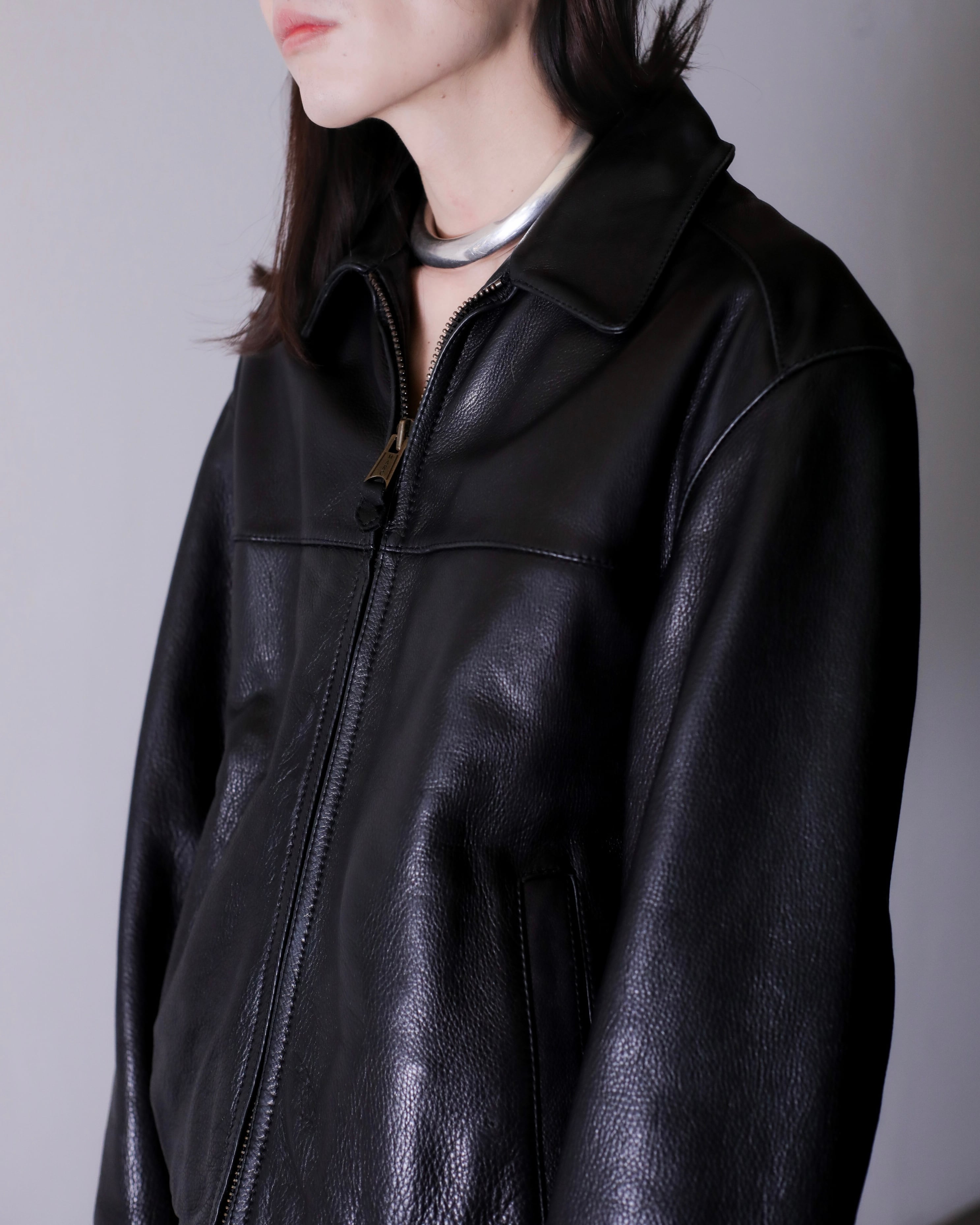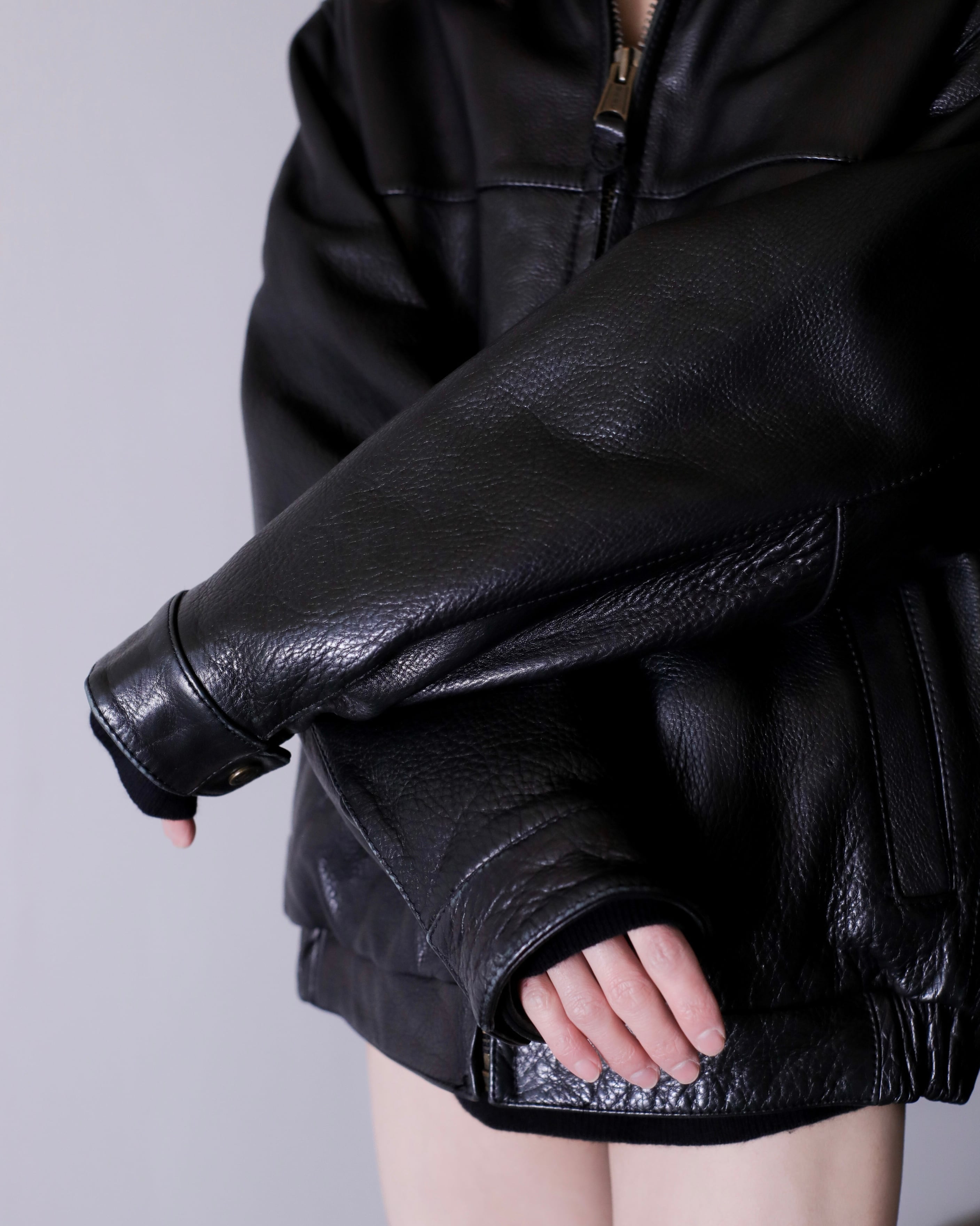 肩のしっかりと落ちる滑らかかつ柔らかな質感のレザーでオーバーシルエットの物。
