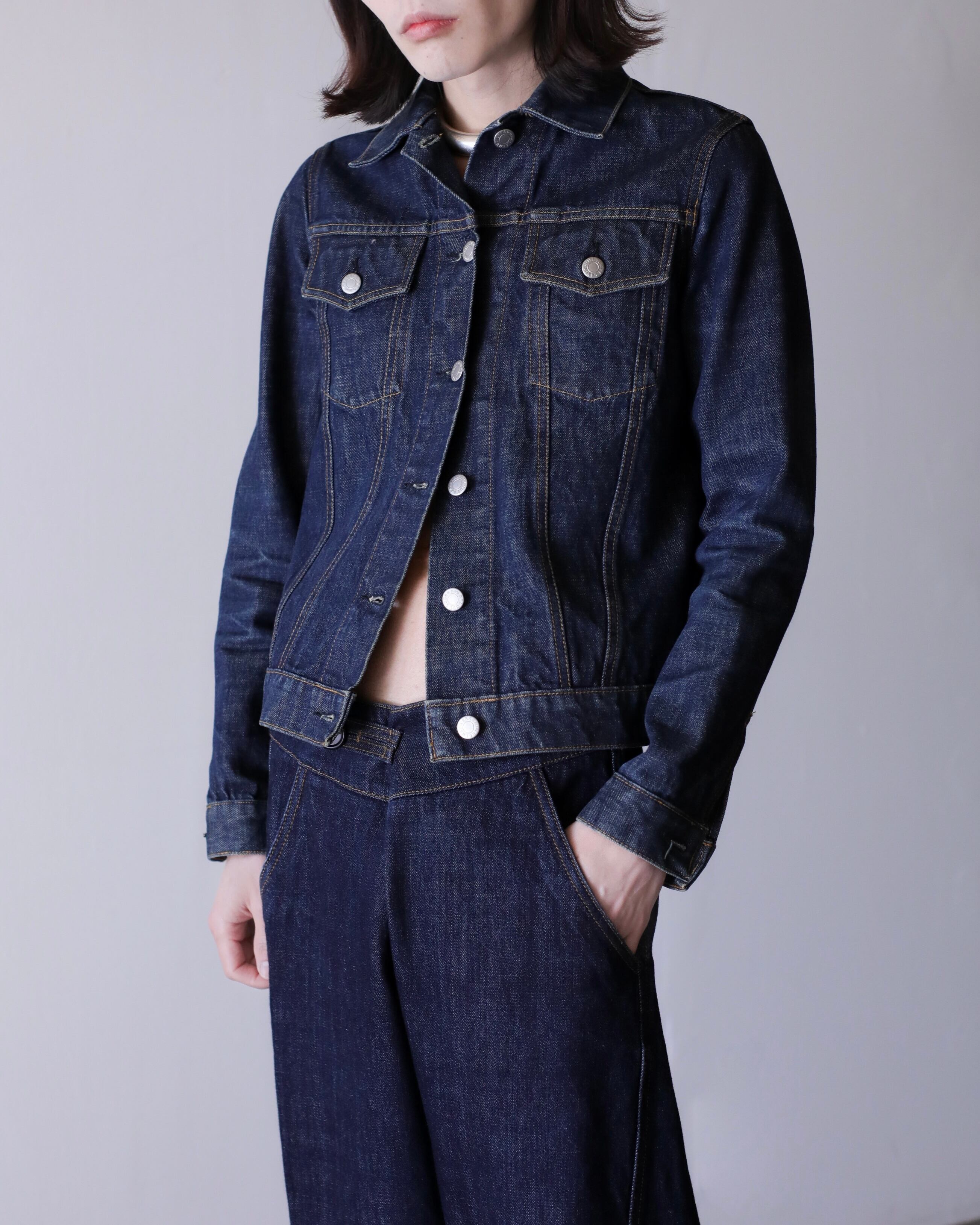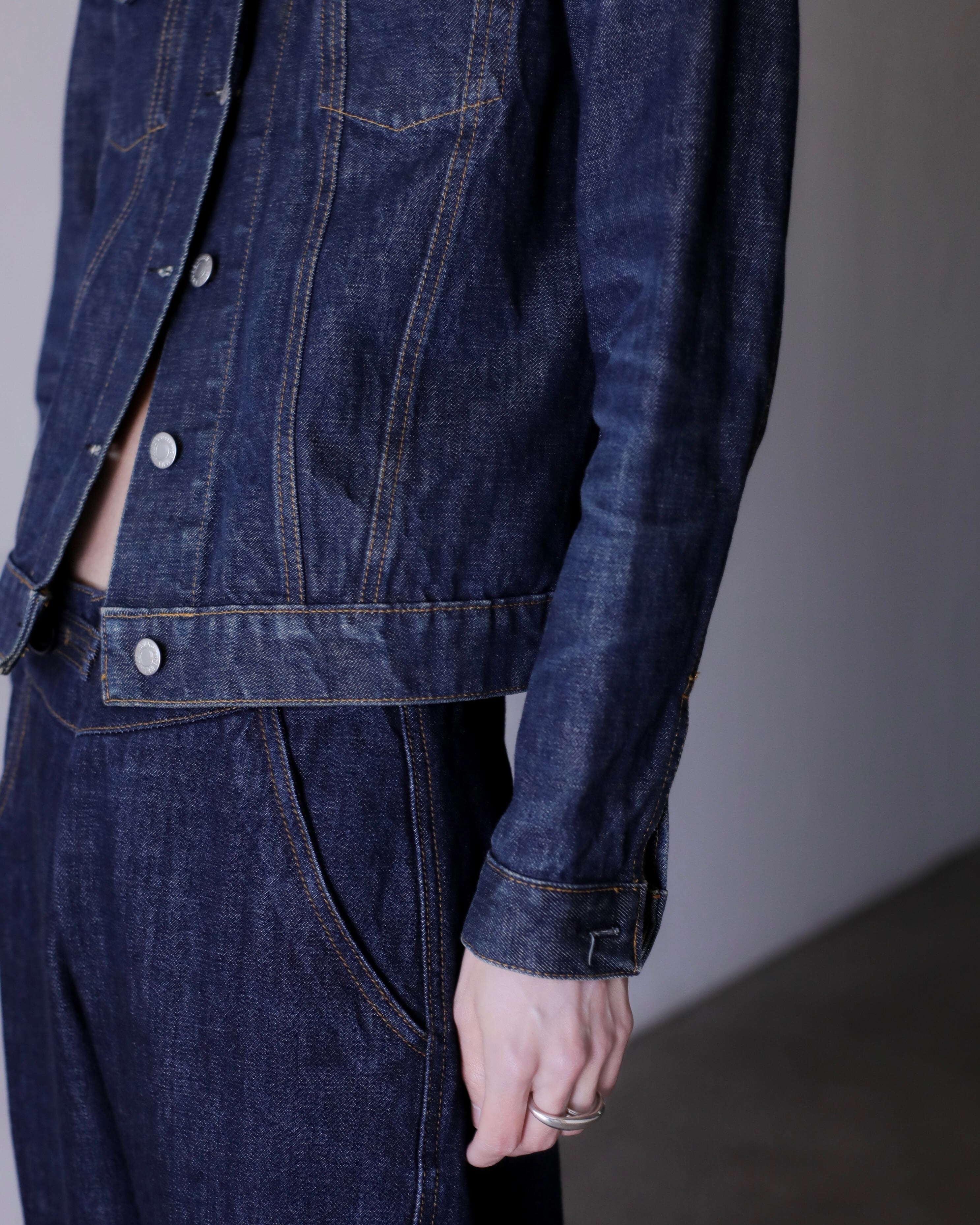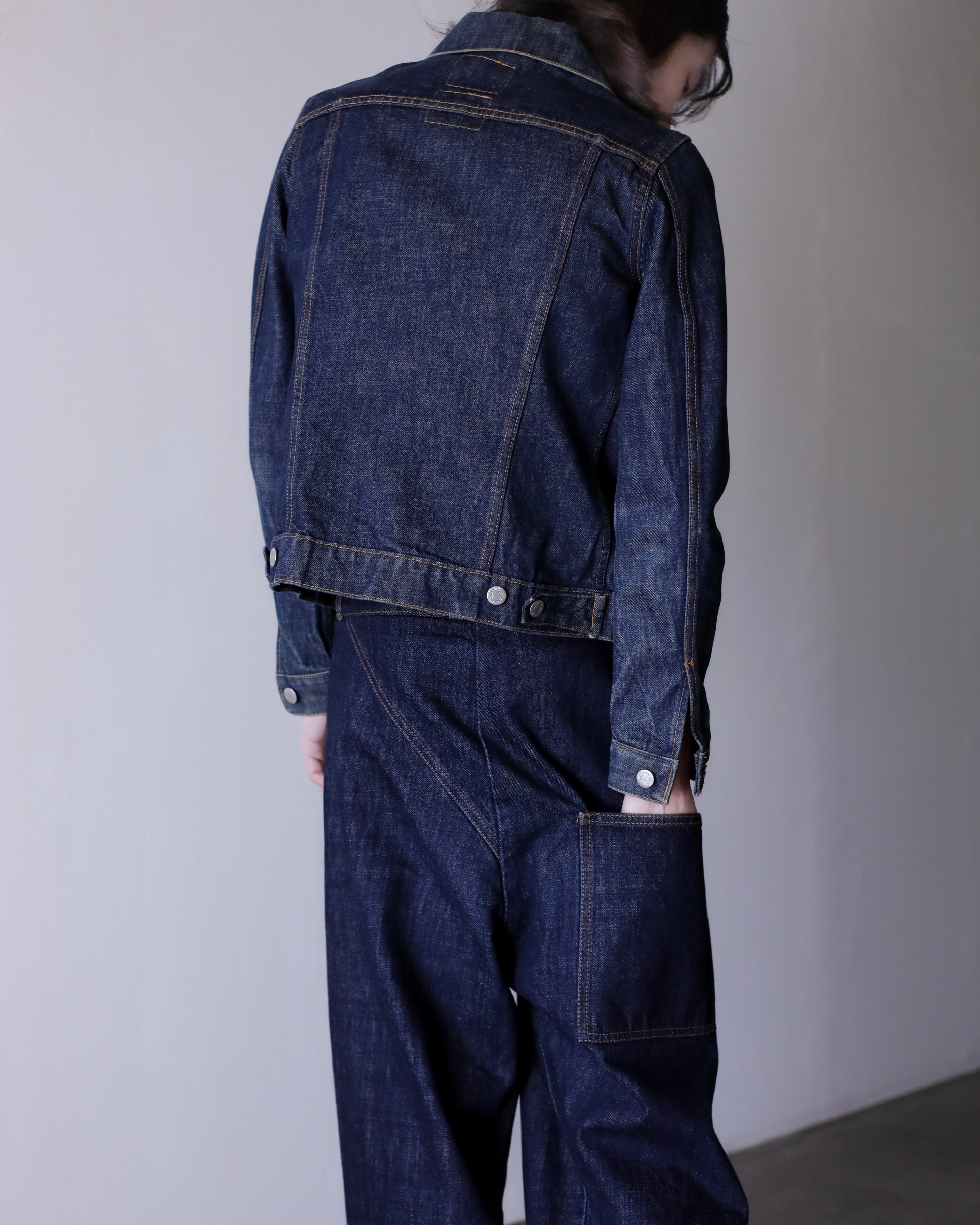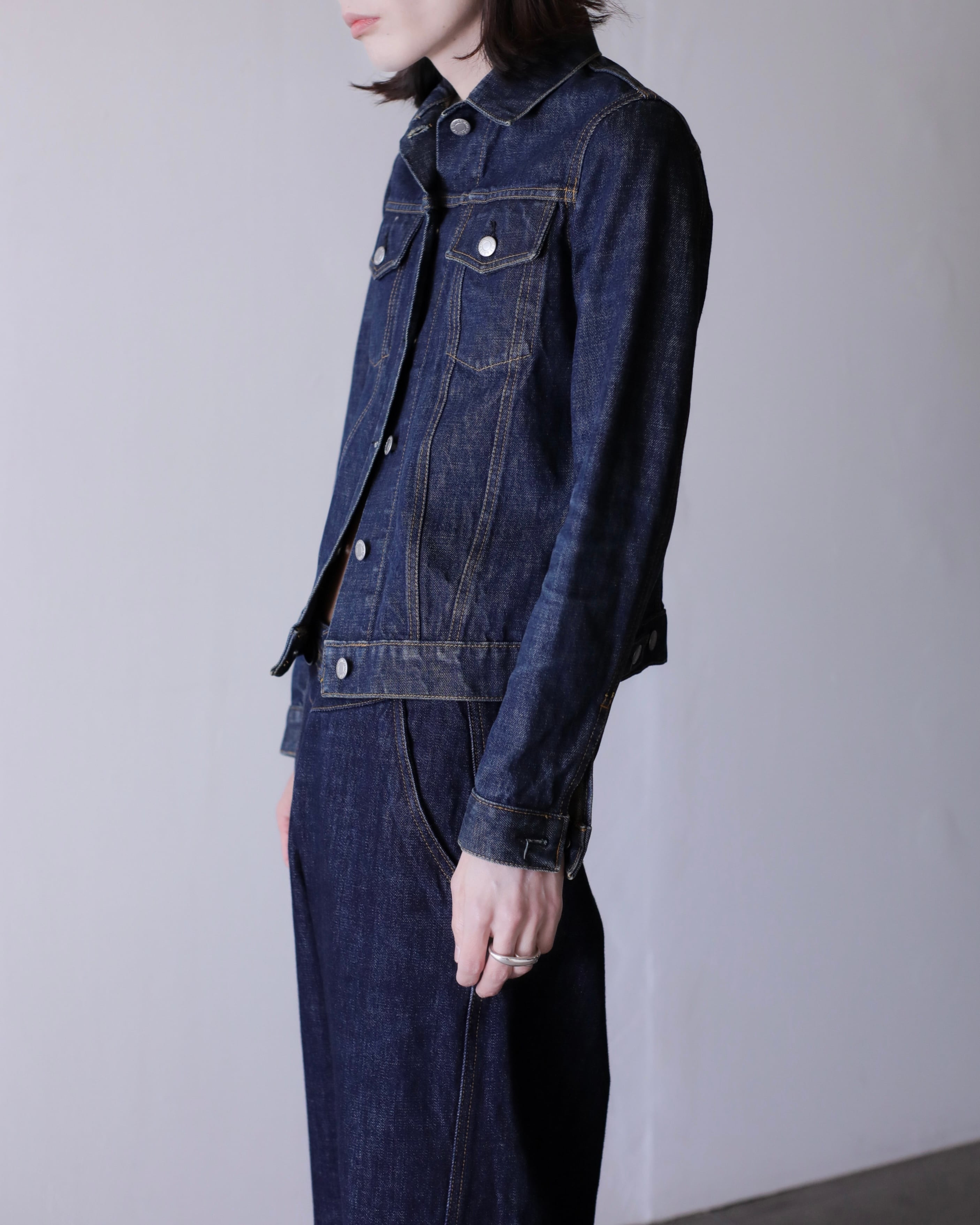 デニムオンデニムのスタイリングにもバチっとハマるジャケット。コートのインナーなんかにもとても良いと思います。スラックスやロングスカートでモードな感じに着たり、スウェットパンツでラフにも正直ルールなしに自由に着て良いアイテムだと思います。