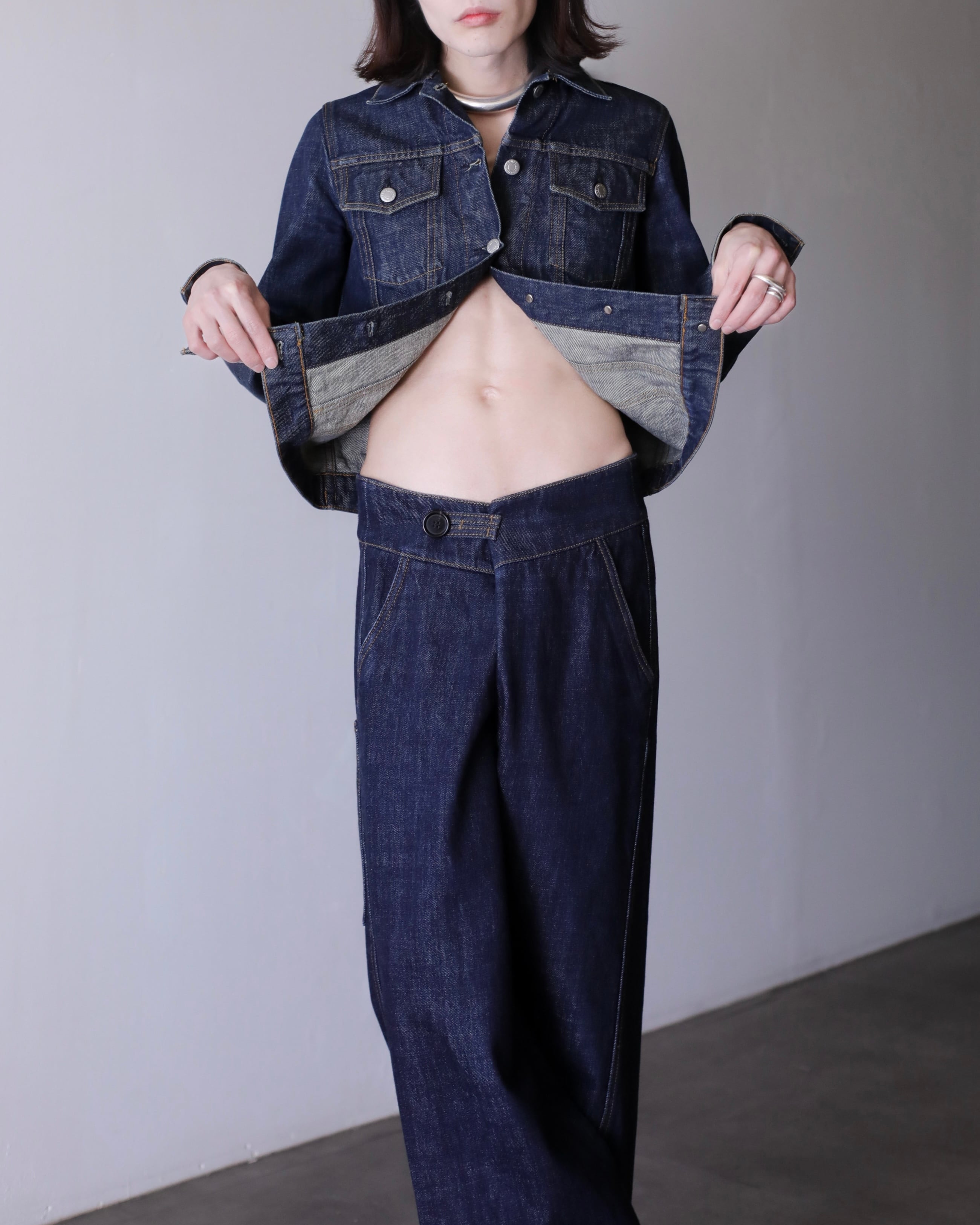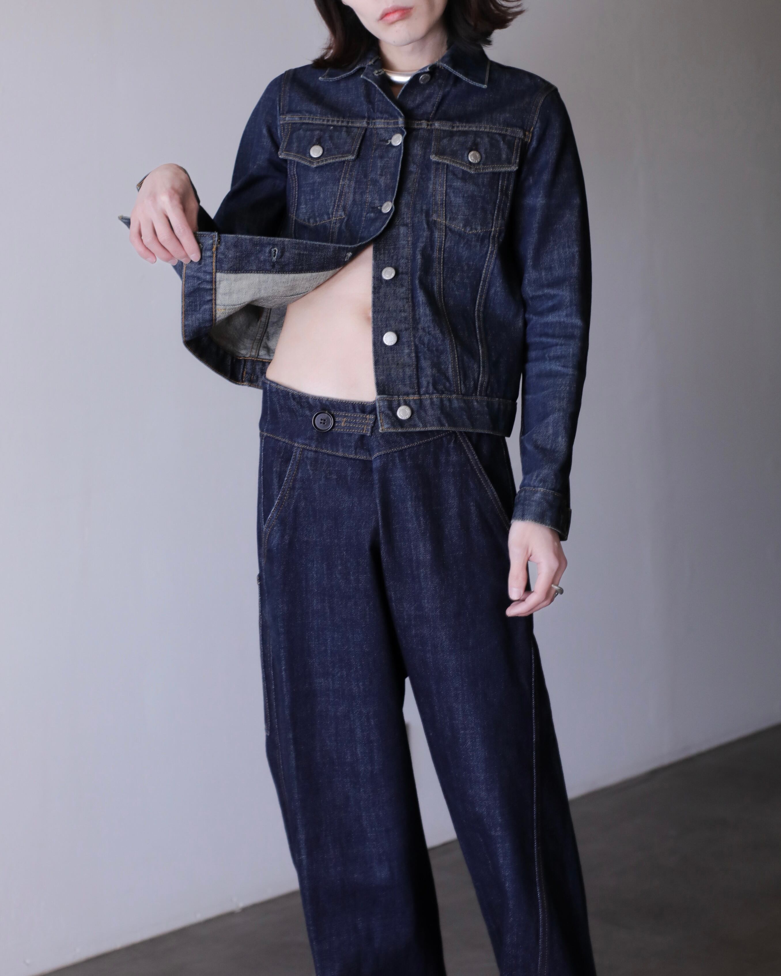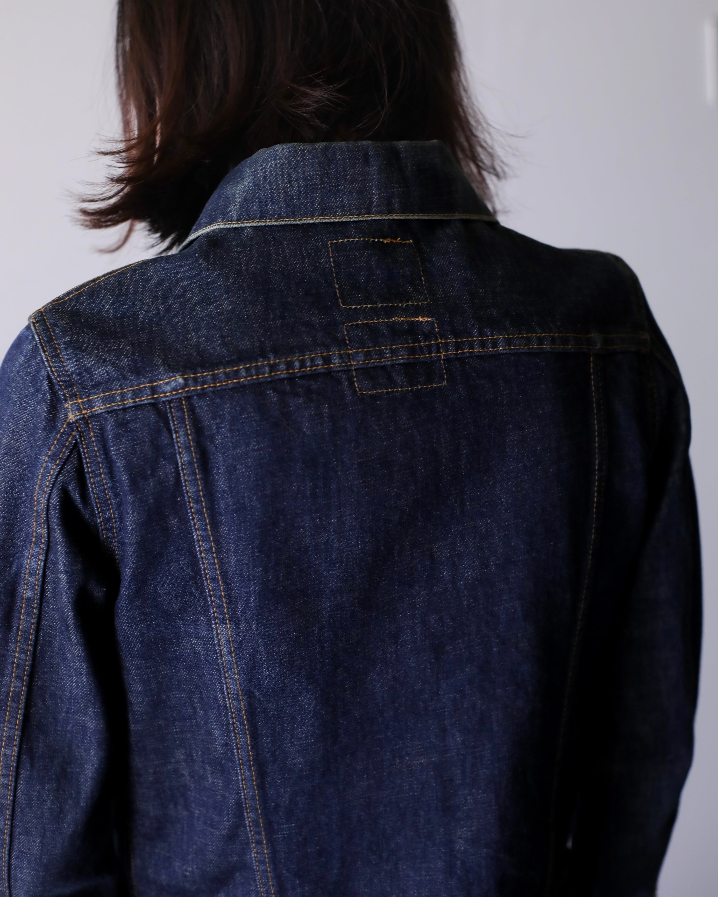 デニムオンデニムのスタイリングにもバチっとハマるジャケット。コートのインナーなんかにもとても良いと思います。スラックスやロングスカートでモードな感じに着たり、スウェットパンツでラフにも正直ルールなしに自由に着て良いアイテムだと思います。