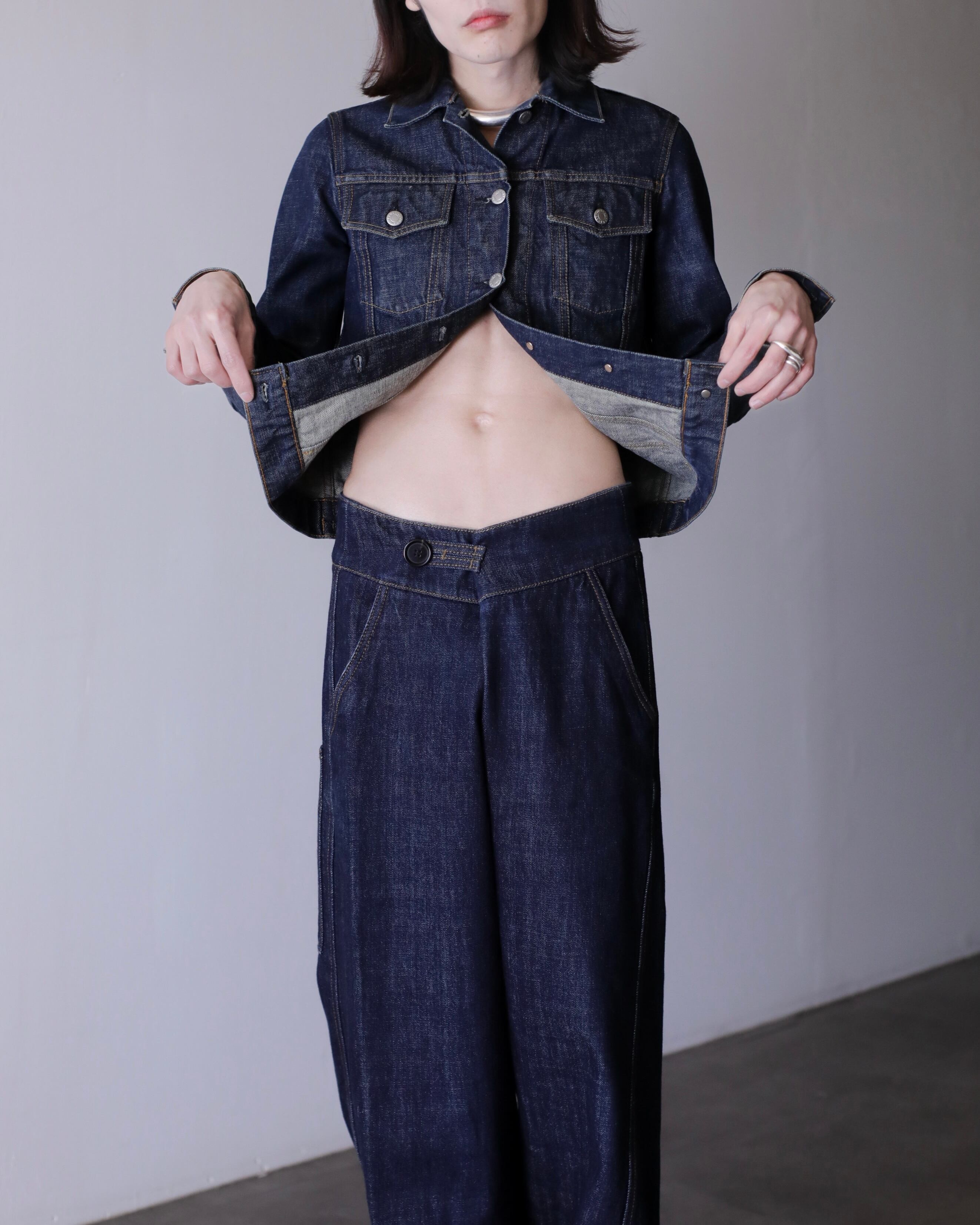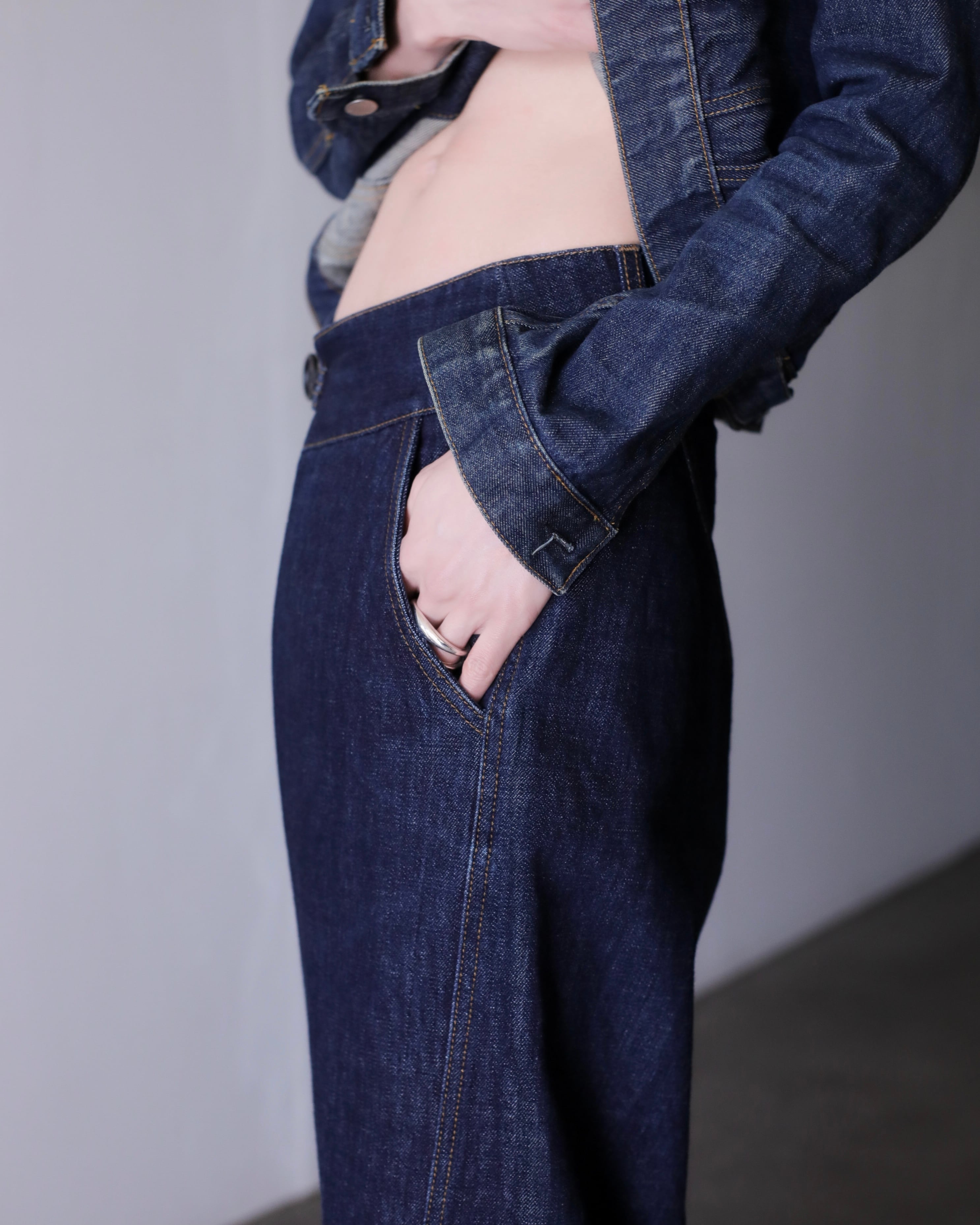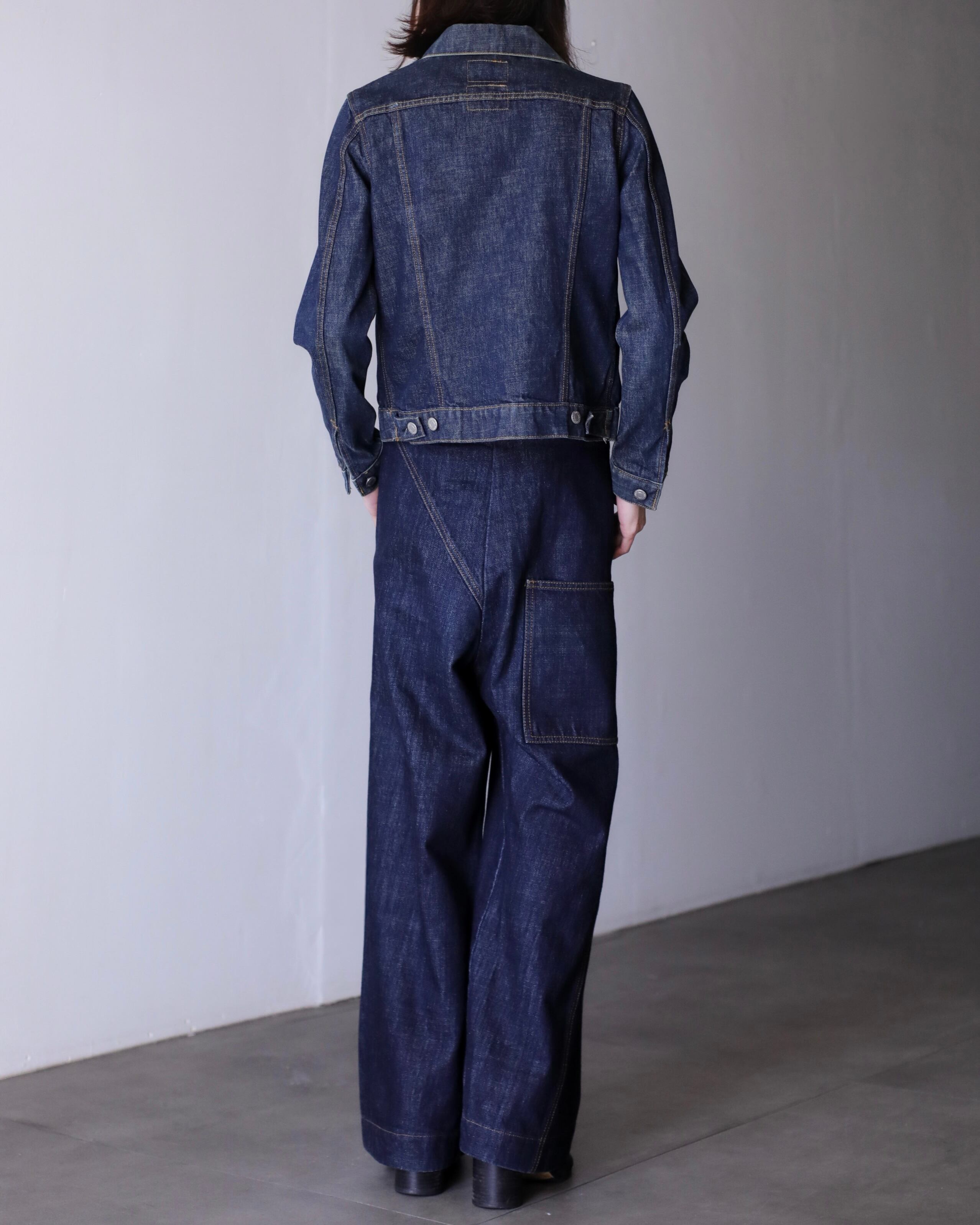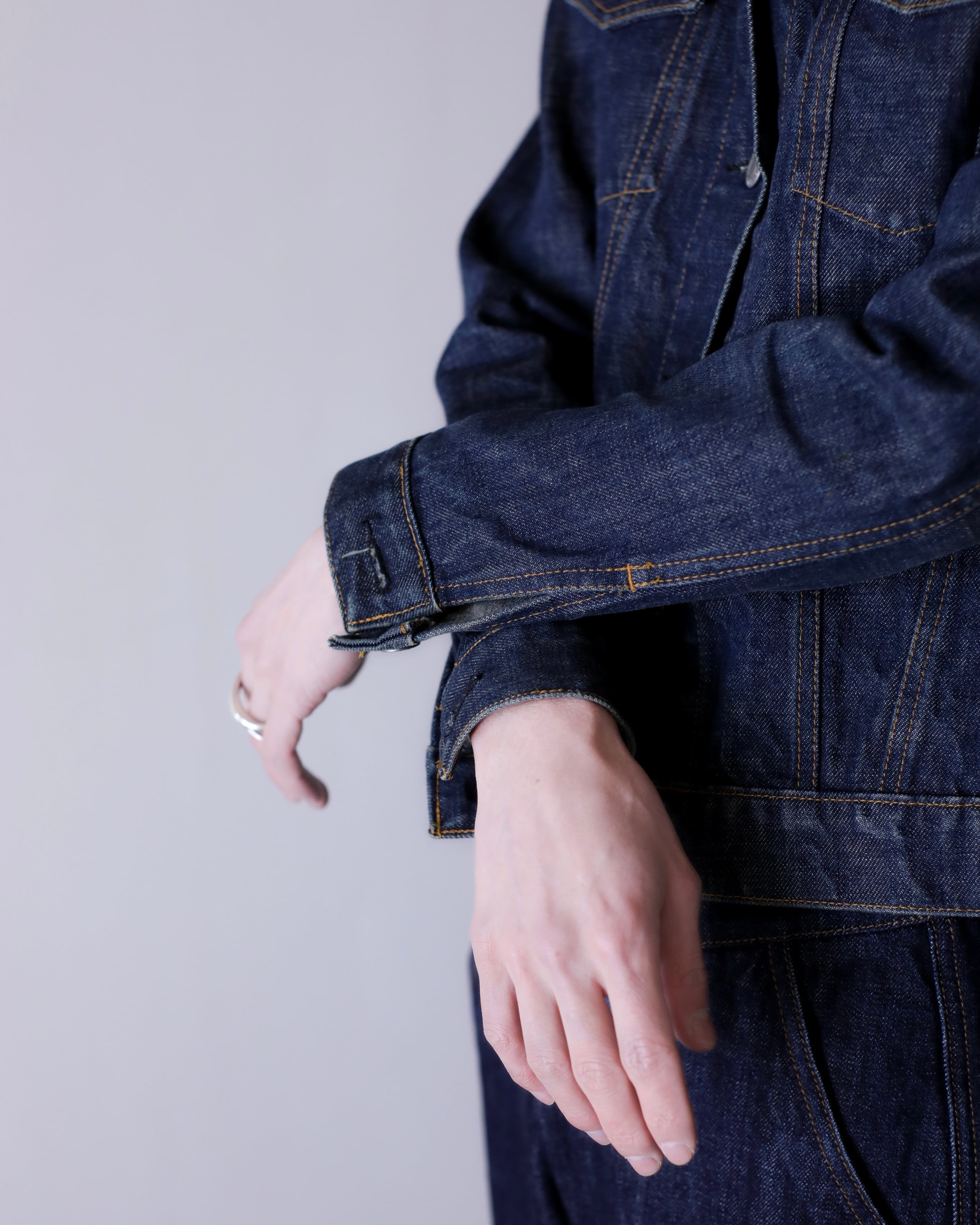 デニムオンデニムのスタイリングにもバチっとハマるジャケット。コートのインナーなんかにもとても良いと思います。スラックスやロングスカートでモードな感じに着たり、スウェットパンツでラフにも正直ルールなしに自由に着て良いアイテムだと思います。
