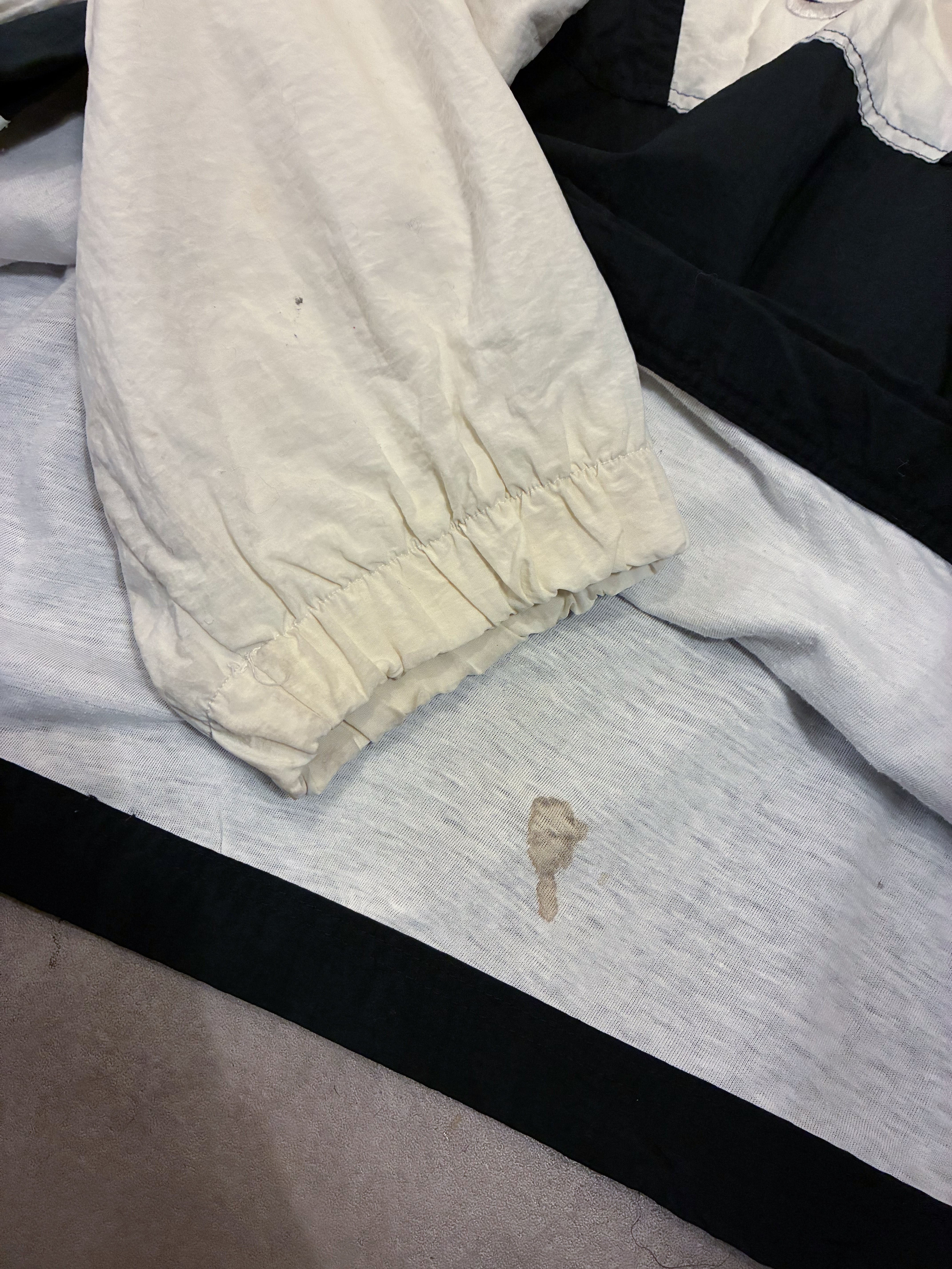 袖部分に薄汚れや小さなシミ、裏地裾付近にシミがございます。
