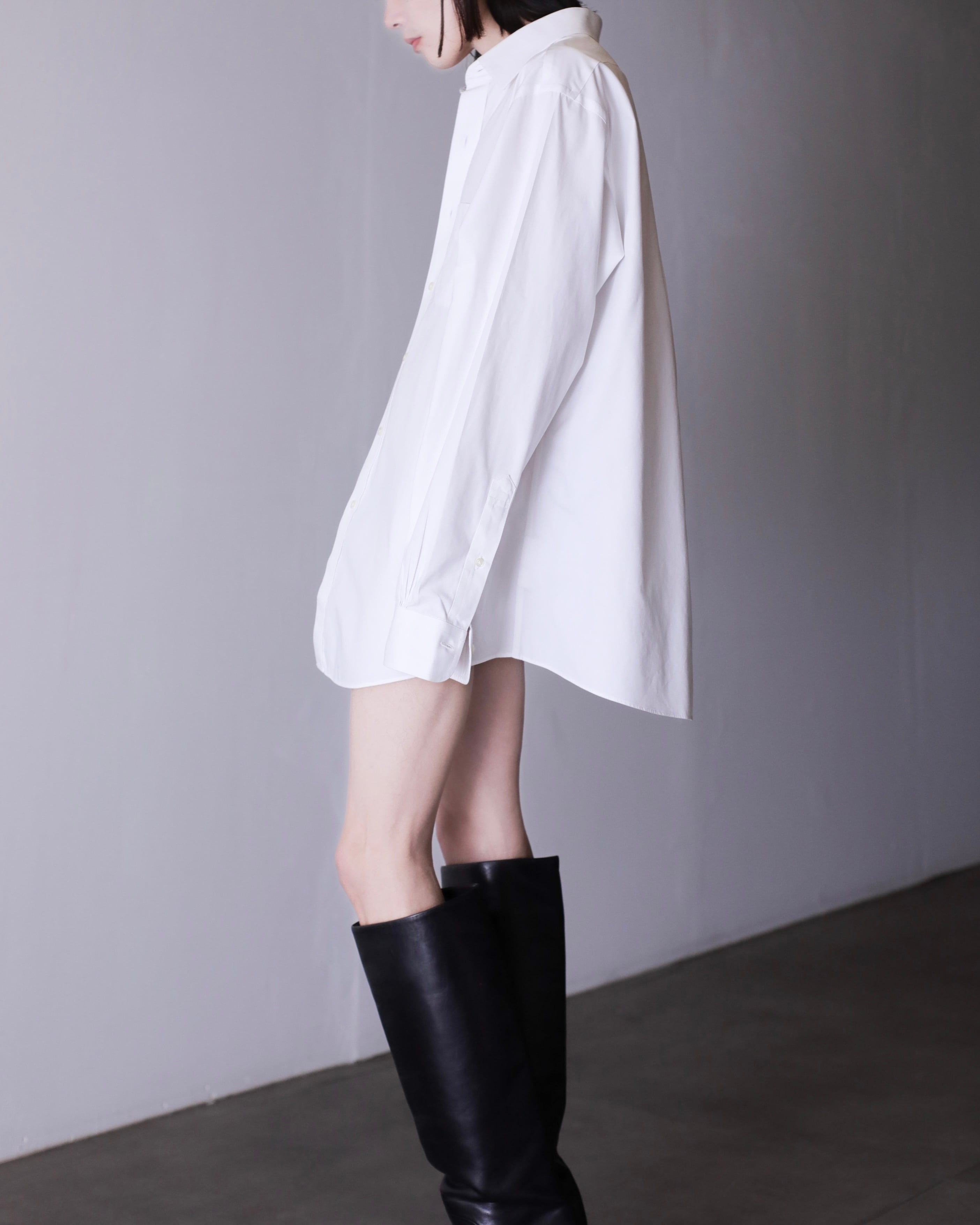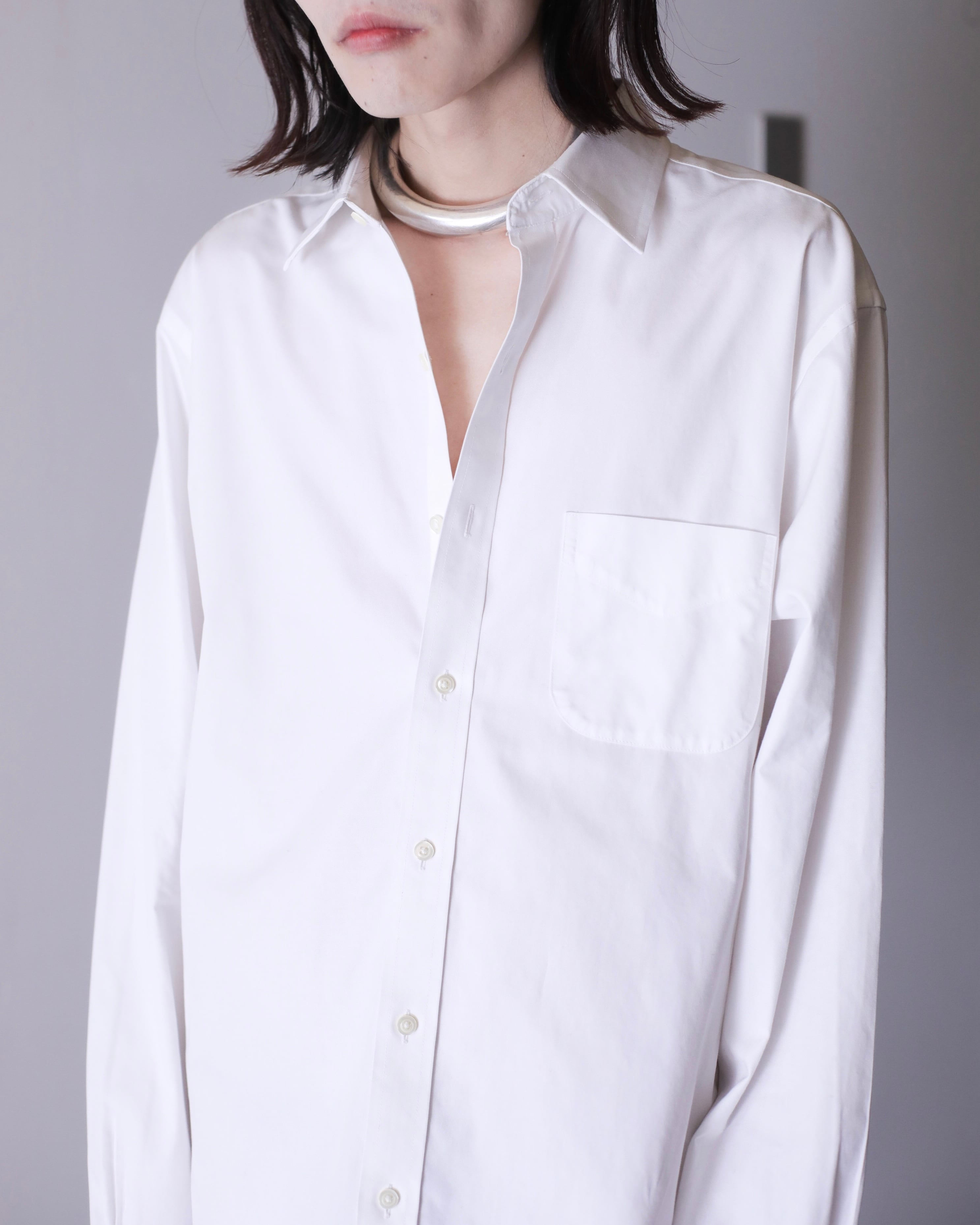 なぜかというと、色々アレンジが効いたり、プレーンな白シャツなのでこのサイジングだからこそファッションとして成立したり、何より普通のサイズの白シャツに魅力を感じないから当店ではこのオーバーな物をあえてセレクトしております。