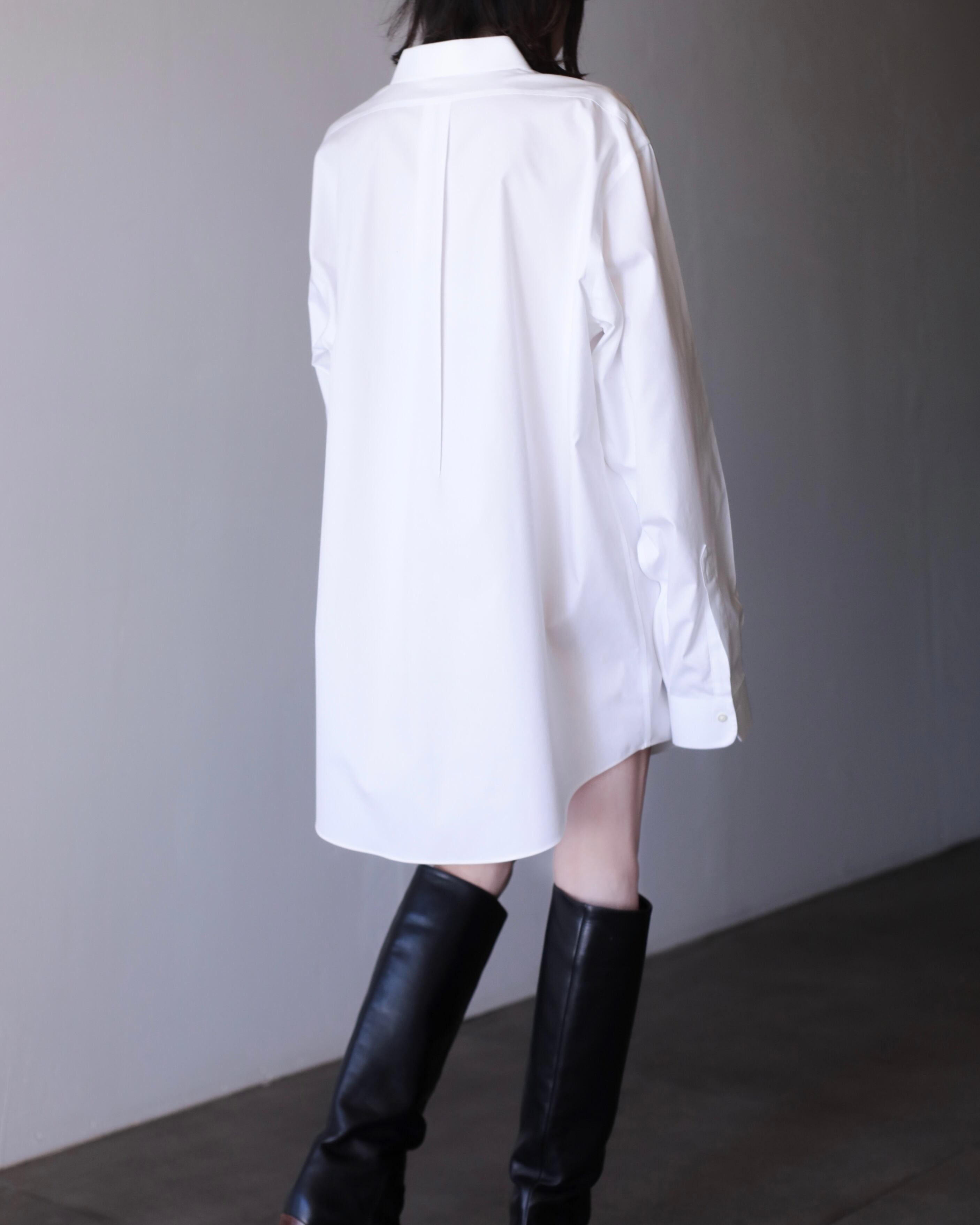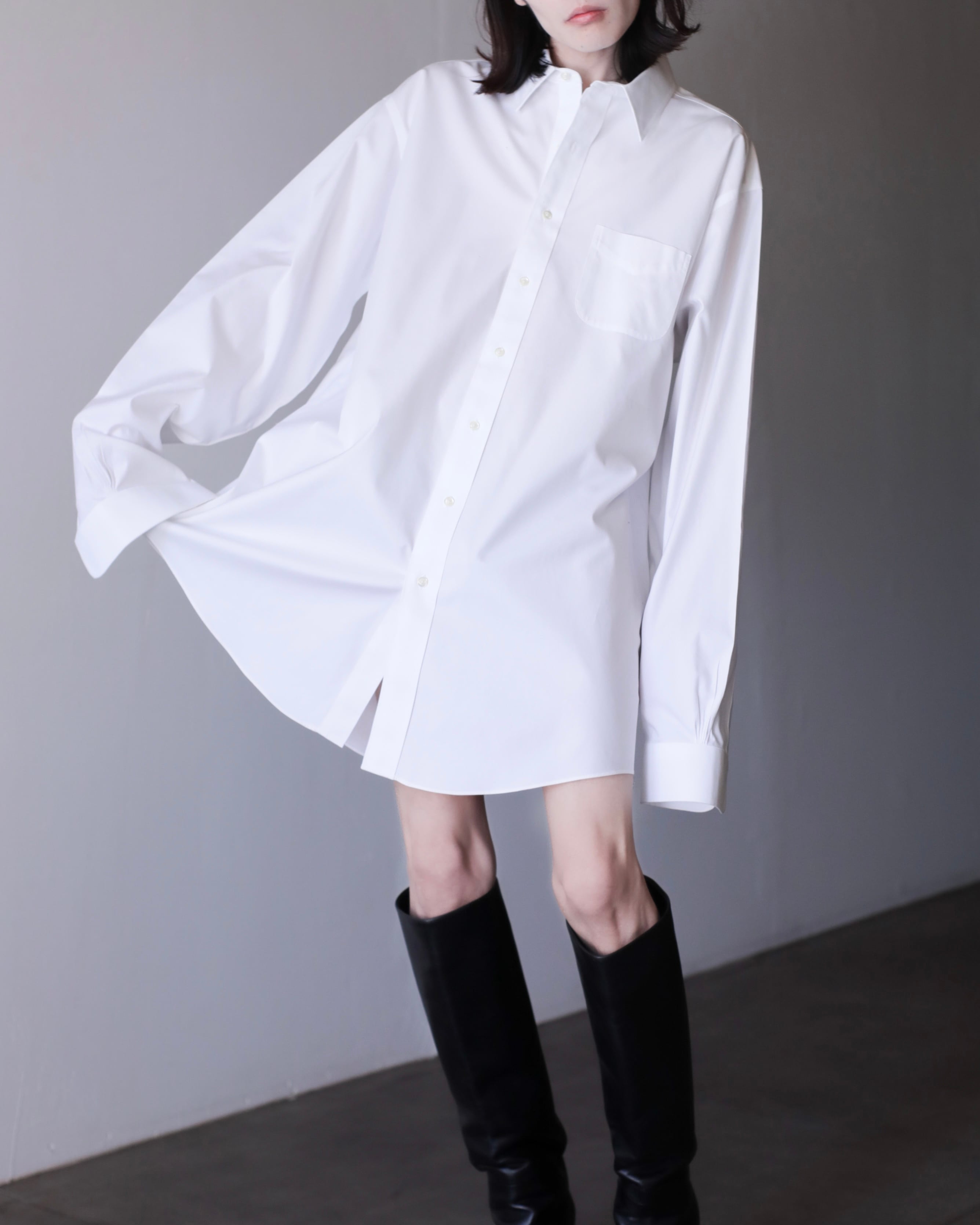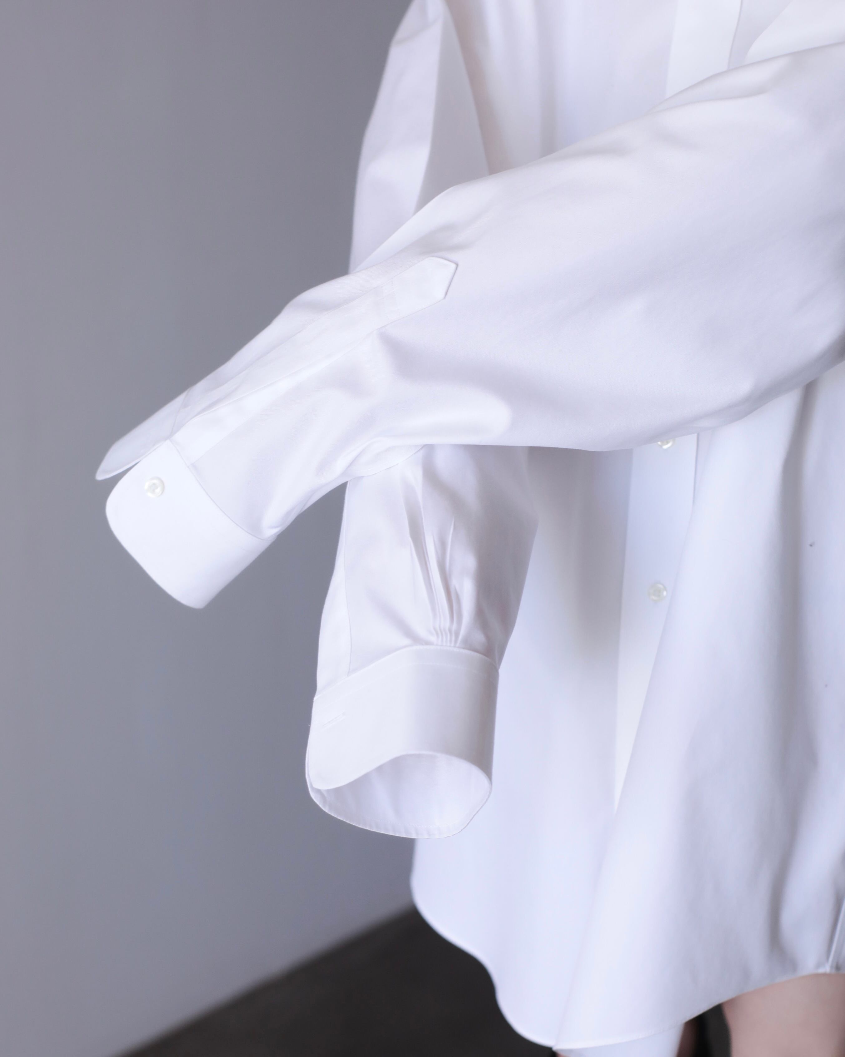 なぜかというと、色々アレンジが効いたり、プレーンな白シャツなのでこのサイジングだからこそファッションとして成立したり、何より普通のサイズの白シャツに魅力を感じないから当店ではこのオーバーな物をあえてセレクトしております。