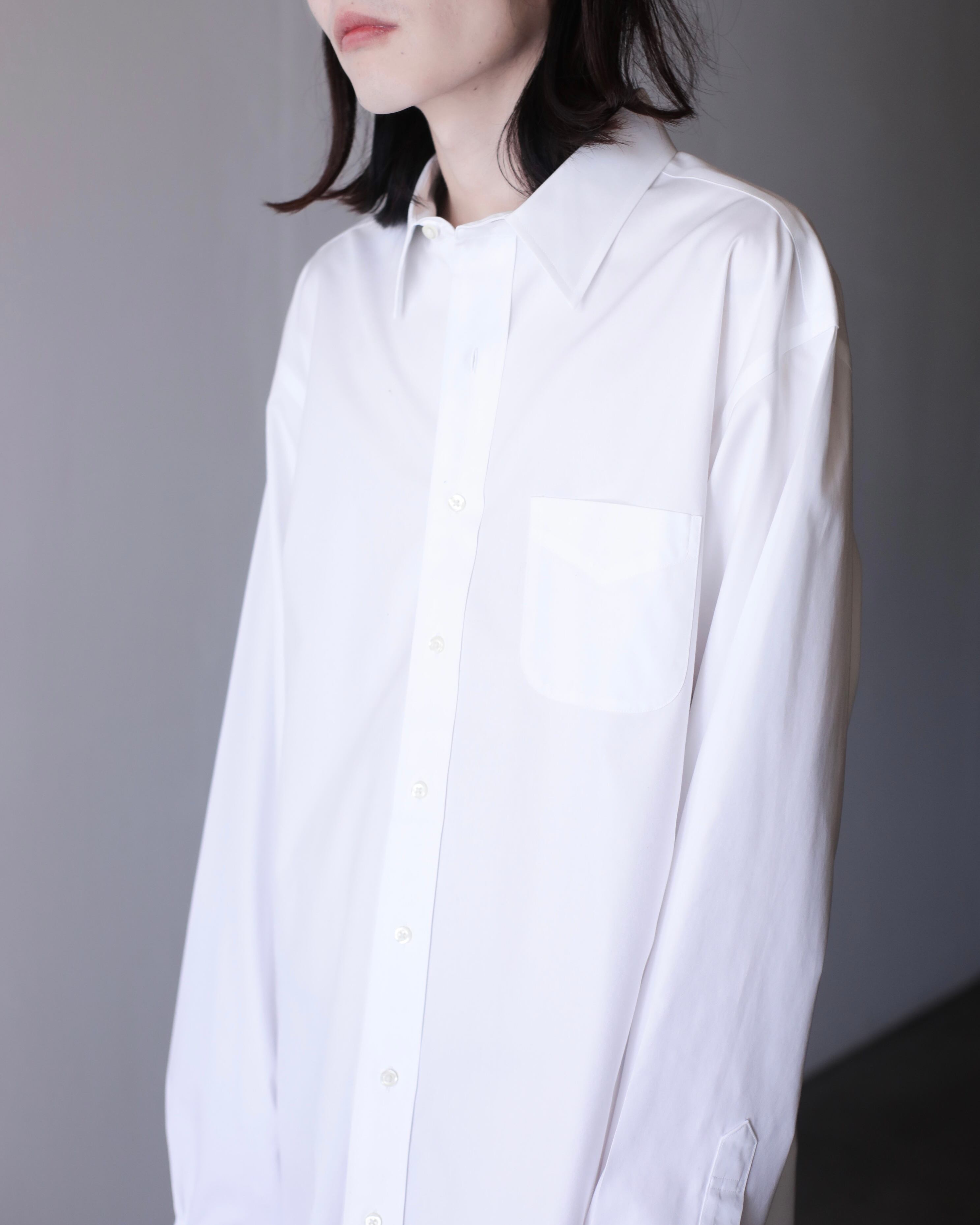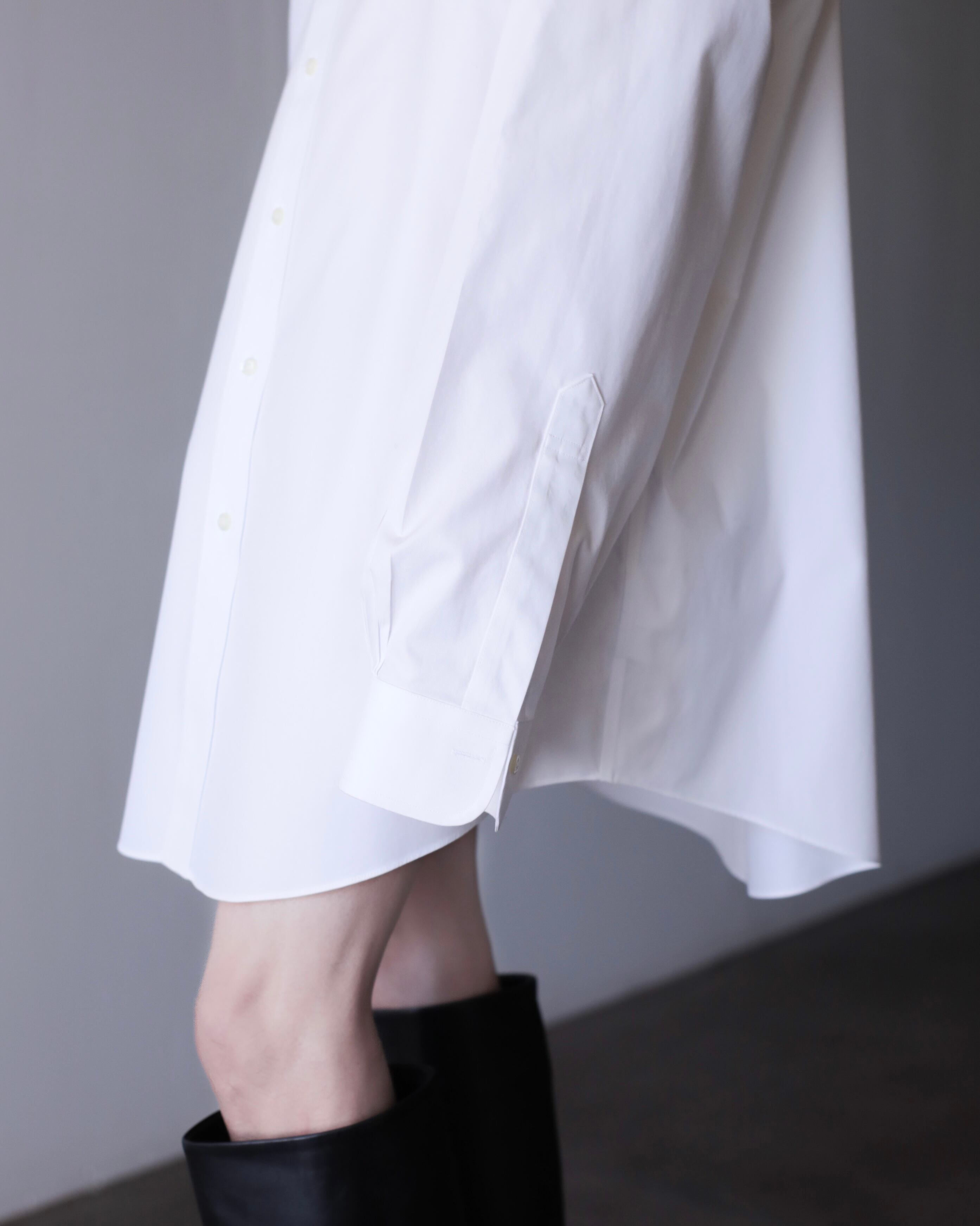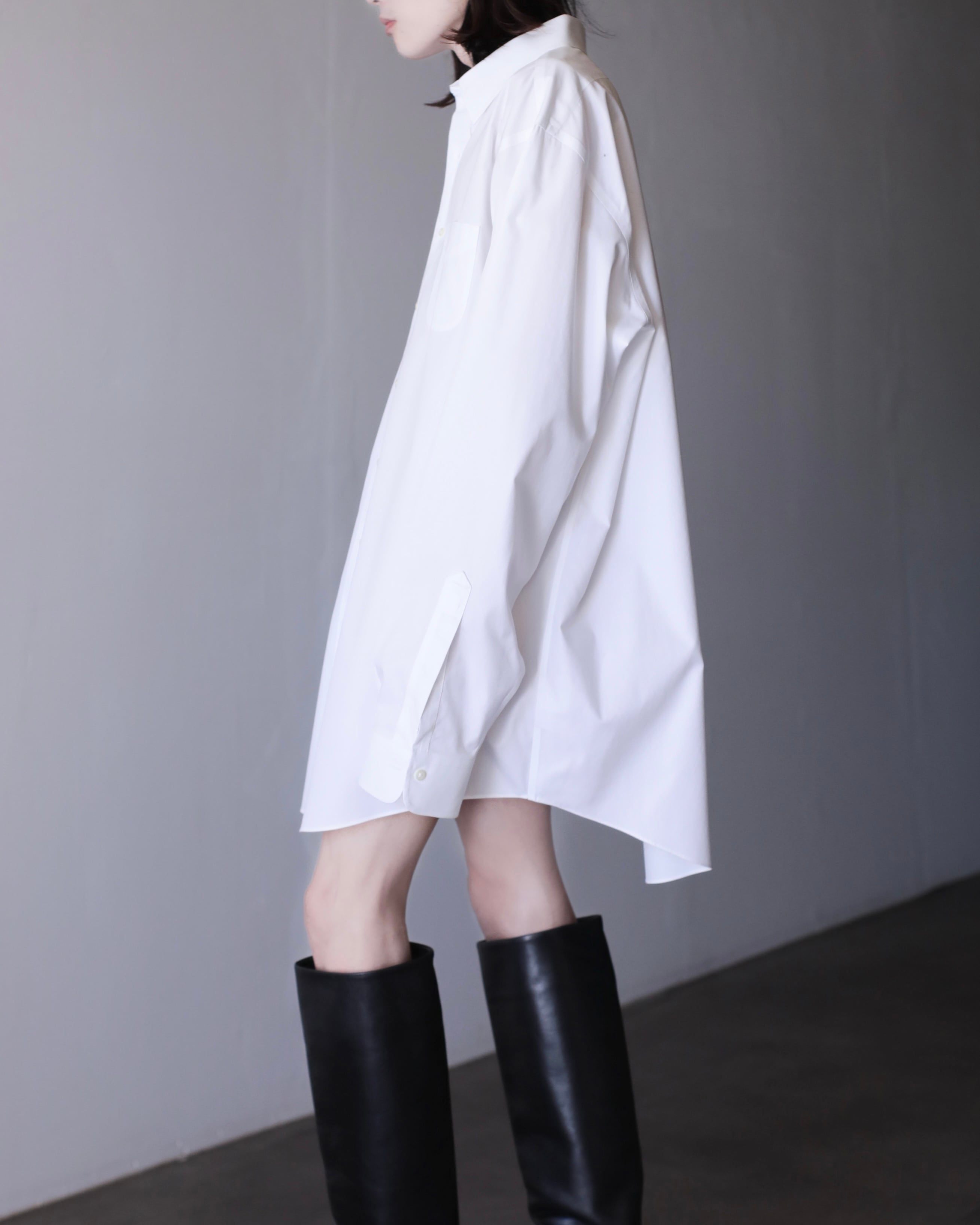 なぜかというと、色々アレンジが効いたり、プレーンな白シャツなのでこのサイジングだからこそファッションとして成立したり、何より普通のサイズの白シャツに魅力を感じないから当店ではこのオーバーな物をあえてセレクトしております。