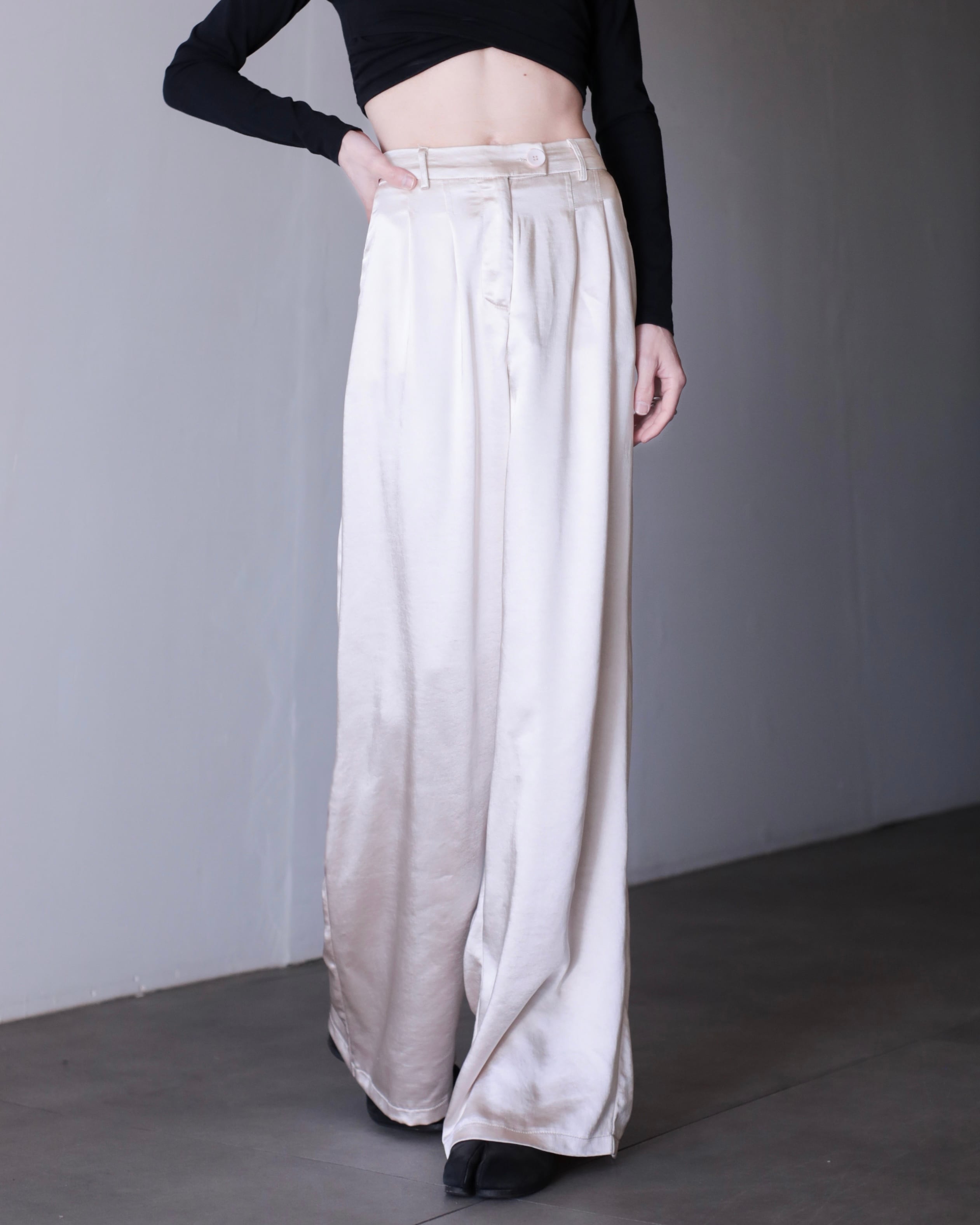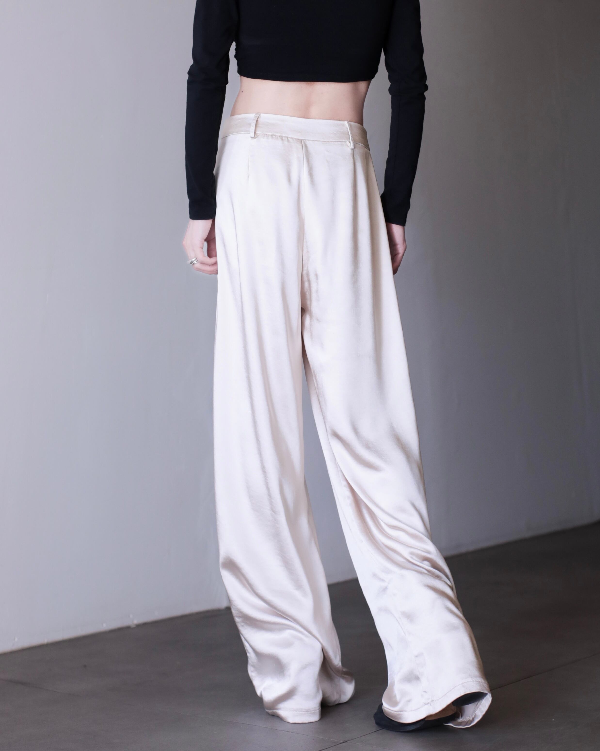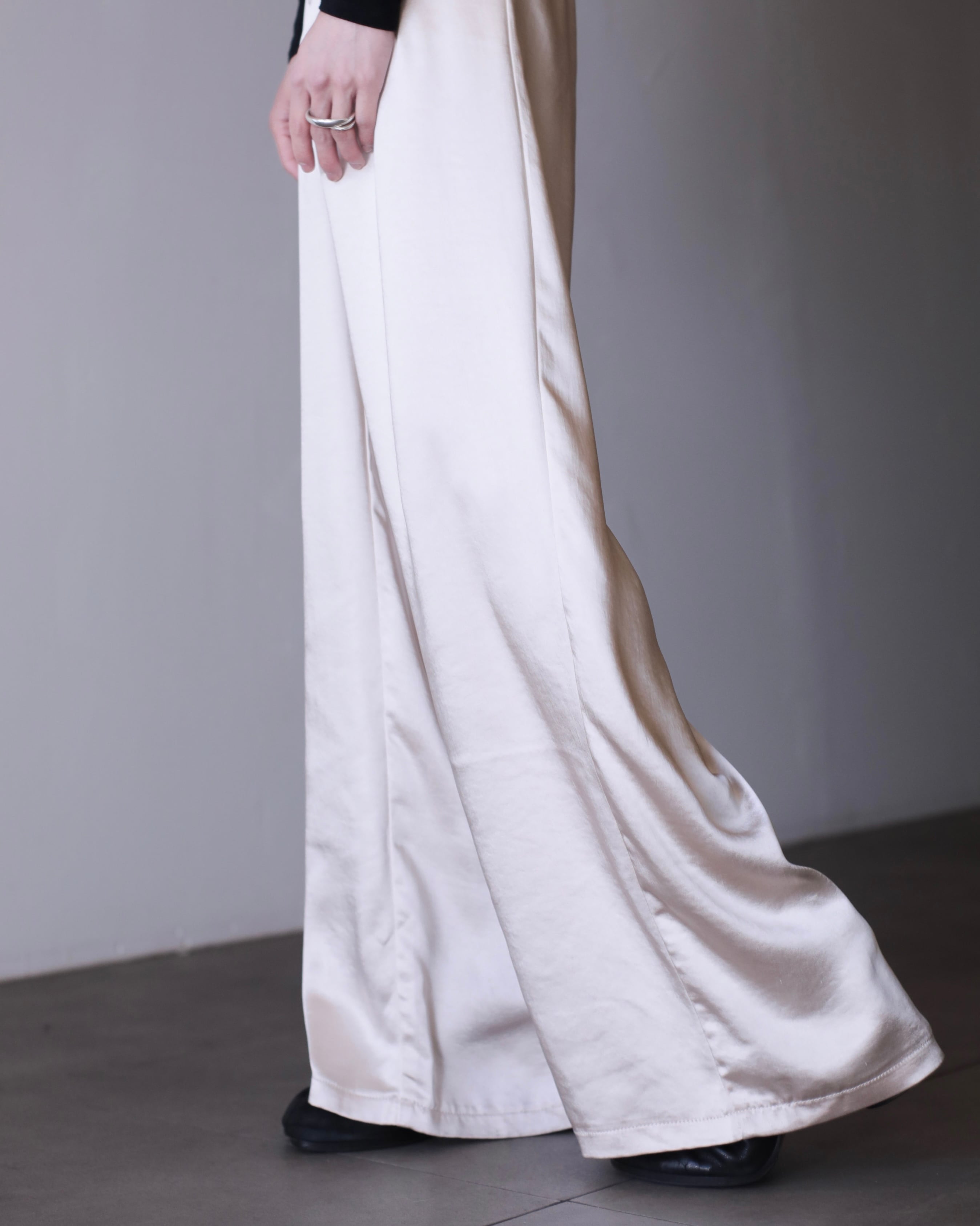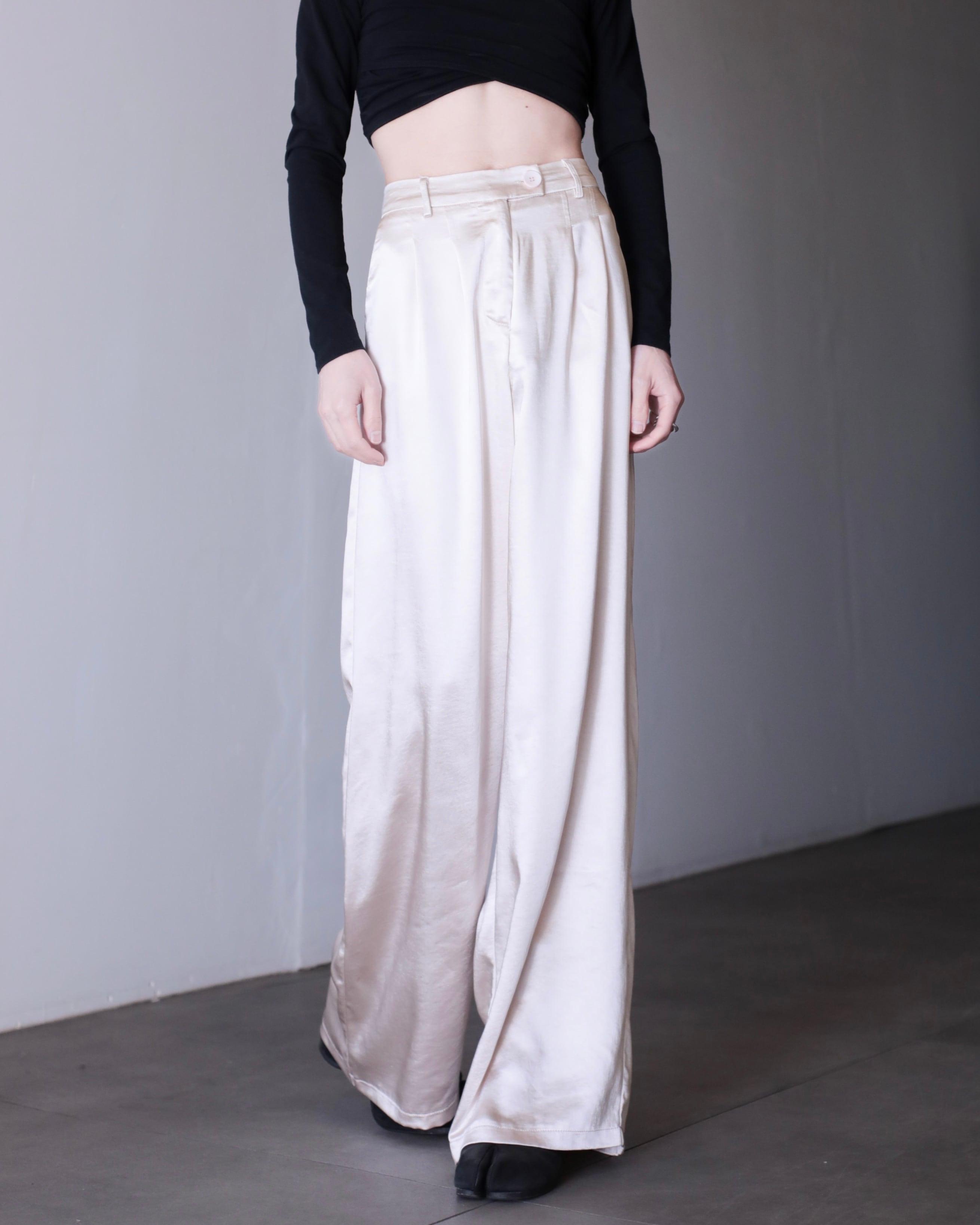 サテンのタックワイドスラックス。