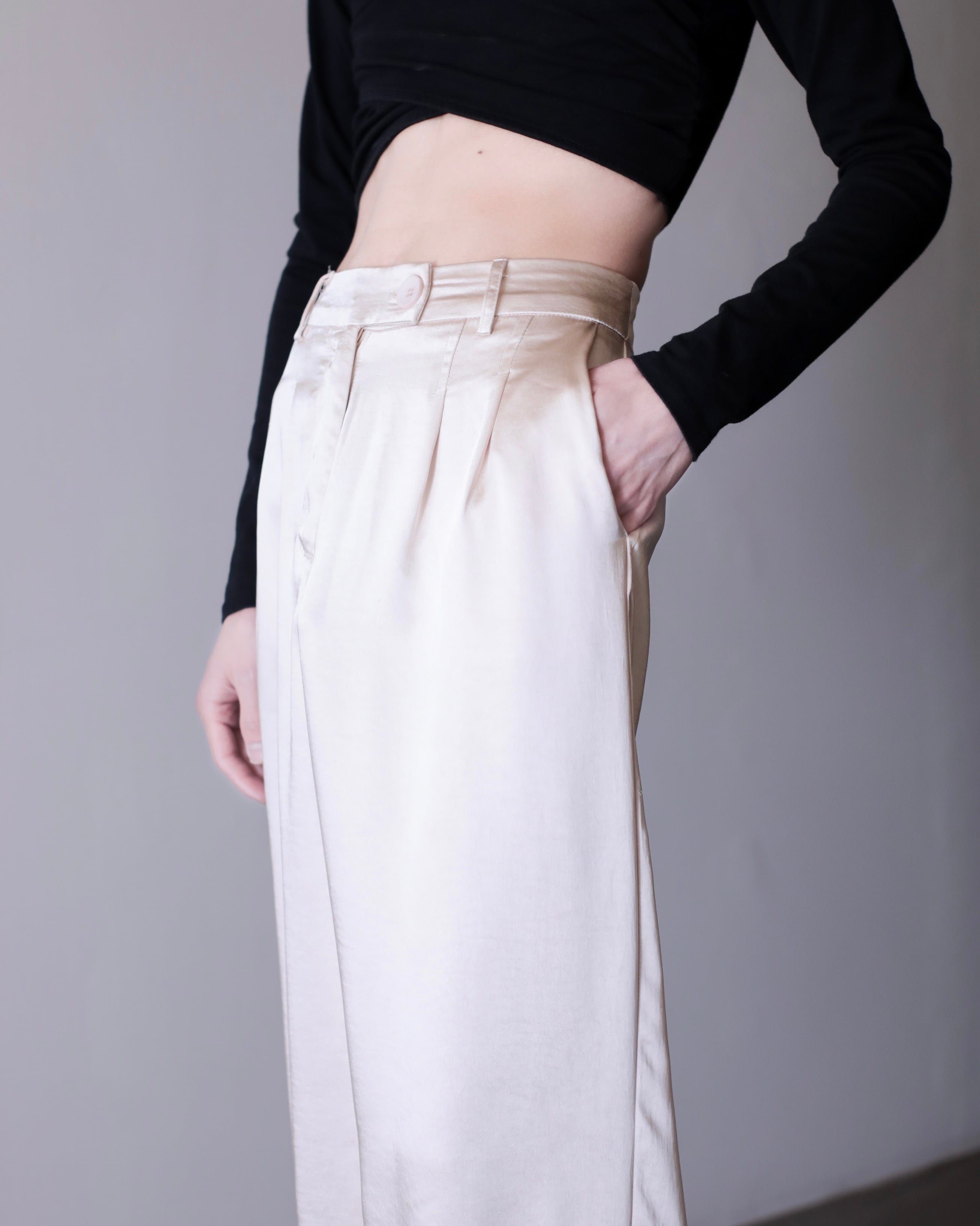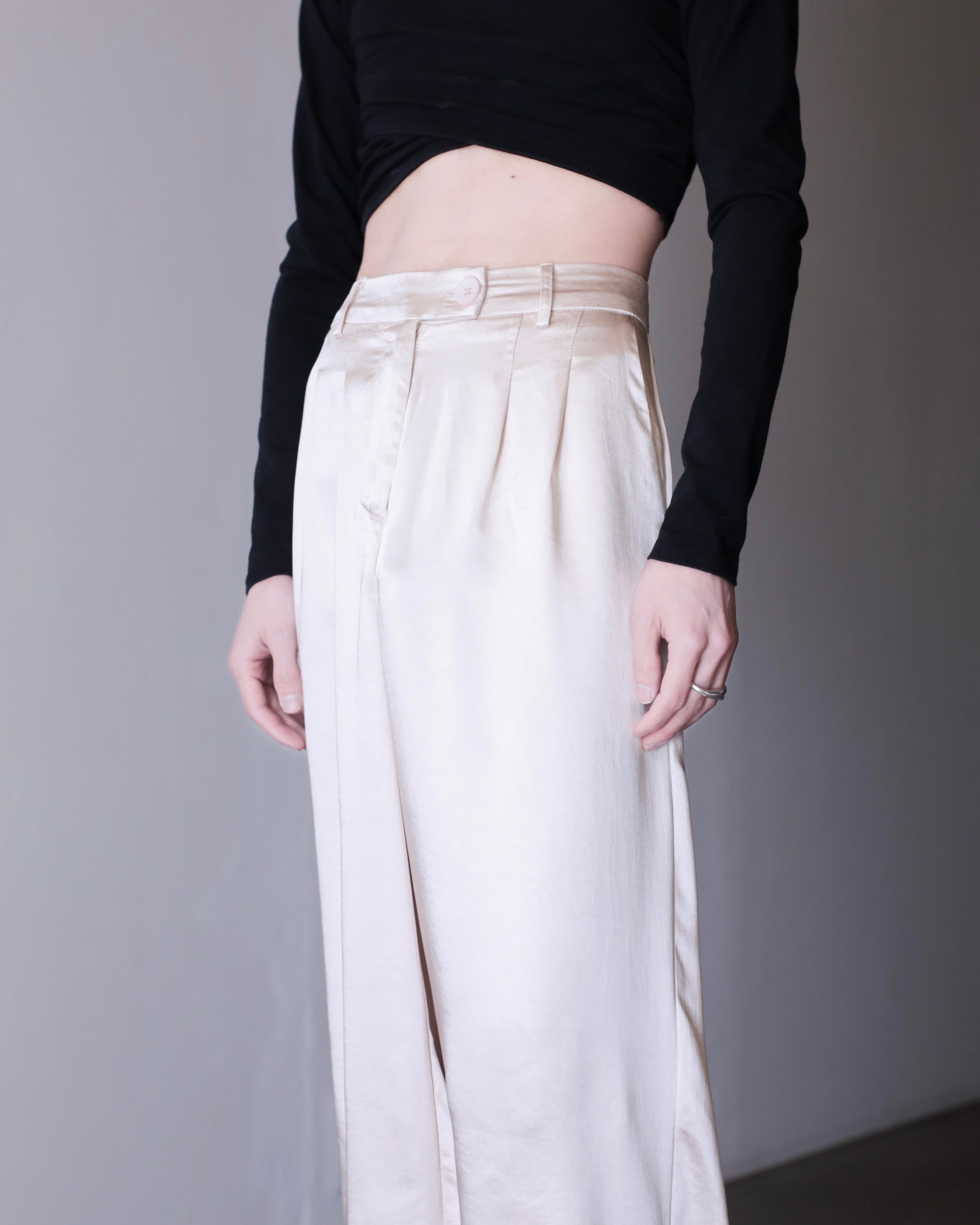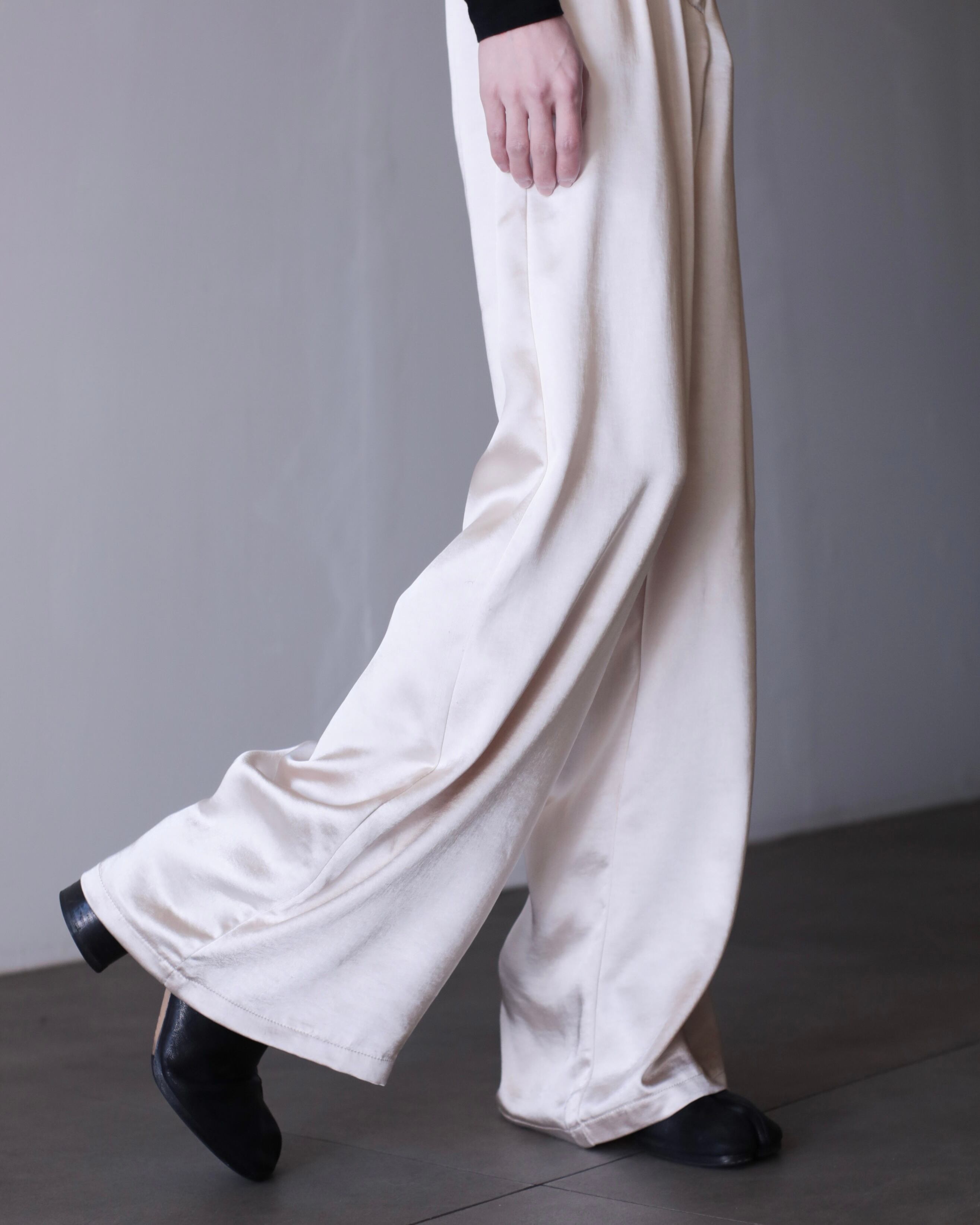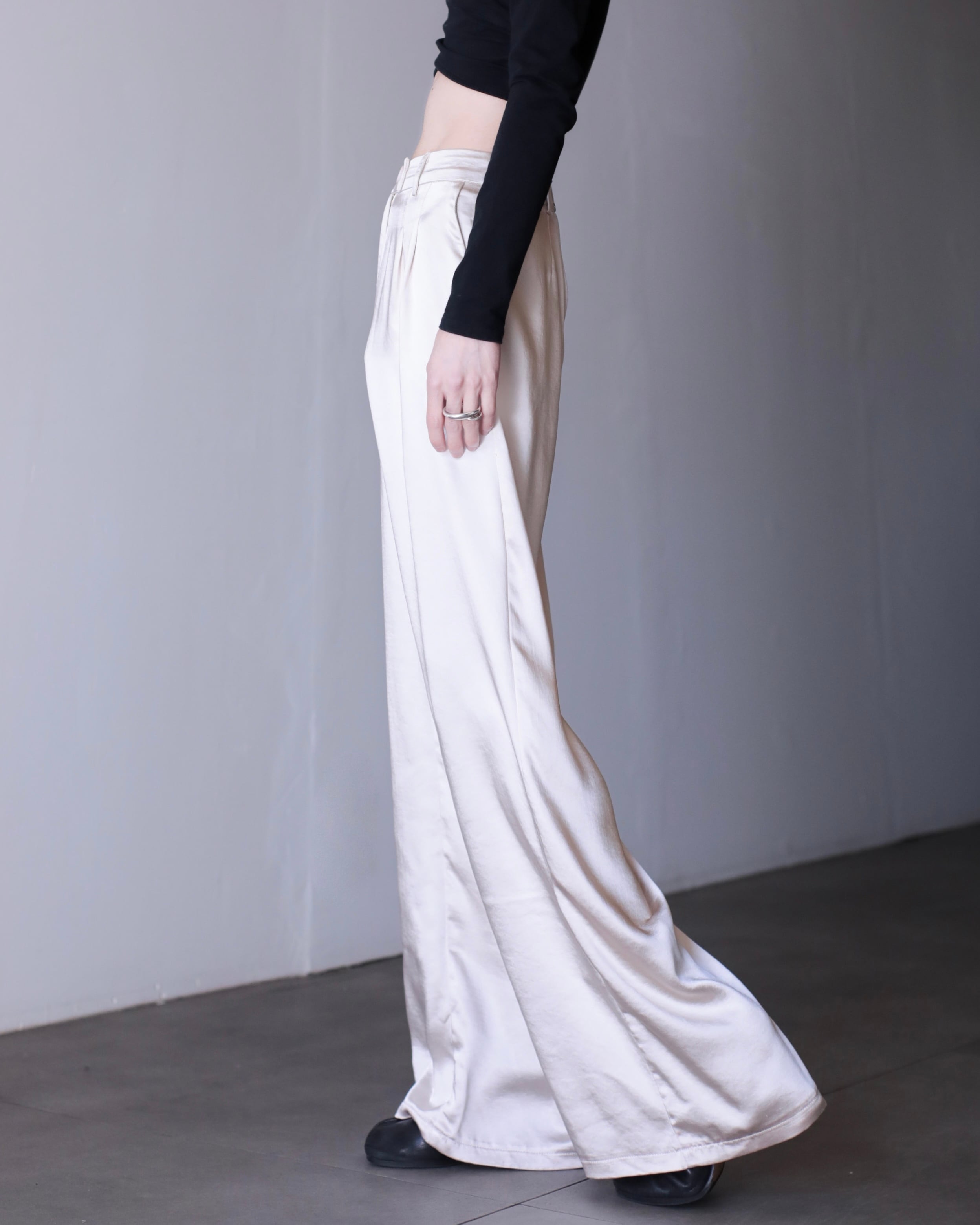 サテンのタックワイドスラックス。